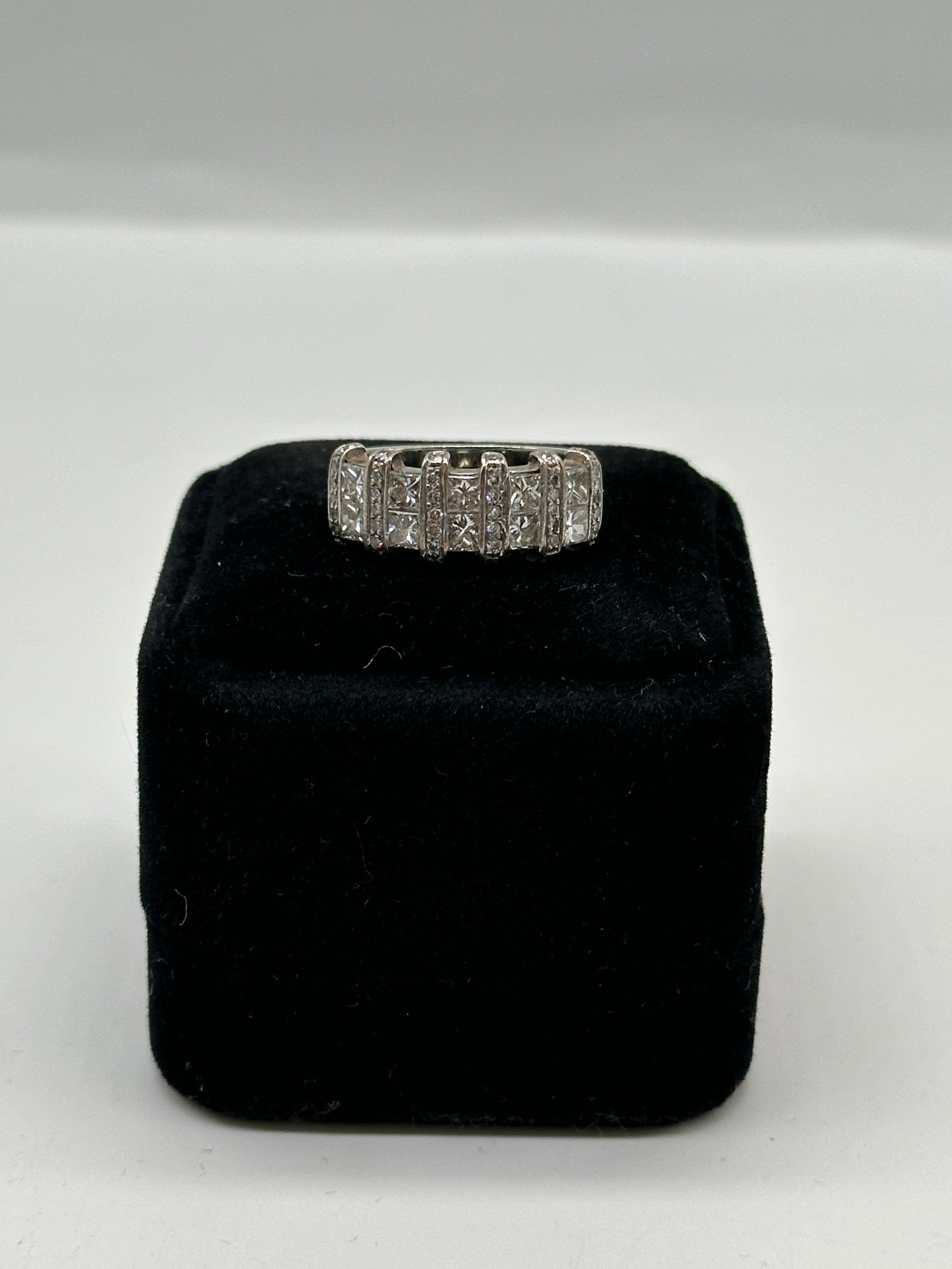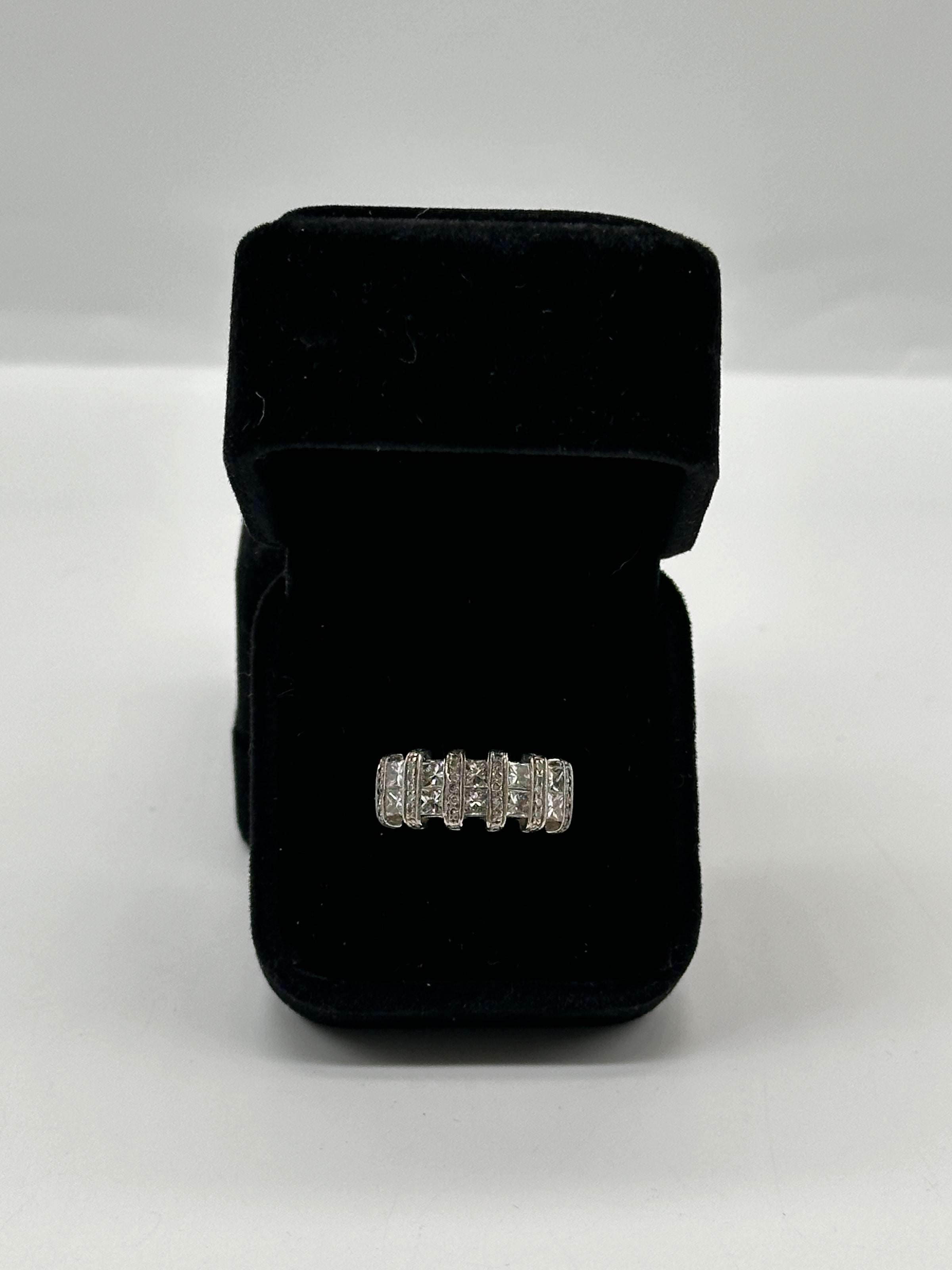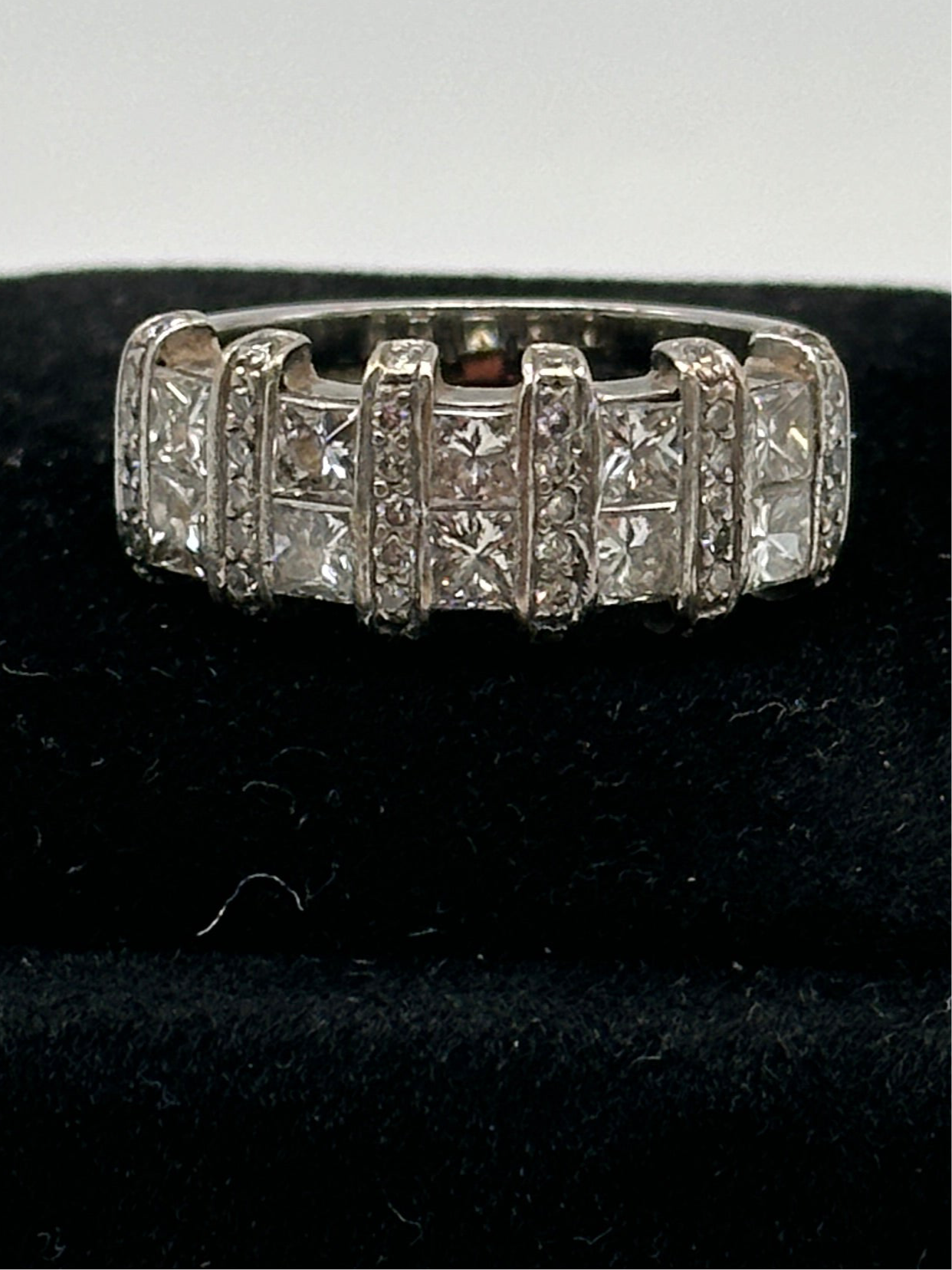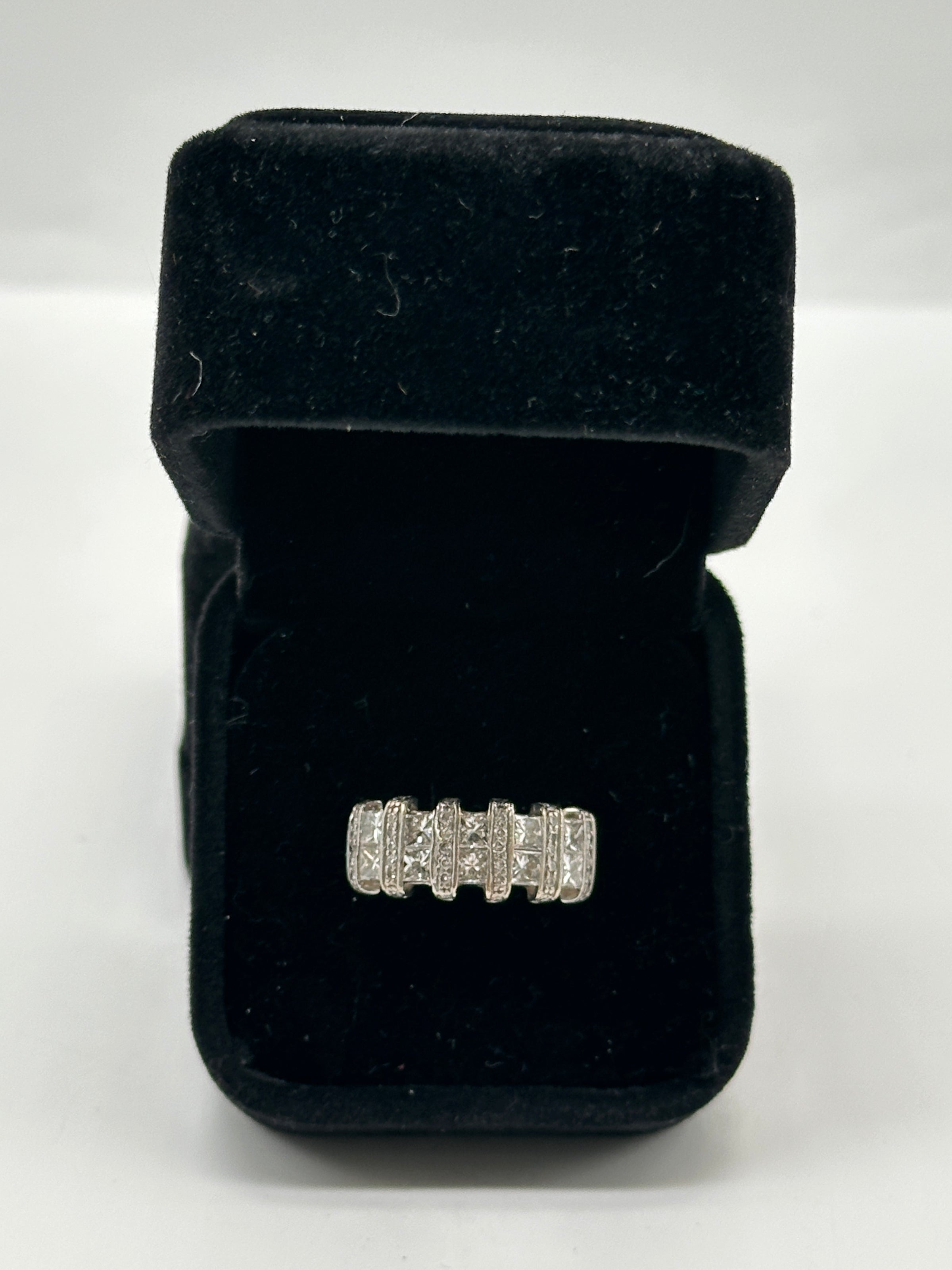 Band: Smooth polished white gold band, approximately 2–3 mm wide; the pavé bars provide visual rhythm between the more substantial princess stones. Total carat weight will depend on the size of stones specified, finger size L