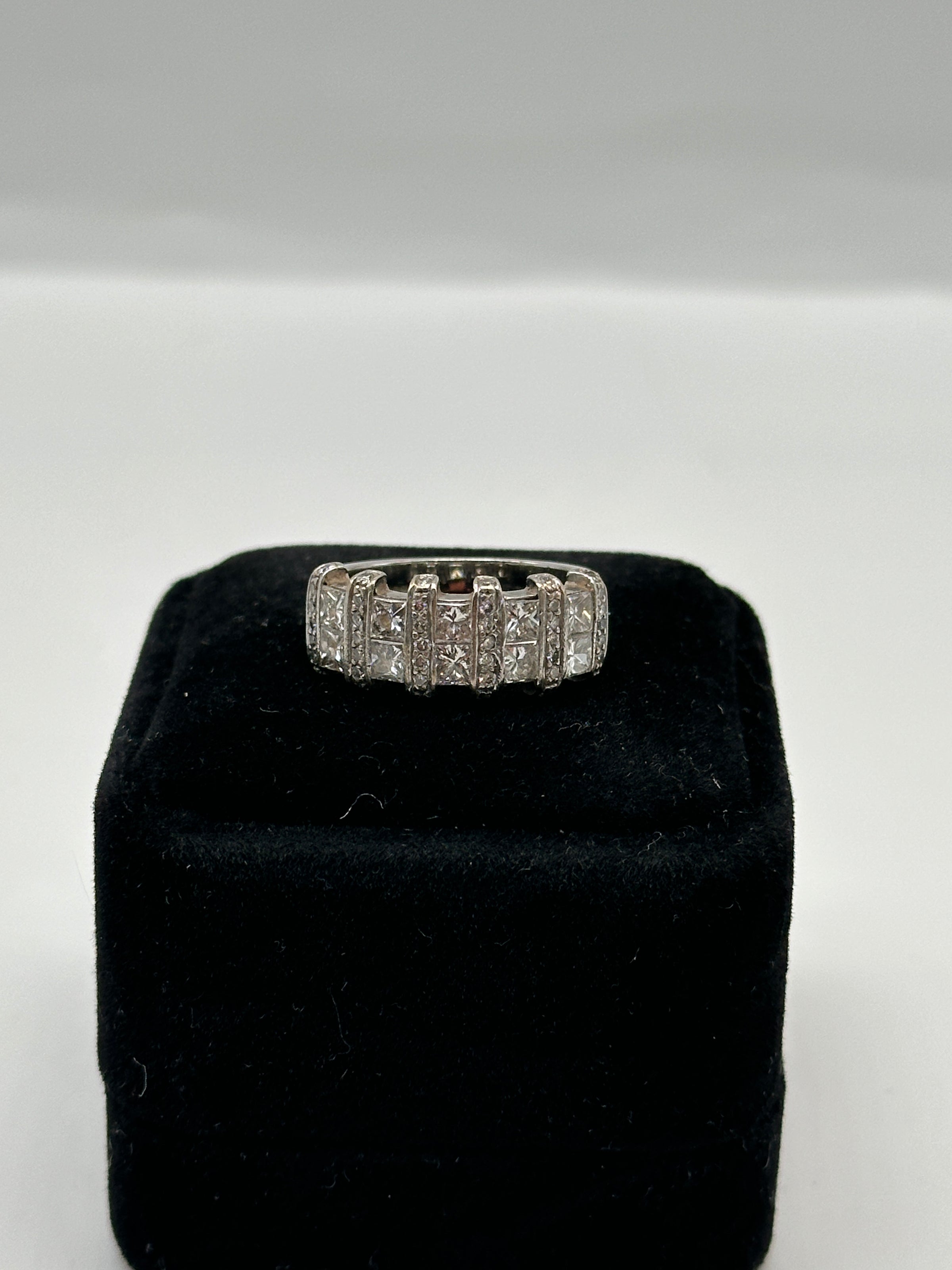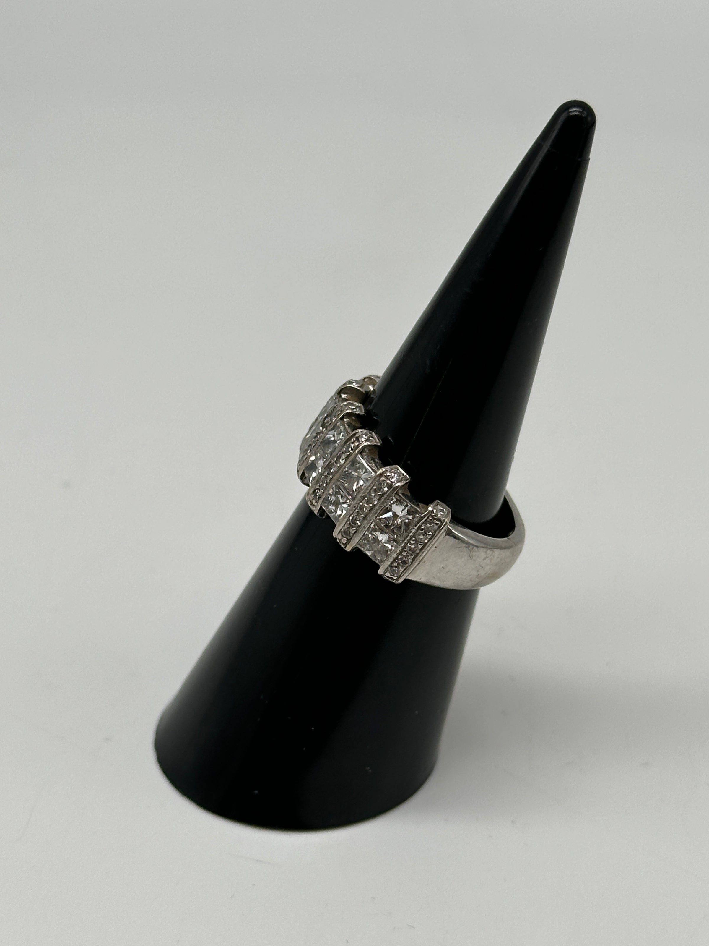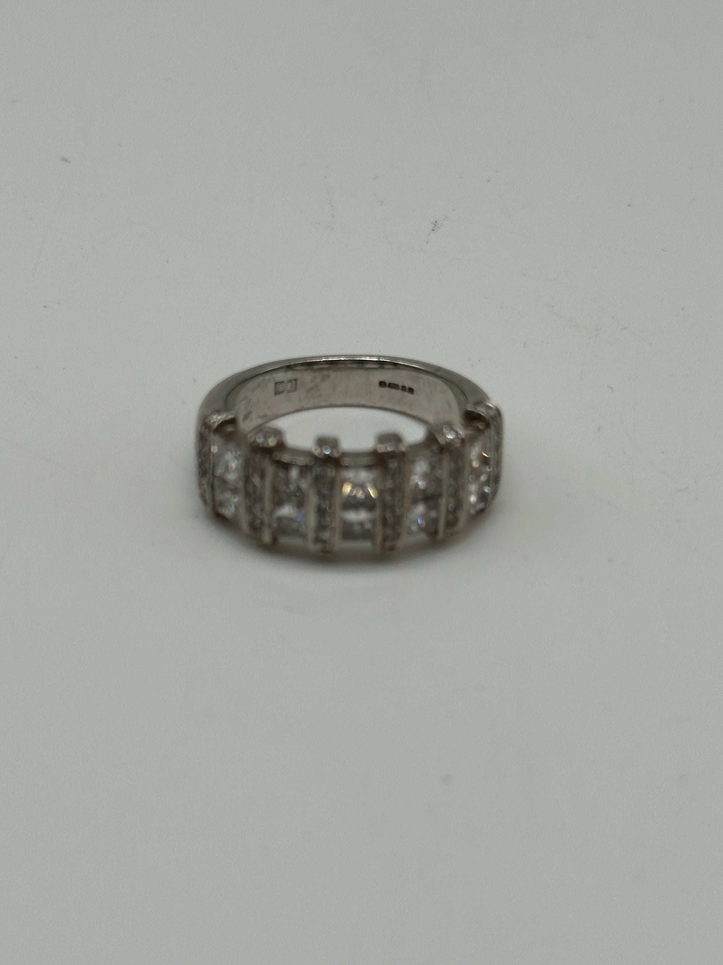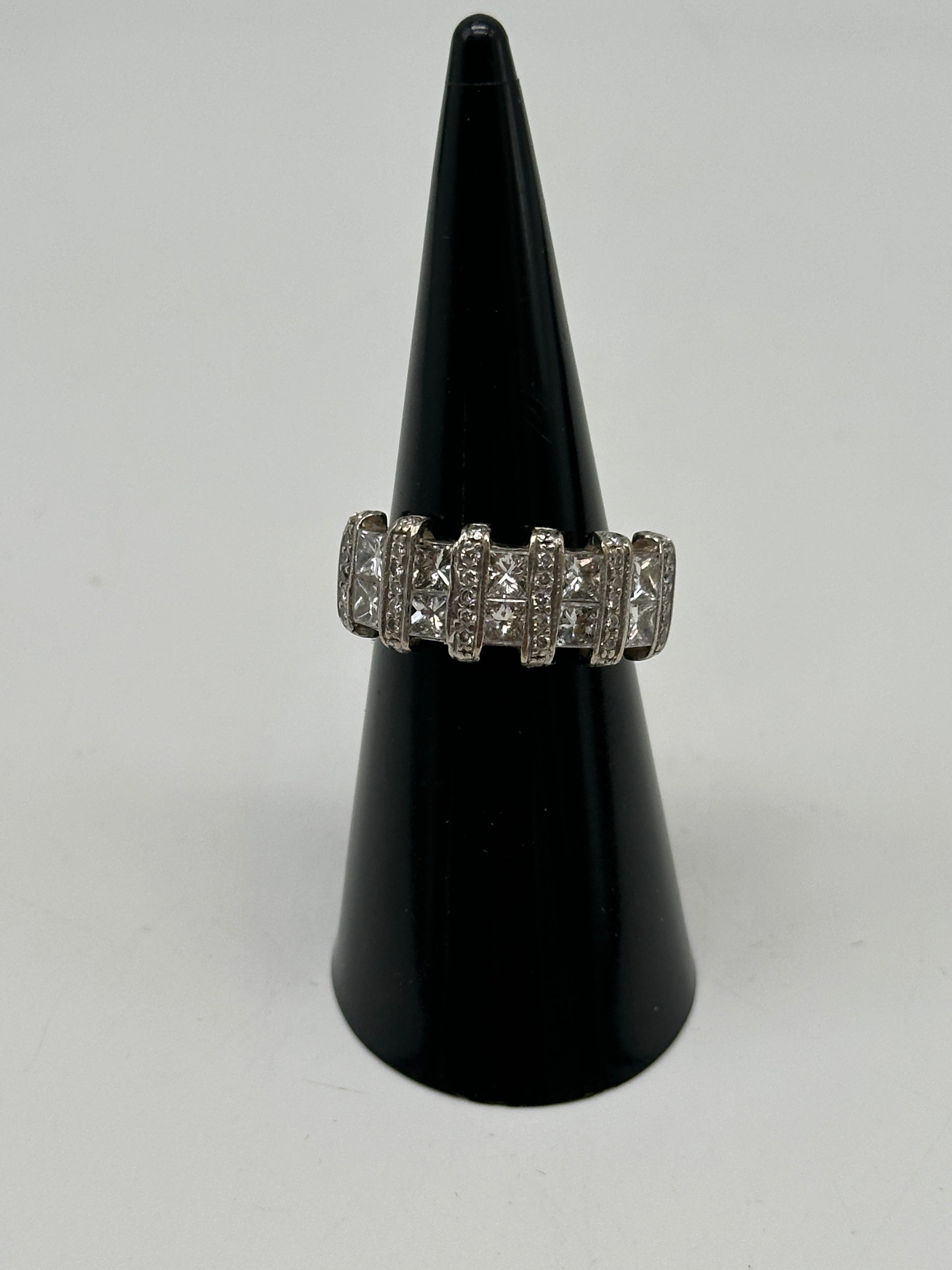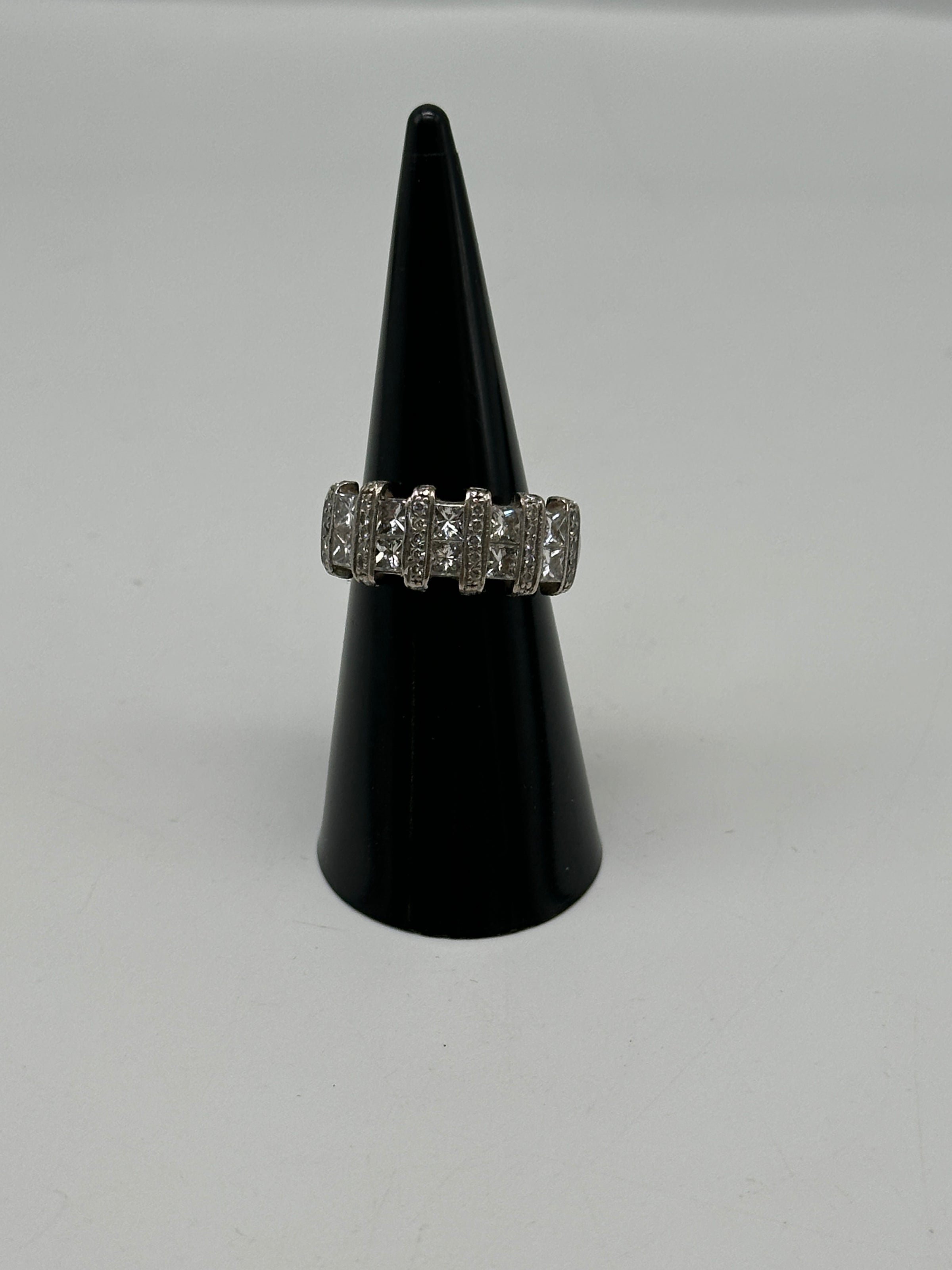 Band: Smooth polished white gold band, approximately 2–3 mm wide; the pavé bars provide visual rhythm between the more substantial princess stones. Total carat weight will depend on the size of stones specified, finger size L