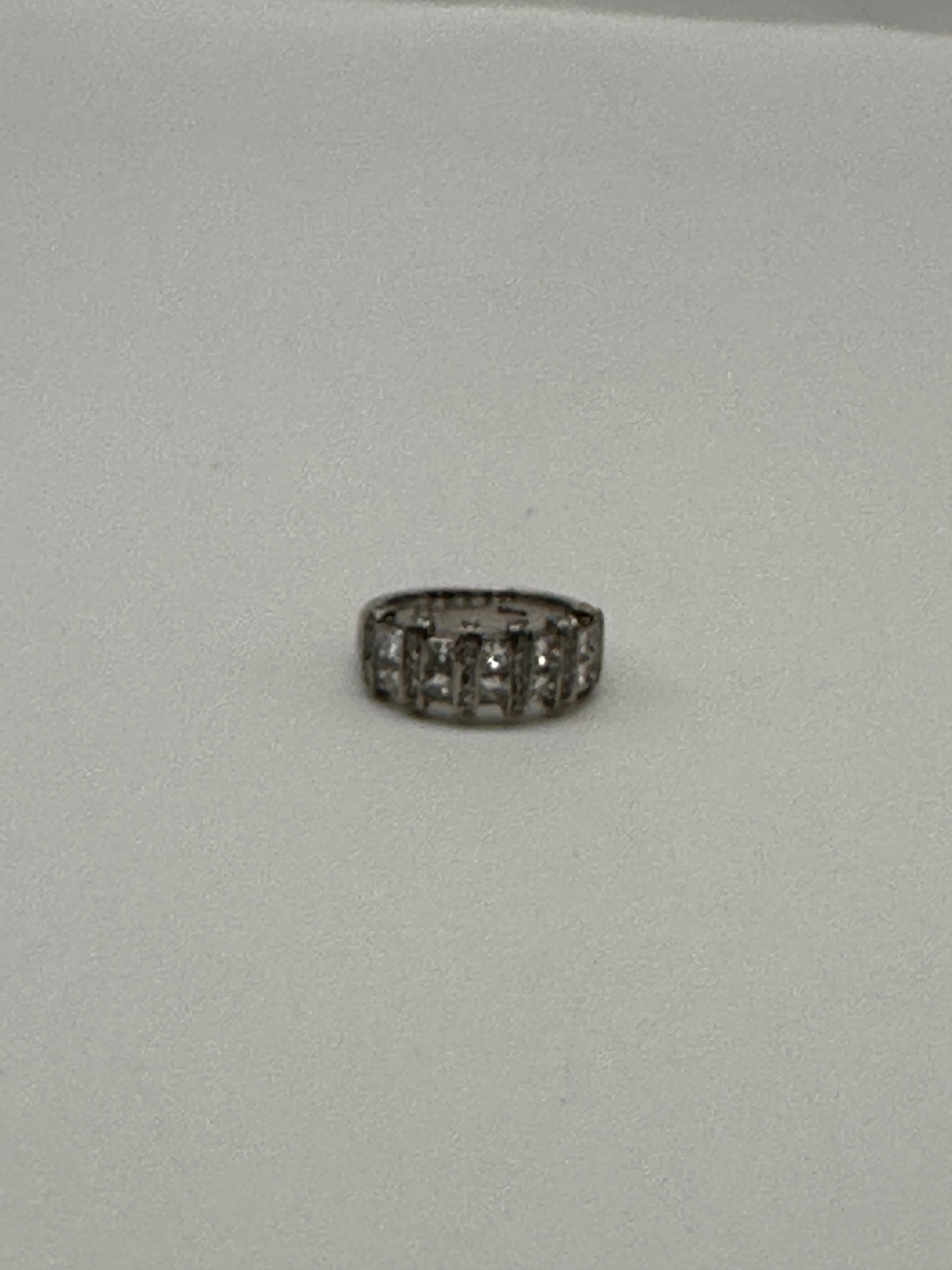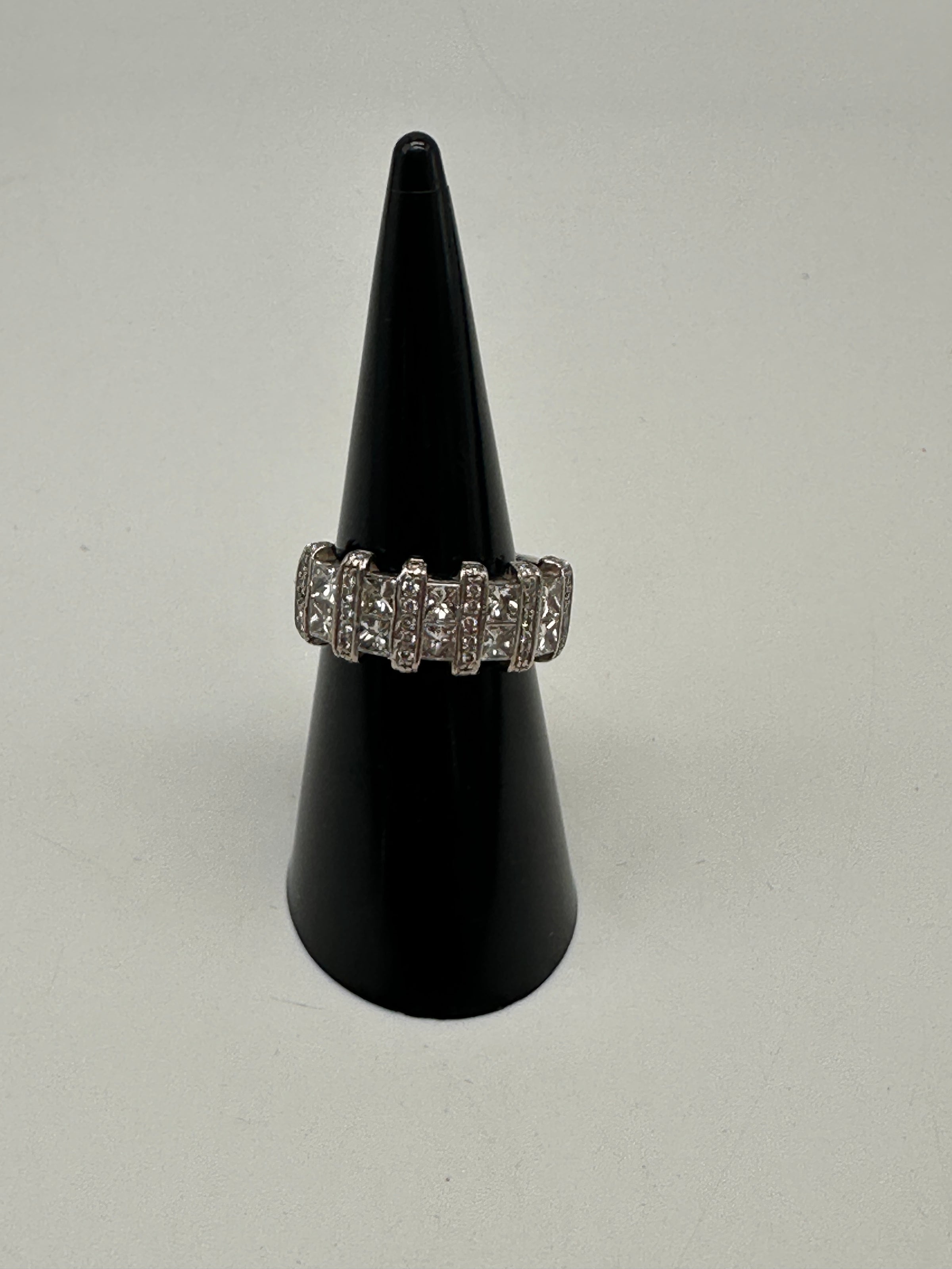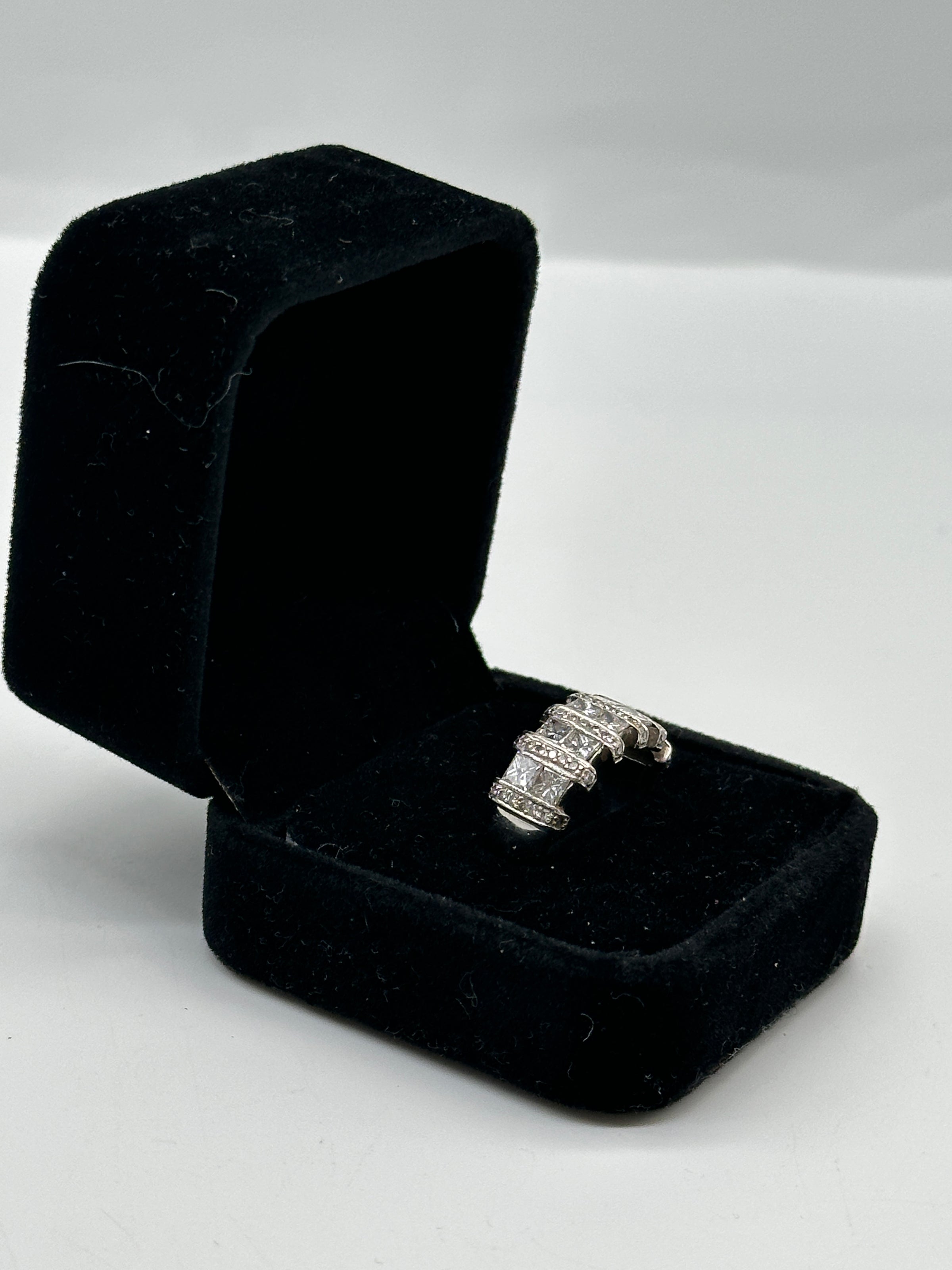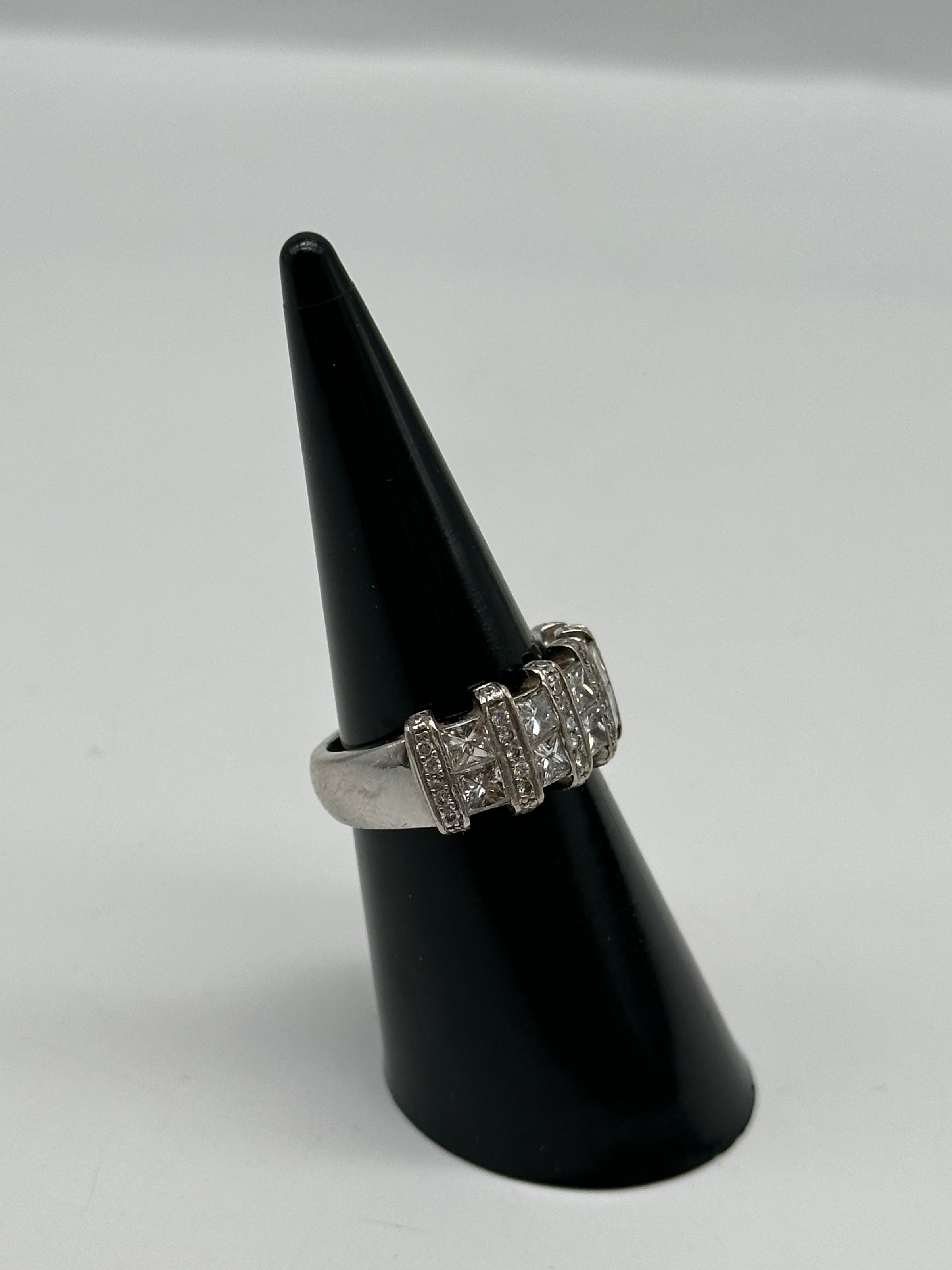 Band: Smooth polished white gold band, approximately 2–3 mm wide; the pavé bars provide visual rhythm between the more substantial princess stones. Total carat weight will depend on the size of stones specified, finger size L