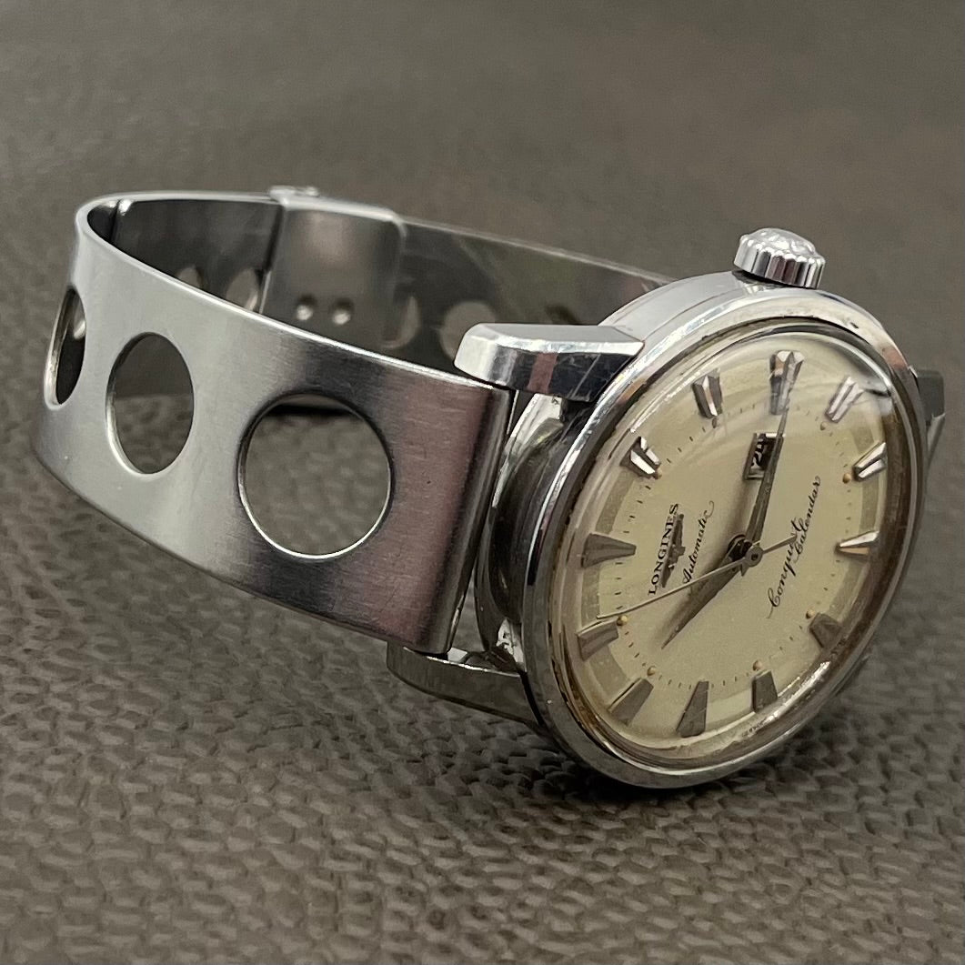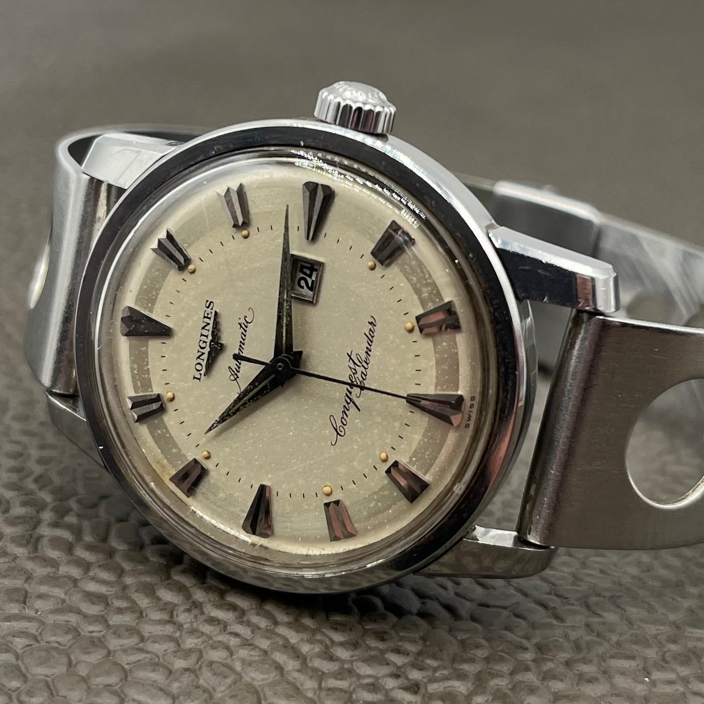 The Longines Conquest Calendar is a distinguished vintage watch from the mid-20th century. The robust 35mm steel case with faceted lugs presents very well for a watch of its age - showing that it has not been 'over-polished'. The warm ivory dial hosts applied indices and dauphine hands, ensuring optimal legibility. At its heart lies the automatic Calibre 19ASD movement, celebrated for its reliability and smooth performance. A notable design element is the case back, adorned with a champlevé enamel 14 ct gold medallion, adding a touch of luxury to the watch's understated profile.