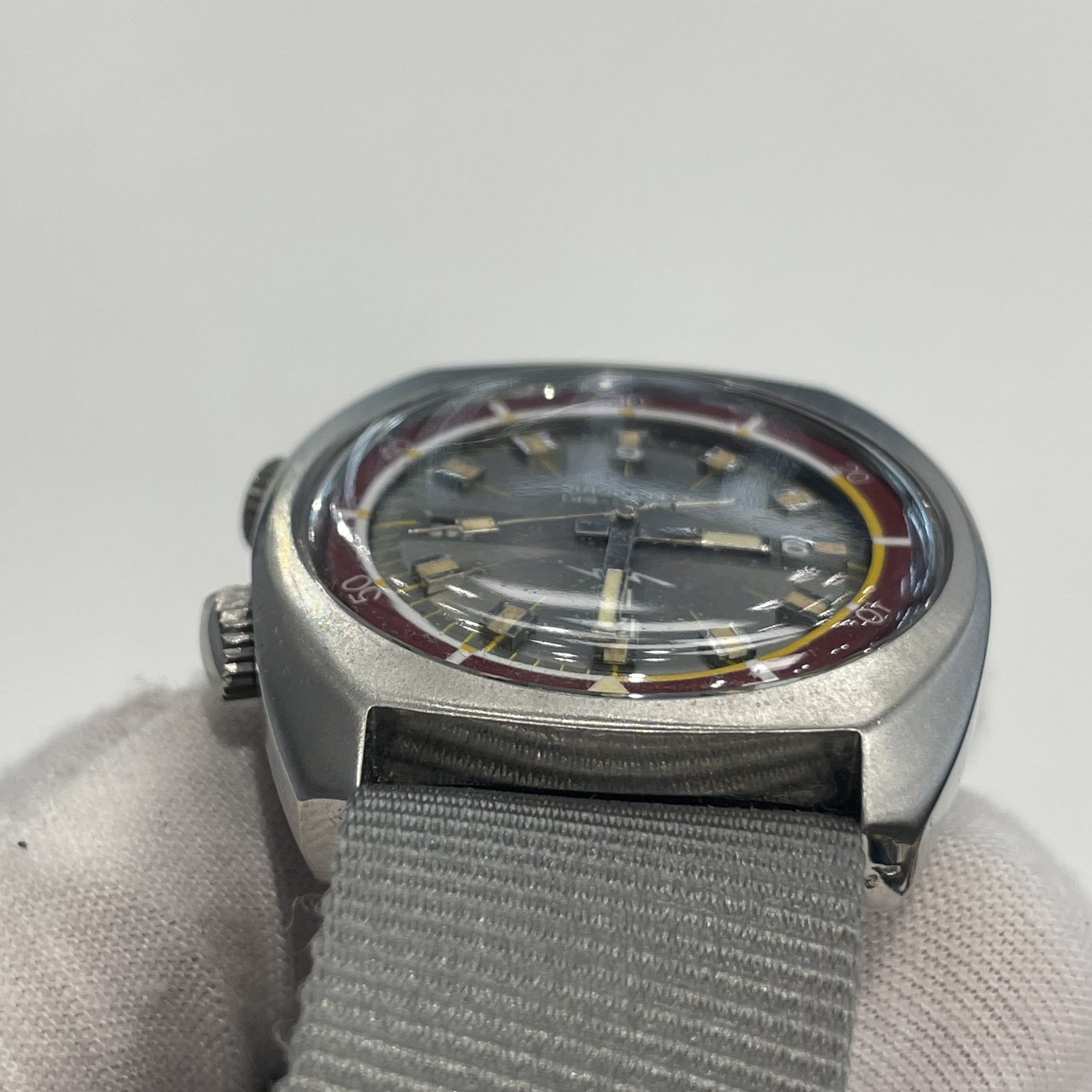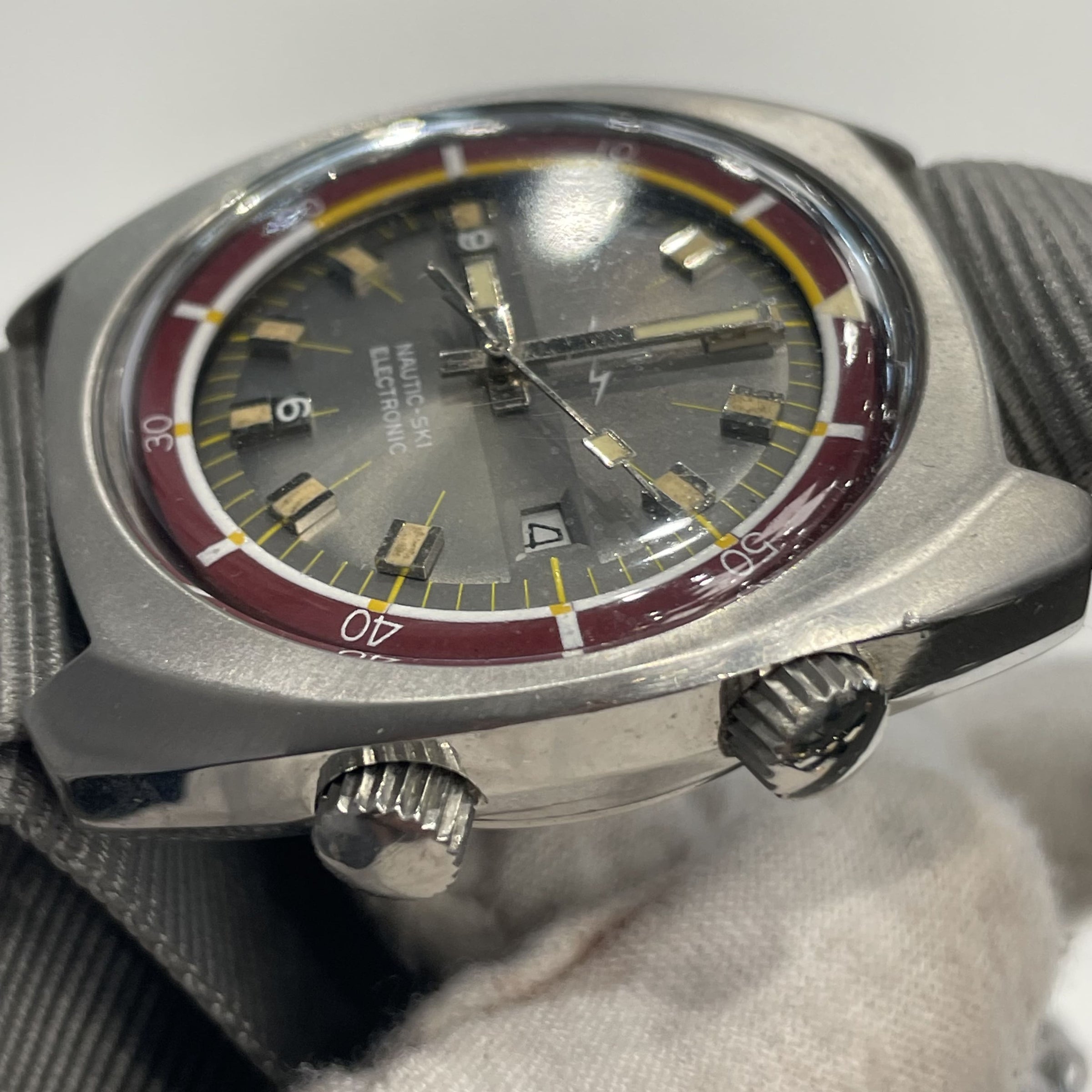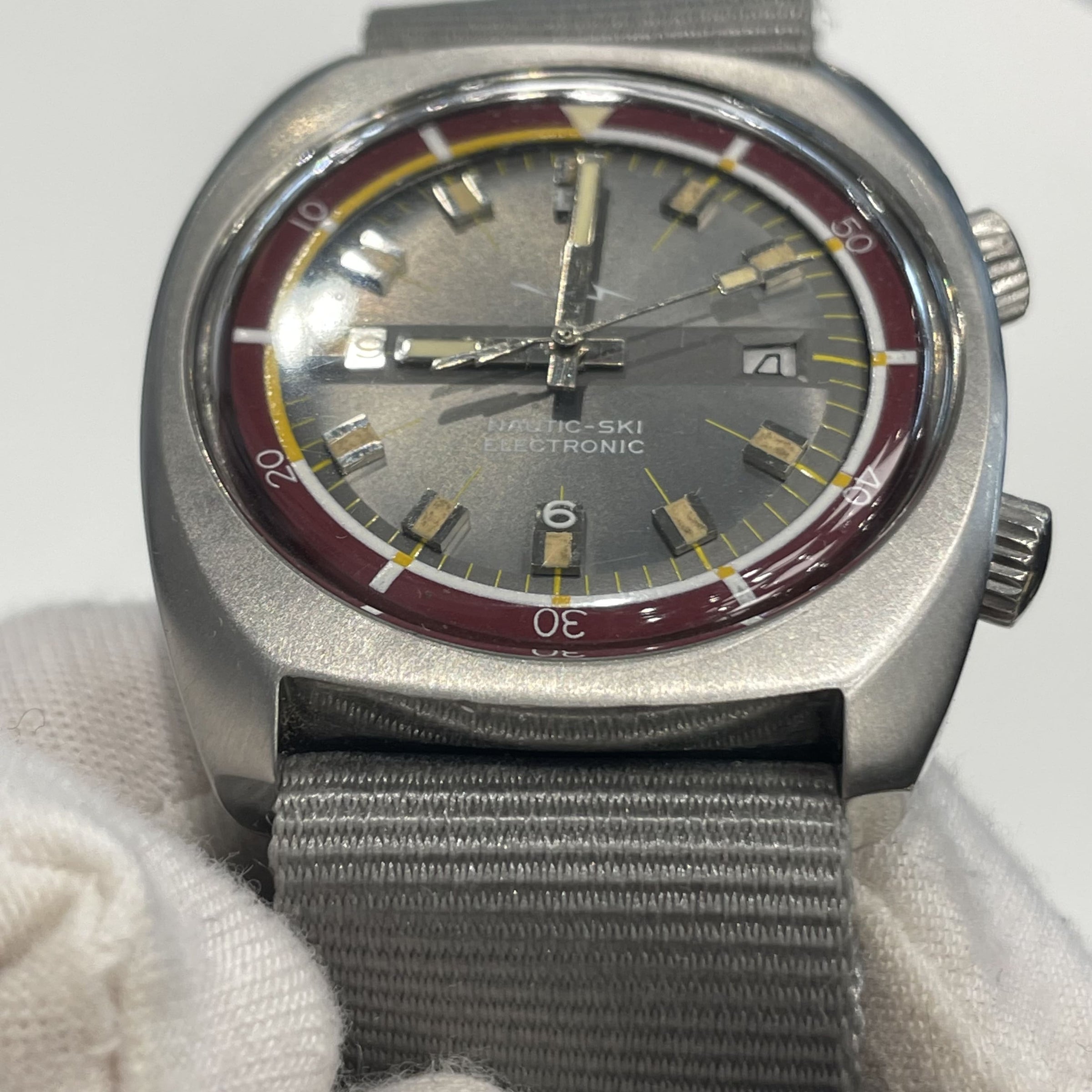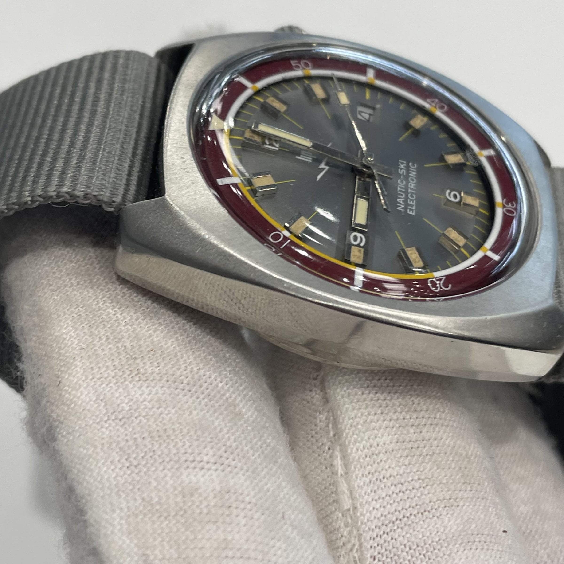 The Nautic Ski is a range of dive watches made by Lip. « Nautic » as a reference to diving, and « ski » in honor of Muriel, Fred Lipmann’s (owner of Lip) daughter, who was part of the French world skiing team. The Nautic-ski watches were to be the official watches of the 1968 Winter Olympics in Grenoble.