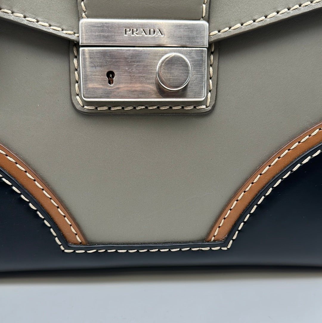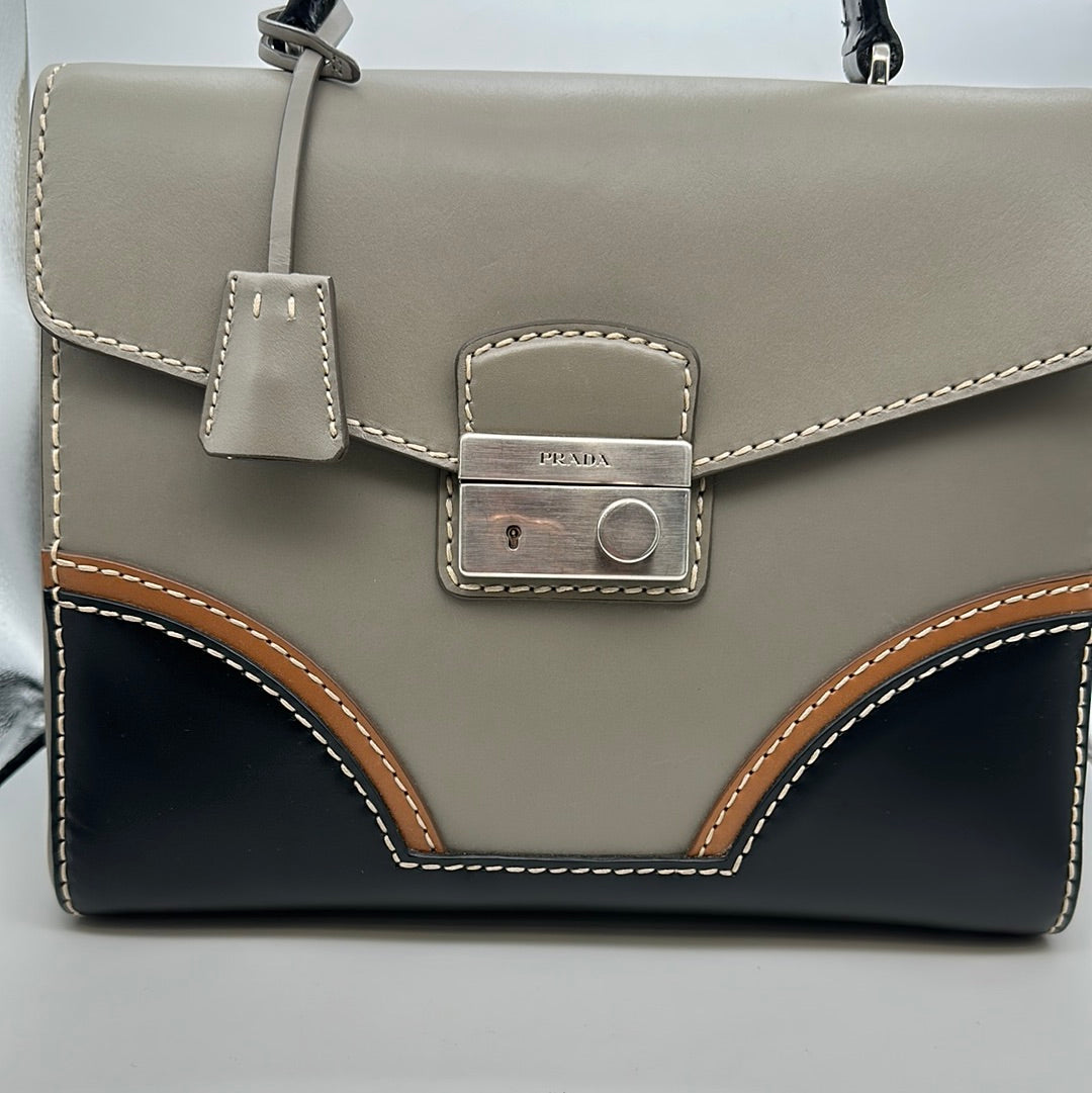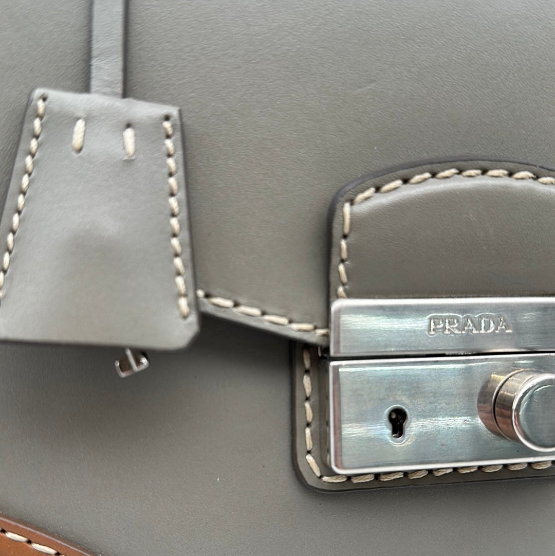 The pragmatic design with structured lines of the Prada Galleria bag is enhanced by a special airbrushed effect applied by hand that accentuates the silhouette of the bag made of iconic Saffiano, a calf leather patented by Mario Prada that is resistant to scratches and water and defined by its crosshatch texture. The accessory, which exemplifies the centennial excellence of Prada in luxury leather goods, becomes a reflection of the brand's modernity and stylistic identity that seeks to interpret kaleidoscopic contemporaneity. Originating the definition of "timeless", the Galleria bag has become a hallmark of Prada's identity in the twenty-first century