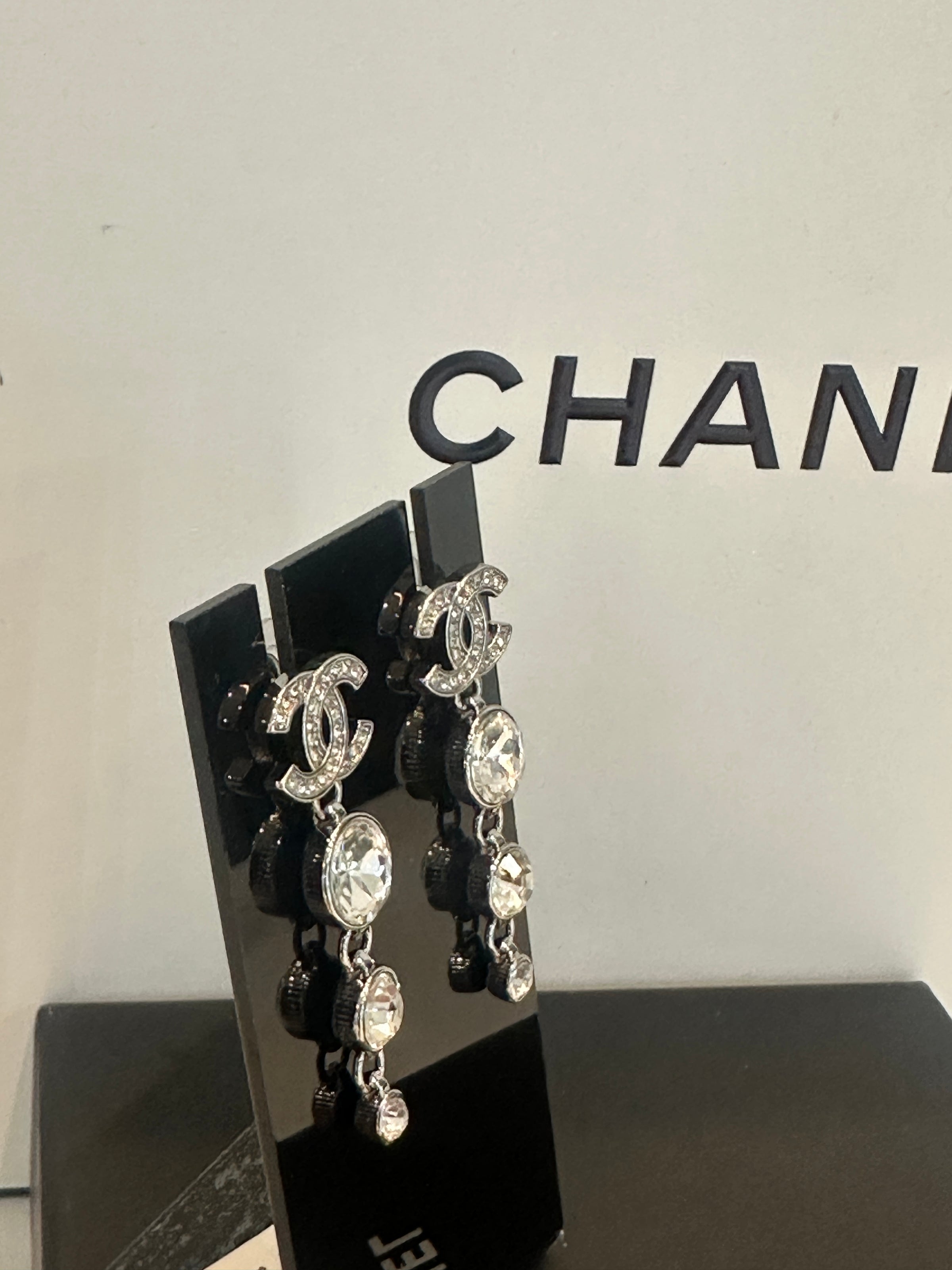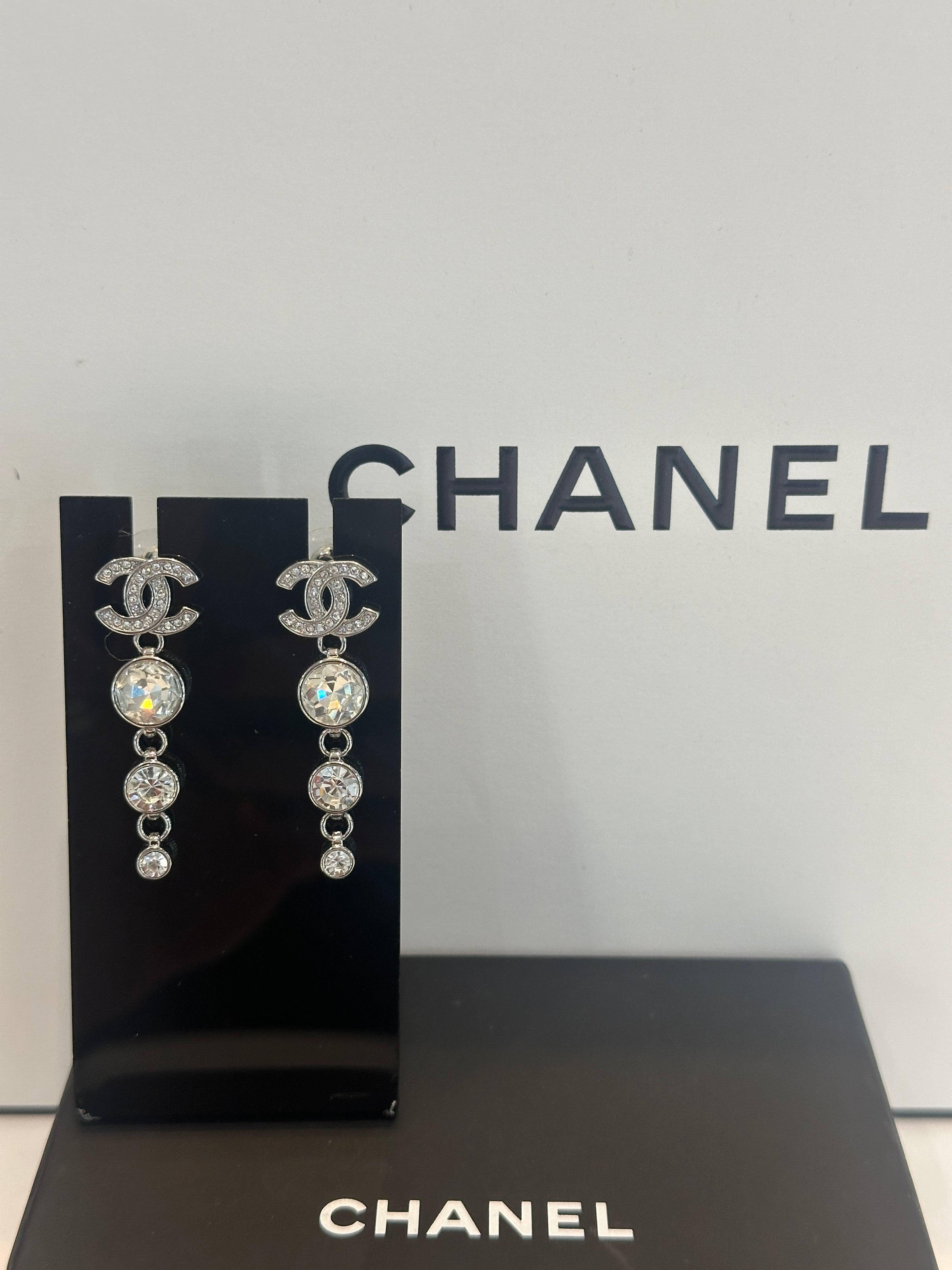 These elegant re-worked Chanel drop earrings are crafted in polished silver plate and feature the iconic CC logo adorned with sparkling clear crystals. The delicate drop design adds graceful movement, while the precision-set crystals provide brilliant light reflection for a refined and glamorous finish. Balancing sophistication with modern allure, these earrings perfectly capture Chanel’s timeless aesthetic — making them an ideal choice for both everyday elegance and evening occasions.