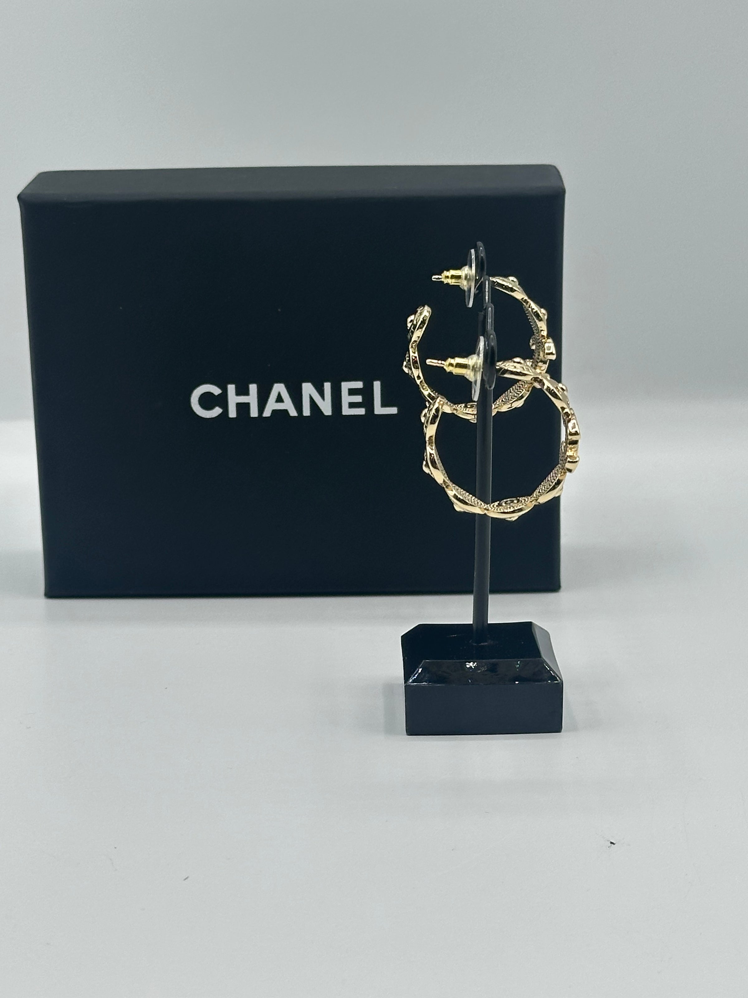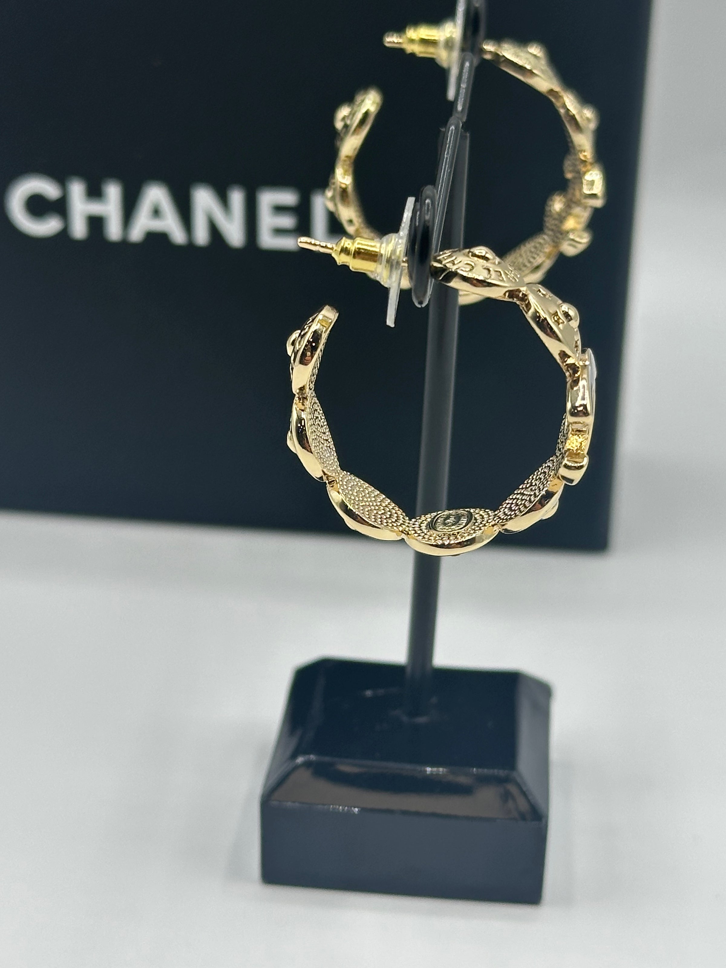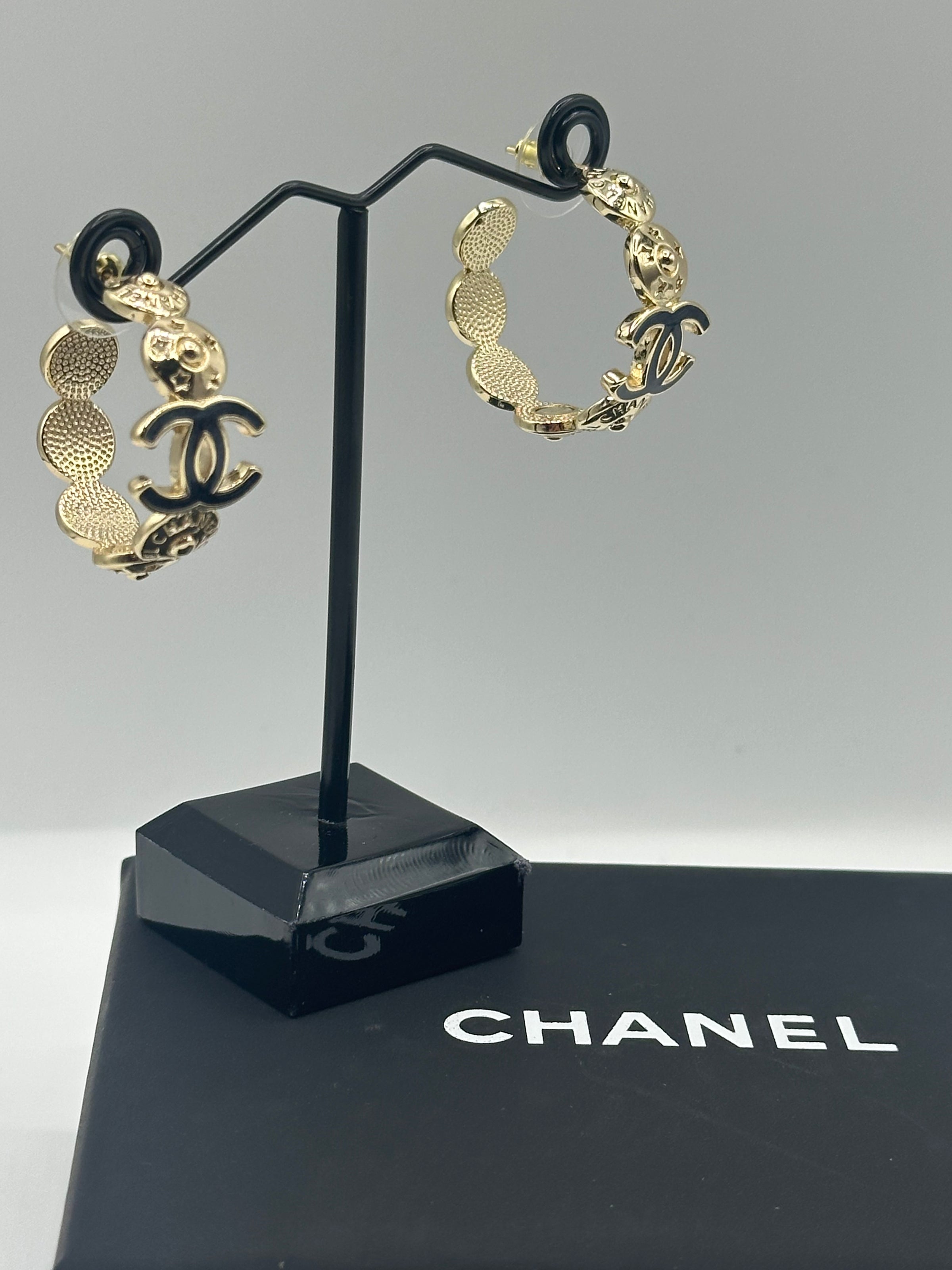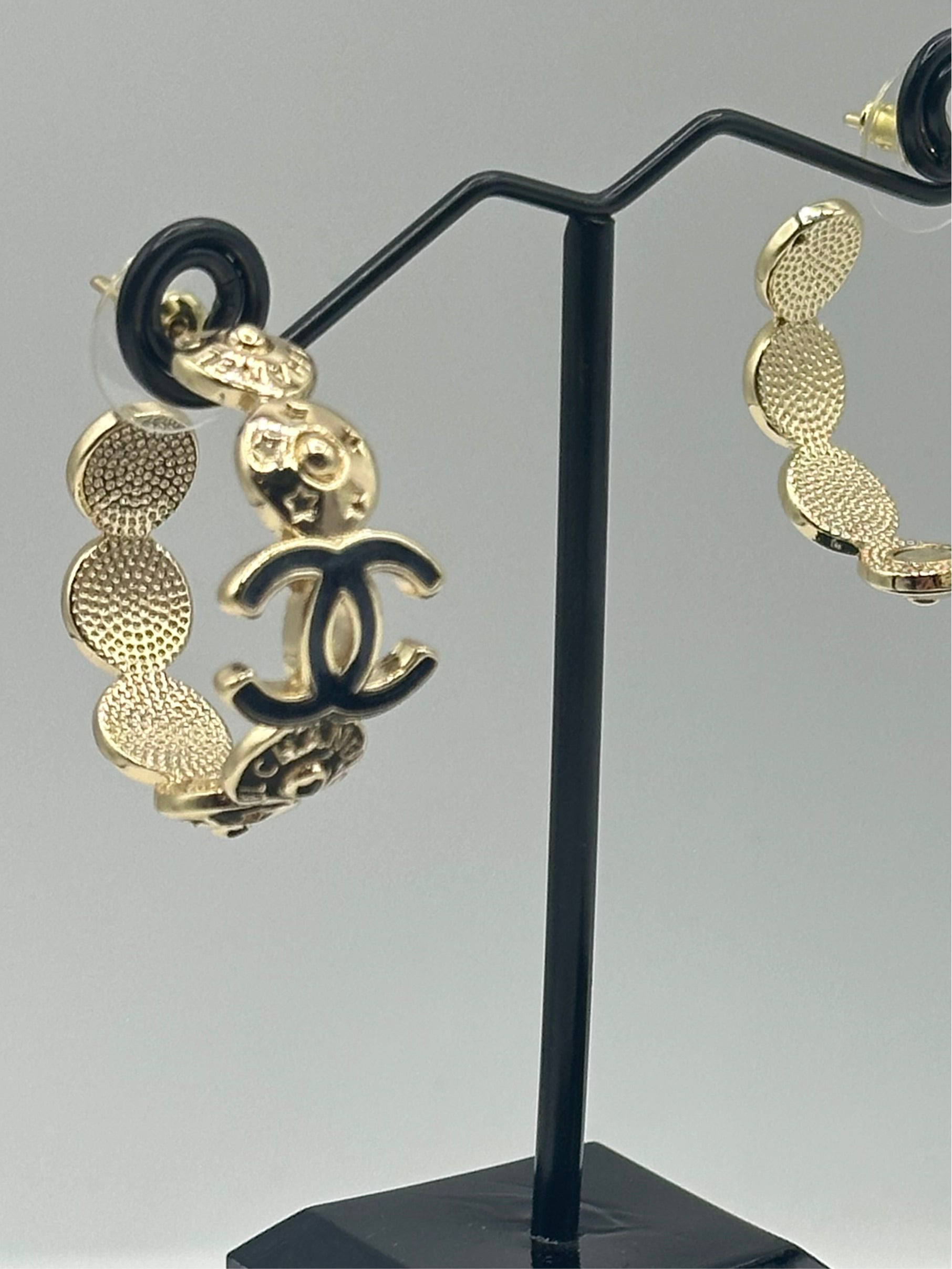 Bold yet refined reworked Chanel hoop earrings featuring polished gold-plated interlocking CC logos—timeless luxury with a contemporary edge.