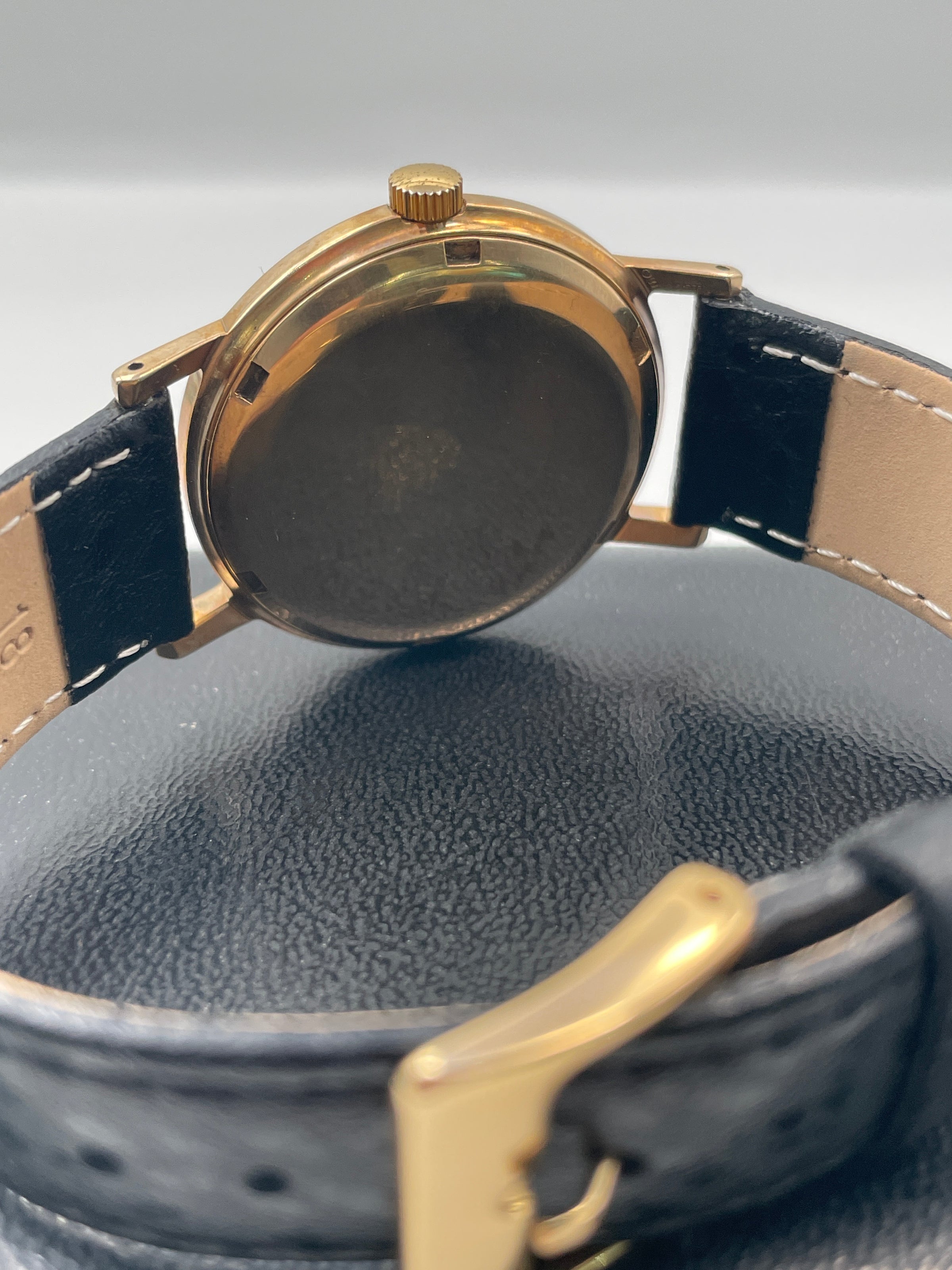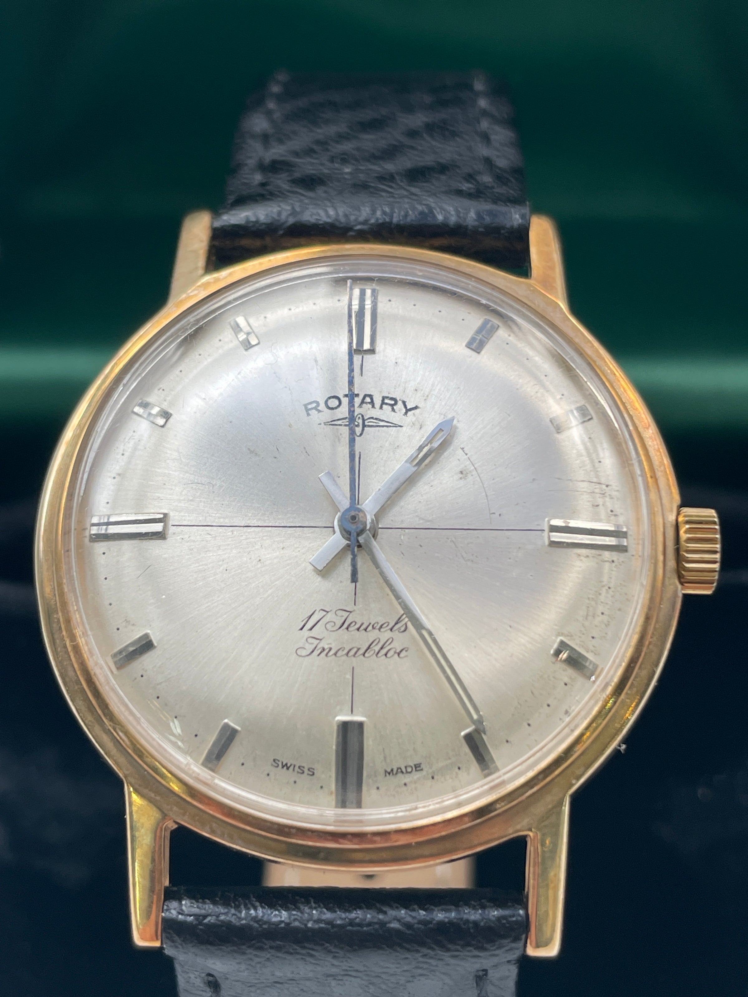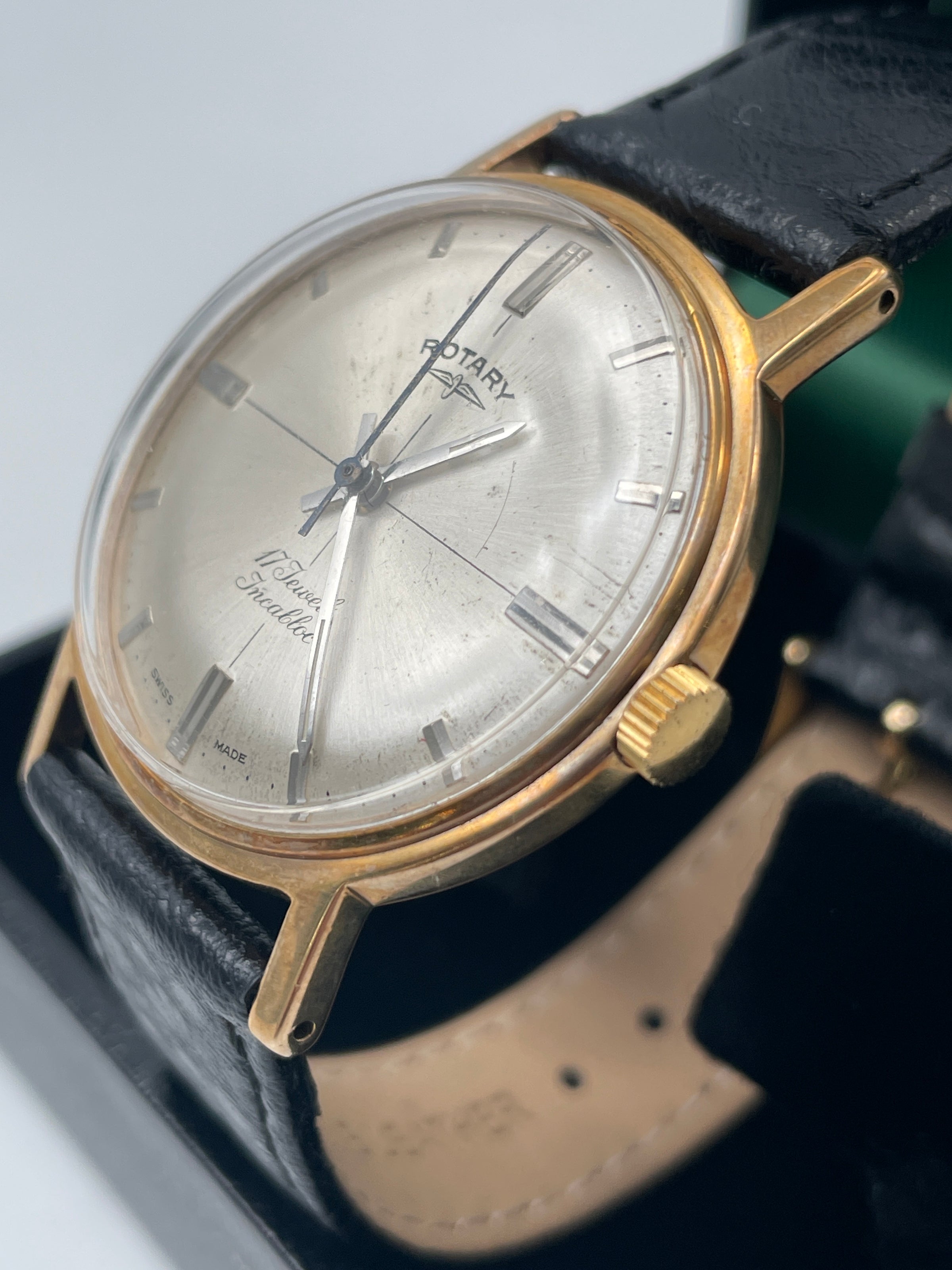 Here is a classic styled gents watch set into a 9ct yellow gold case, adding a touch of luxury with timeless style. The dial is a light silver tone with fine star burst brushwork from the centre outwards. There are rectangular batons of two varying sizes for simplistic but easy time reading. The movement is a 17 Jewell automatic Incabloc mechanism. The black leather strap are not original. Approximate dimensions: Case width: 34mm, Lug to lug: 40mm, Depth: 10mm.