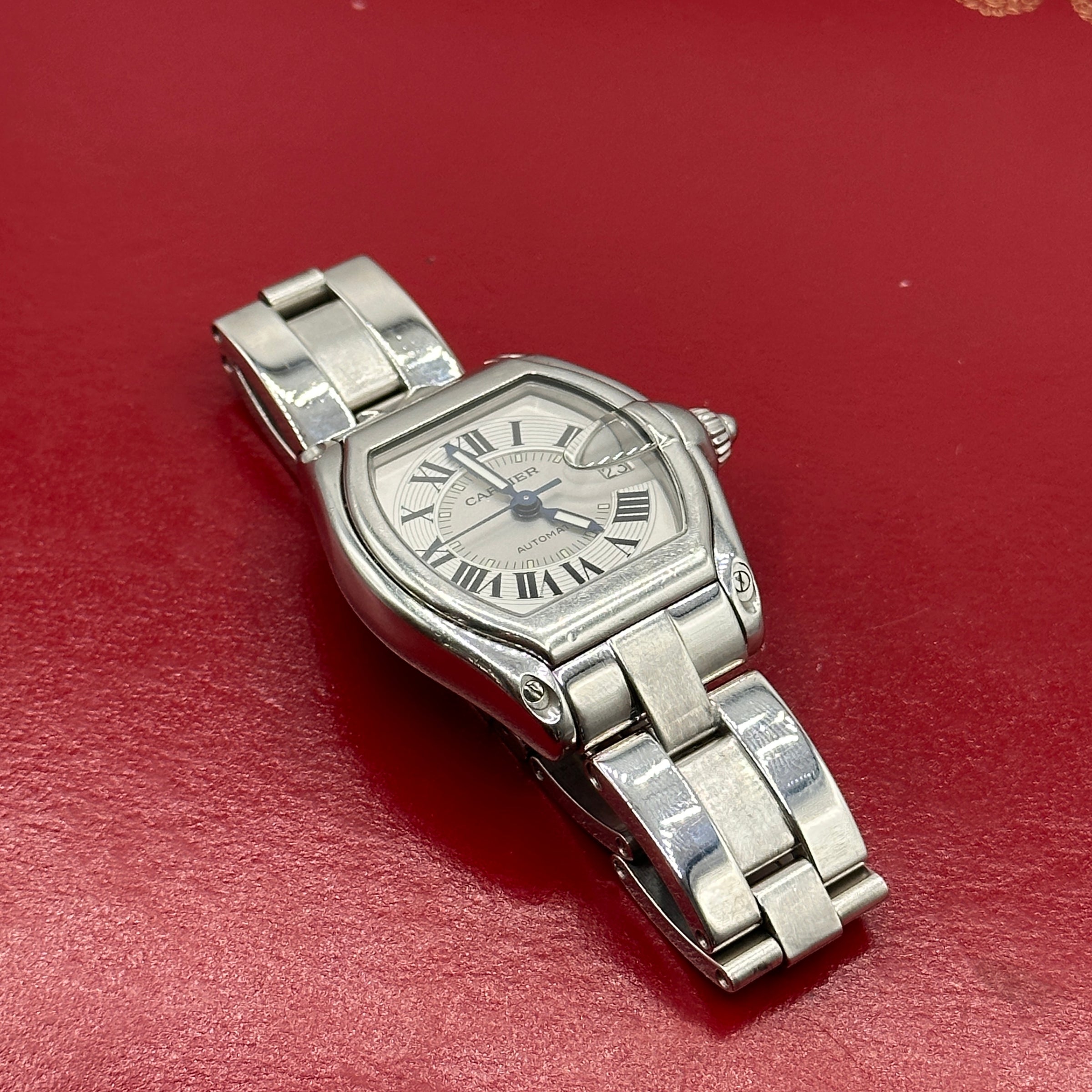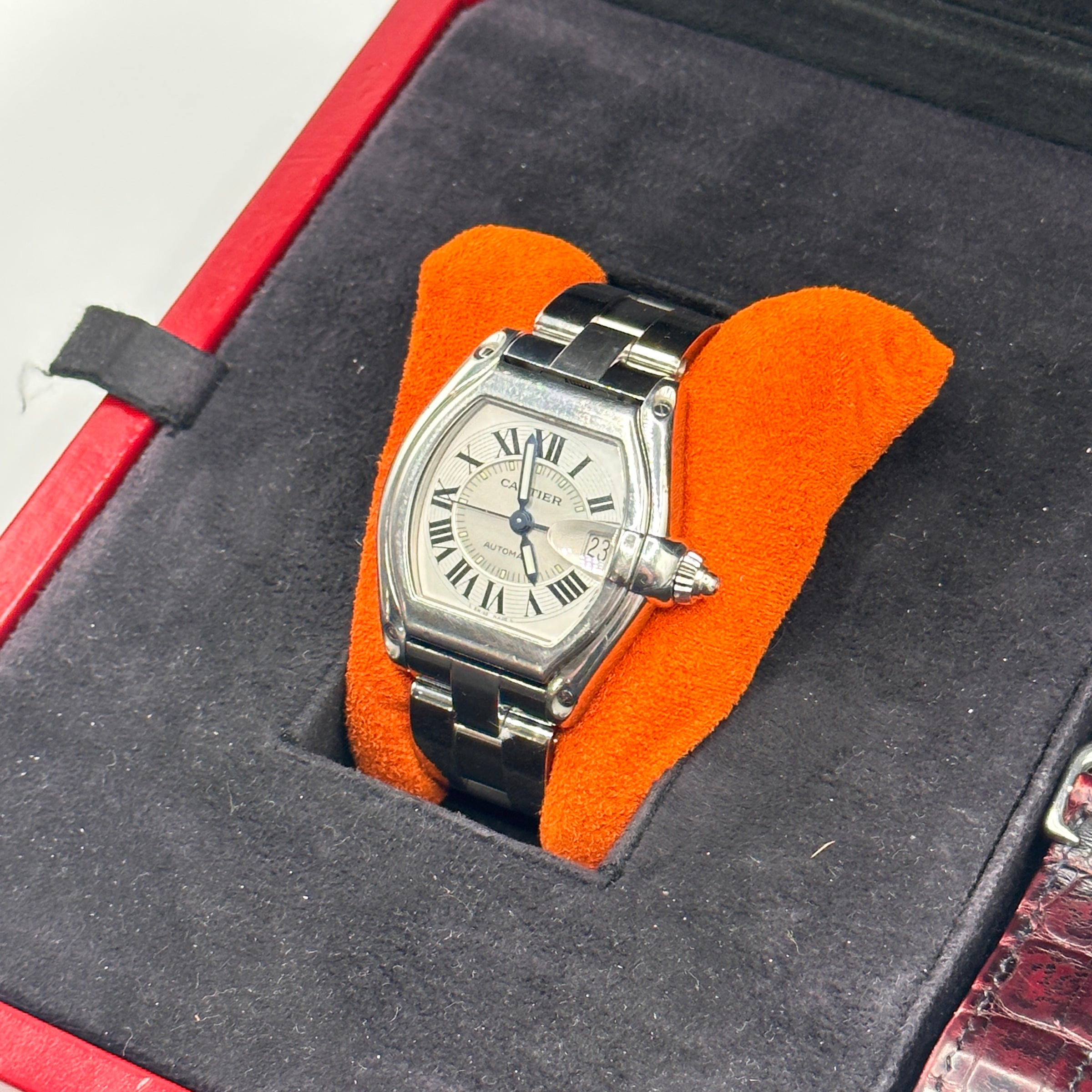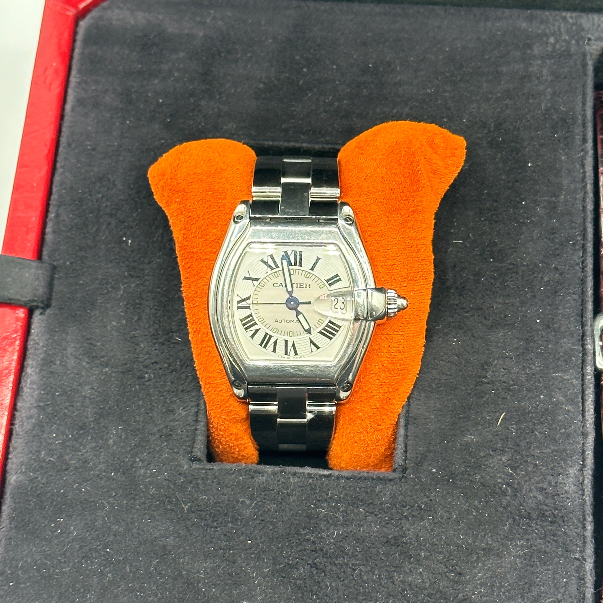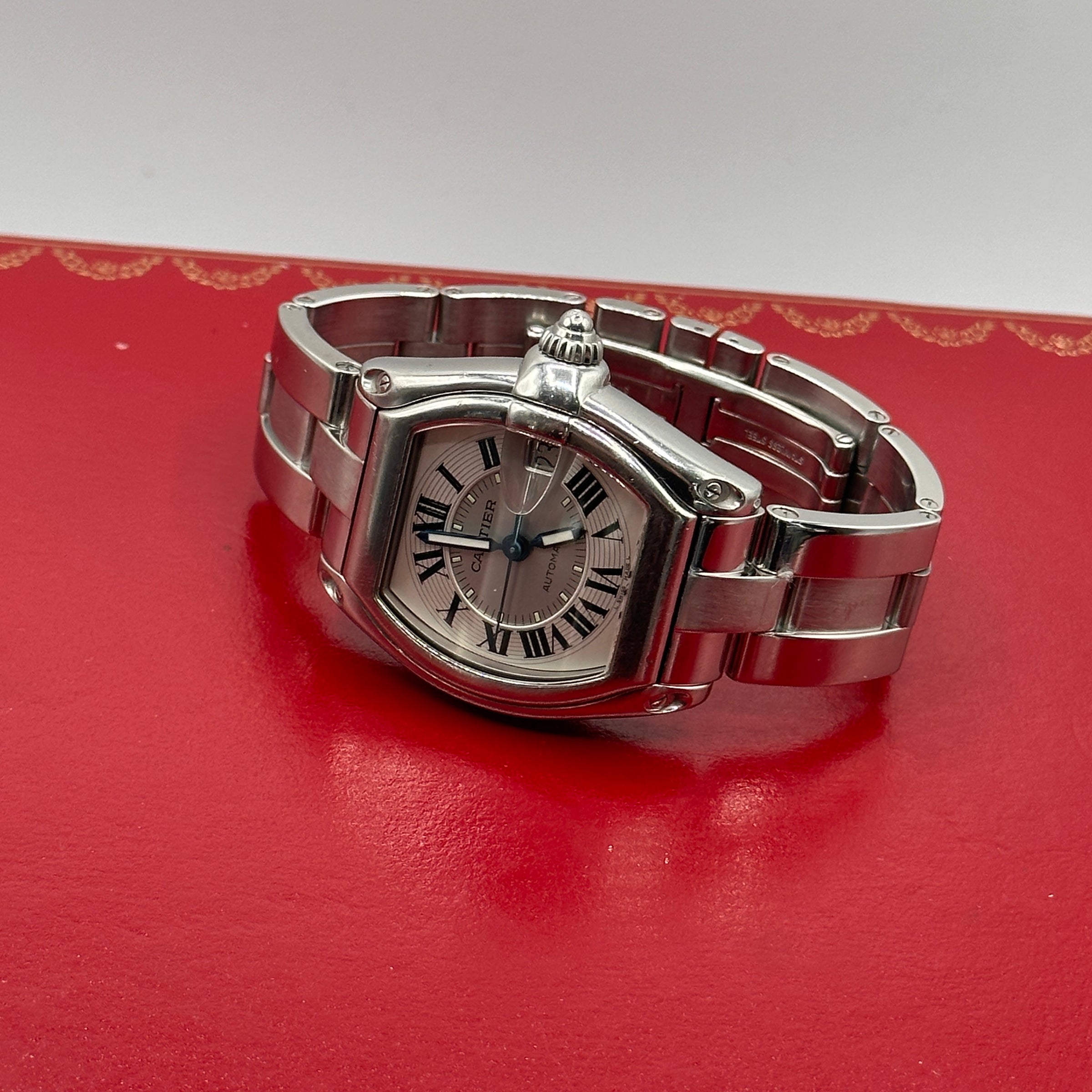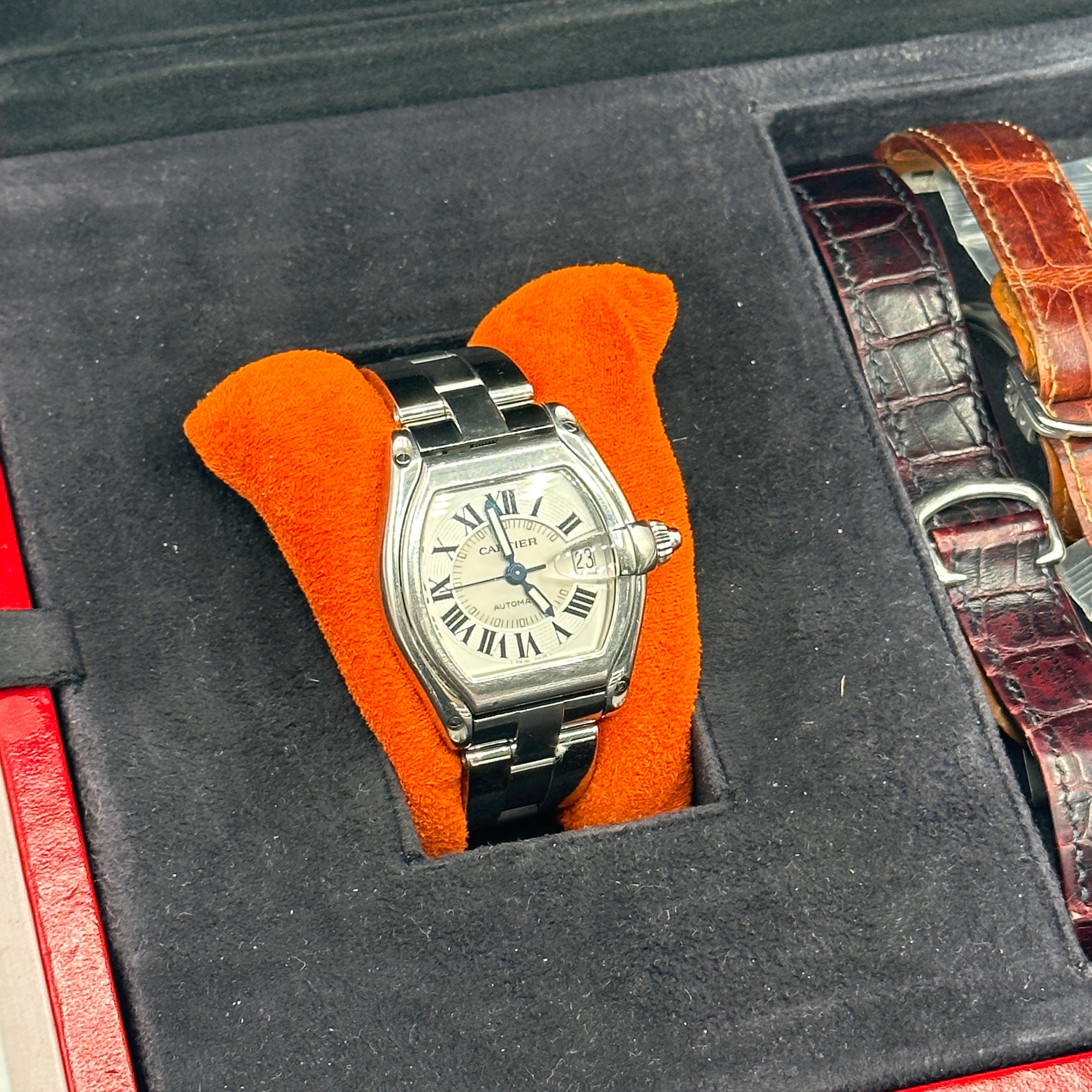 The classic version of the Roadster measures 38 x 43mm, with a silver sunray dial, Roman numerals along a concentric track, luminescent sword-shaped steel hands, and an oversized magnifying lens over the date.