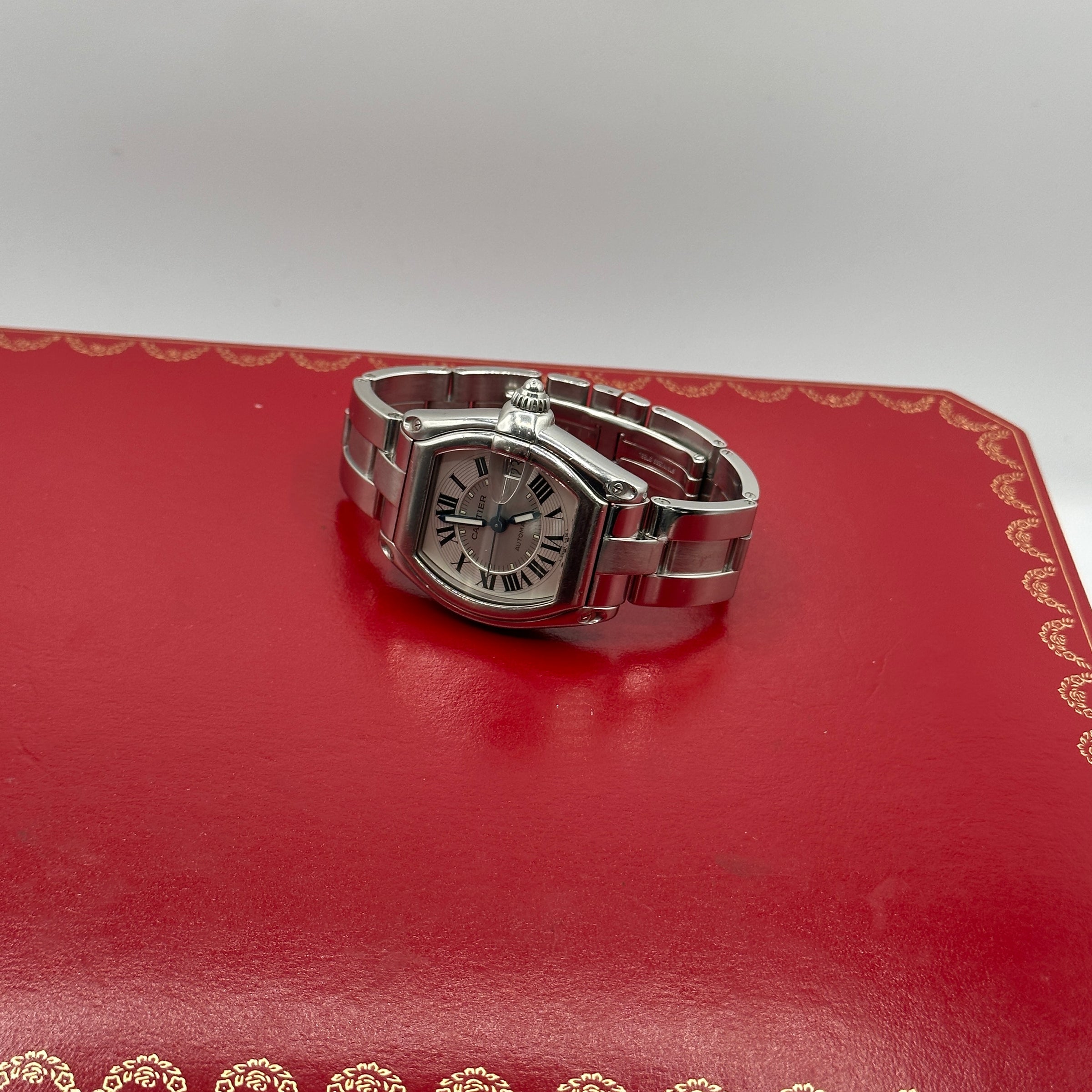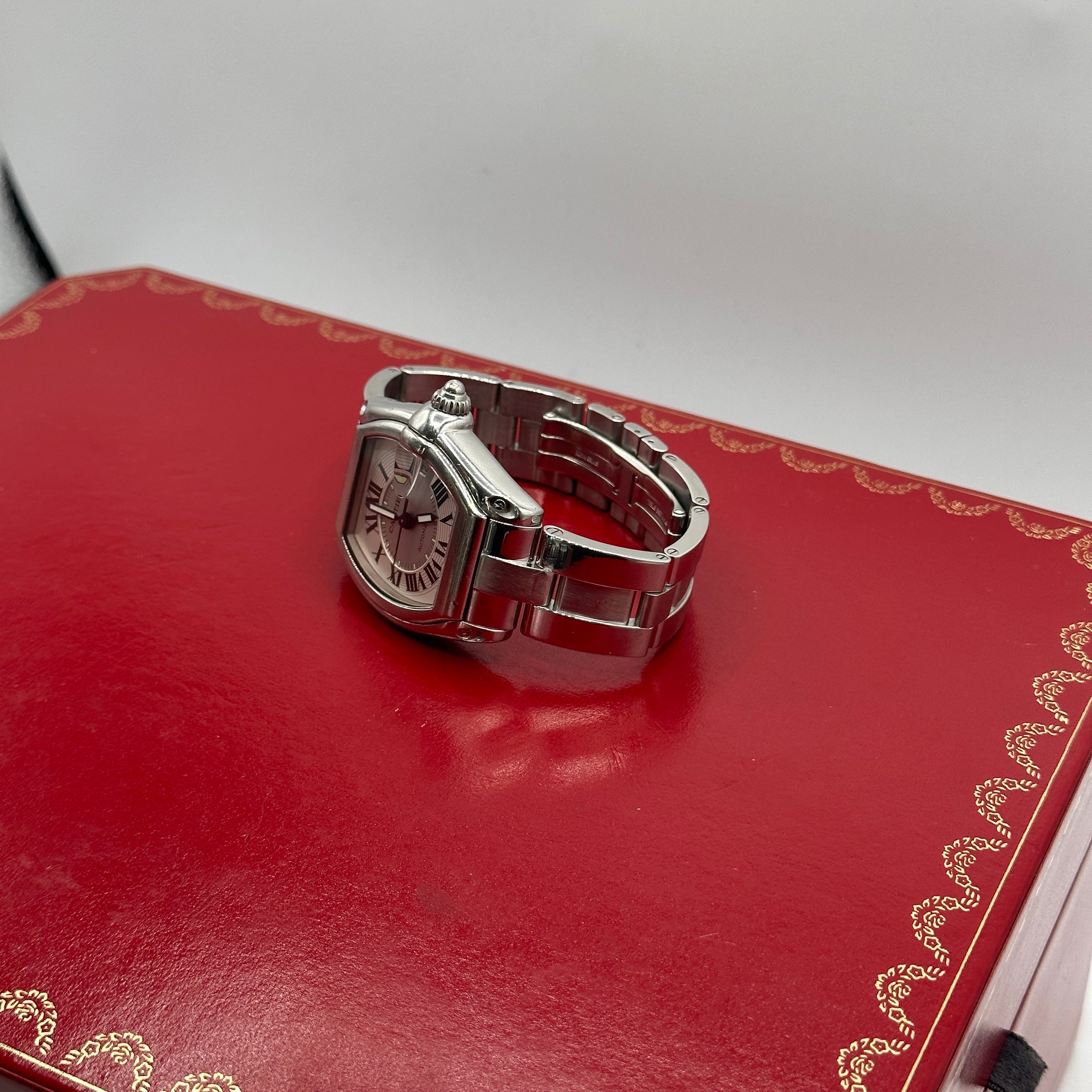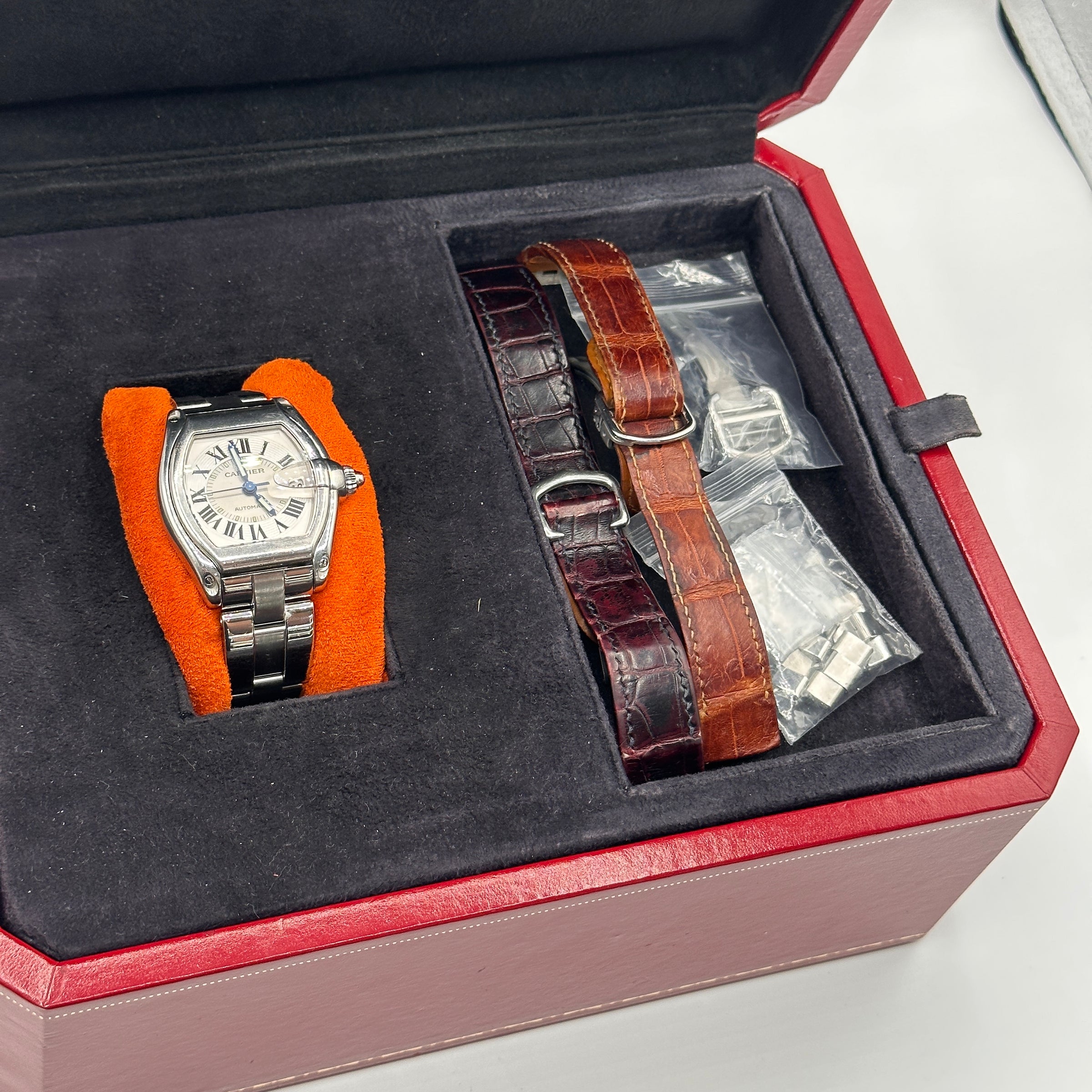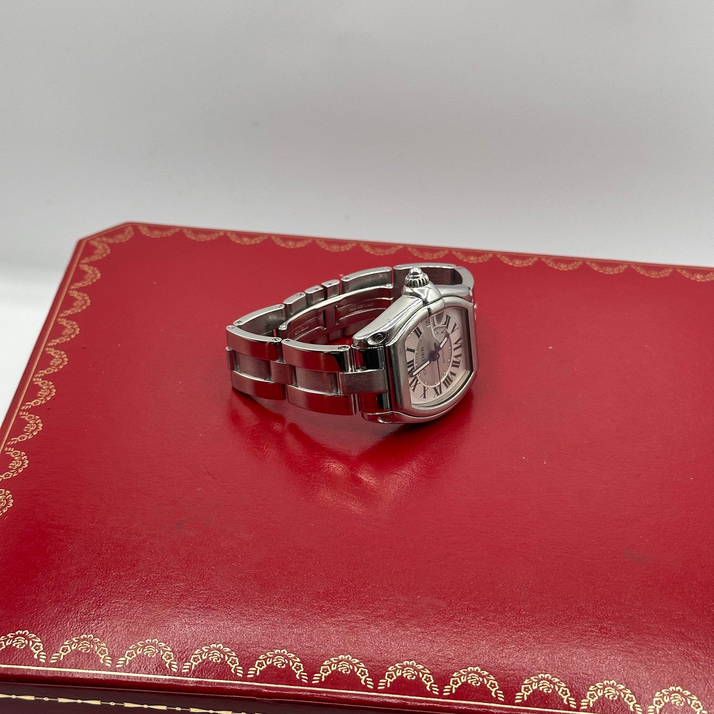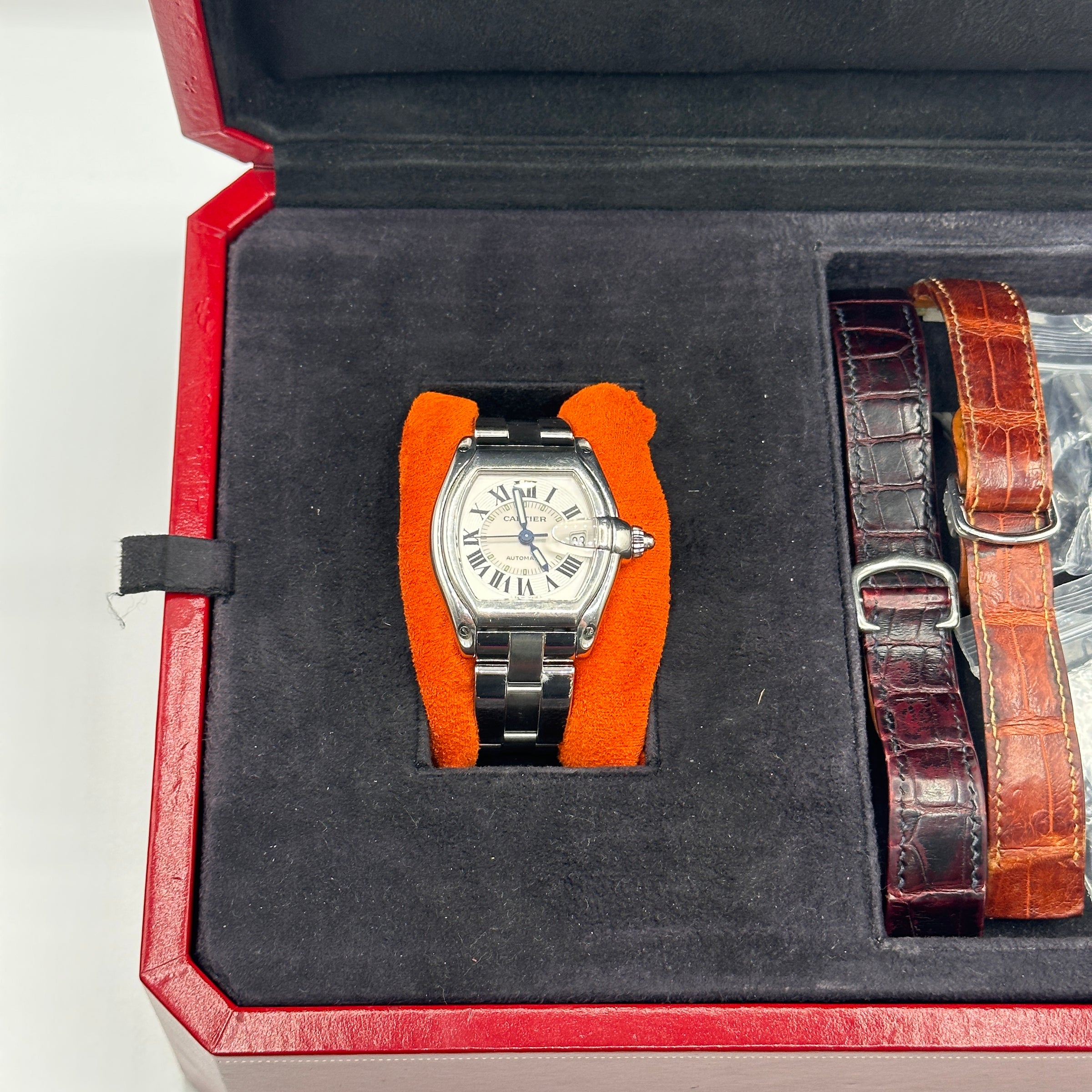 The classic version of the Roadster measures 38 x 43mm, with a silver sunray dial, Roman numerals along a concentric track, luminescent sword-shaped steel hands, and an oversized magnifying lens over the date.