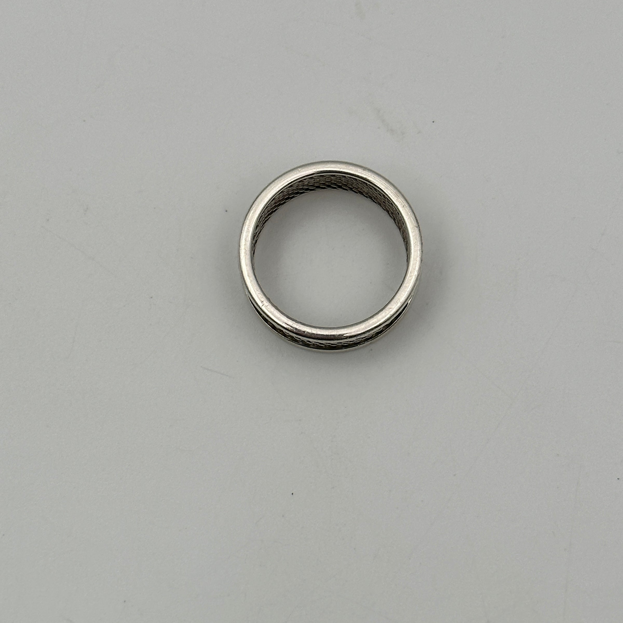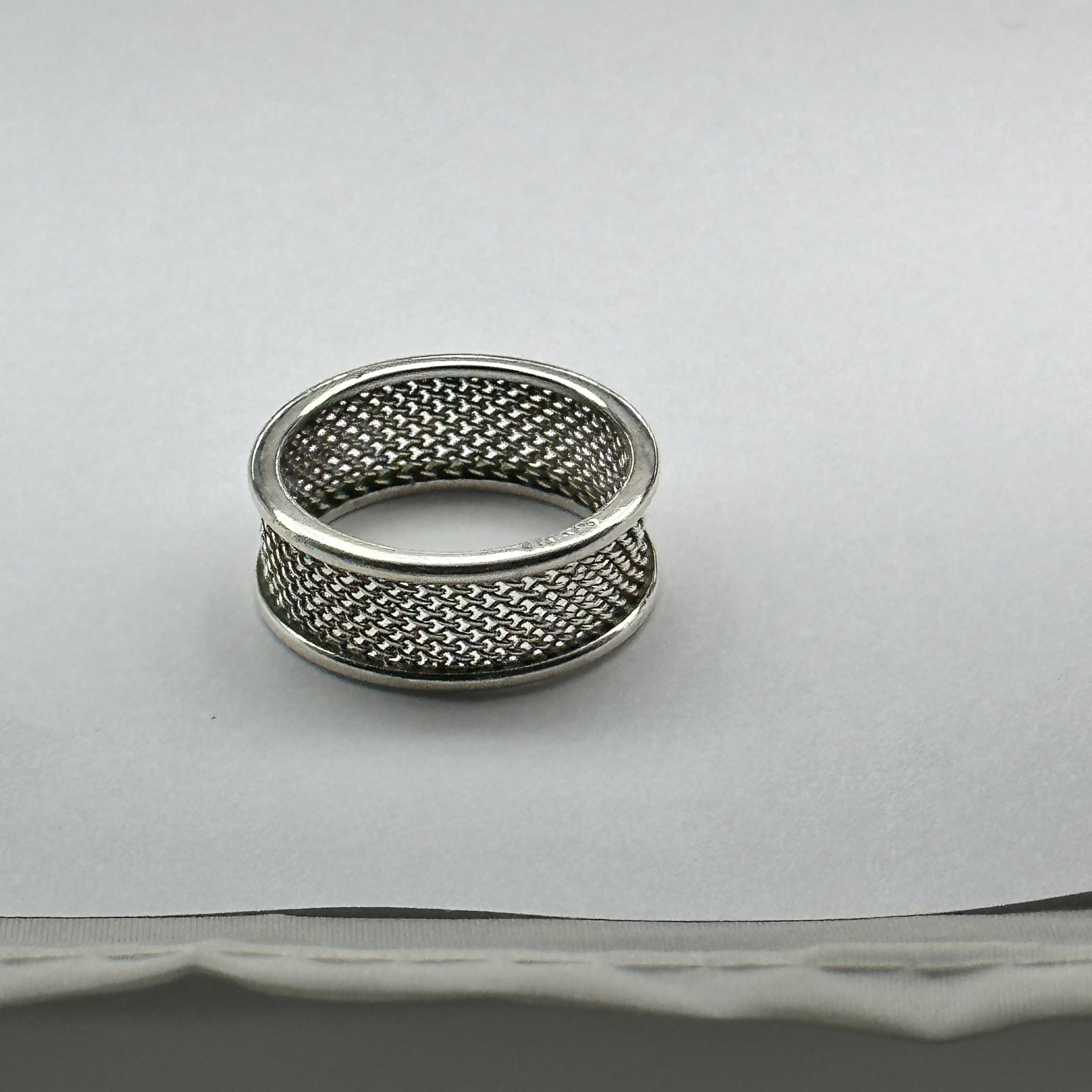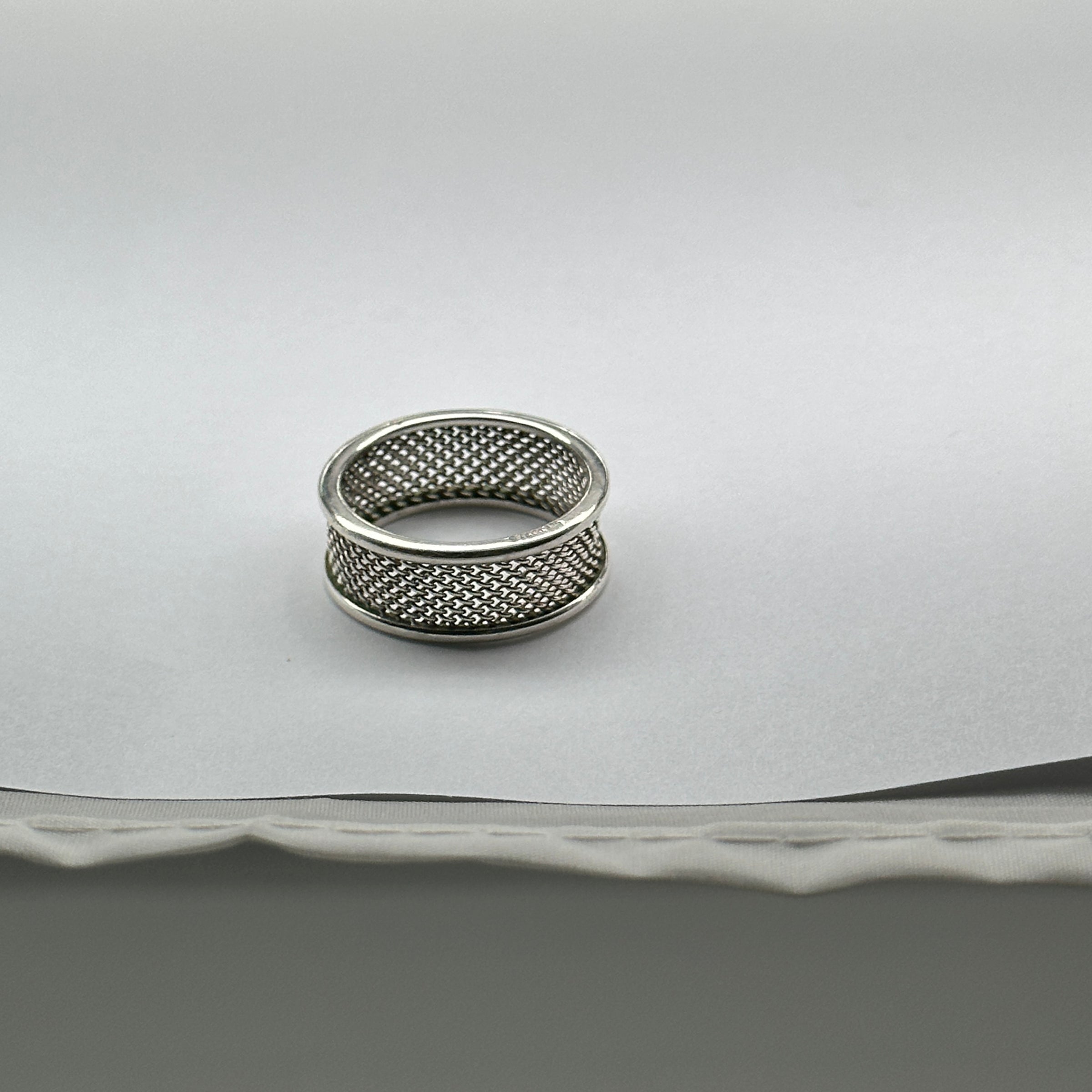 Key Features: The ring's wide band design makes a bold statement, while its mesh construction allows for slight flexibility, enhancing wearability.