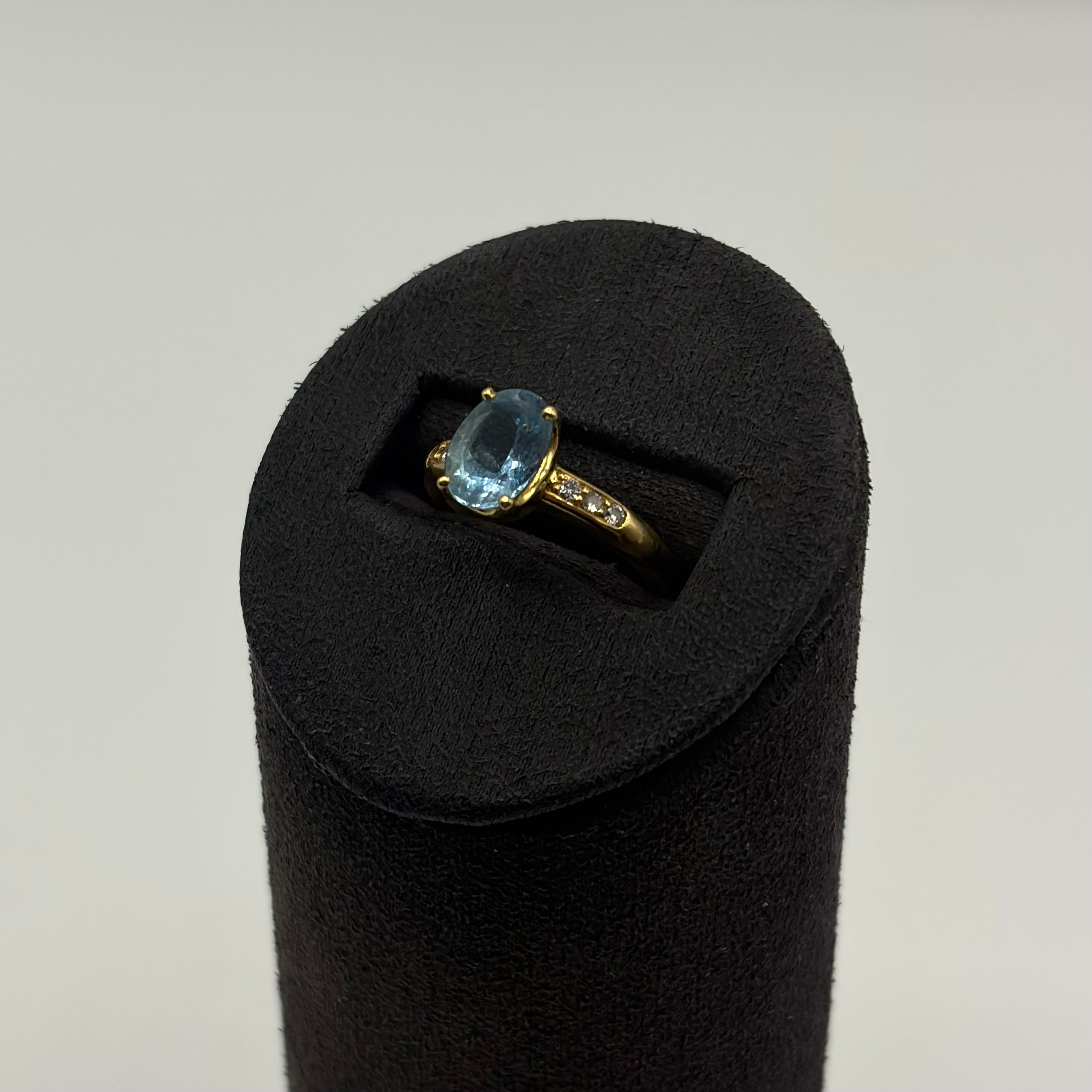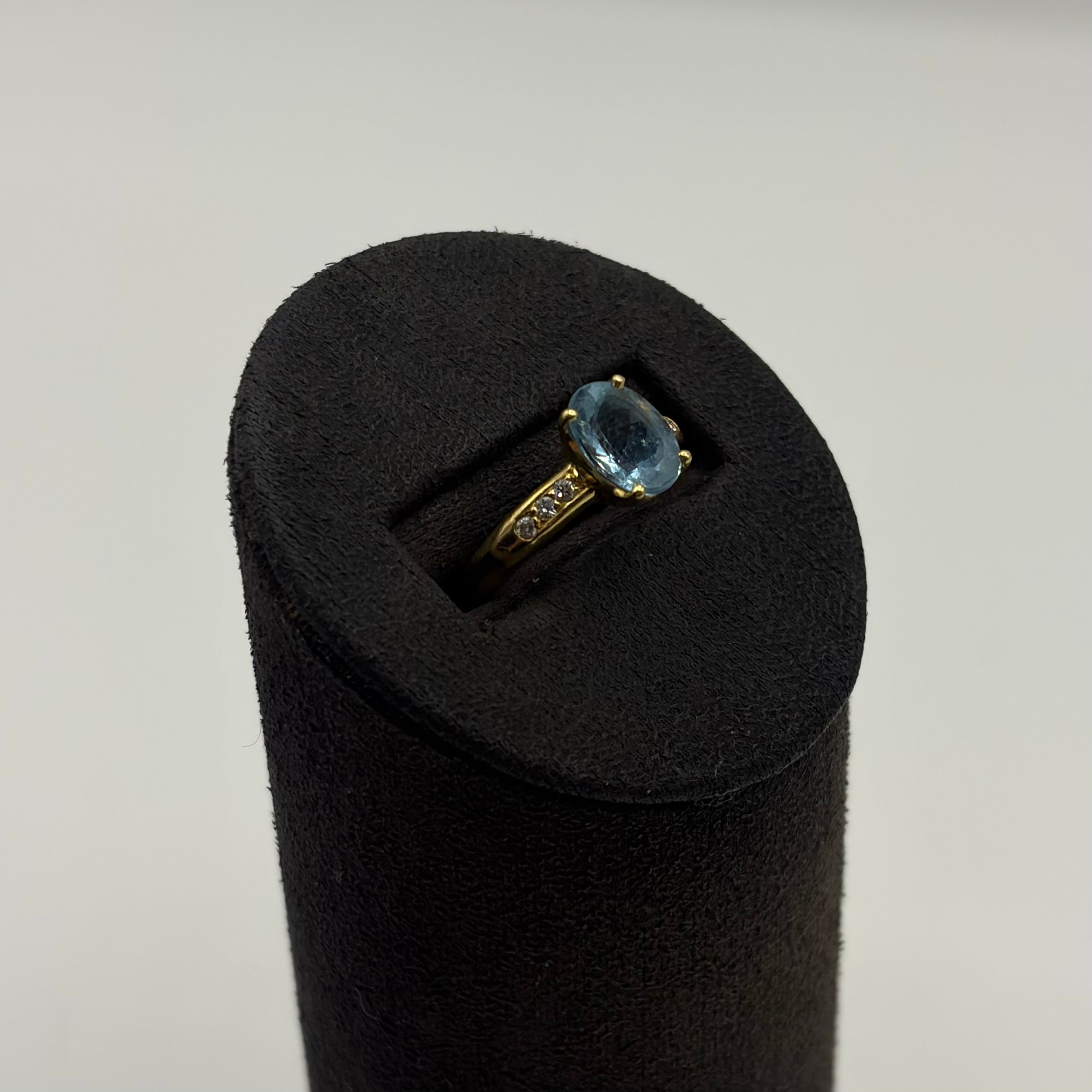 This elegant ring is crafted in 18ct yellow gold and centred with a beautifully faceted oval aquamarine, celebrated for its serene blue tone and refined brilliance. The gemstone is securely claw-set to allow maximum light play, enhancing its natural luminosity. Each shoulder is adorned with three brilliant-cut diamonds, adding delicate sparkle and enhancing the ring’s balanced, luxurious profile. A timeless piece that combines soft colour with classic craftsmanship, ideal for both special occasions and refined everyday wear.
