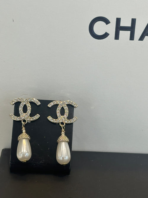 Chanel Silver Crystal CC Logo Earrings With Drop Down Pearls