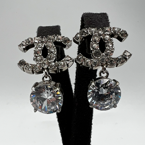 Chanel Silver Crystal CC Logo Earrings With Drop Down Diamante