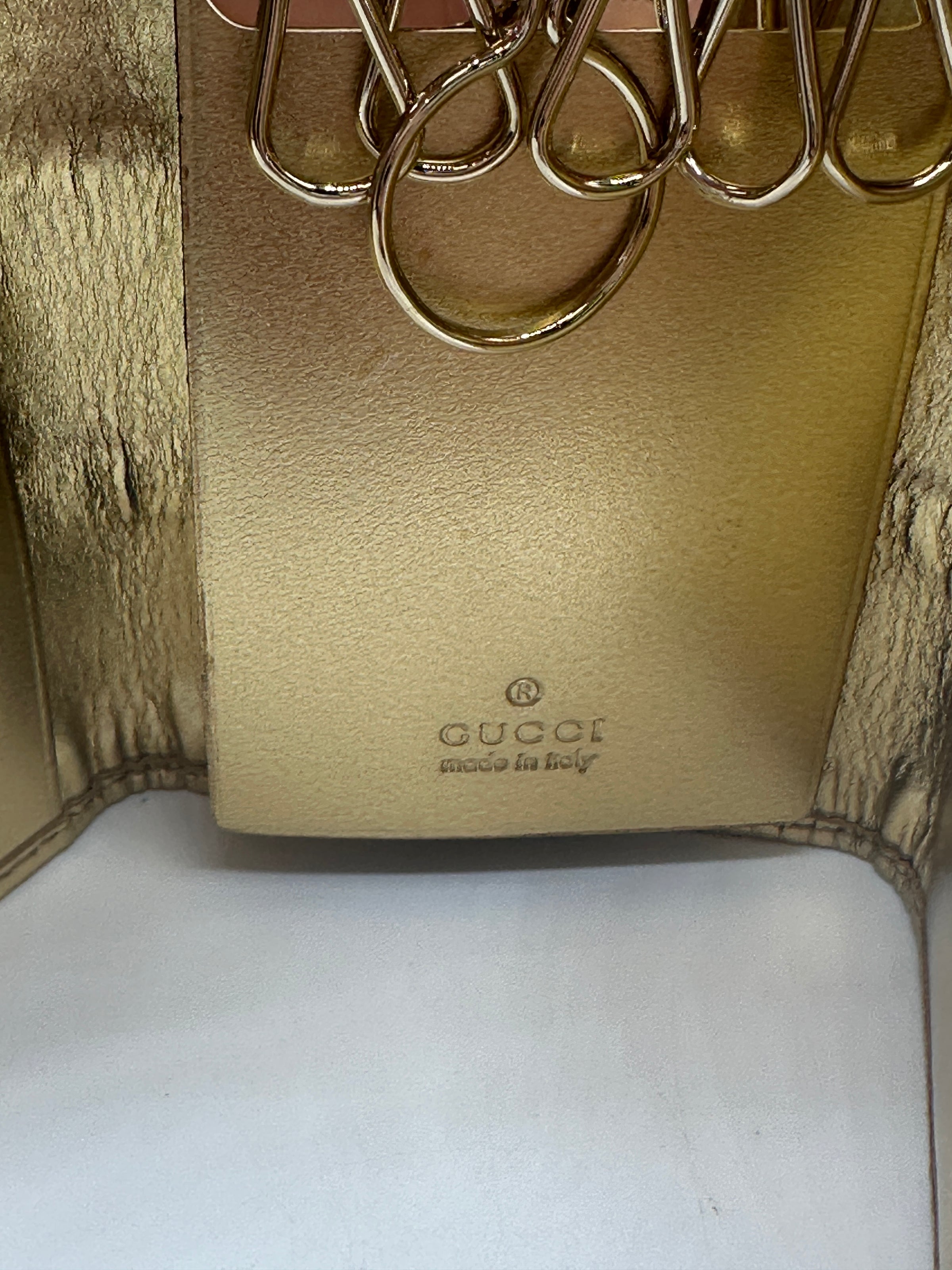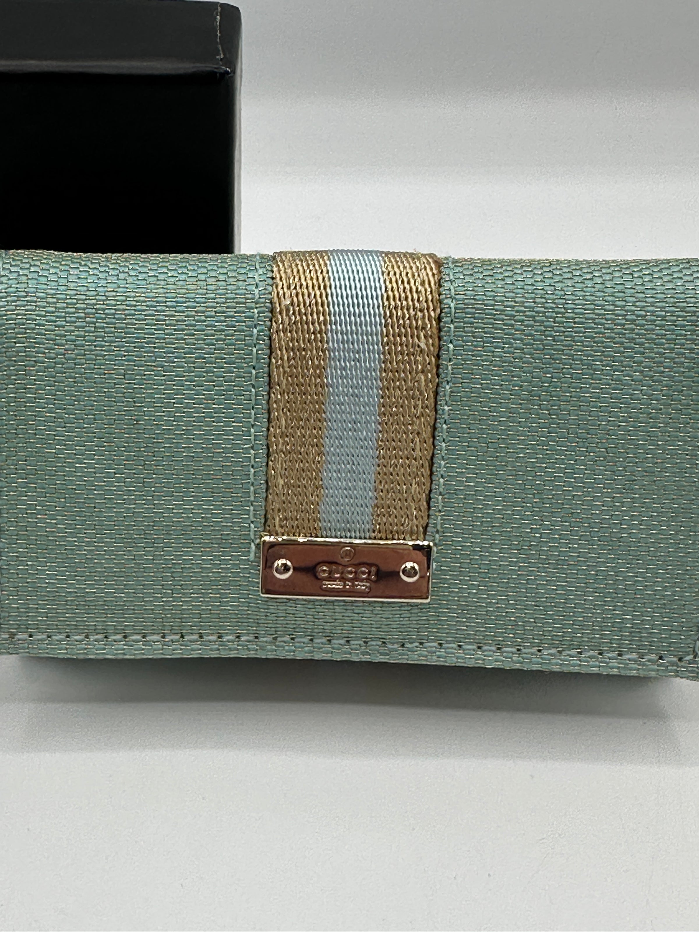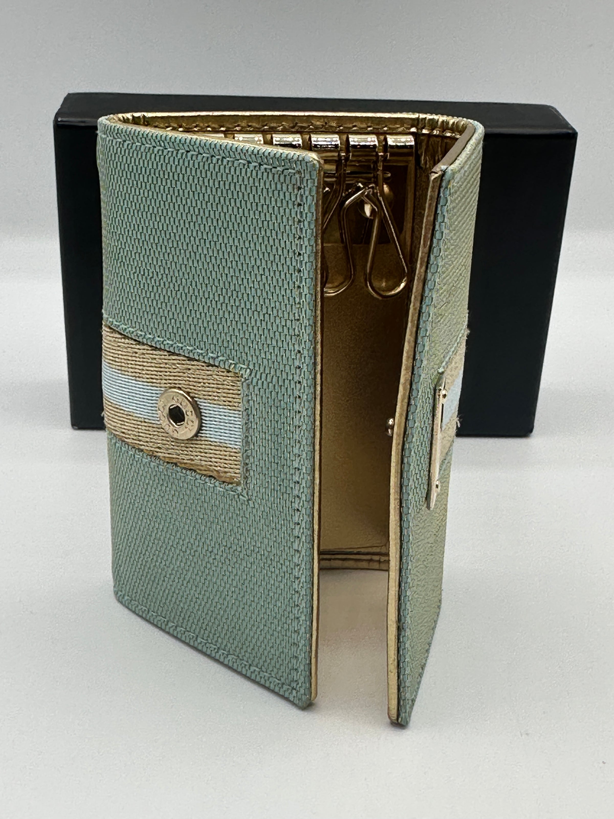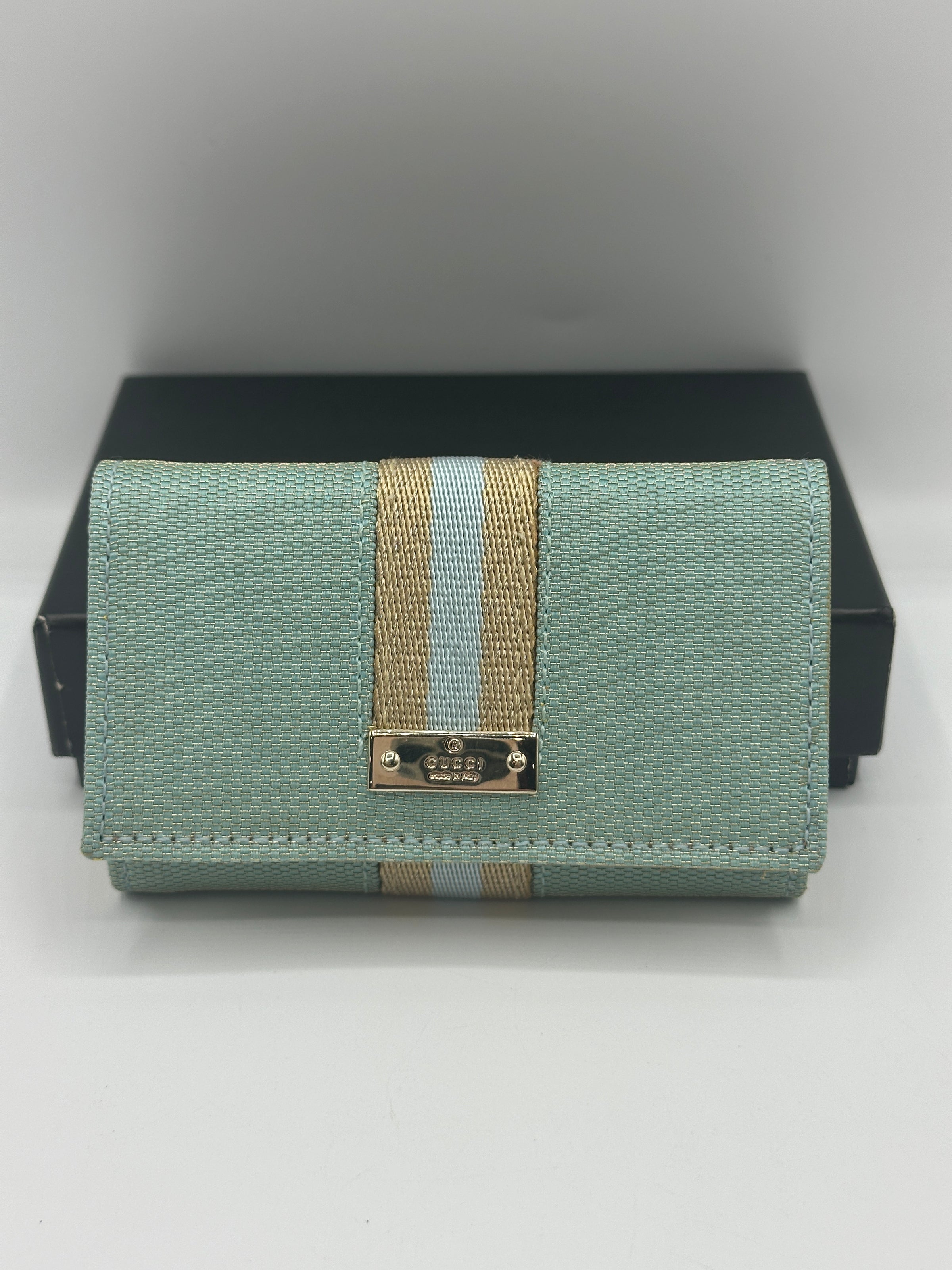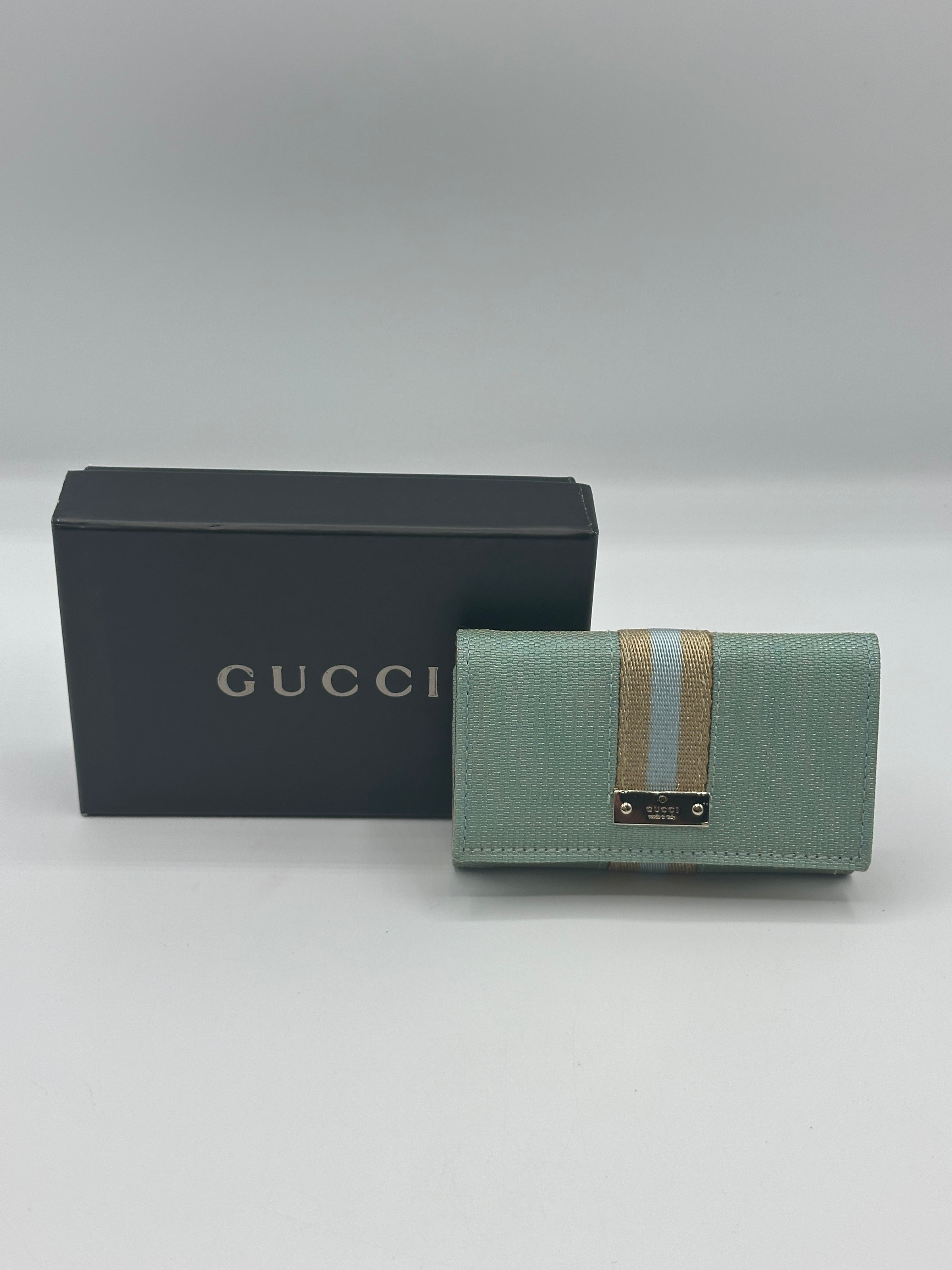 A refined Gucci key case crafted from the brand’s signature coated canvas, presented in a distinctive light green tone. Designed for everyday practicality, this compact accessory features a secure snap-button closure and internal key ring attachments, allowing keys to be organised neatly while protecting other items within a bag or pocket. The durable canvas construction is complemented by subtle Gucci branding, offering a balance of functionality and understated luxury. This Gucci Case comes complete with box/