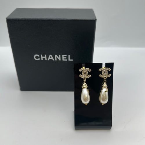 Chanel CC Logo Crystal & Pearl Gold Plated Earrings