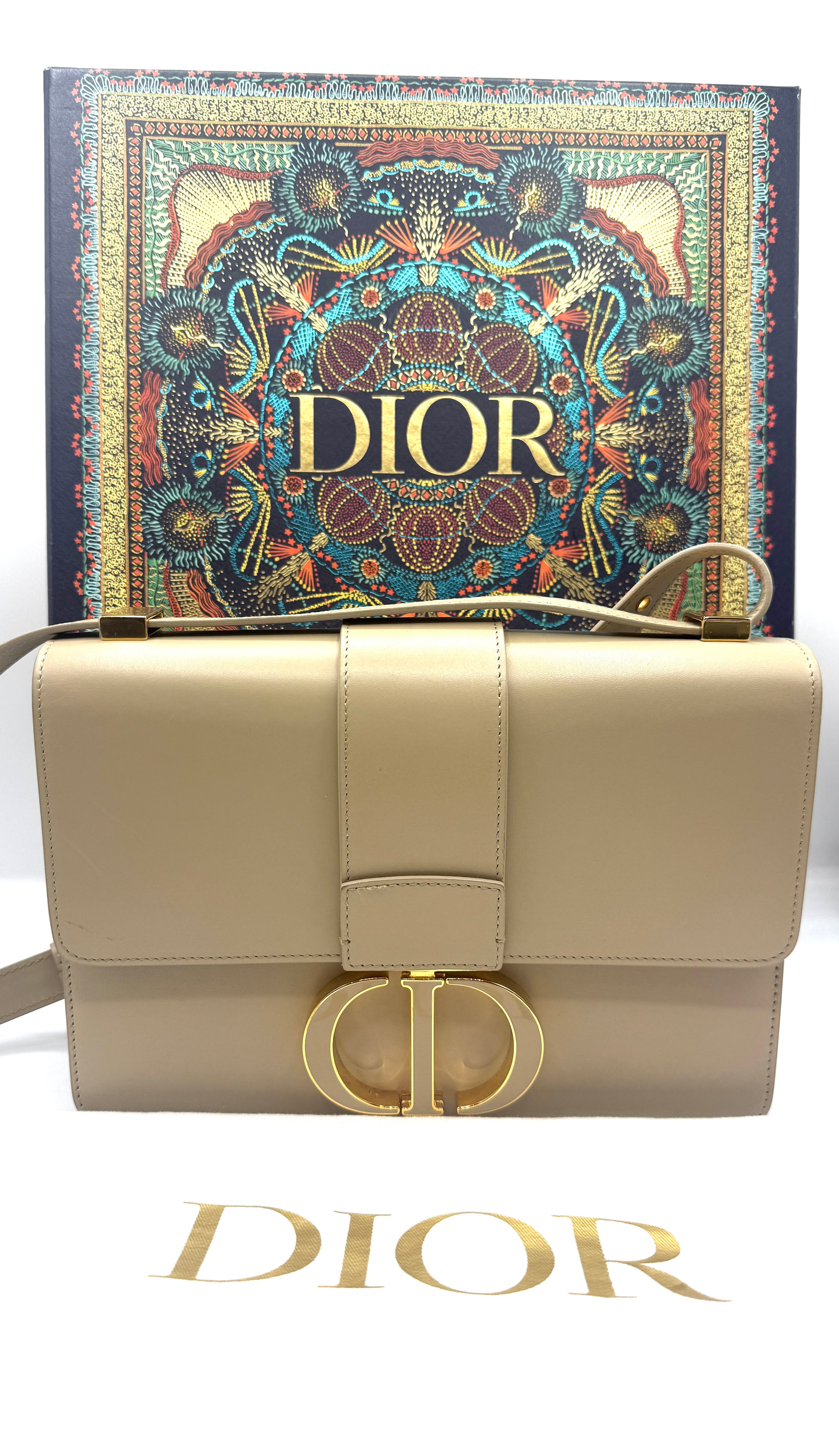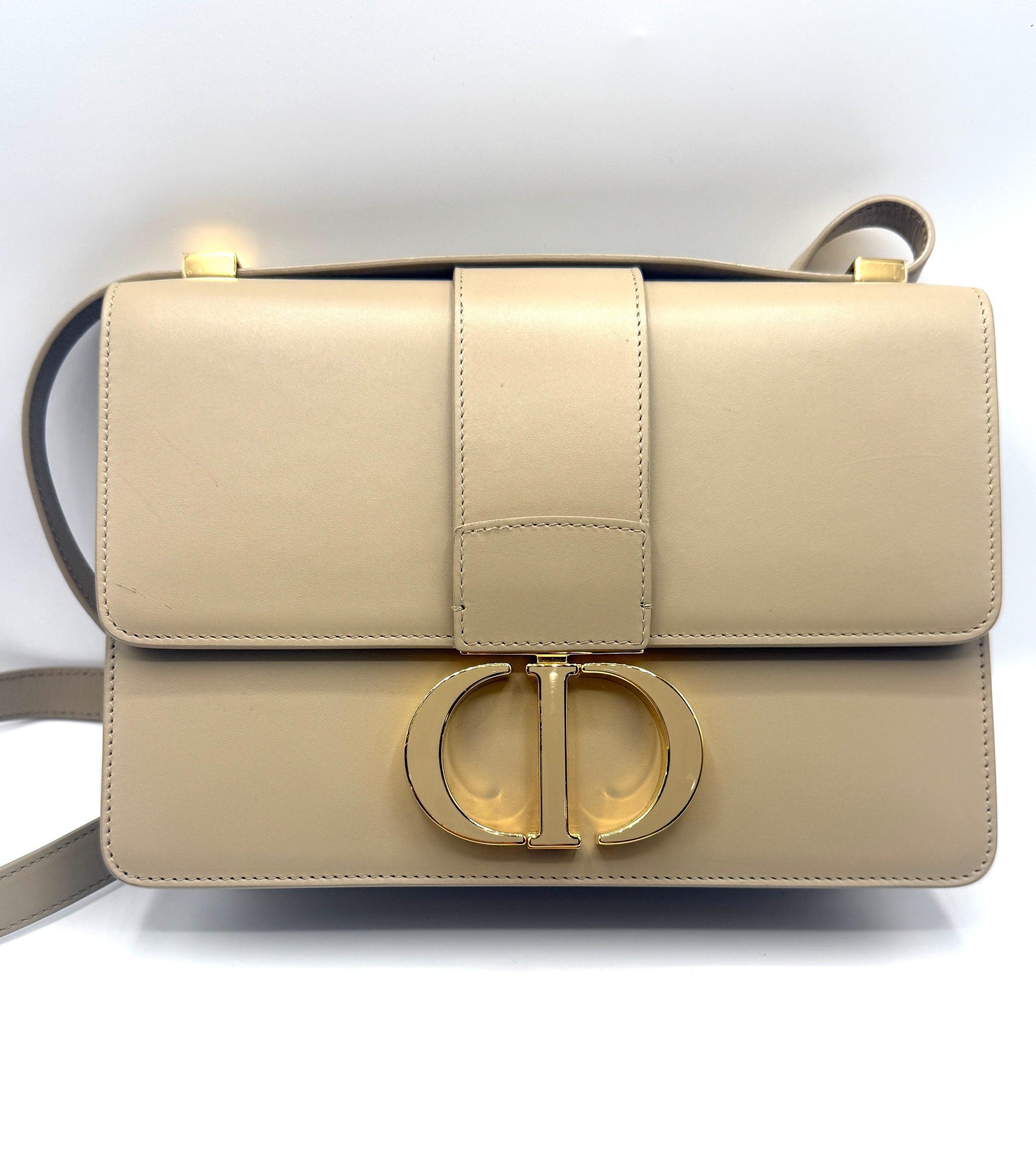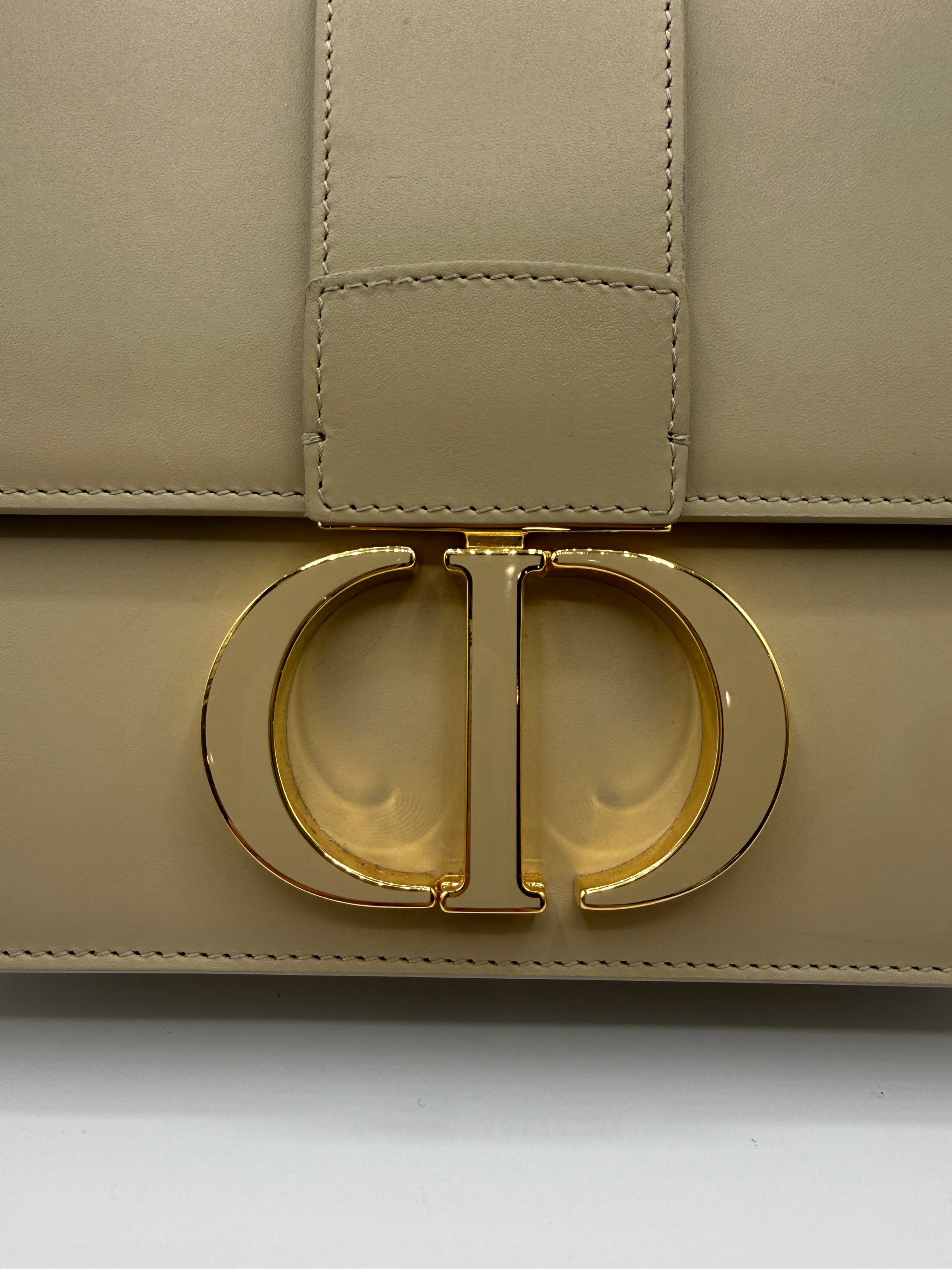 The Dior 30 Montaigne Shoulder Bag in beige calfskin leather is a sophisticated and structured design that reflects the timeless elegance of the house. Crafted from smooth premium leather, the bag features a clean flap-front silhouette finished with the iconic antique gold-tone CD clasp, a signature element that instantly identifies the piece as part of Dior’s celebrated 30 Montaigne collection.