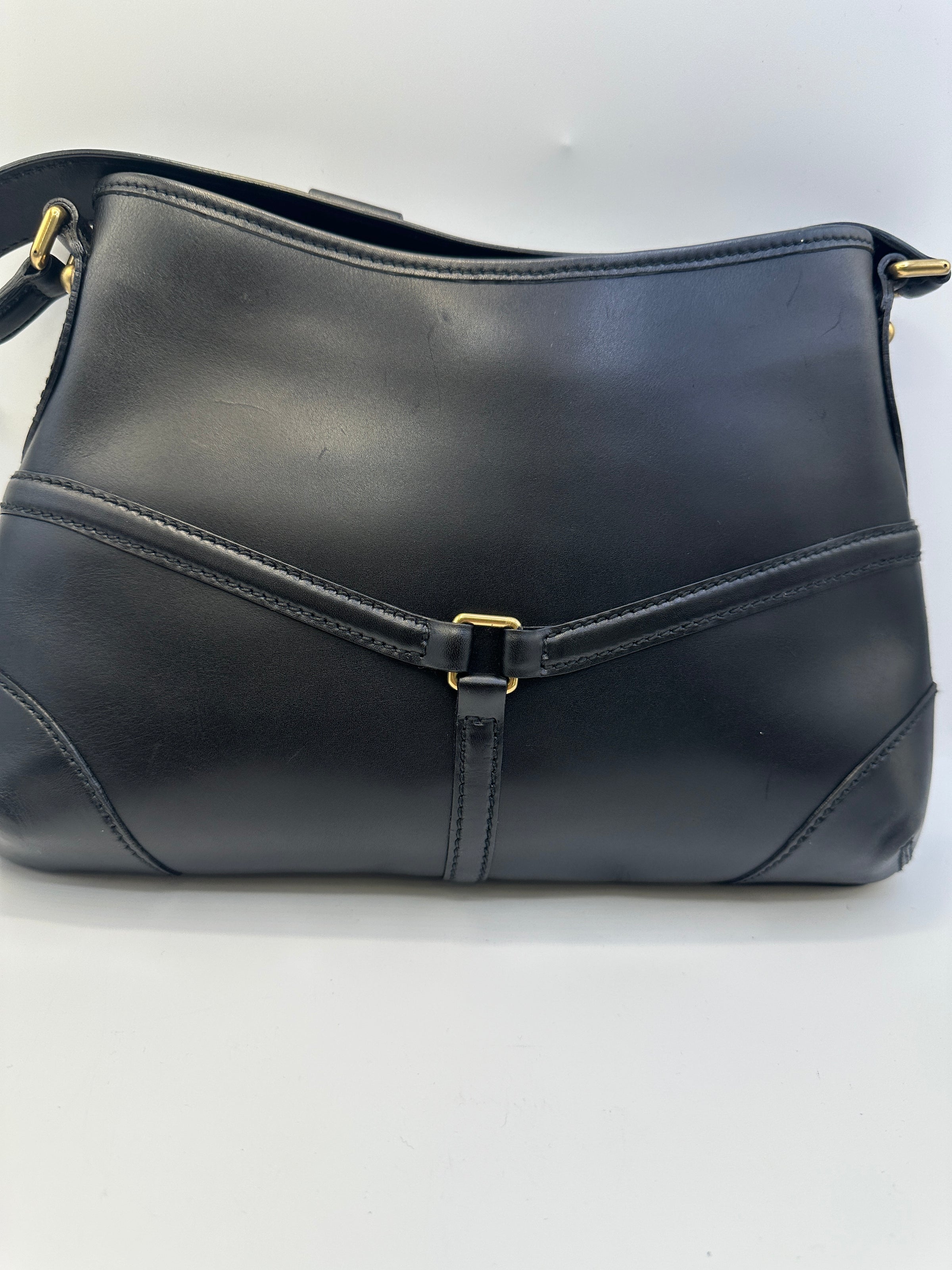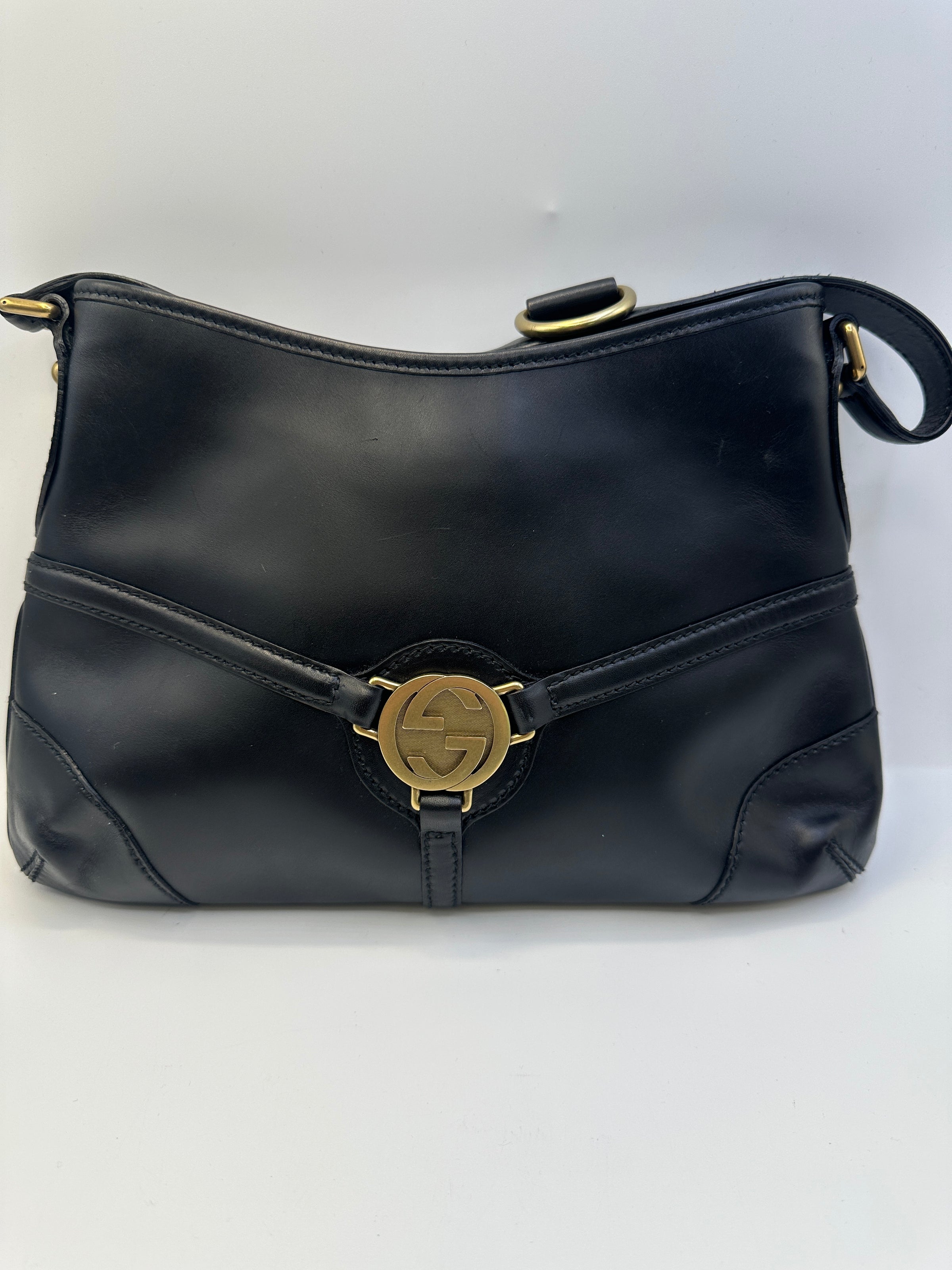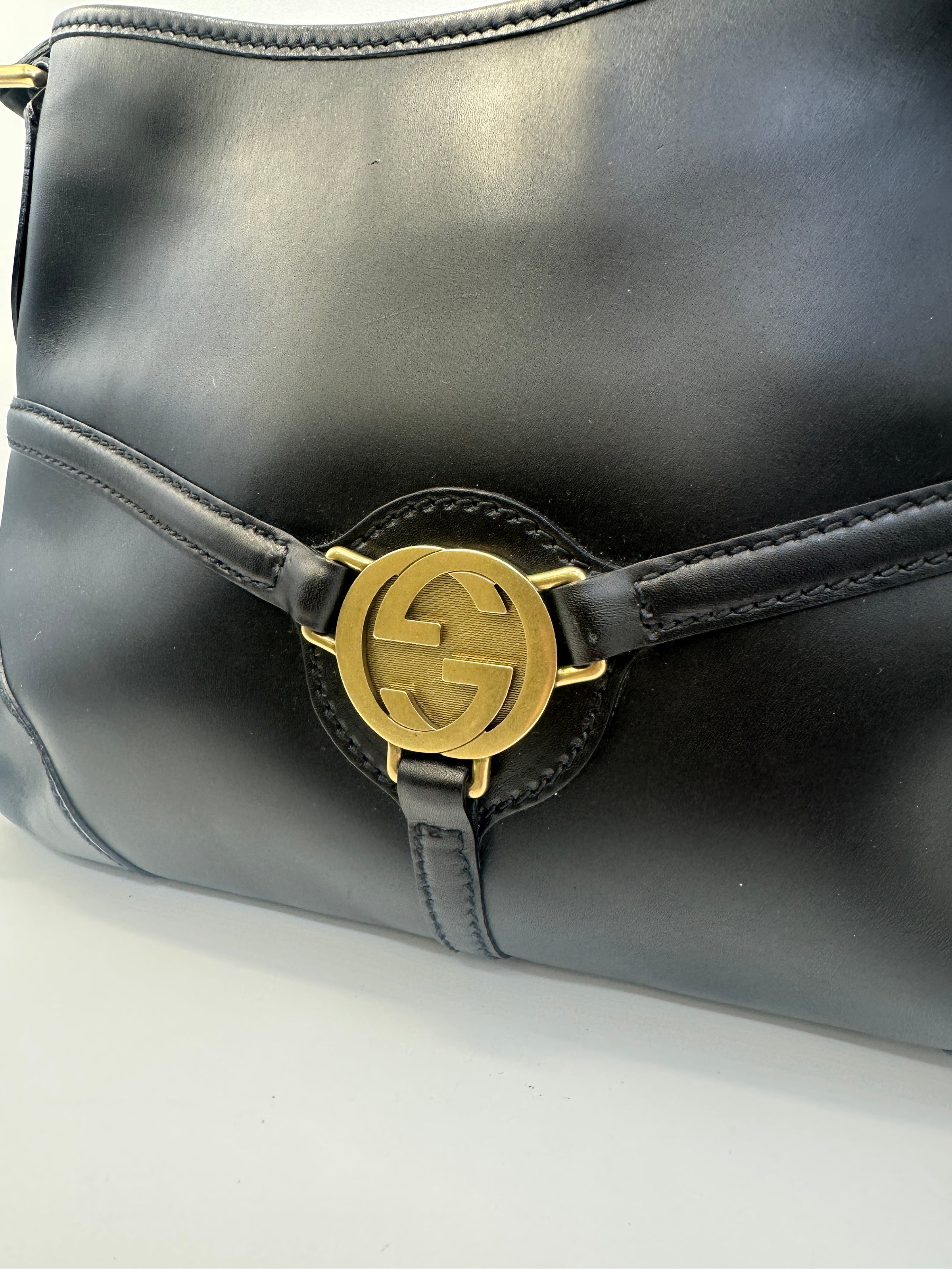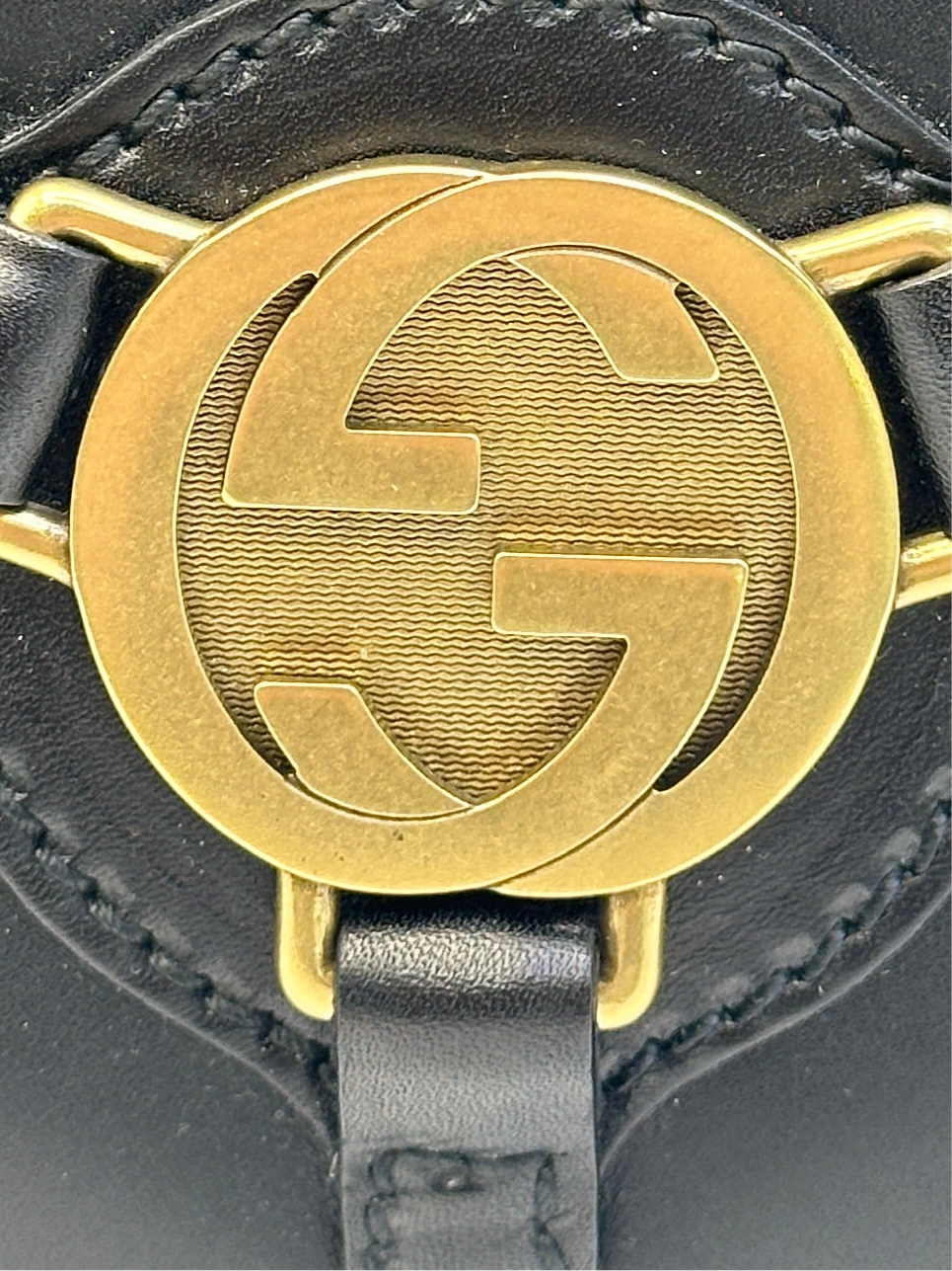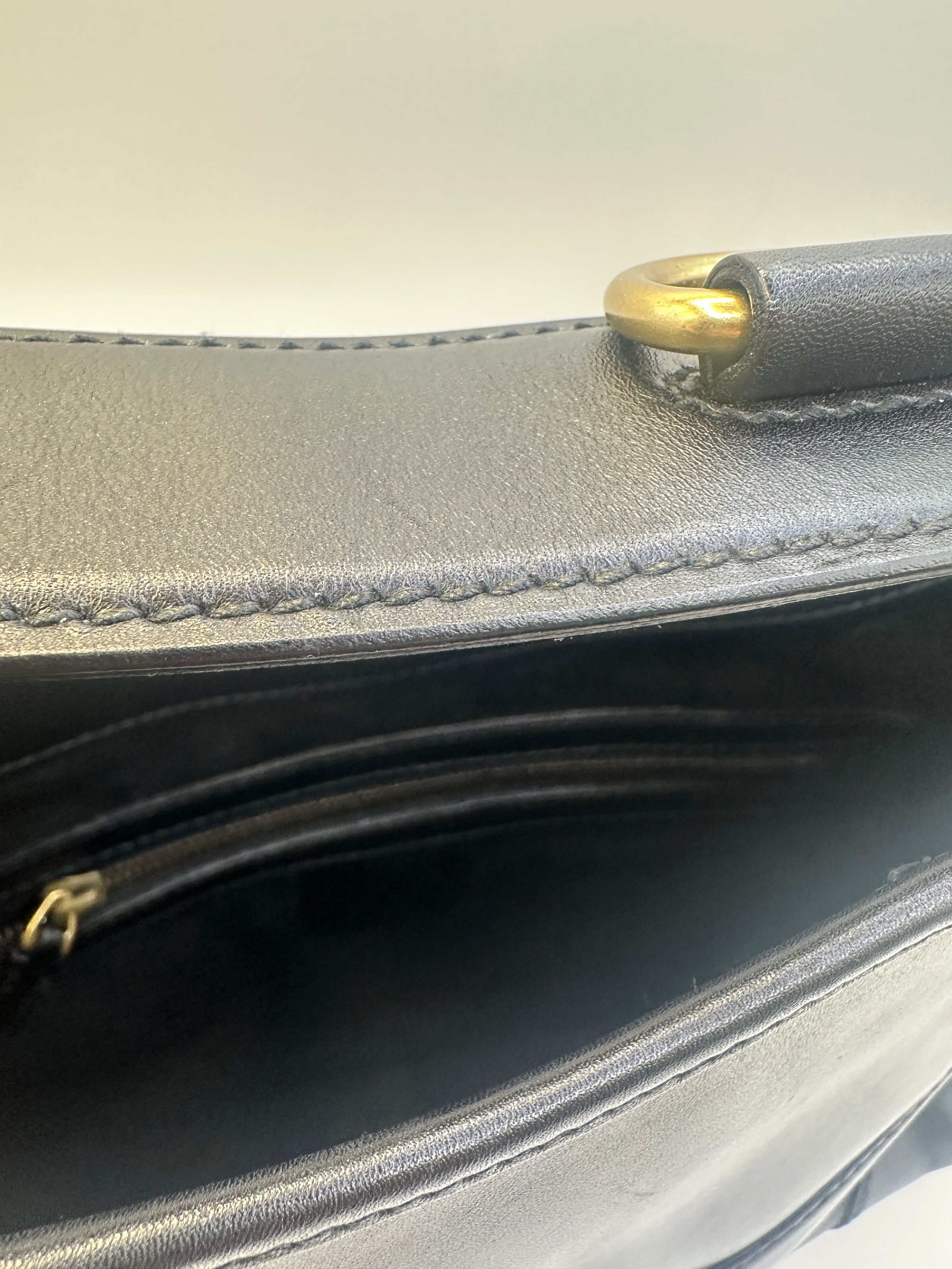 Gucci’s genetic code, the double ring and bar design has been established as one of the most distinctive elements among the House symbols borrowed from the equestrian world. Presented on a small flap shoulder bag, the hardware is paired with textured black leather gold hardwear