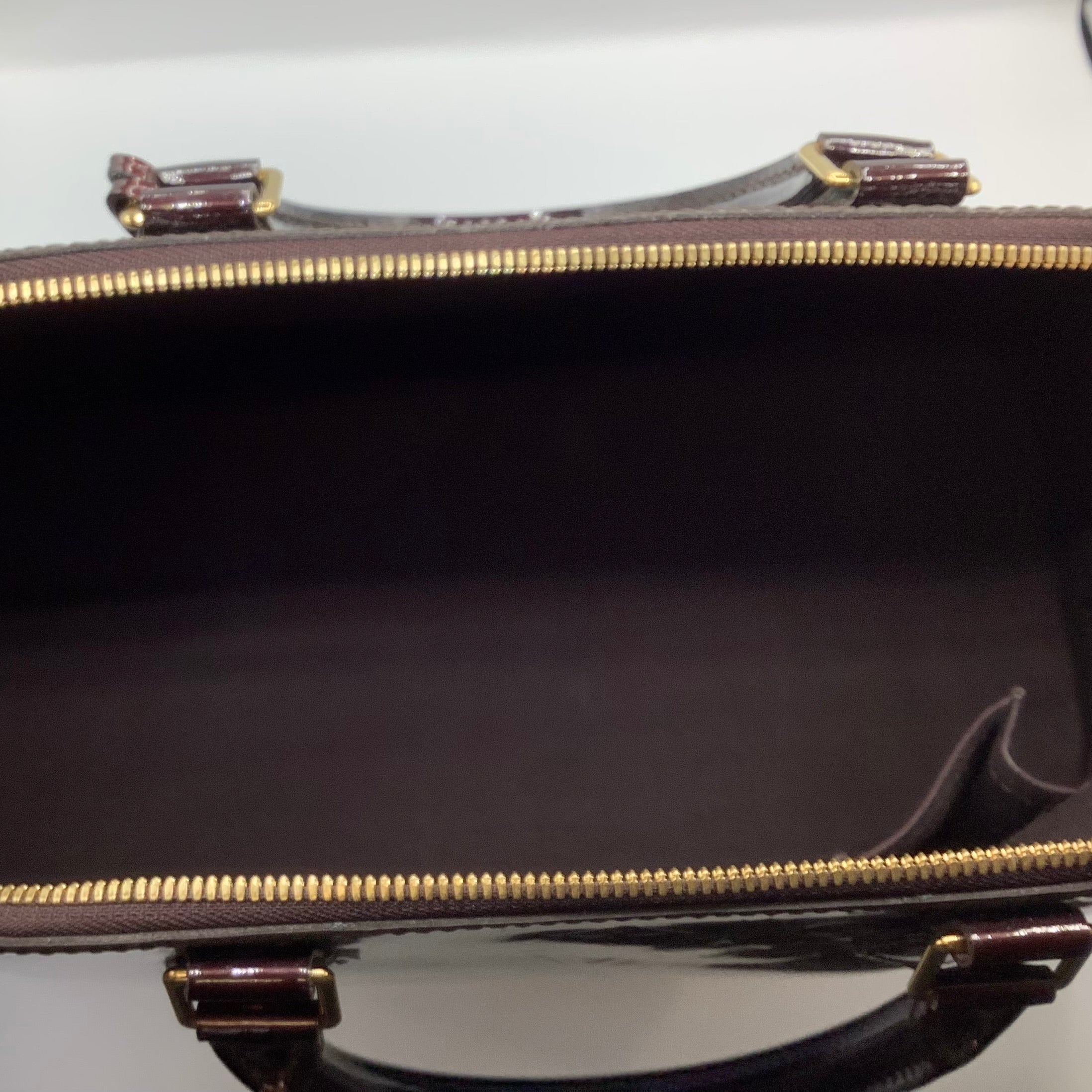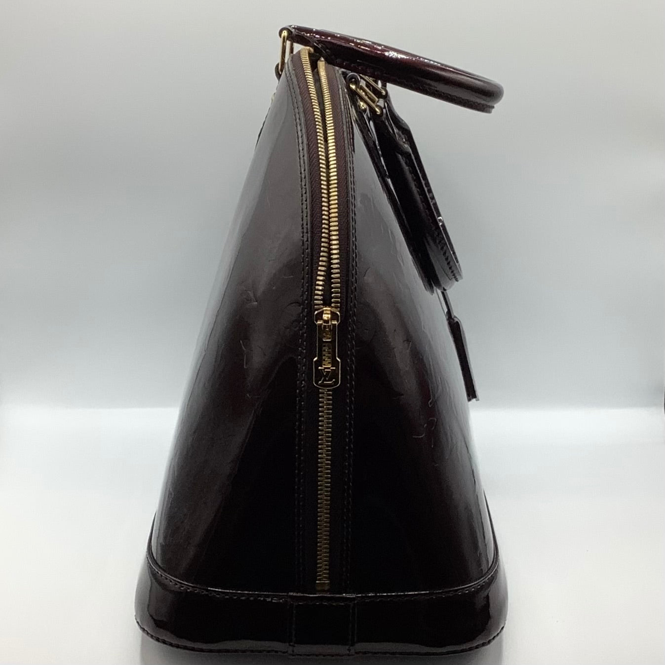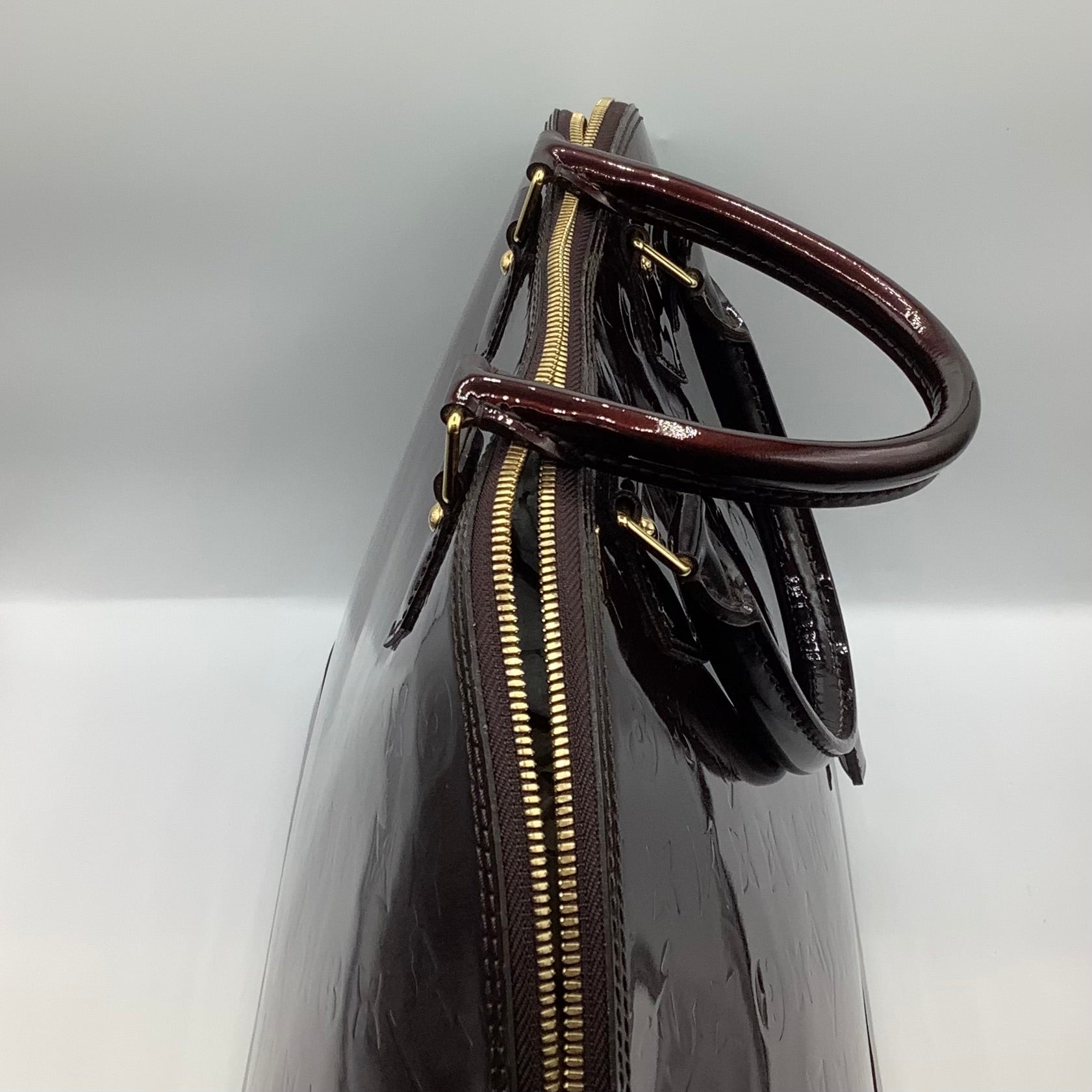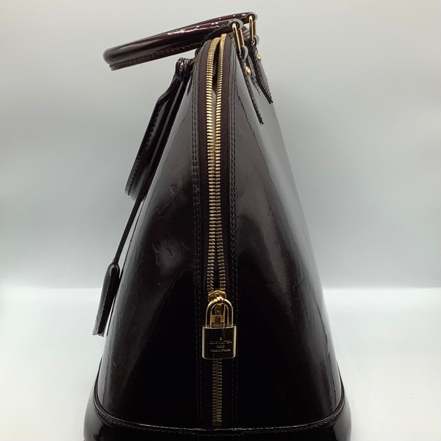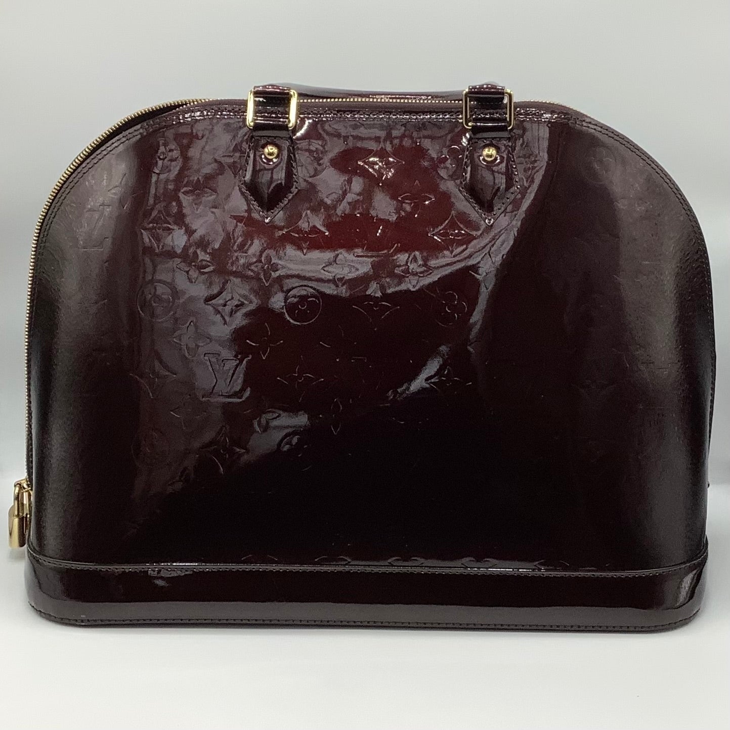 The Louis Vuitton Alma GM in rich Burgundy Vernis patent leather is embossed with the iconic LV monogram. The lacquered, glossy finish contrasts well with the polished gold‑tone hardware and dual rolled leather top handles for hand or elbow carry. The Structured ‘Alma’ dome silhouette features a dual top zip closure and padlock detail. The interior features a cloth lining with dual slip pockets; and the base is protected by four metal feet .