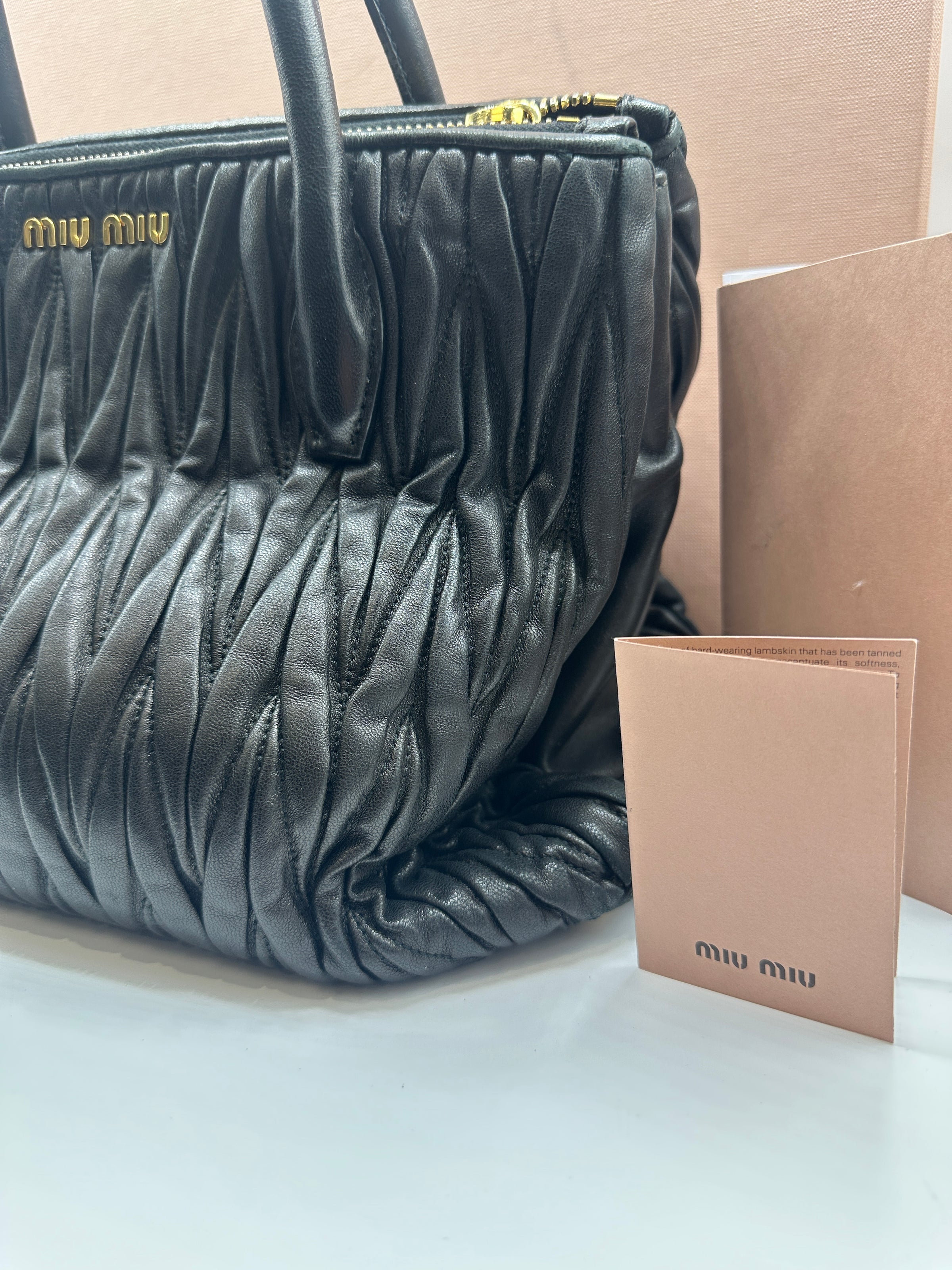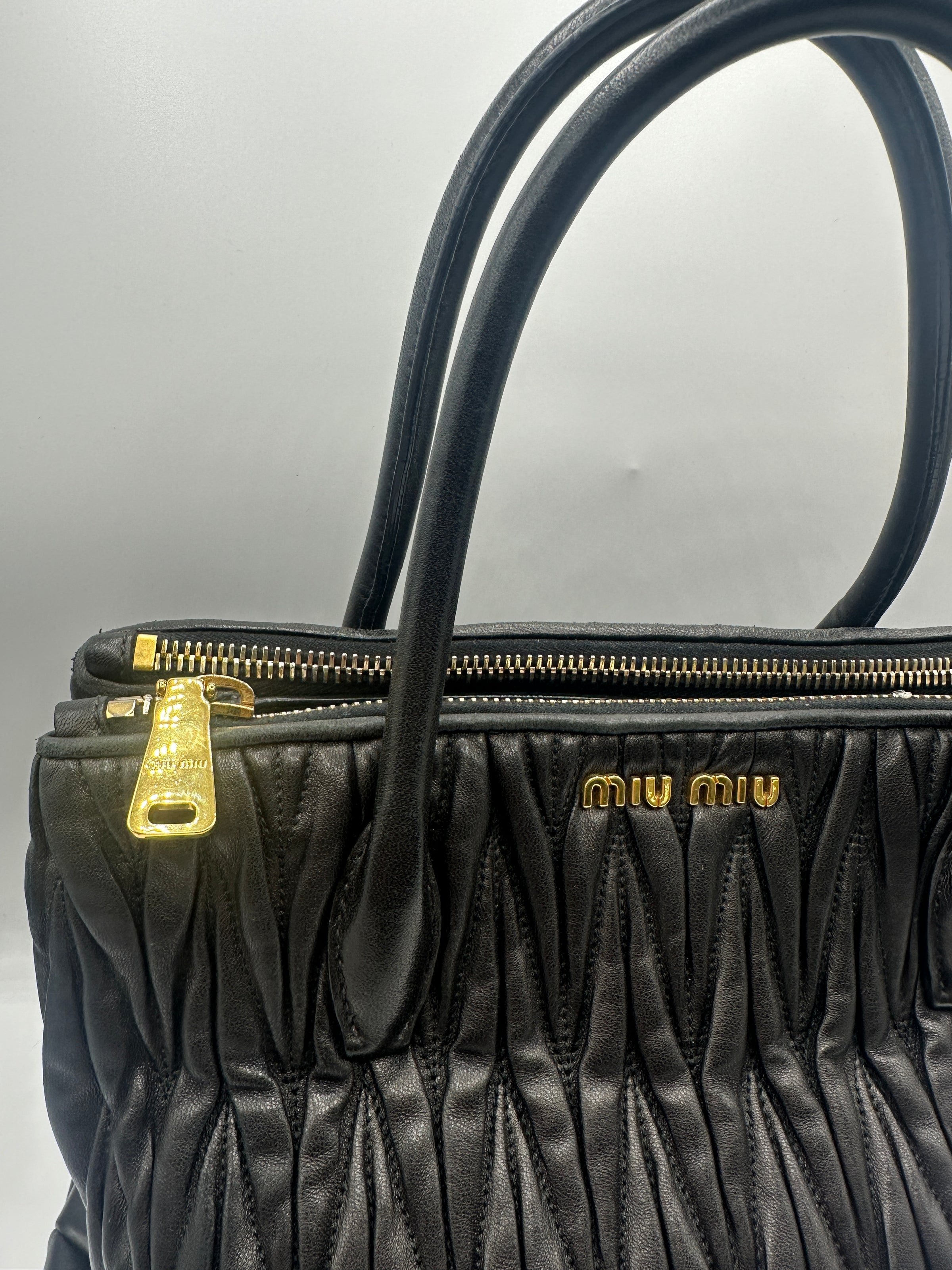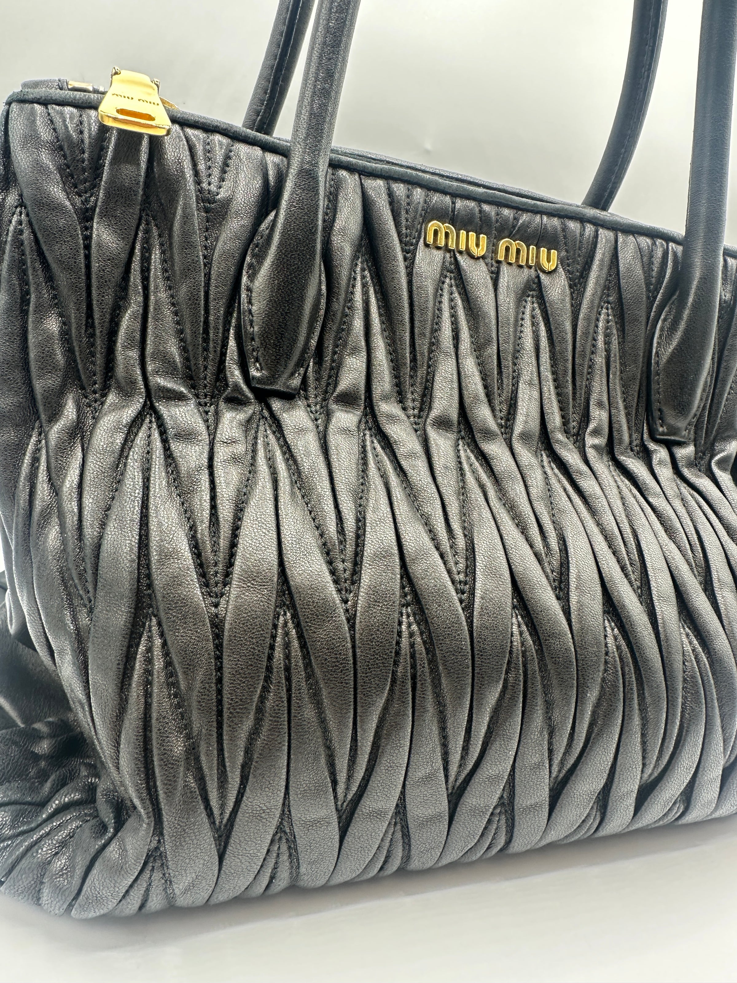 This is a trendy Miu Miu Matelasse handbag complete with original authenticity certificate card. It comes in Black and features a rippling effect outer designby using Rouched high quality Leather, finished with Rolled Leather Black Top Handles, and Gold toned Hardware. With multiple compartments this fun bag combines functionality and fashion.