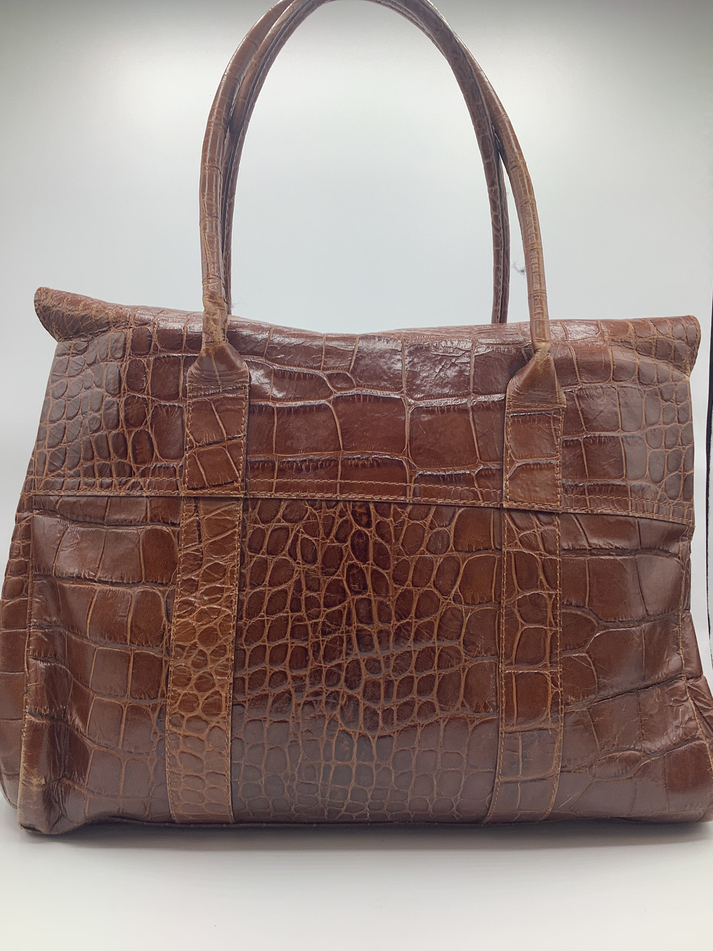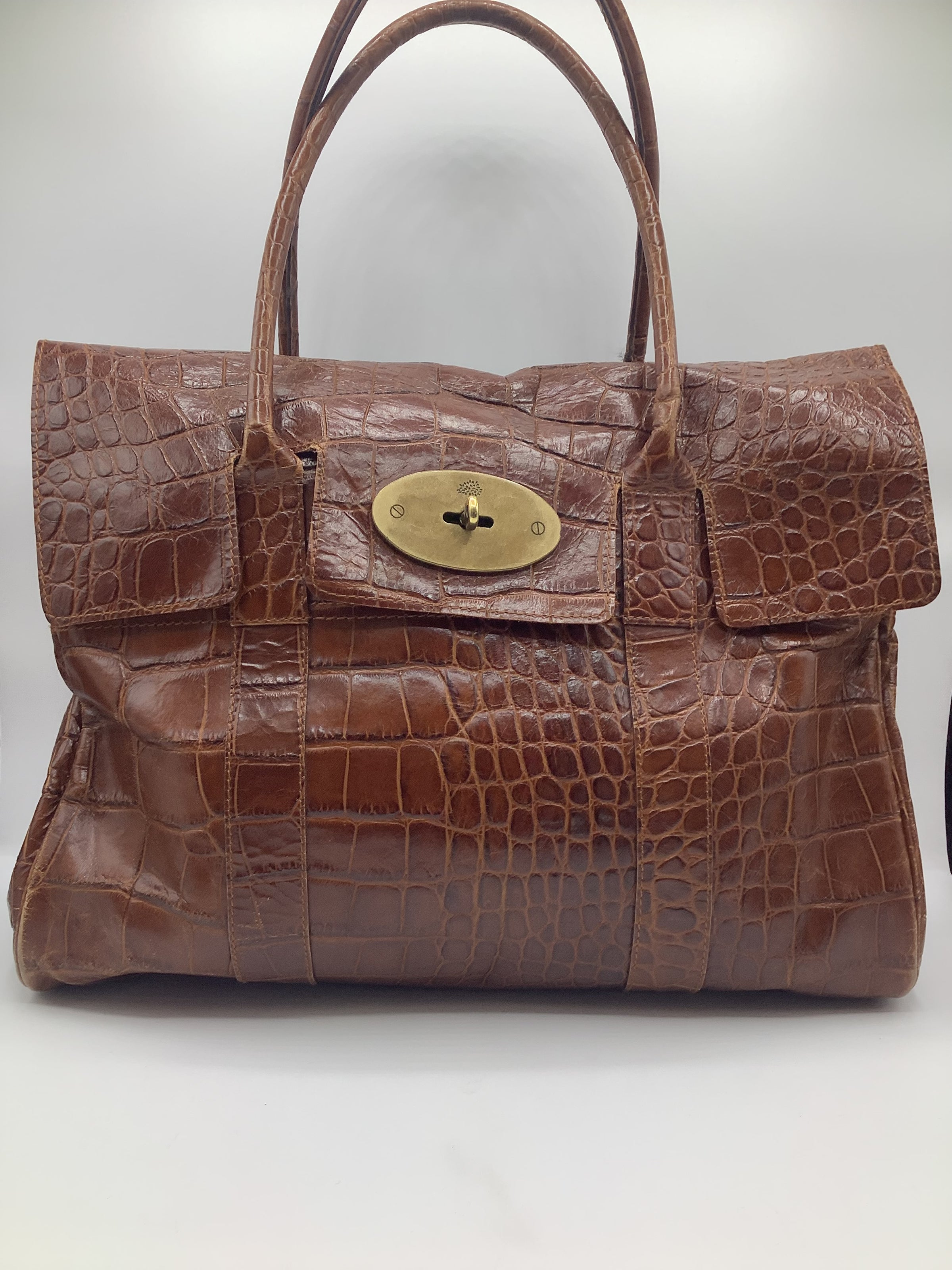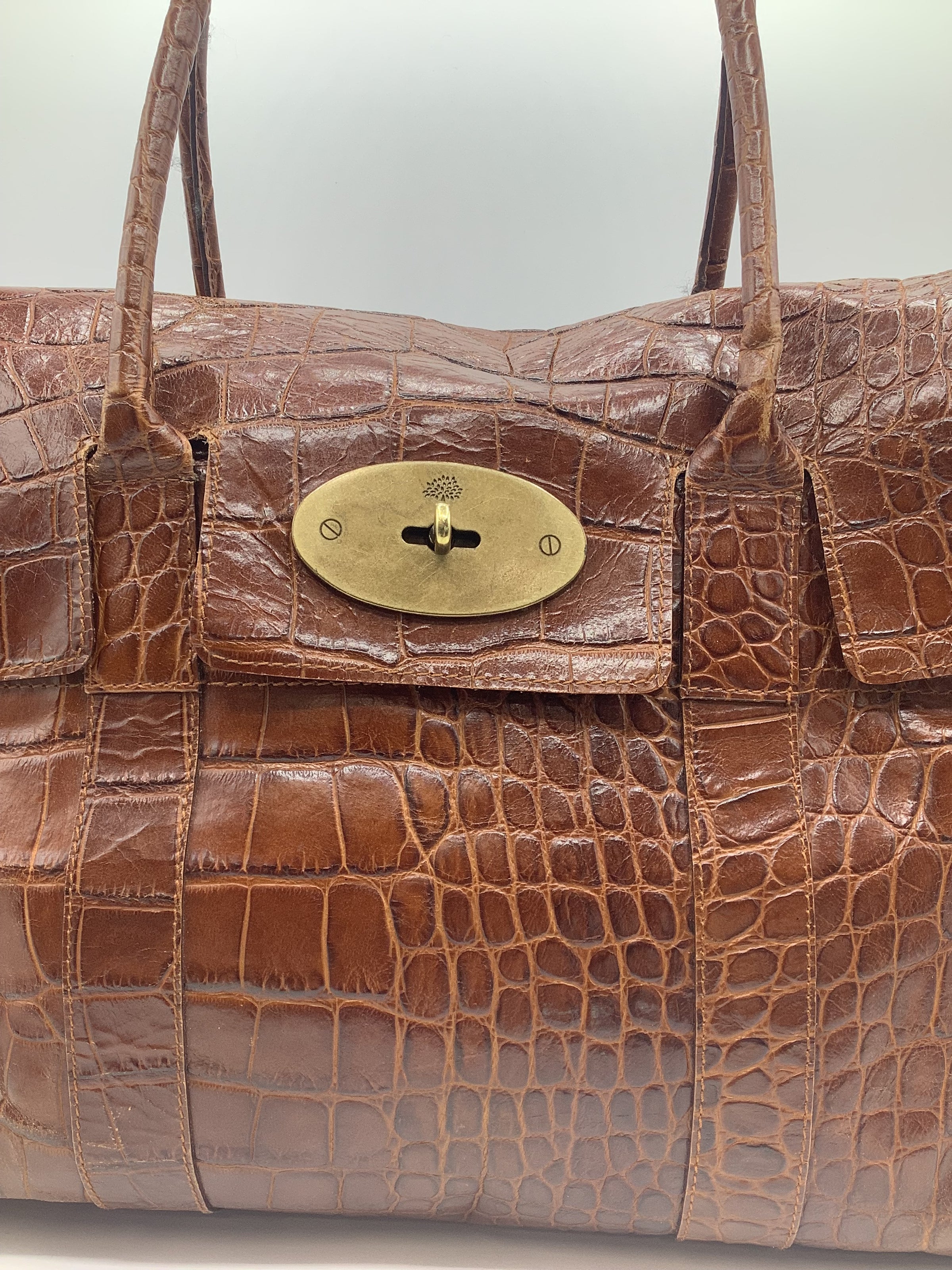 The Mulberry Crocodile Embossed Bayswater in Oak is meticulously crafted from premium calfskin leather, embossed to emulate the luxurious texture of crocodile skin. The rich oak hue enhances its timeless appeal, while the iconic Postman's Lock closure adds a signature touch. This structured tote is designed to seamlessly blend functionality with elegance. -