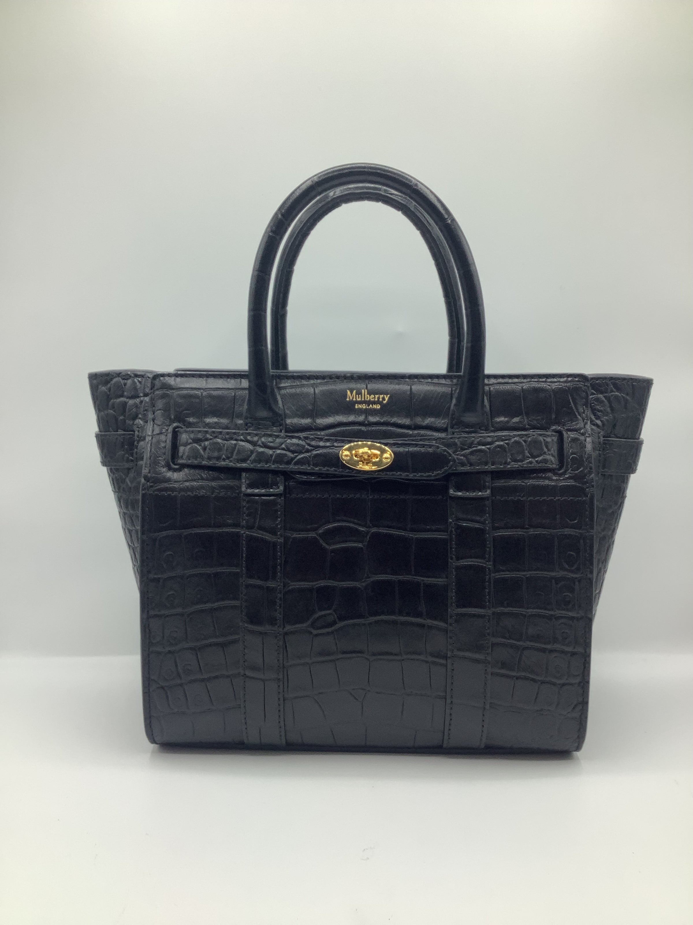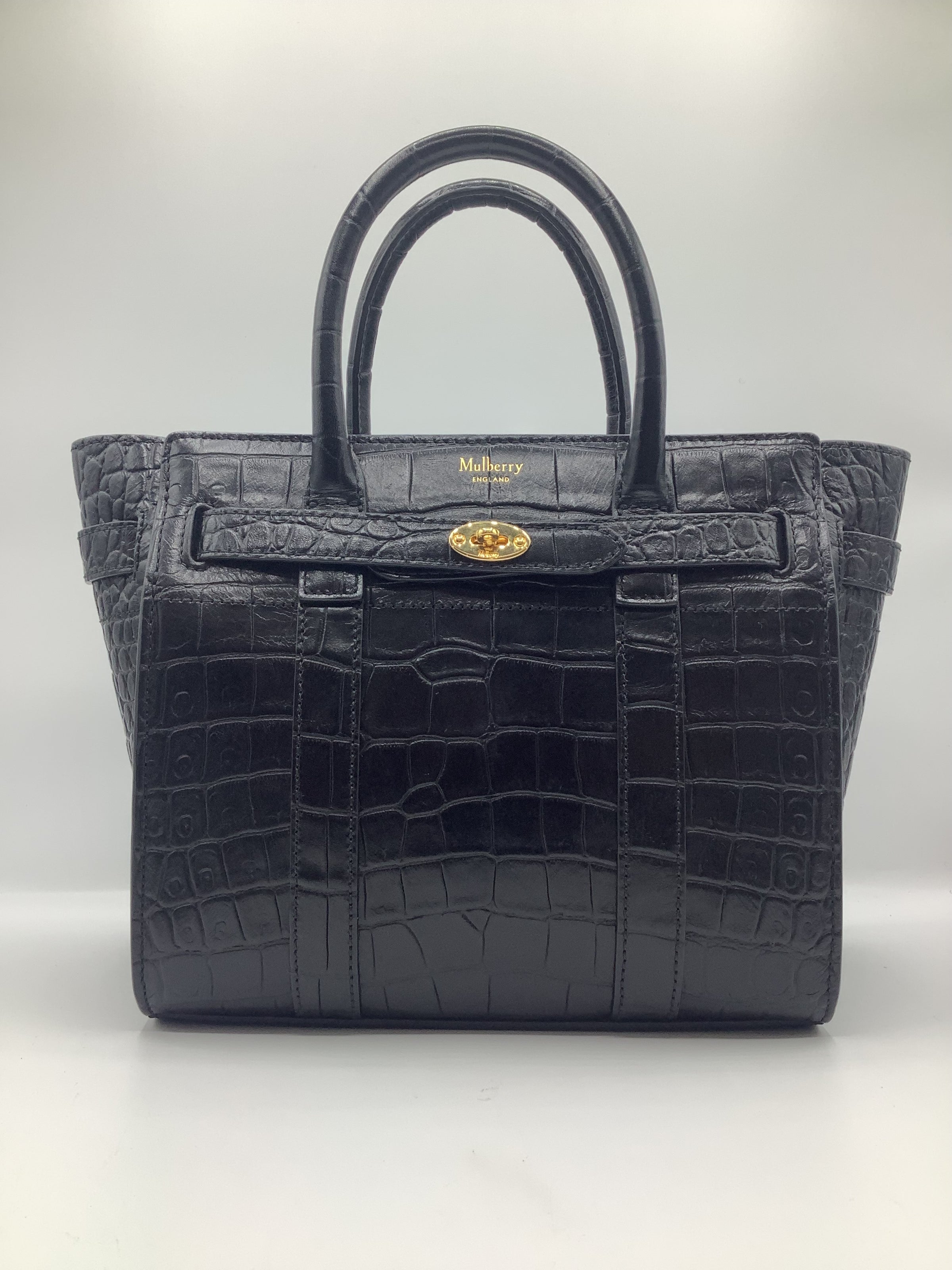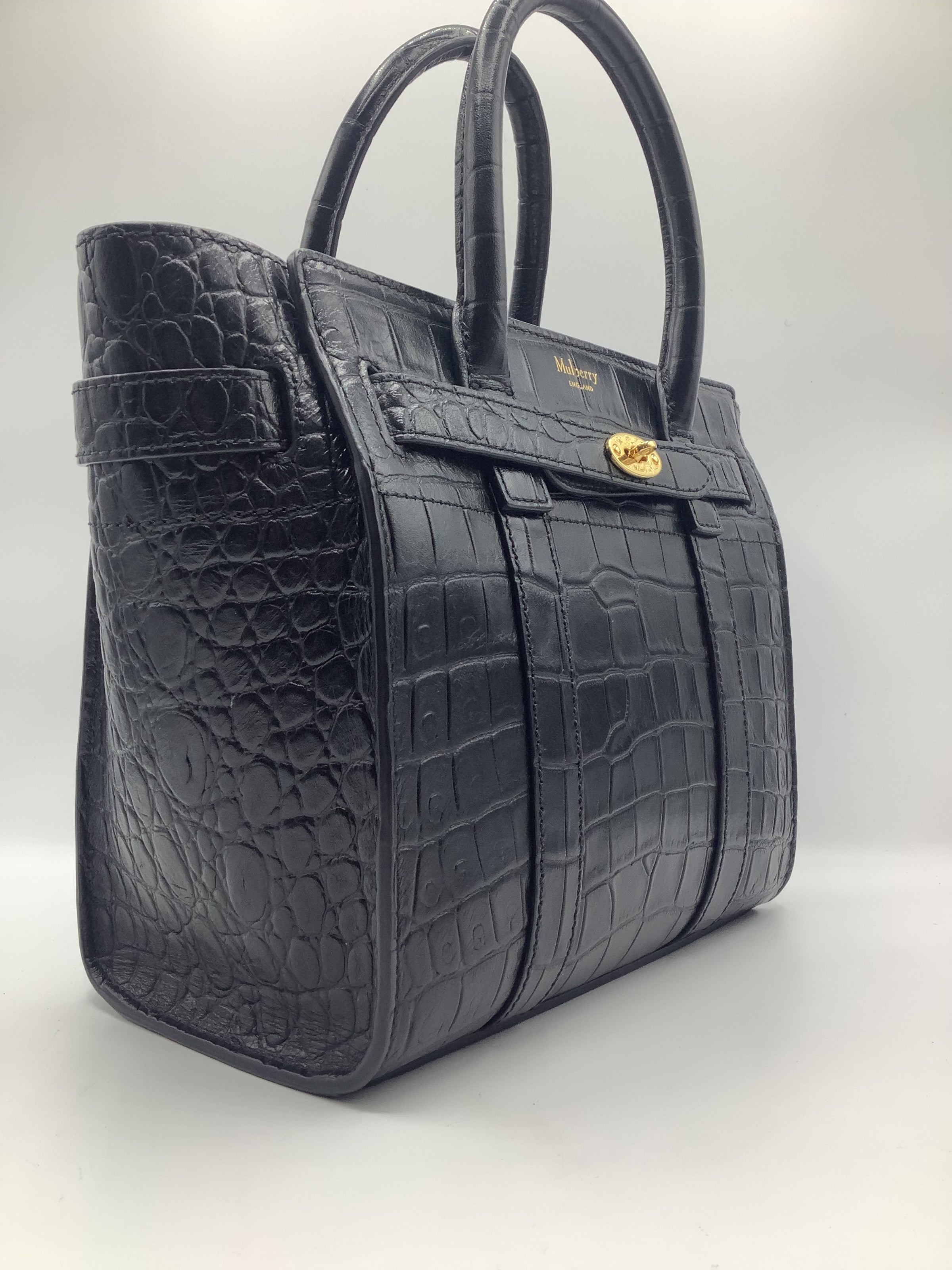 Mulberry Mini Zipped Bayswater Tote in Crocodile-Embossed Black Leather with Gold-Toned Hardware