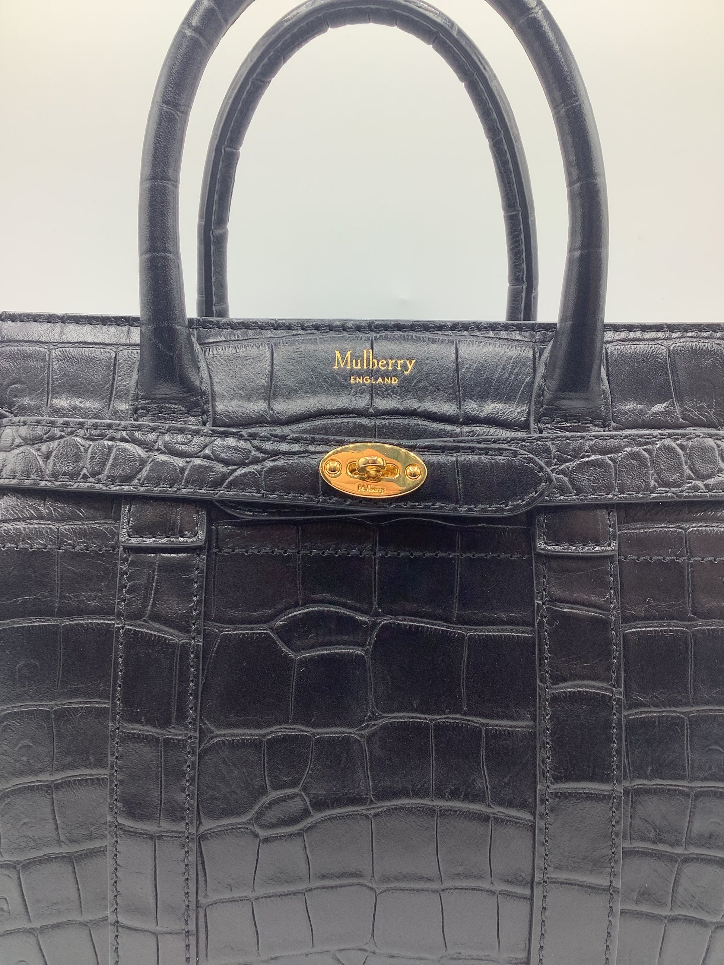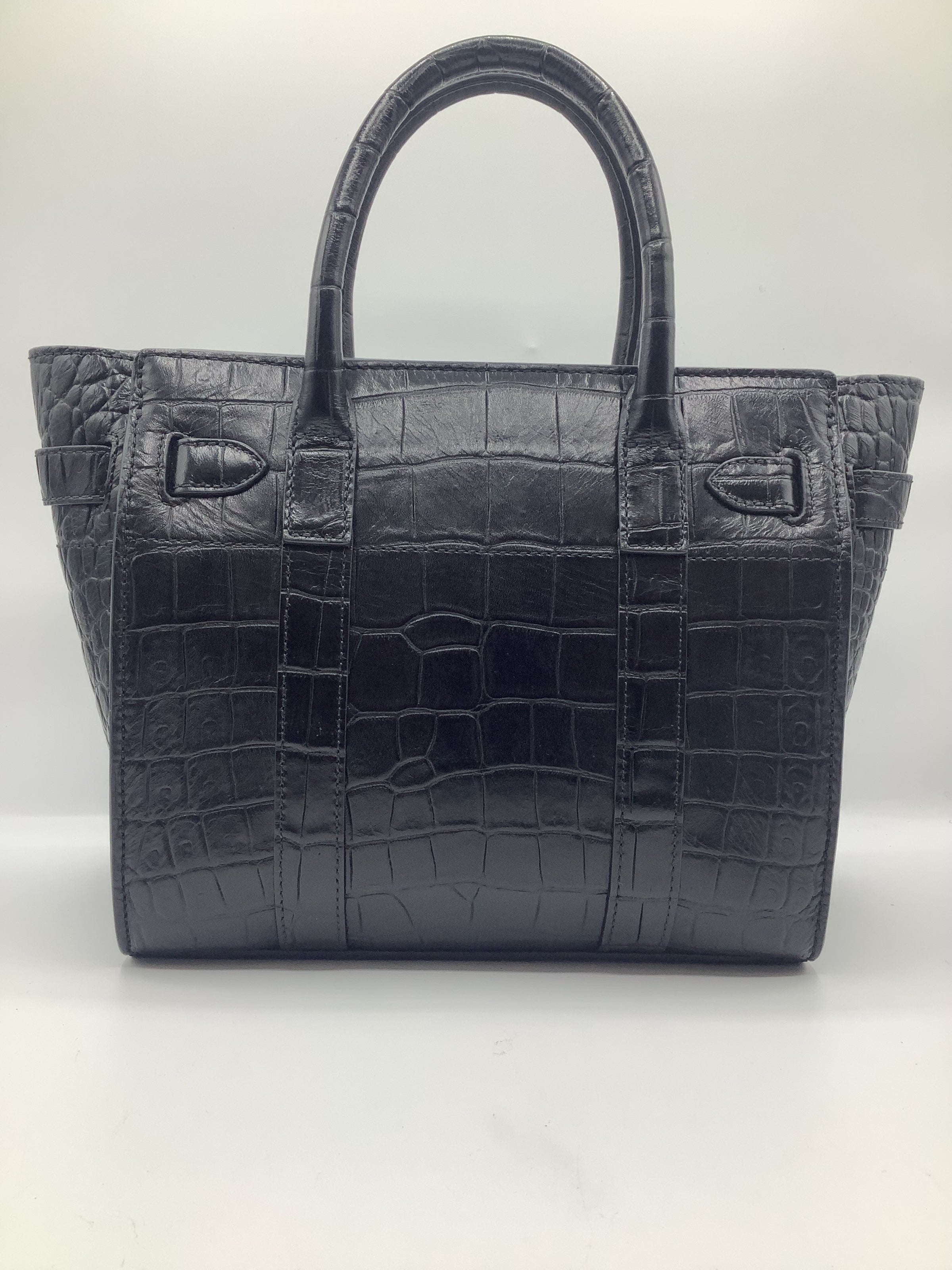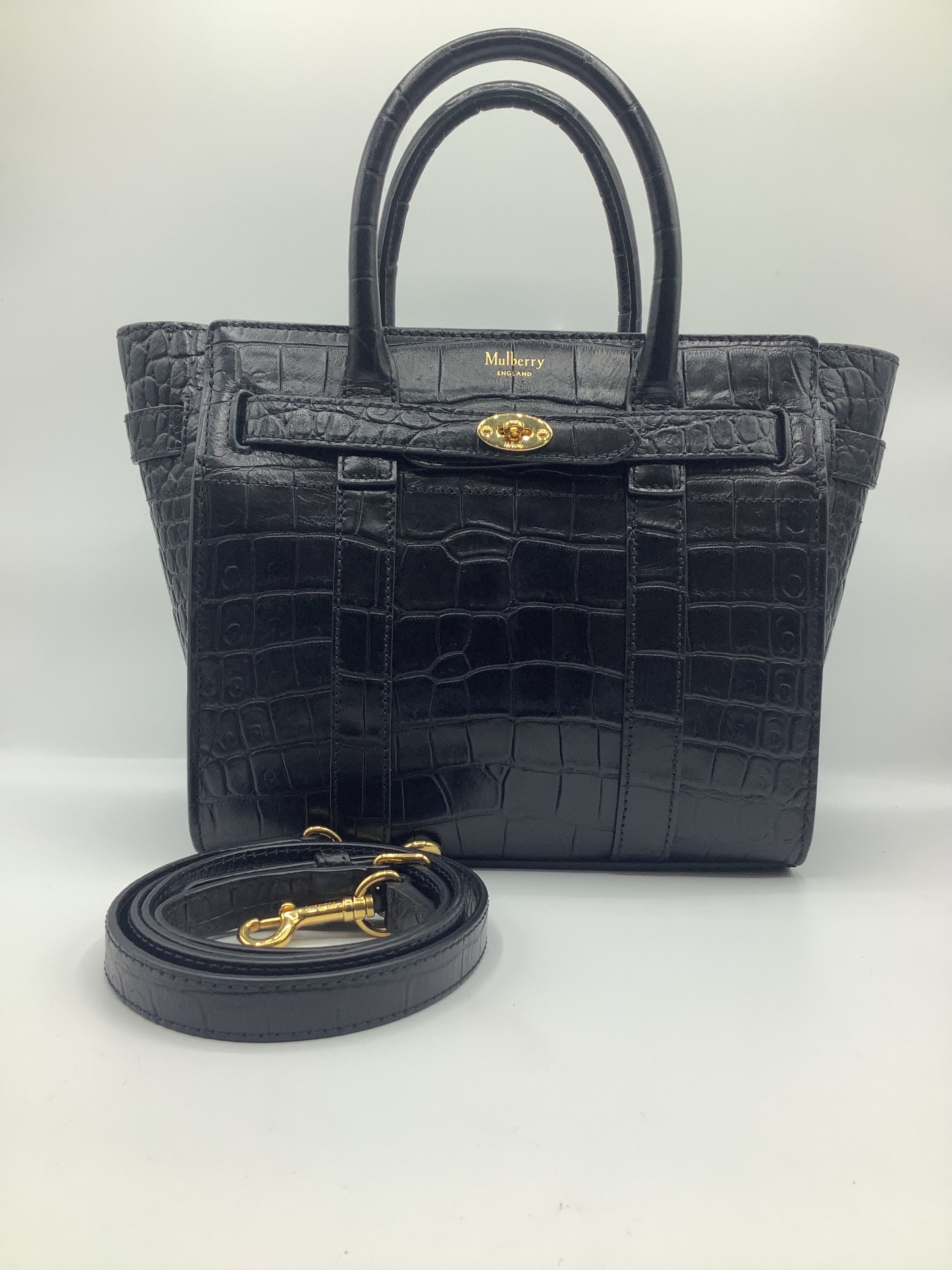 Mulberry Mini Zipped Bayswater Tote in Crocodile-Embossed Black Leather with Gold-Toned Hardware