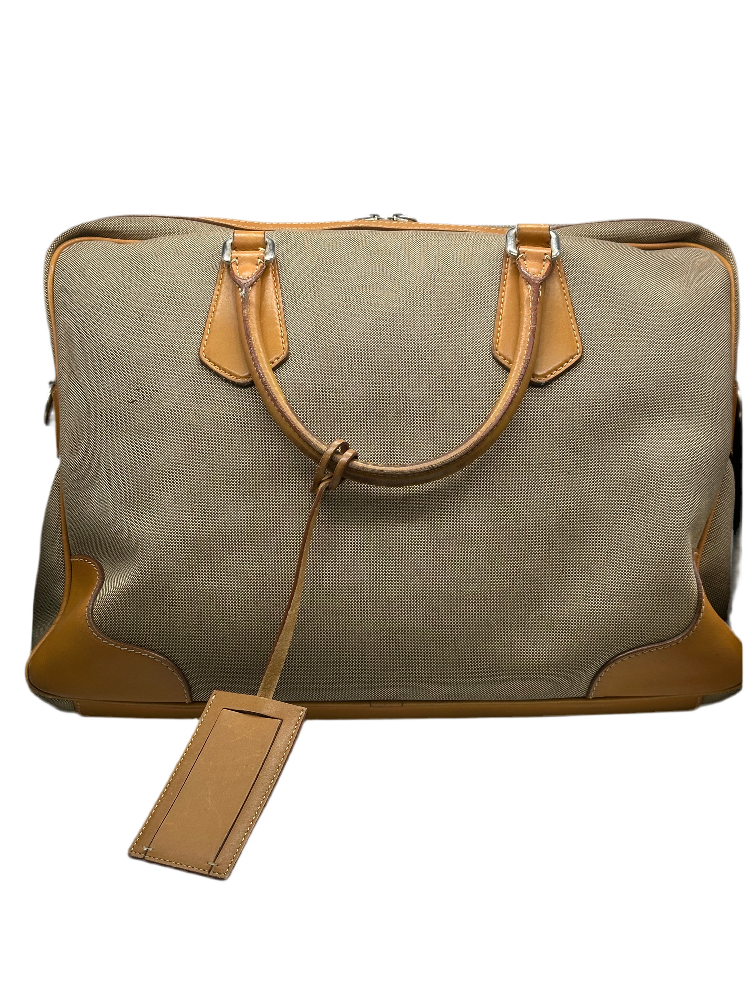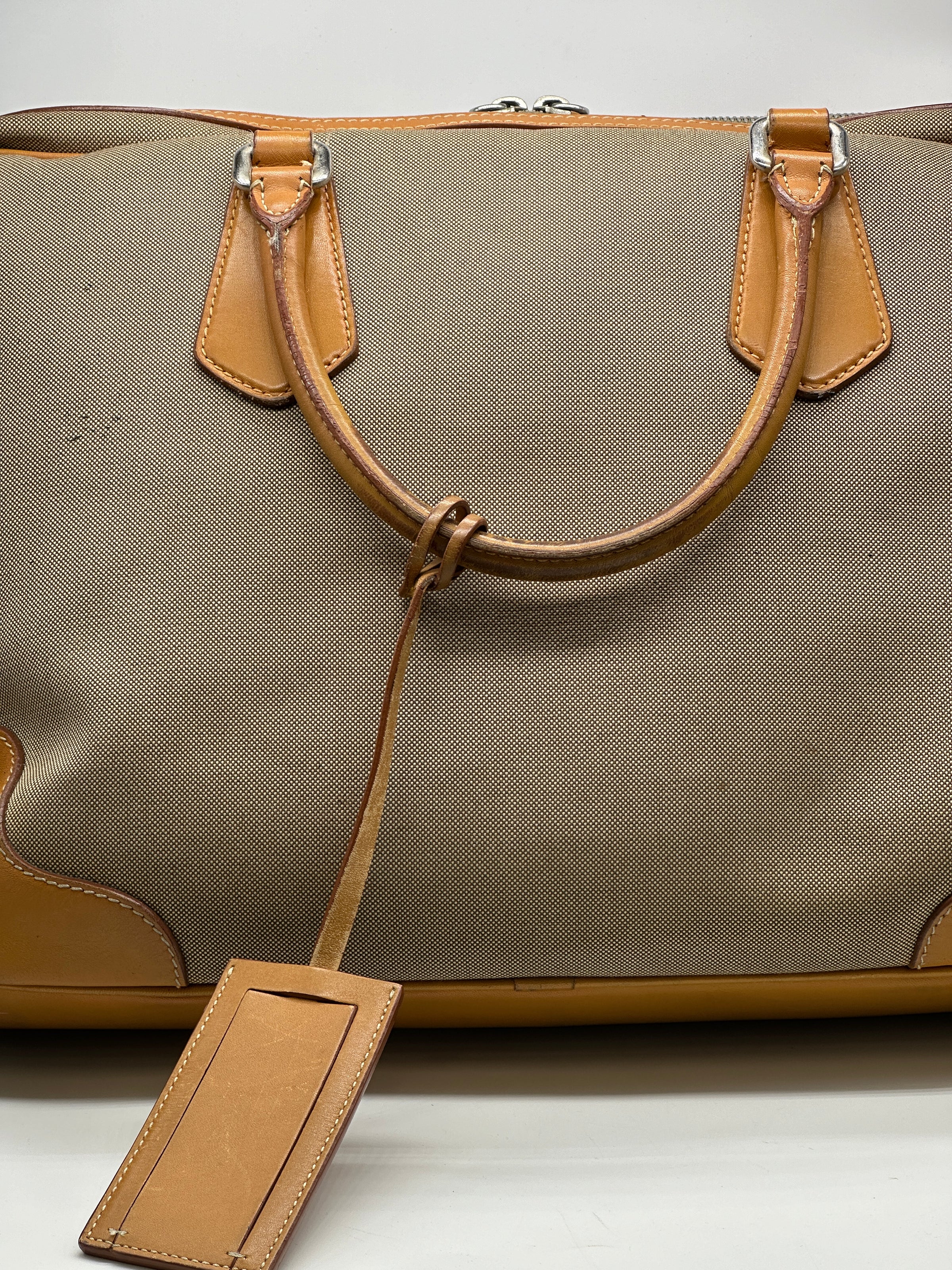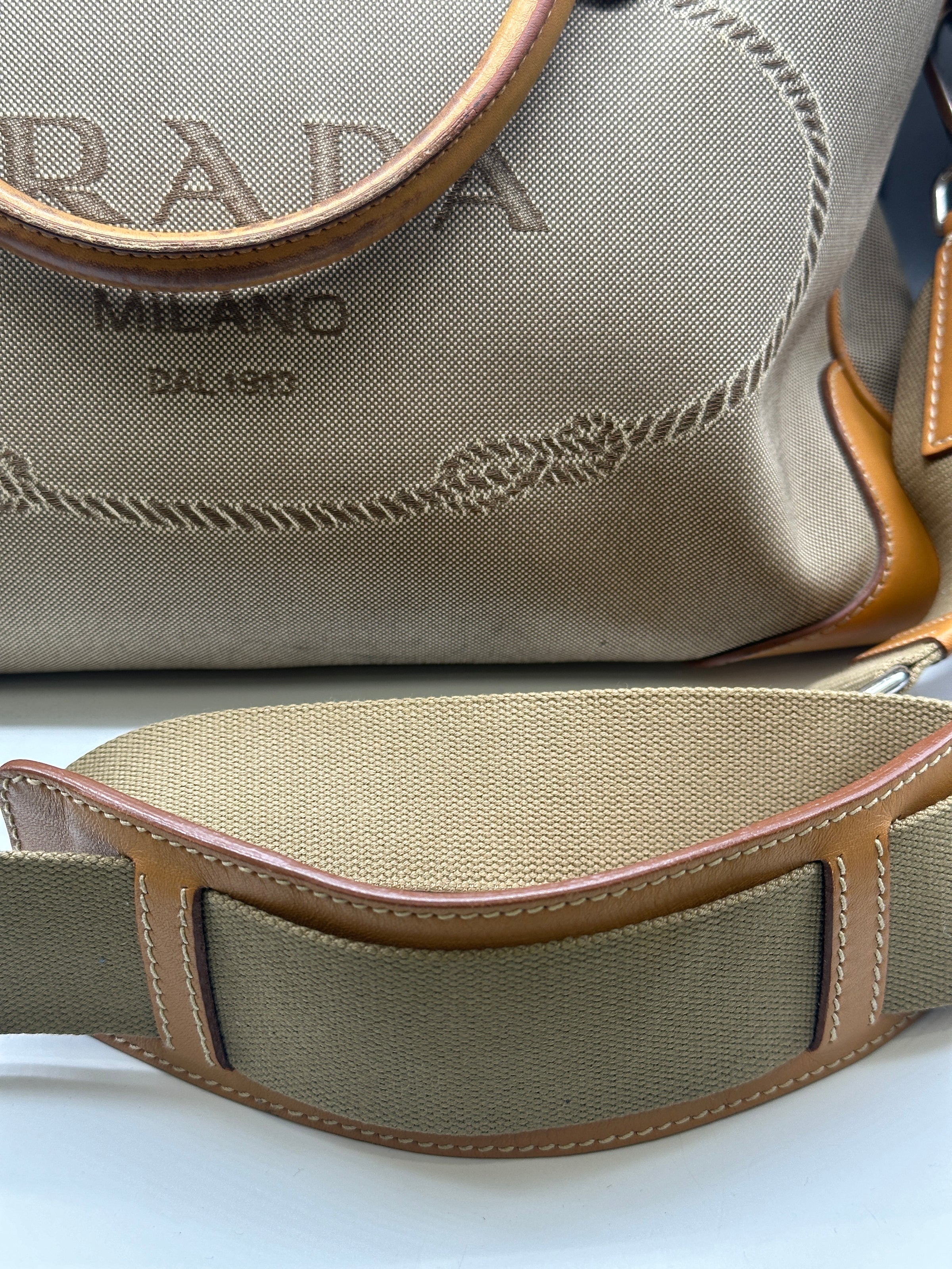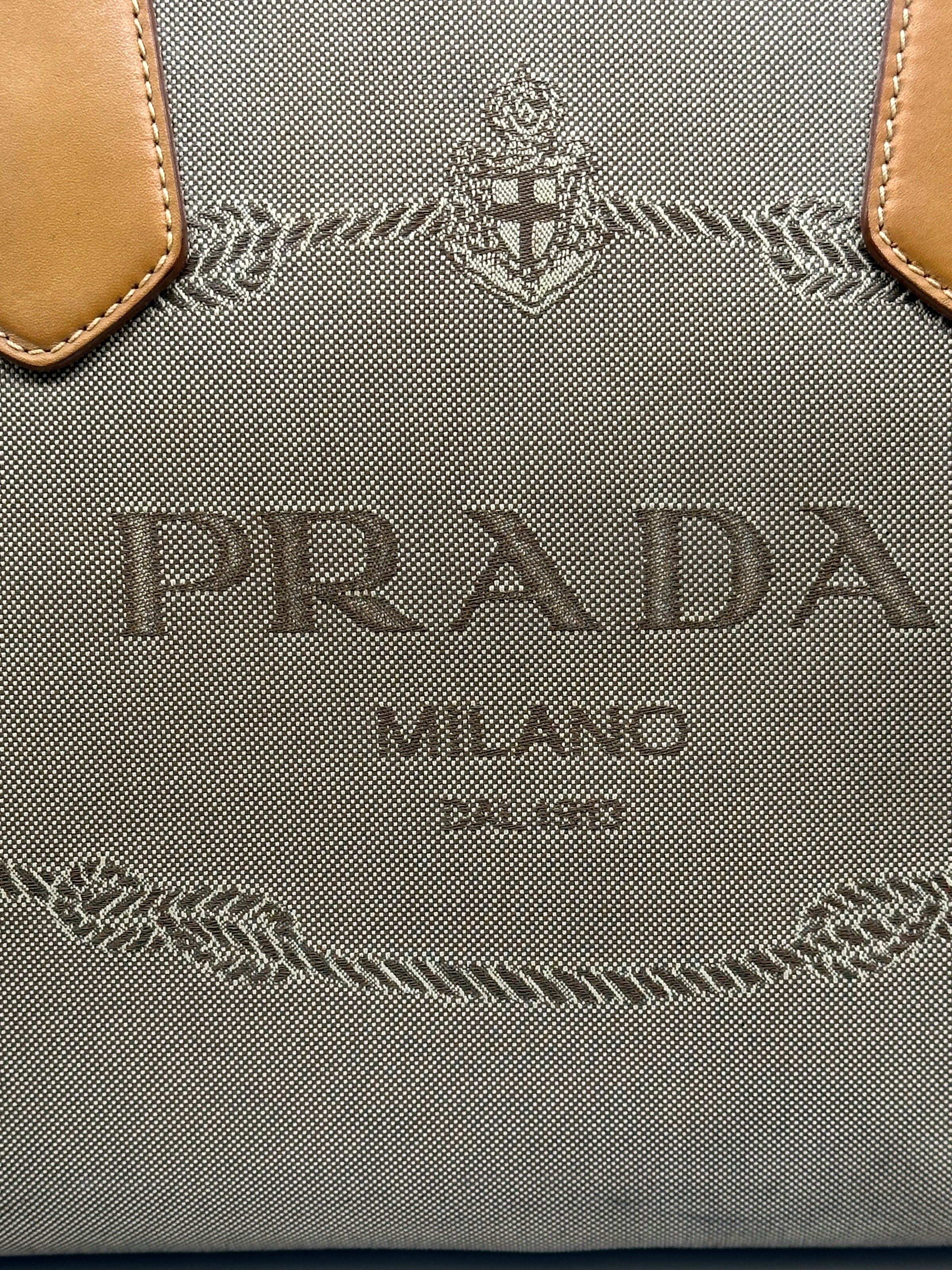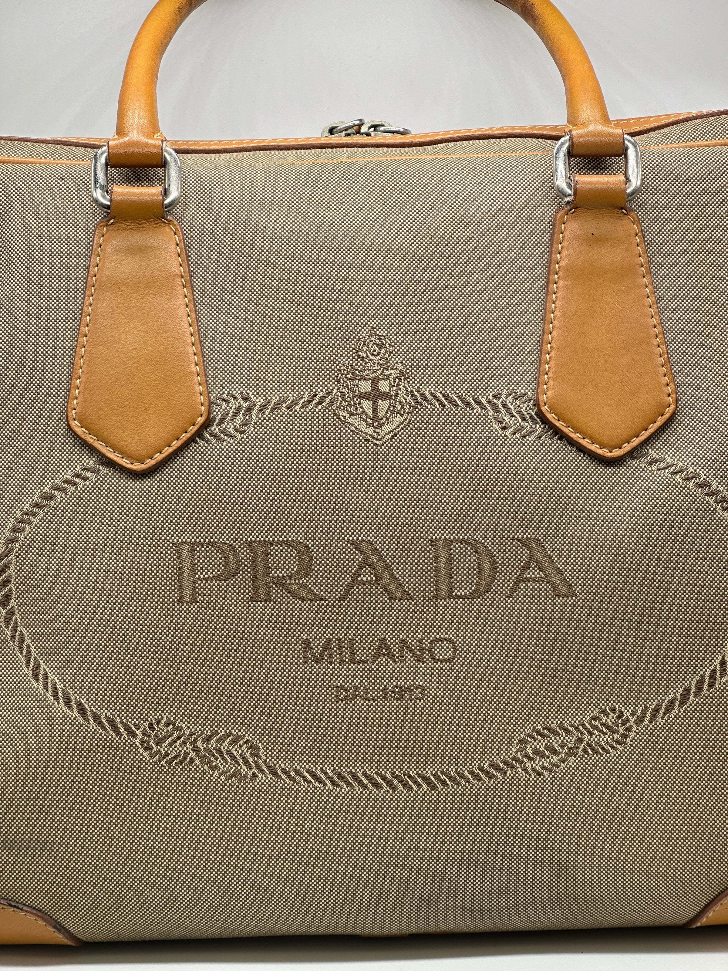 Materials & Design: The Prada Jacquard Logo Canvas Vintage Laptop Bag is a distinguished accessory crafted from durable jacquard canvas, featuring the iconic Prada logo woven throughout the fabric. This design showcases Prada's commitment to combining functionality with timeless elegance.