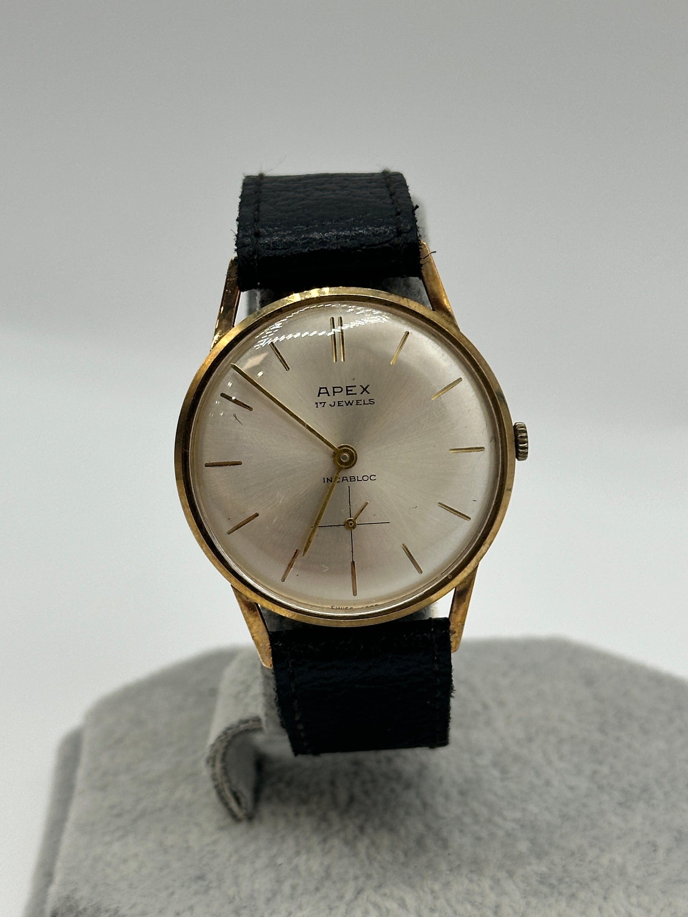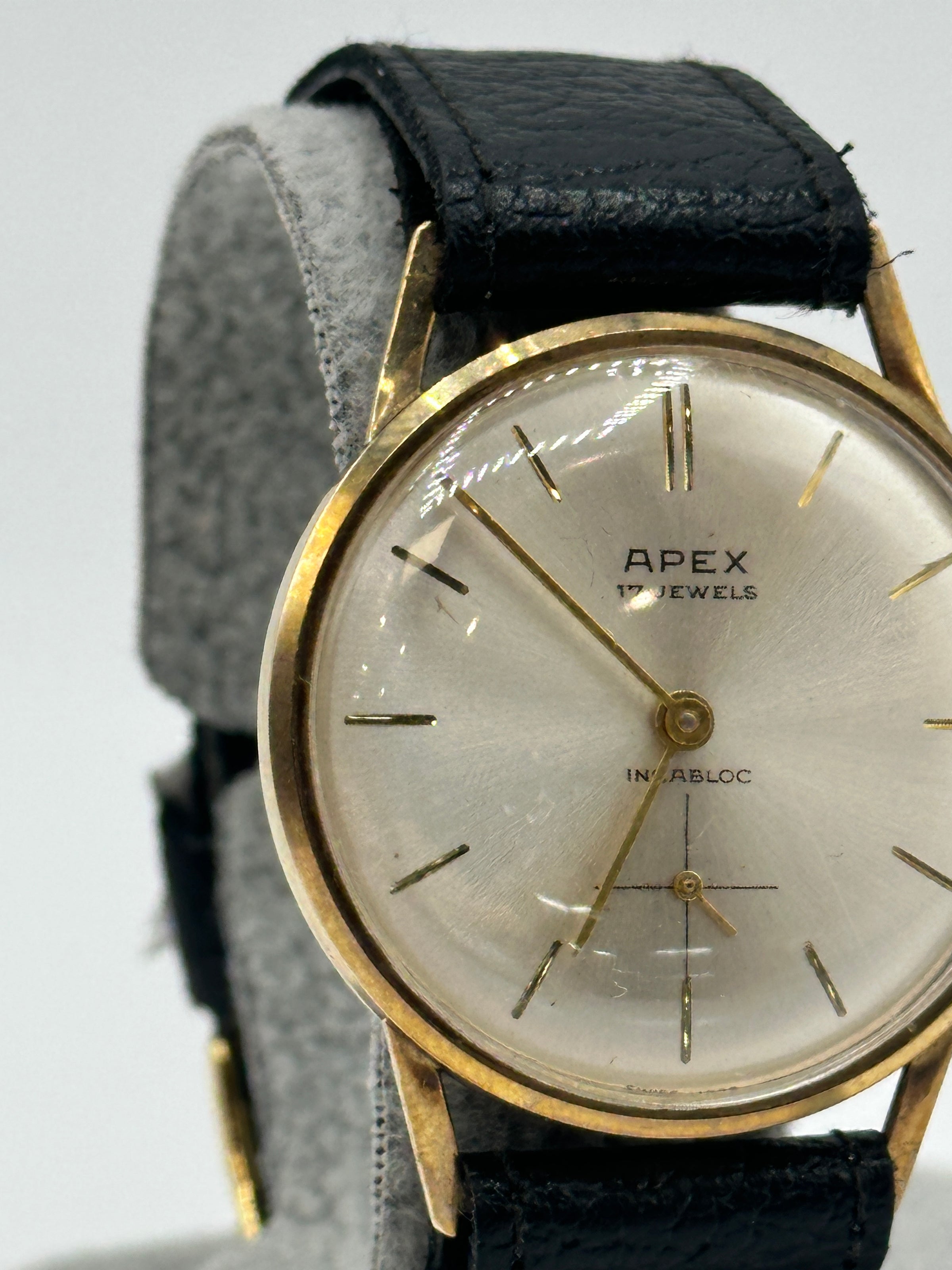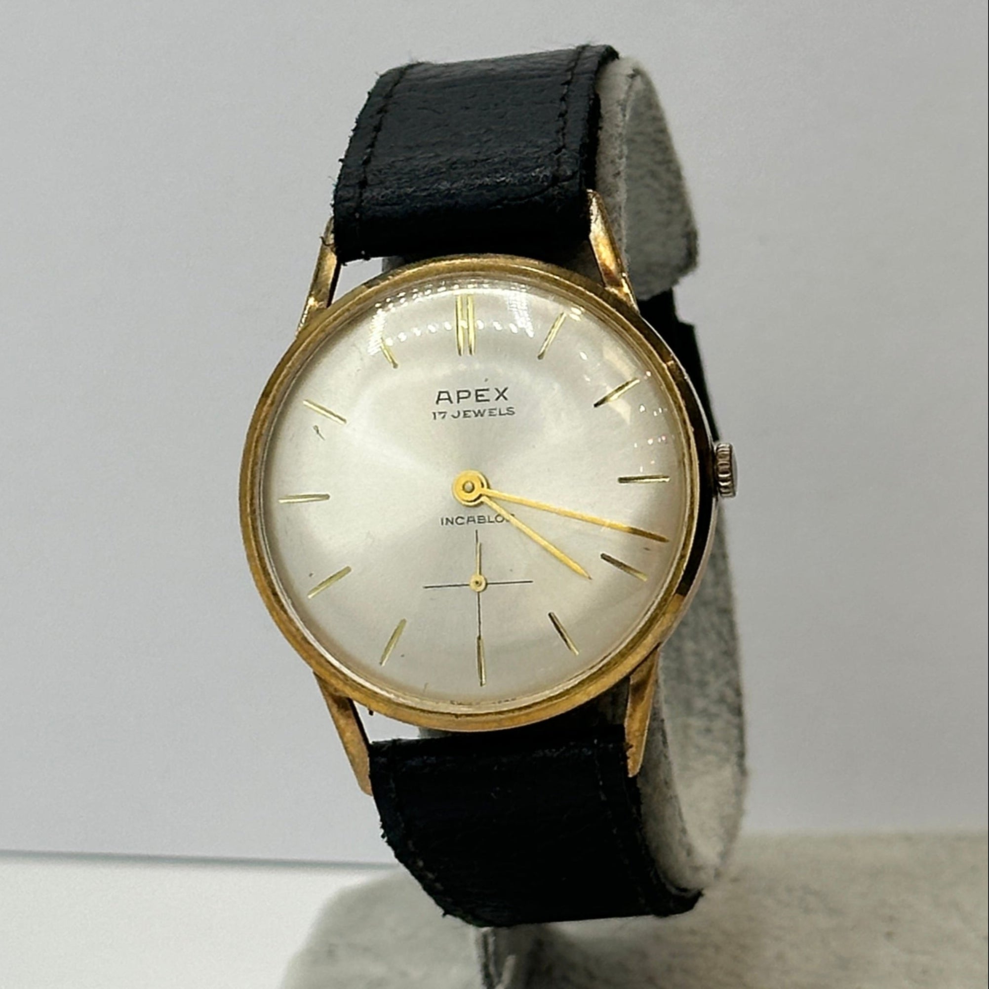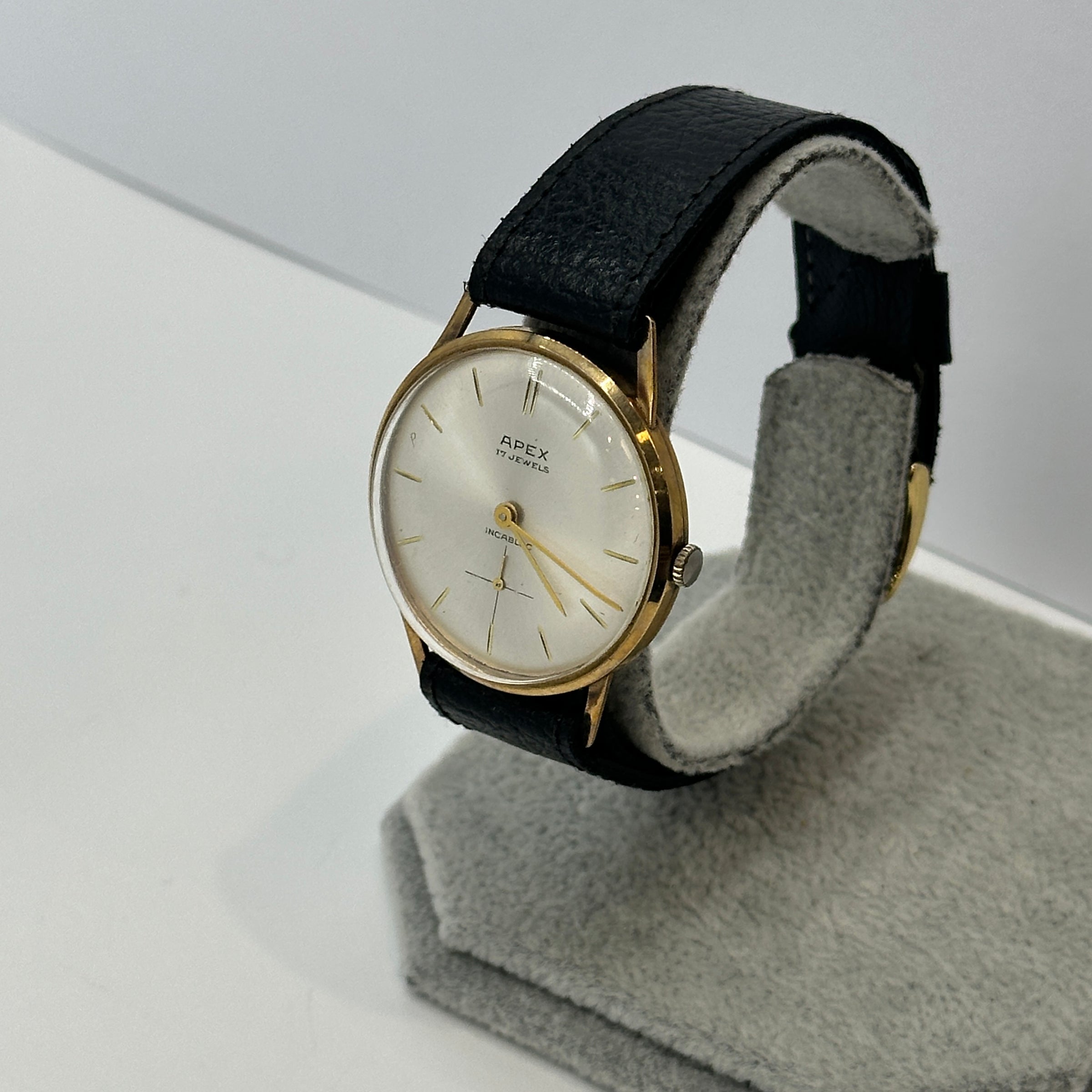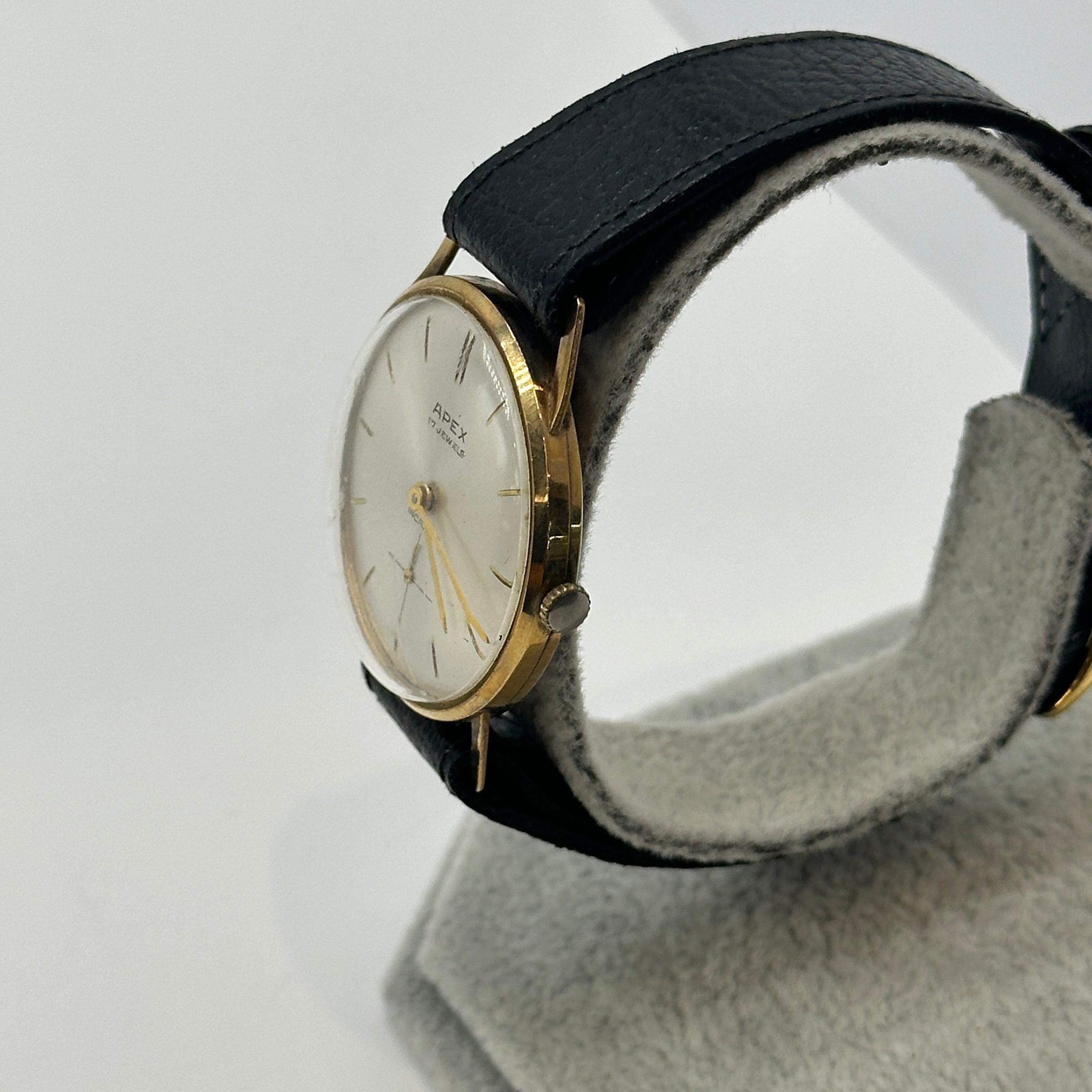 A classic representation of 1960s elegance, this Apex wristwatch is crafted from solid 9ct yellow gold. The understated silver-tone dial is enhanced with slim gold baton hour markers and matching gold hands, with a subsidiary seconds dial positioned above 6 o'clock, offering a traditional aesthetic. Measuring approximately 33mm in diameter, the case is complemented by a black leather strap and gold-tone buckle. Powered by a manual wind movement featuring 17 jewels and Incabloc shock protection, this timepiece blends vintage refinement with robust Swiss engineering.