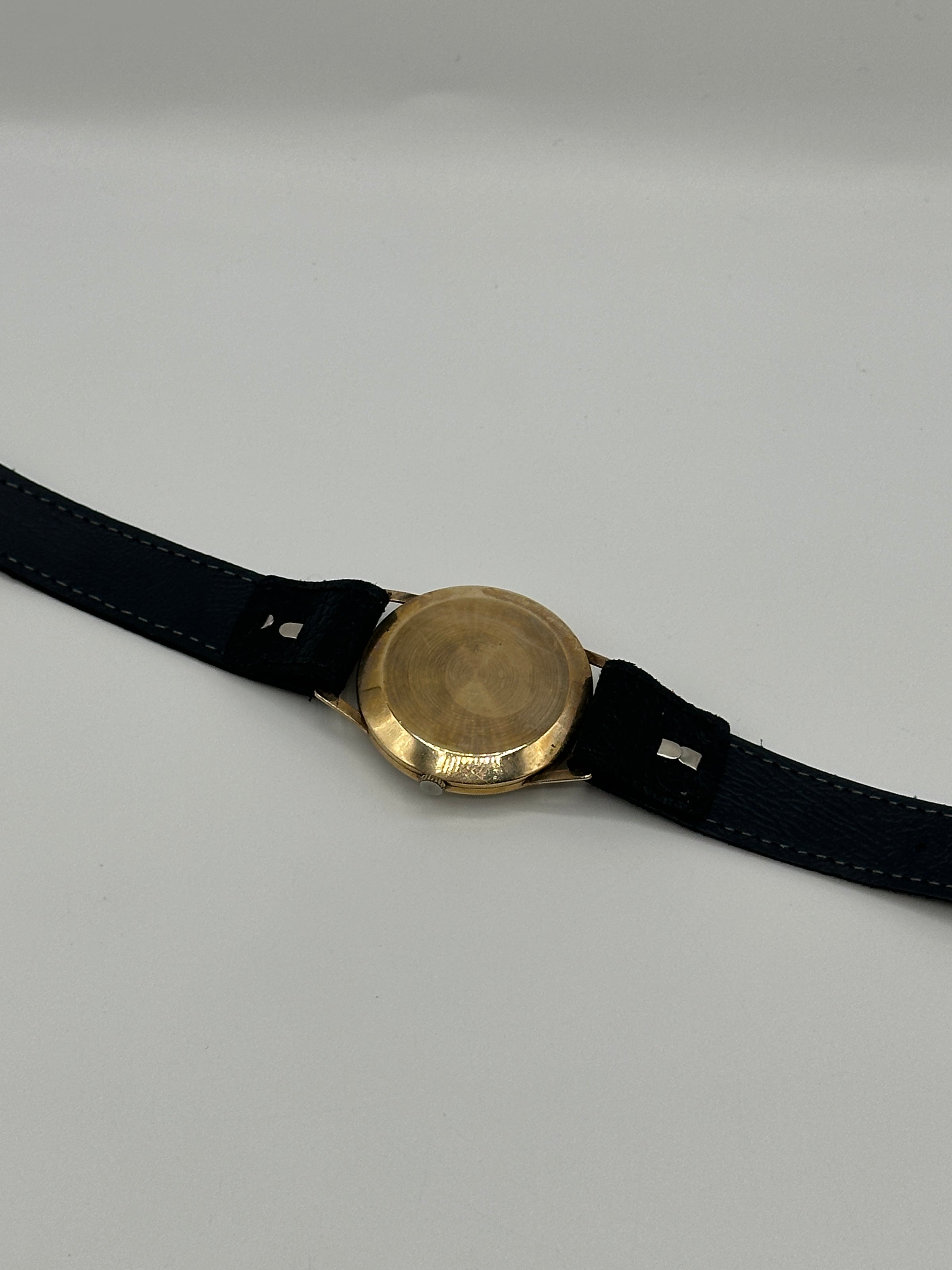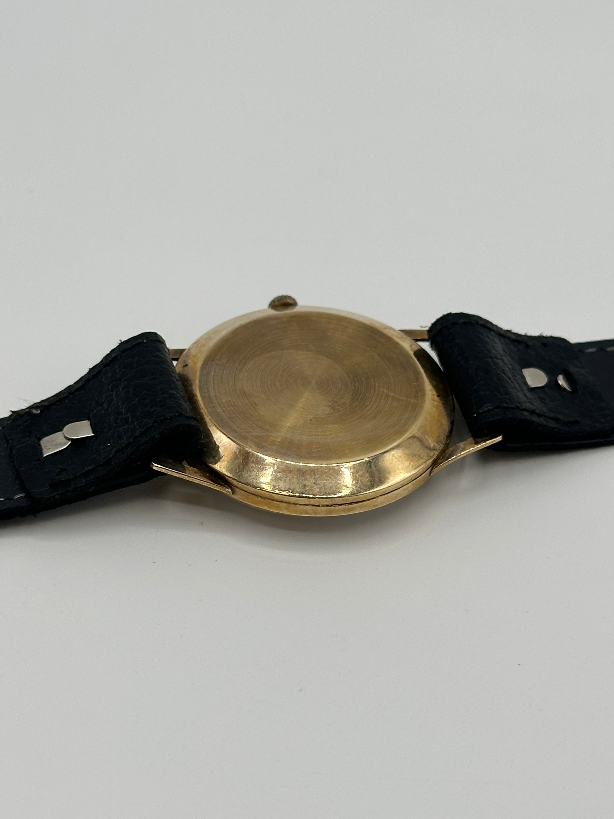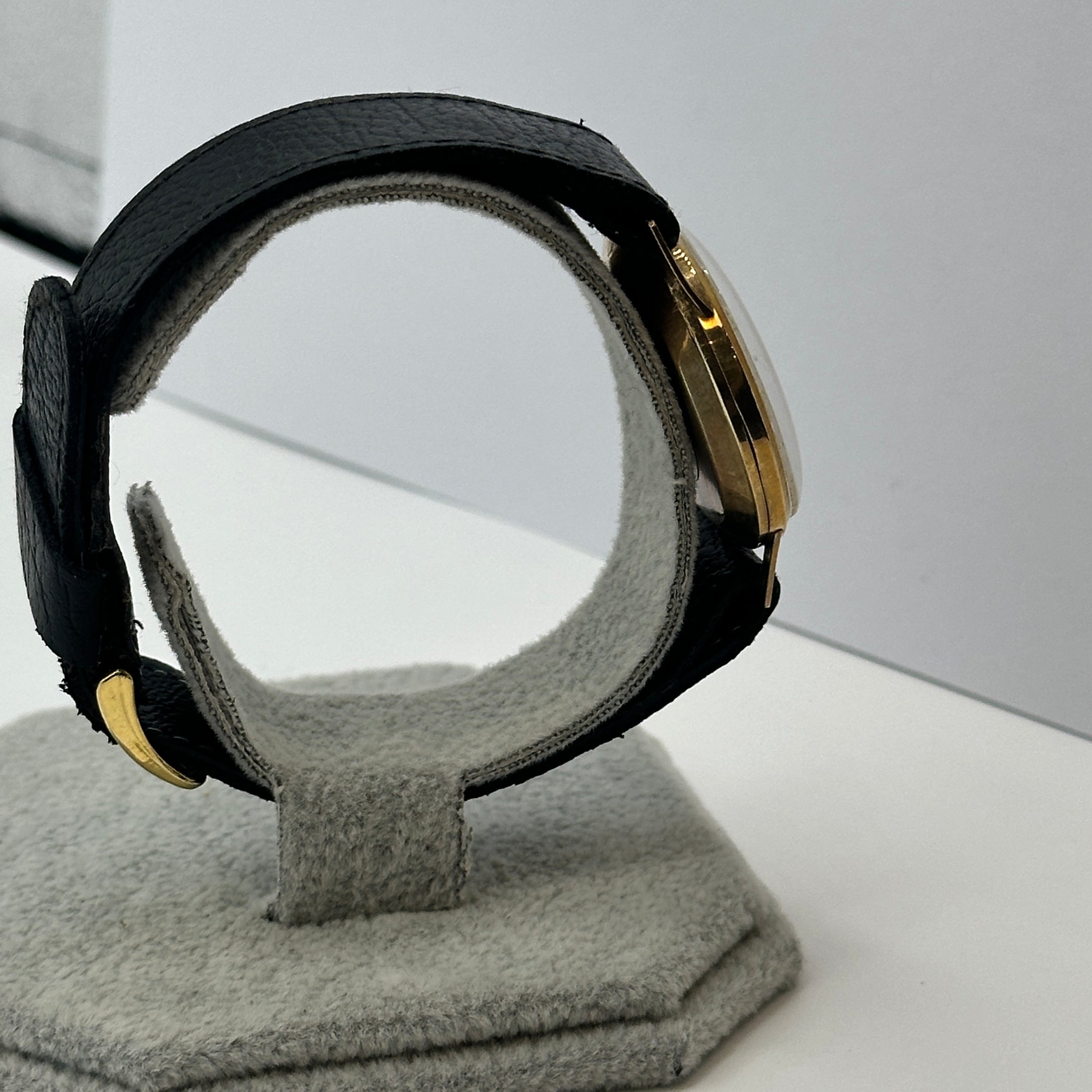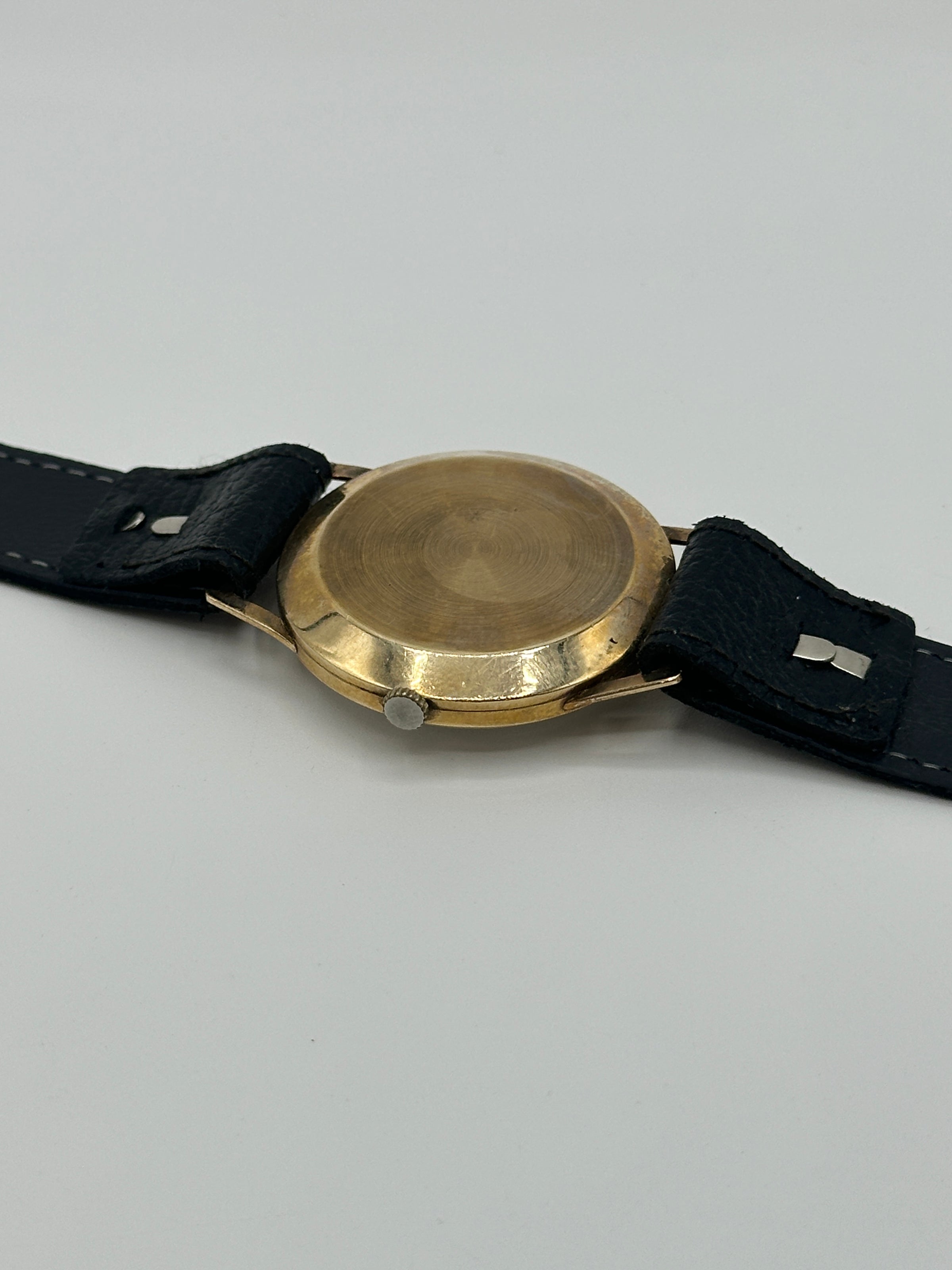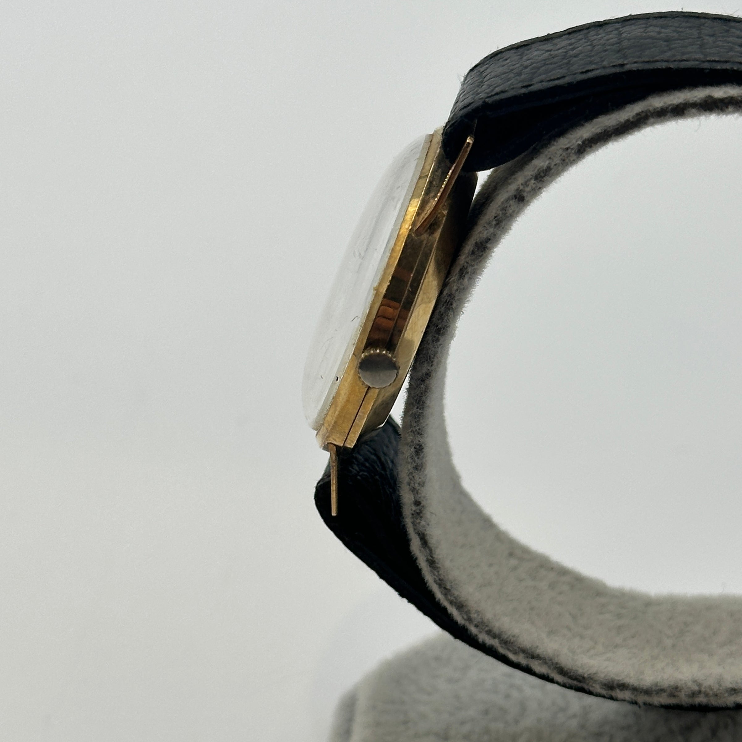 A classic representation of 1960s elegance, this Apex wristwatch is crafted from solid 9ct yellow gold. The understated silver-tone dial is enhanced with slim gold baton hour markers and matching gold hands, with a subsidiary seconds dial positioned above 6 o'clock, offering a traditional aesthetic. Measuring approximately 33mm in diameter, the case is complemented by a black leather strap and gold-tone buckle. Powered by a manual wind movement featuring 17 jewels and Incabloc shock protection, this timepiece blends vintage refinement with robust Swiss engineering.