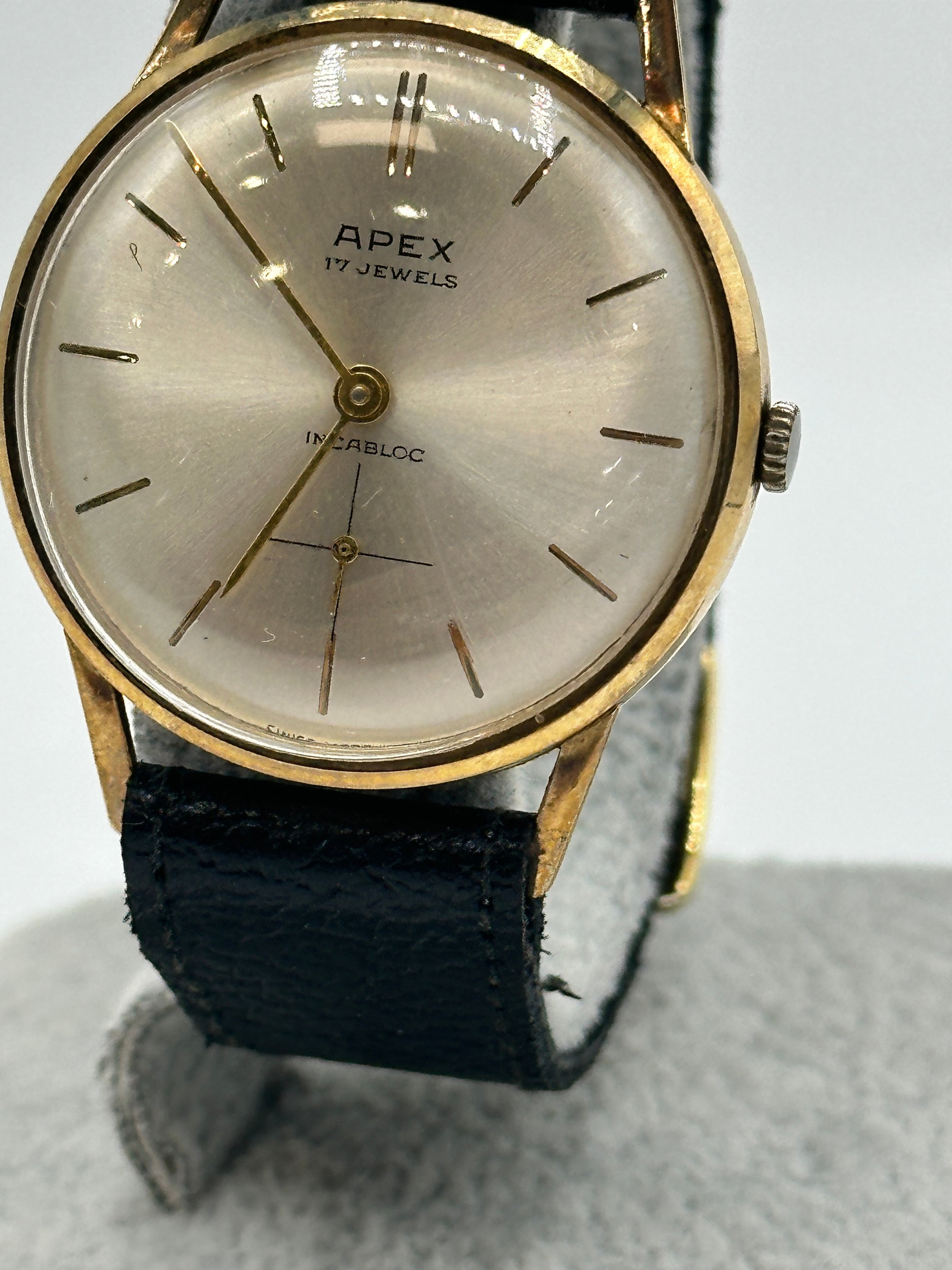 Apex is a respected name from the mid-20th century, known for creating high-quality Swiss-made watches focused on durability, precision, and timeless styling. Frequently using fine materials like 9ct gold cases and shock-protected jewel movements, Apex watches were popular with those seeking reliable yet elegant timepieces. This 1965 model perfectly captures the brand's commitment to simple, enduring design and mechanical excellence.