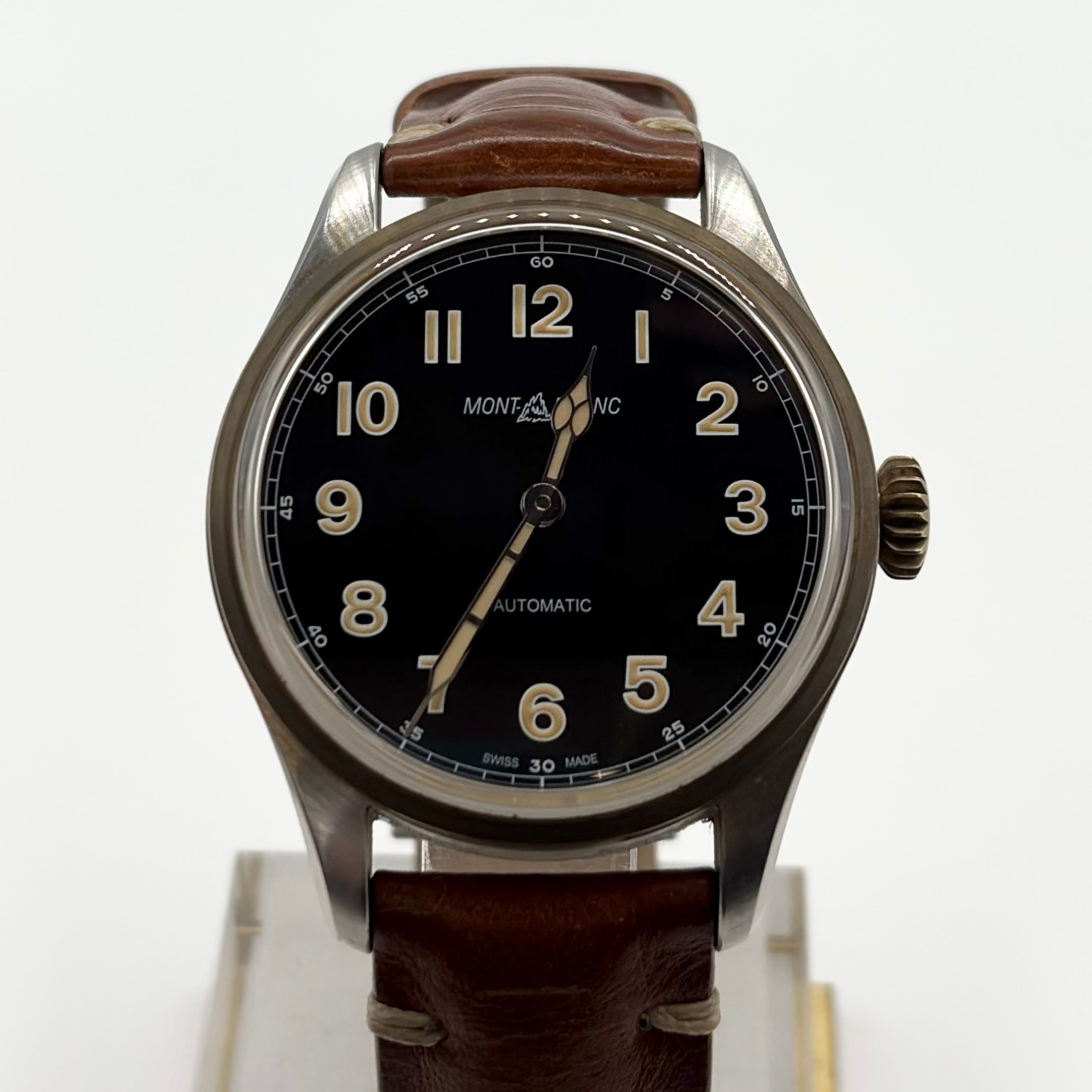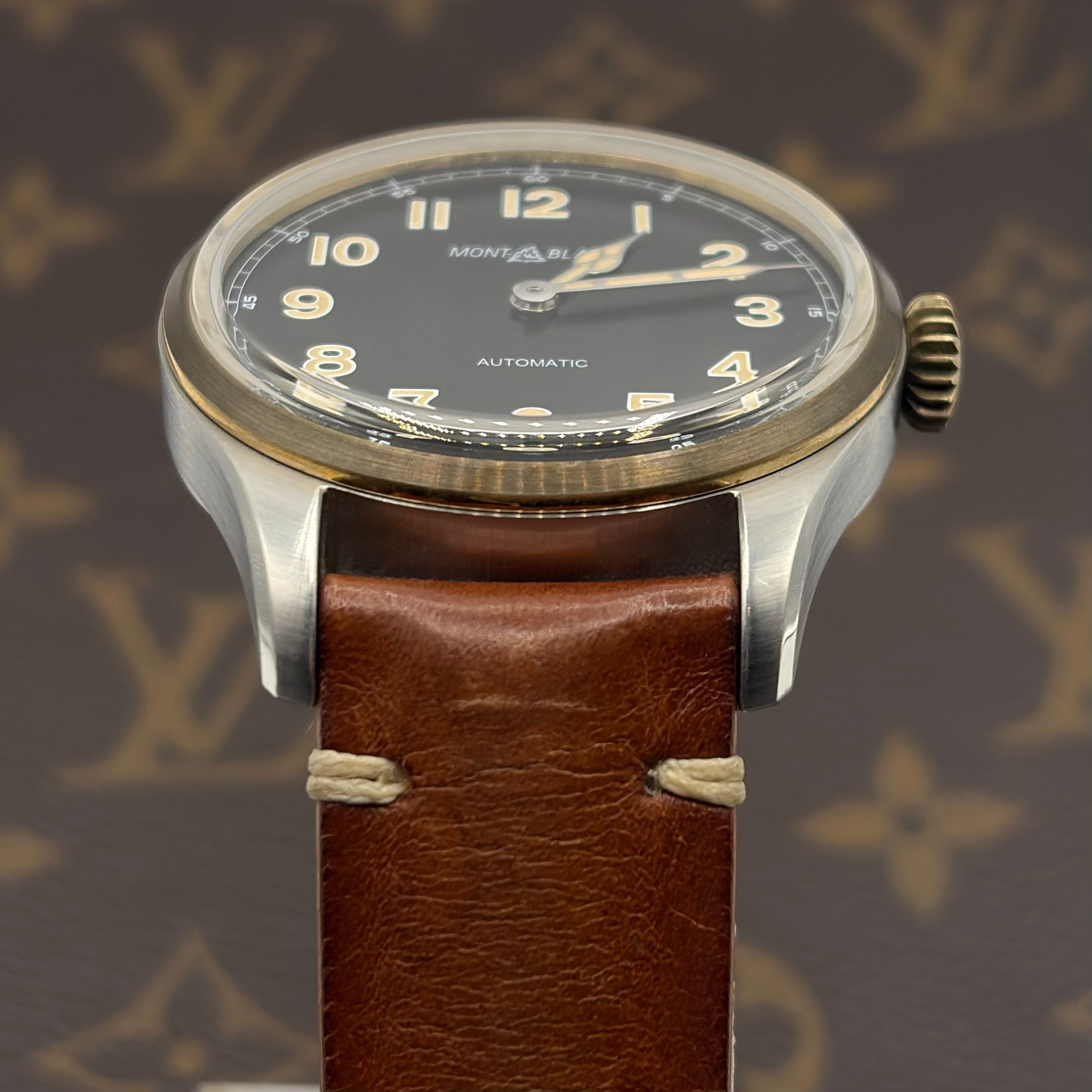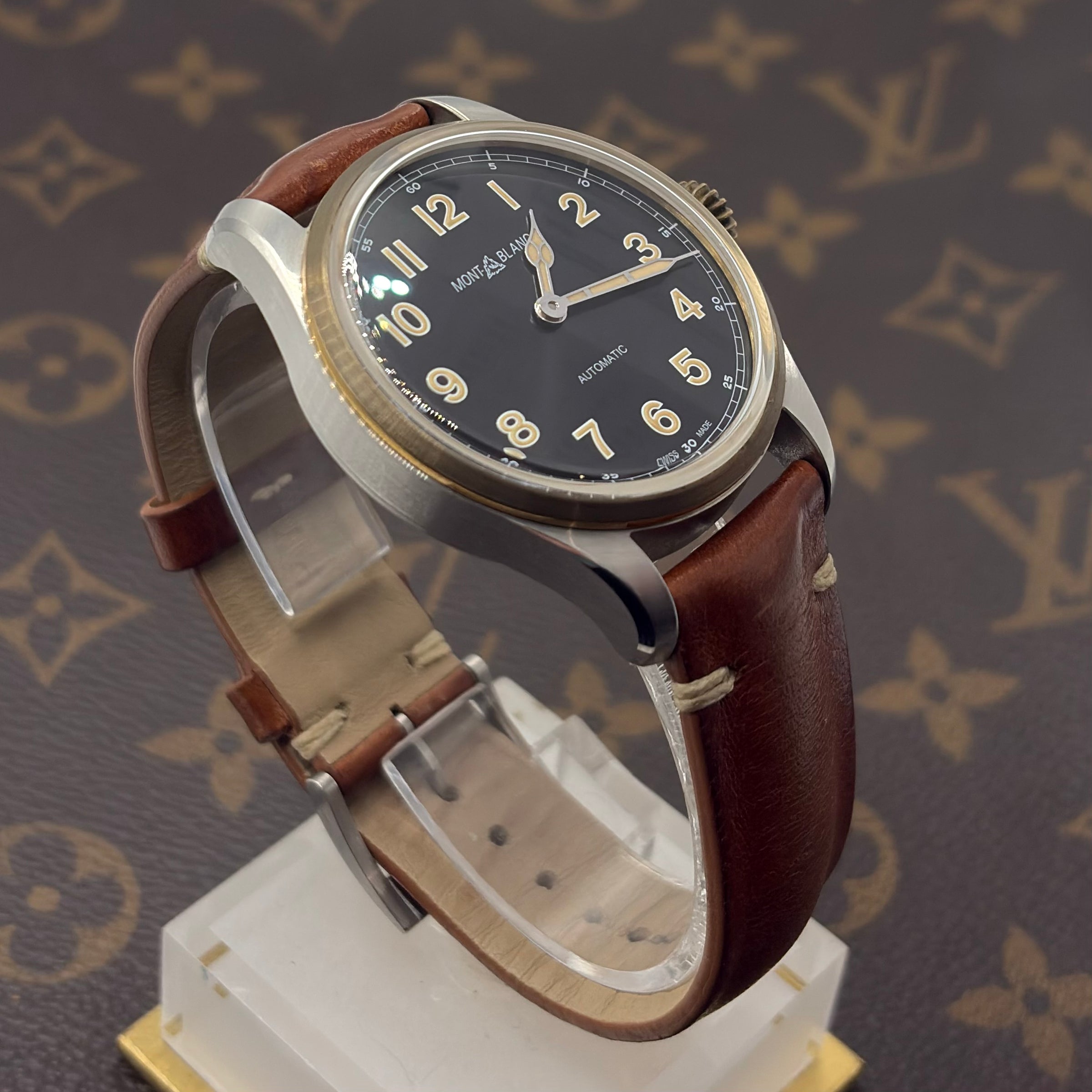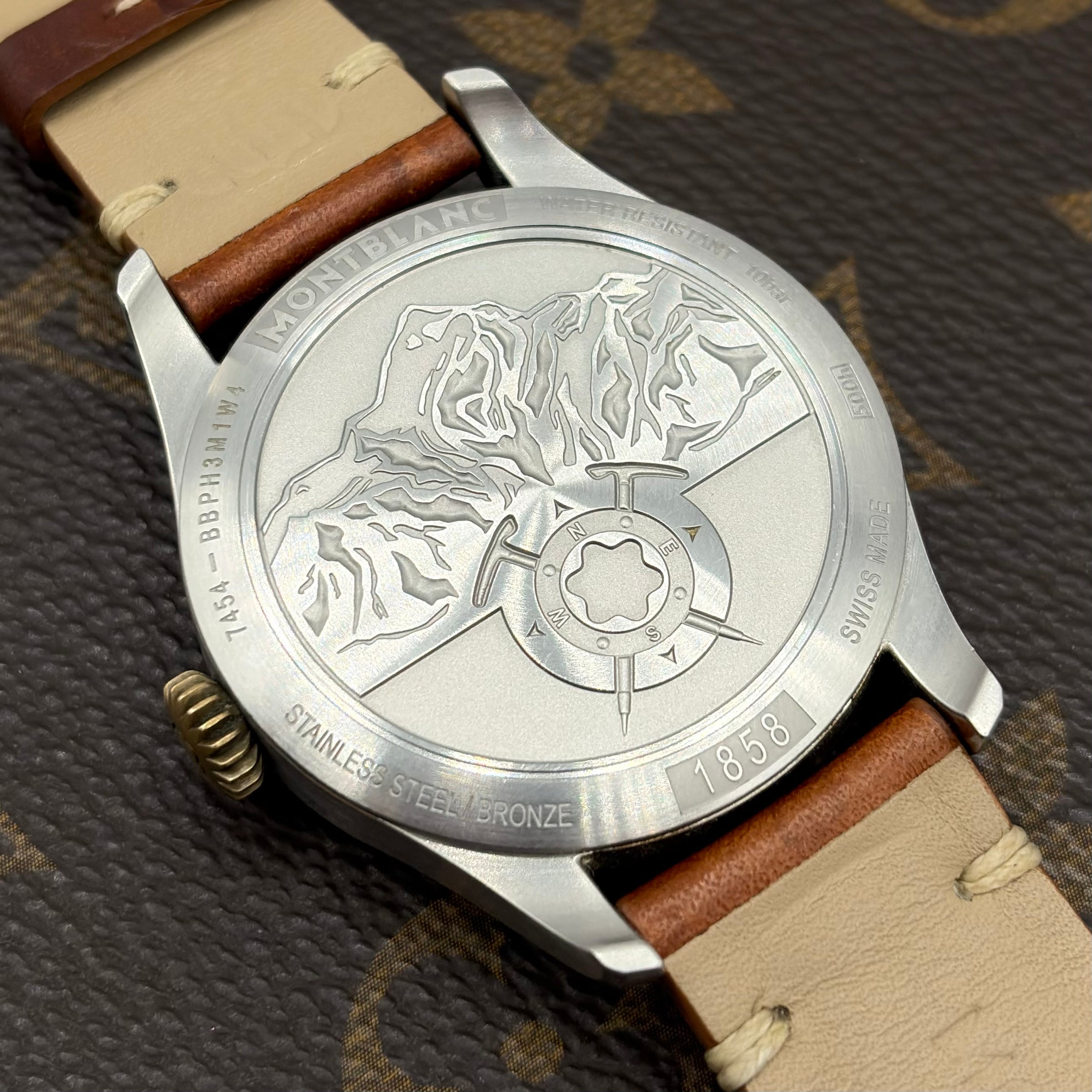 The Montblanc 1858 Automatic is inspired by vintage mountaineering instruments and the golden age of exploration. Housed in a 40 mm stainless steel and bronze case, this model features a clean, highly legible black dial. Luminous 'cathedral' hands and large Arabic numerals provide both excellent readability and a distinctive retro appearance. The accurate and durable Swiss automatic movement provides approximately 38 hours of power reserve. The watch is water resistant to 100 metres and is on a high-quality brown Montblanc leather strap. The case back shows a deep and detailed engraving of the Mont Blanc mountain, a compass rose and crossed ice picks.
