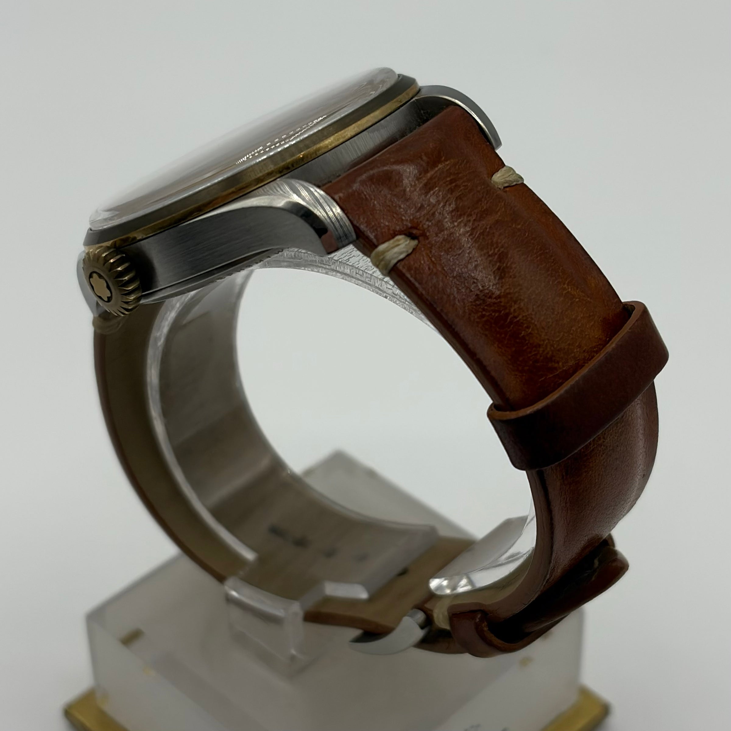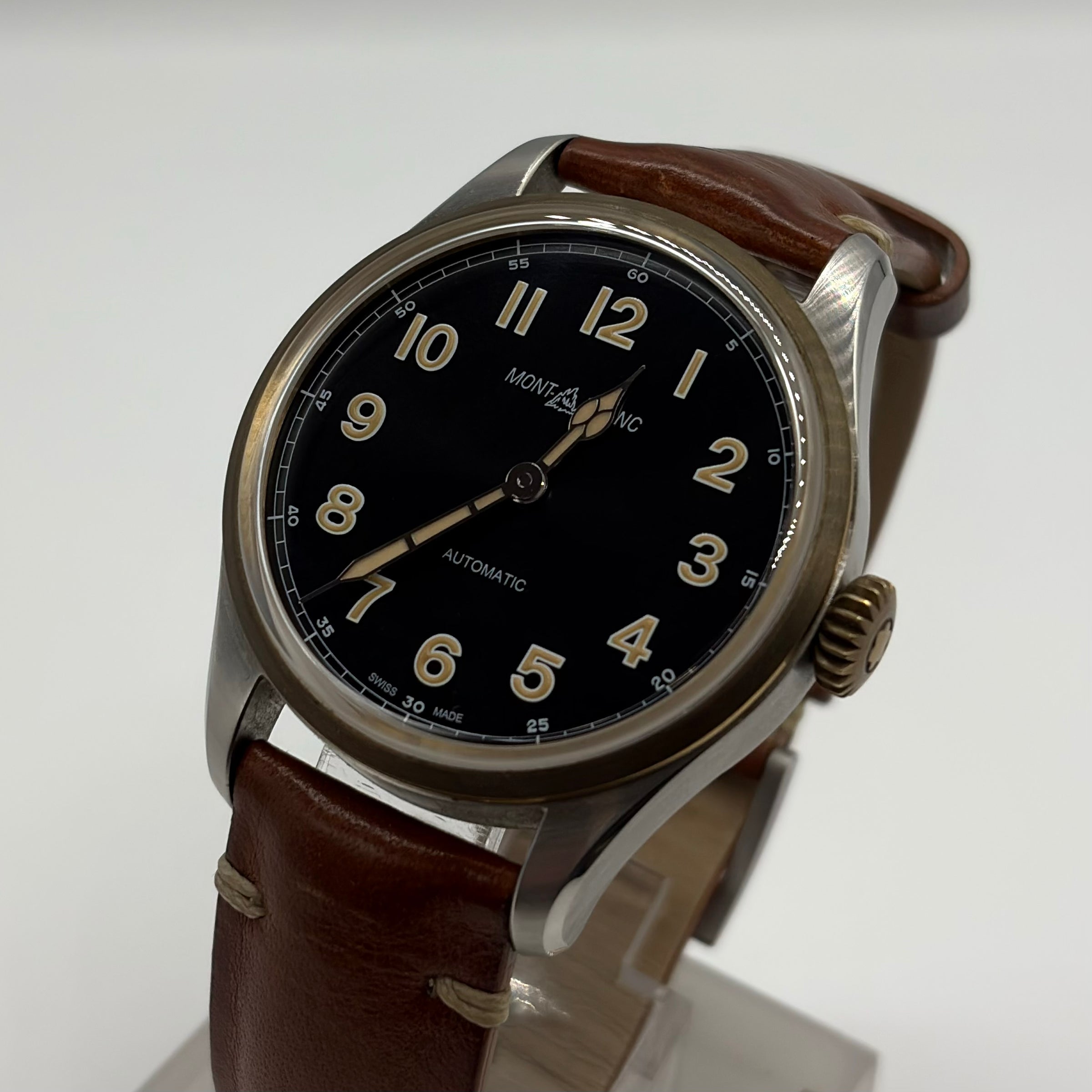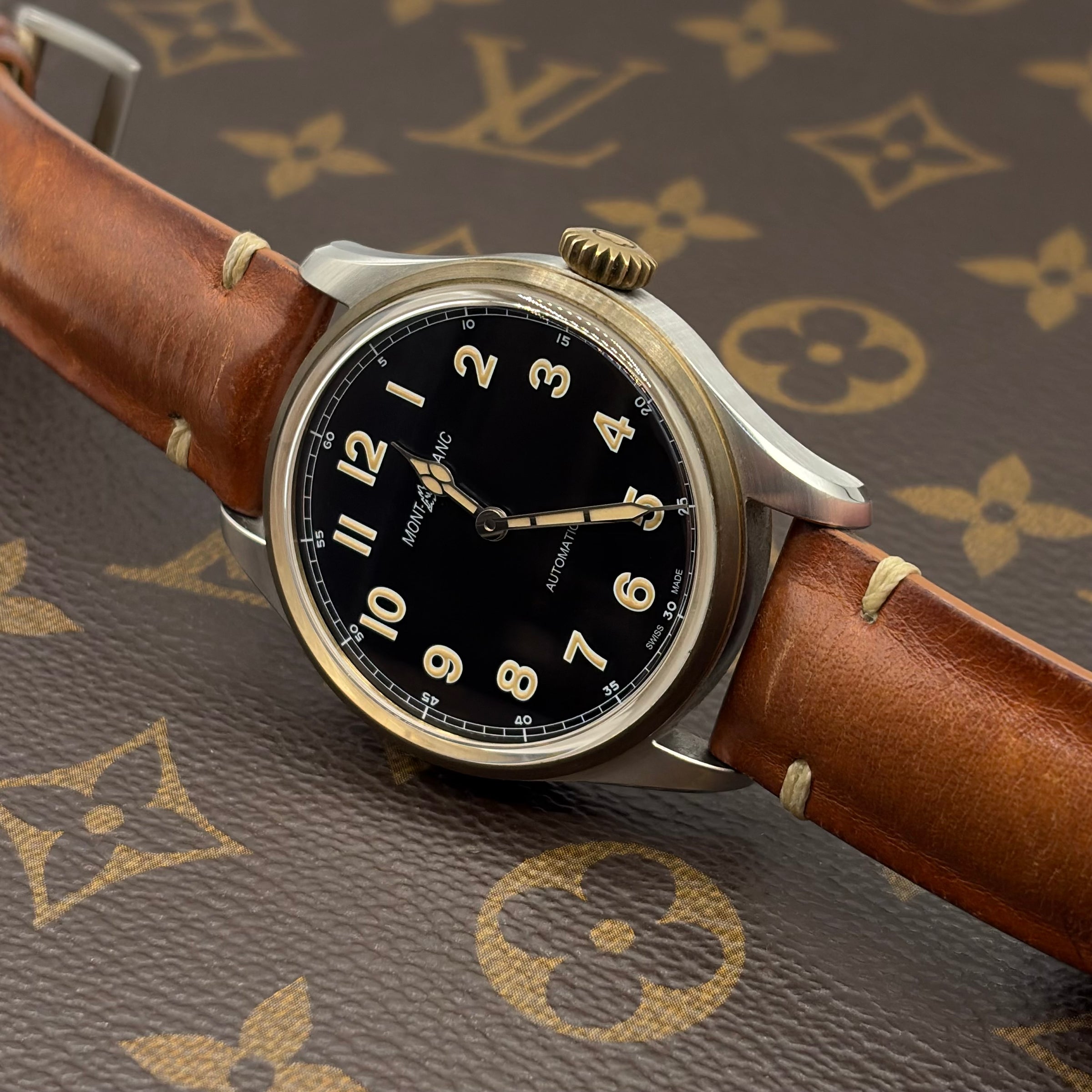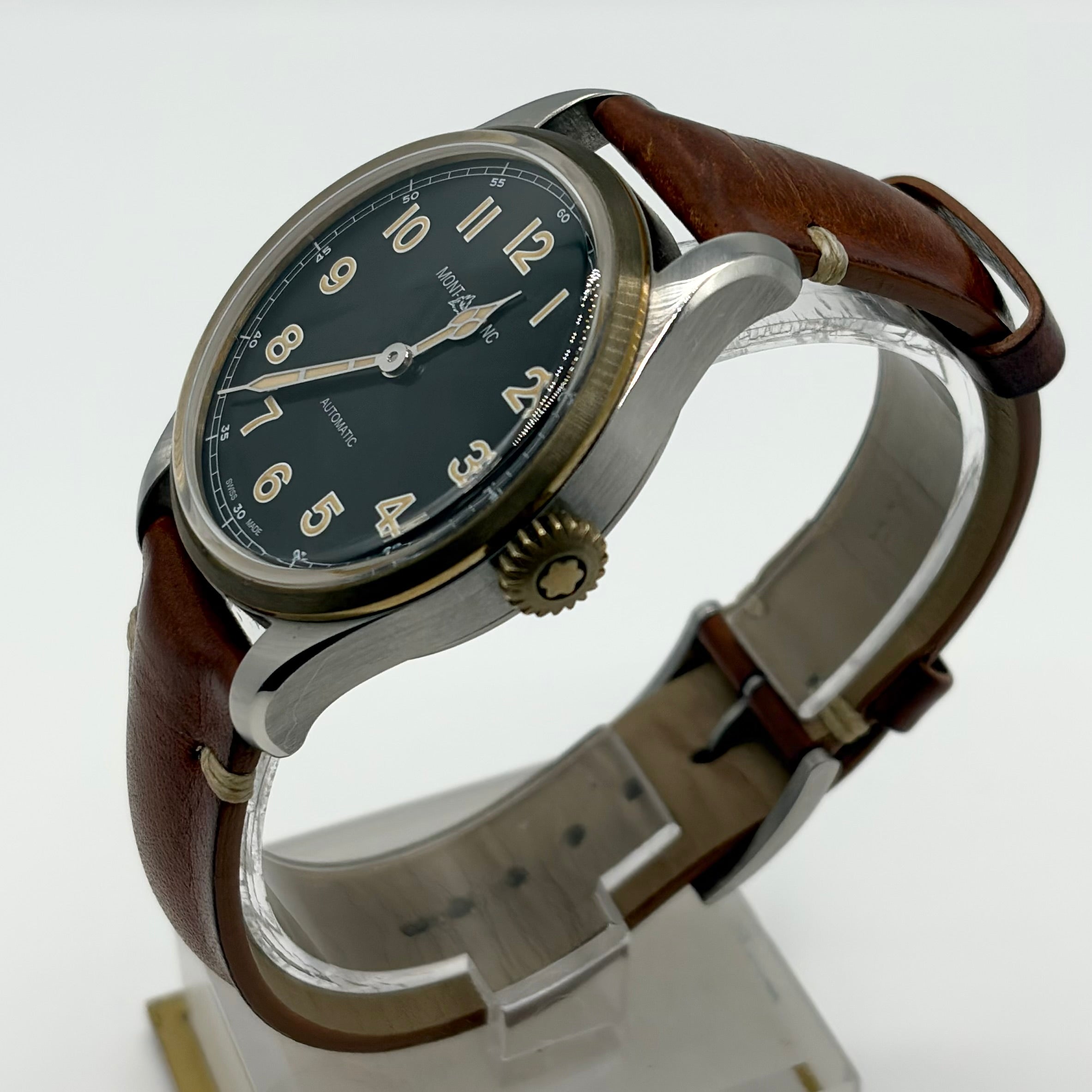 The Montblanc 1858 Automatic is inspired by vintage mountaineering instruments and the golden age of exploration. Housed in a 40 mm stainless steel and bronze case, this model features a clean, highly legible black dial. Luminous 'cathedral' hands and large Arabic numerals provide both excellent readability and a distinctive retro appearance. The accurate and durable Swiss automatic movement provides approximately 38 hours of power reserve. The watch is water resistant to 100 metres and is on a high-quality brown Montblanc leather strap. The case back shows a deep and detailed engraving of the Mont Blanc mountain, a compass rose and crossed ice picks.