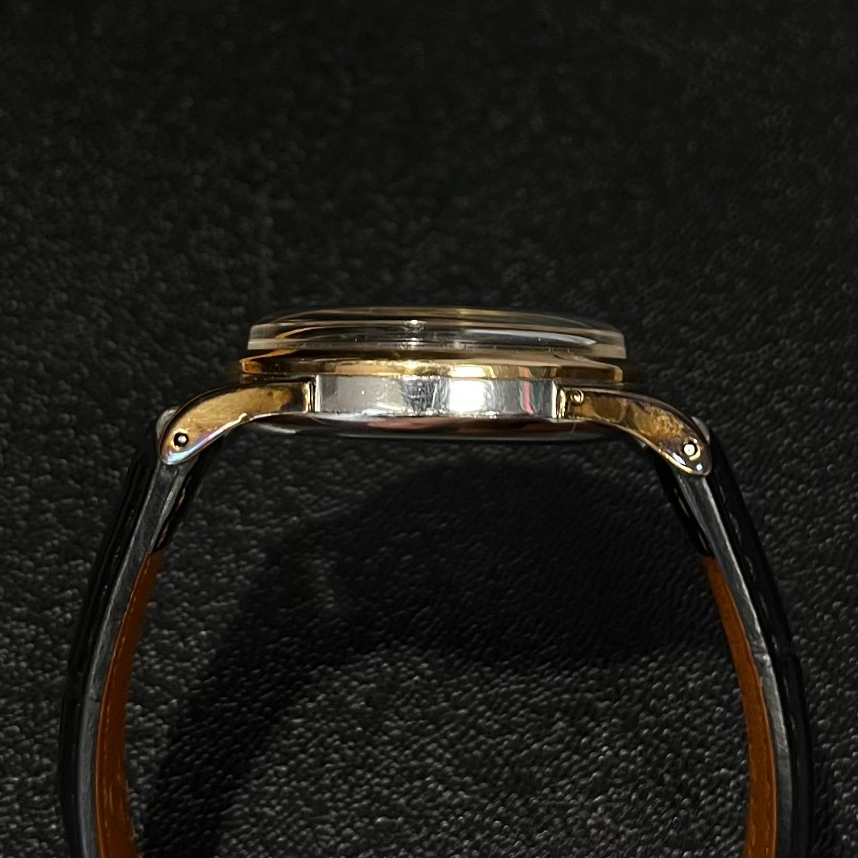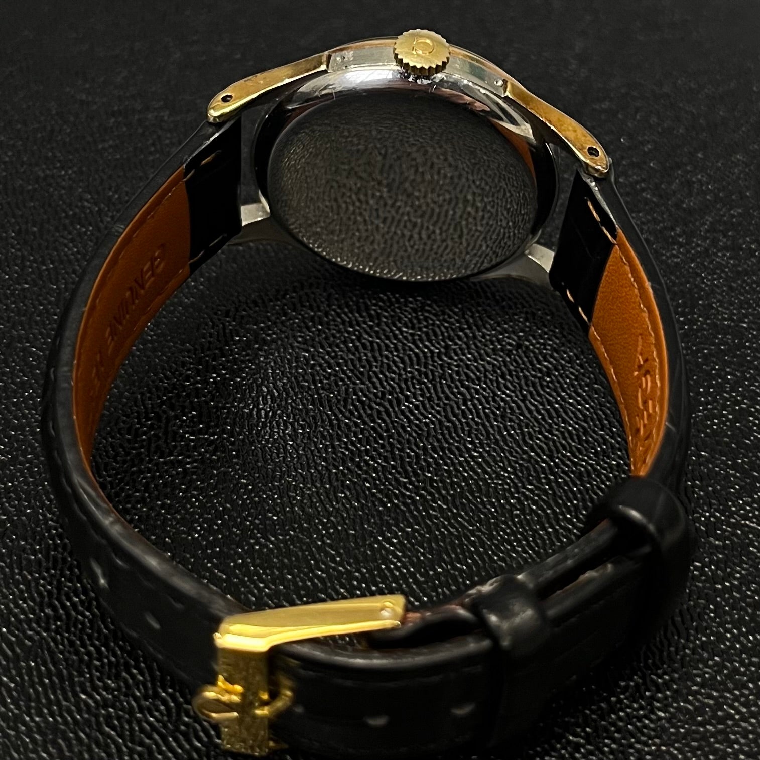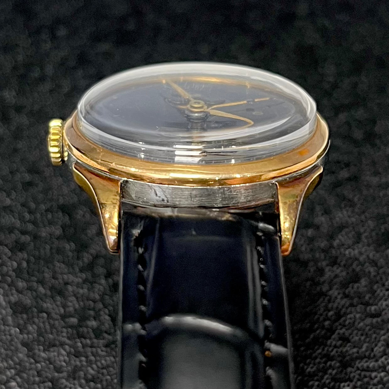 At the time (1947-1956), the Cosmic was one of the most exclusive watches made by Omega. Featuring a complete calendar with pointer date, moon-phase, and running seconds - the Cosmic fit useful features into an extremely elegant watch. The date is easily adjusted with small pushers recessed within the sides of the case. In addition, the Lemania developed Calibre 381 T had anti-magnetic and anti-shock measures. The good condition gold-plated 35mm case with 'horn lugs' wears beautifully on the wrist, and the rich black dial contrasts excellently with the gold hands and case - with black dials being rare on watches of this type and age.