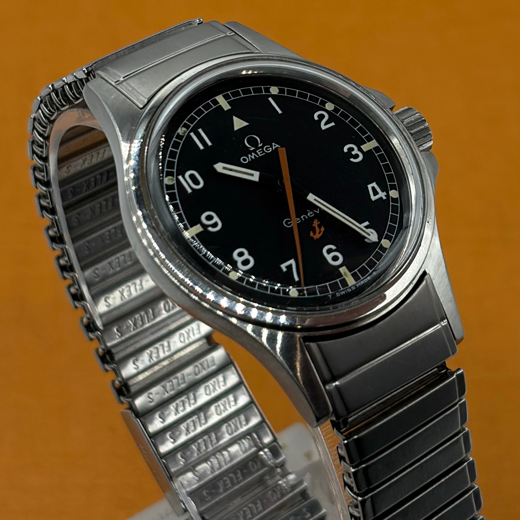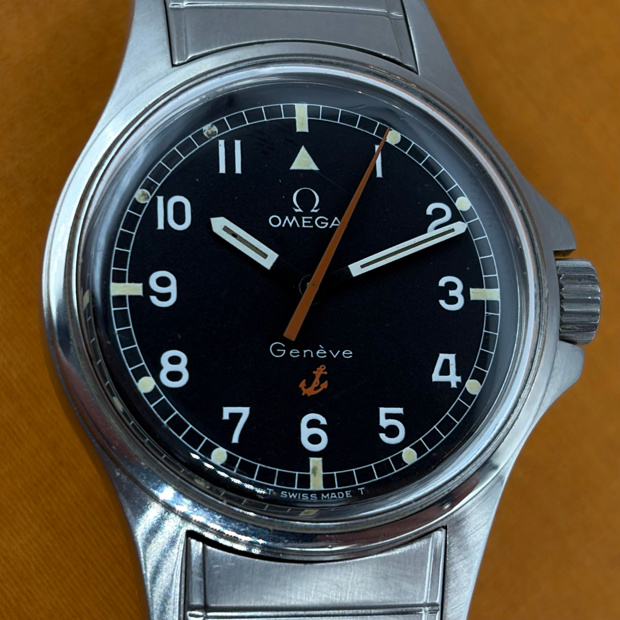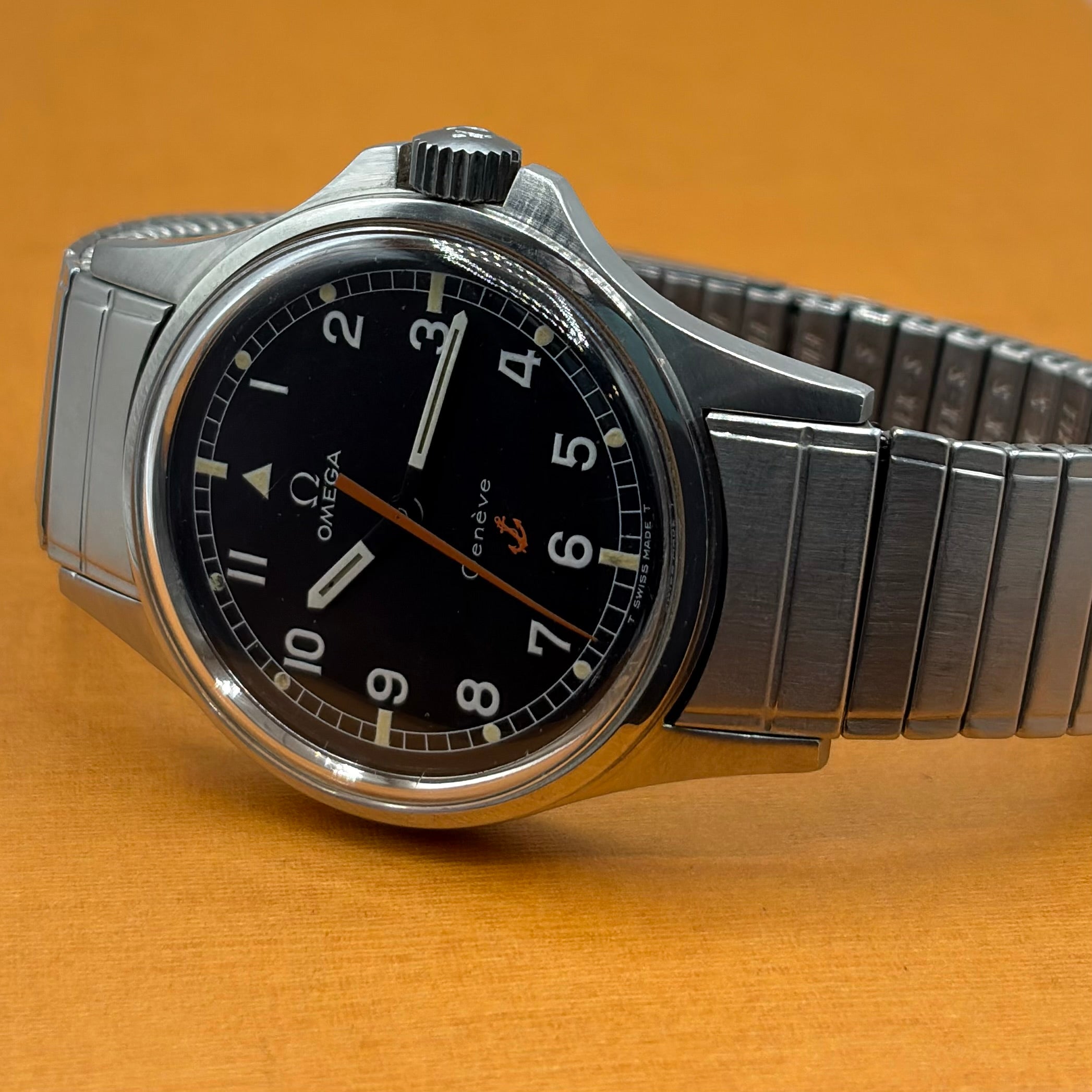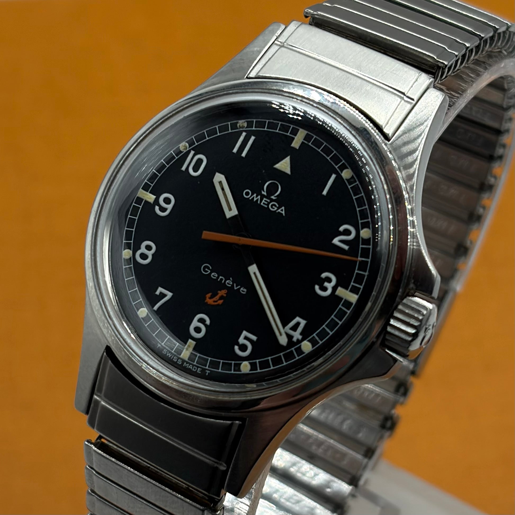 The Omega Genève Admiralty Ref. 165.038 is a distinctive vintage wristwatch, powered by the reliable and accurate Omega Calibre 552. The 35mm stainless steel case with integrated crown guards is paired with the original Omega 'Fixo-Flex' expandable bracelet with signed Omega clasp. The matte dial with orange seconds hand (matching the anchor and reminiscent of the 'Ultraman' Speedmasters) is both charming and extremely legible. The “Admiralty” anchor motif on the dial is a reference to Omega's long history with waterproof watches, including ones issued to Royal Navy divers and special forces. A much rarer alternative to the Rolex Explorer 1016 at a fraction of the price, this is a great choice for the man looking for a high-quality, no-nonsense, reasonably priced vintage watch.