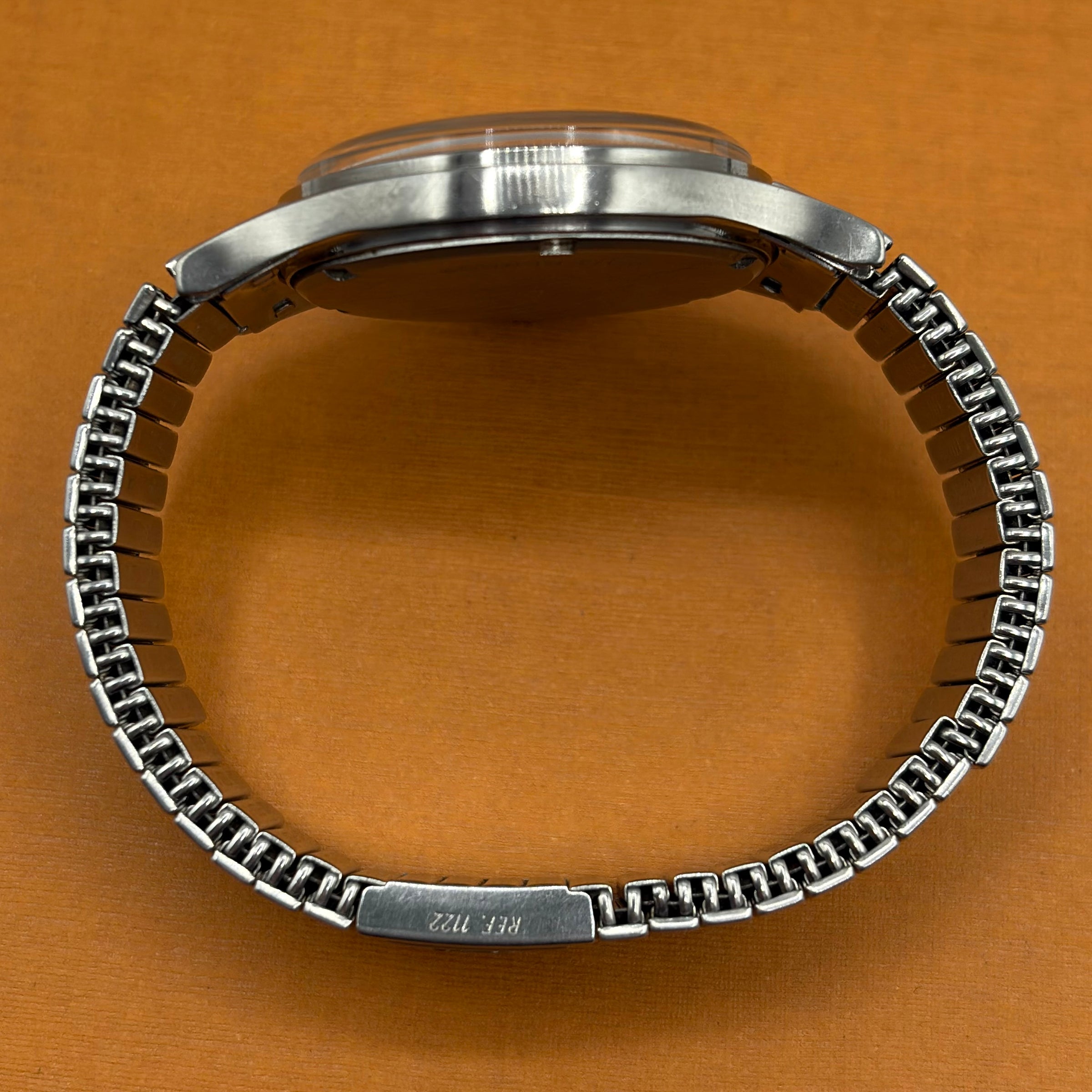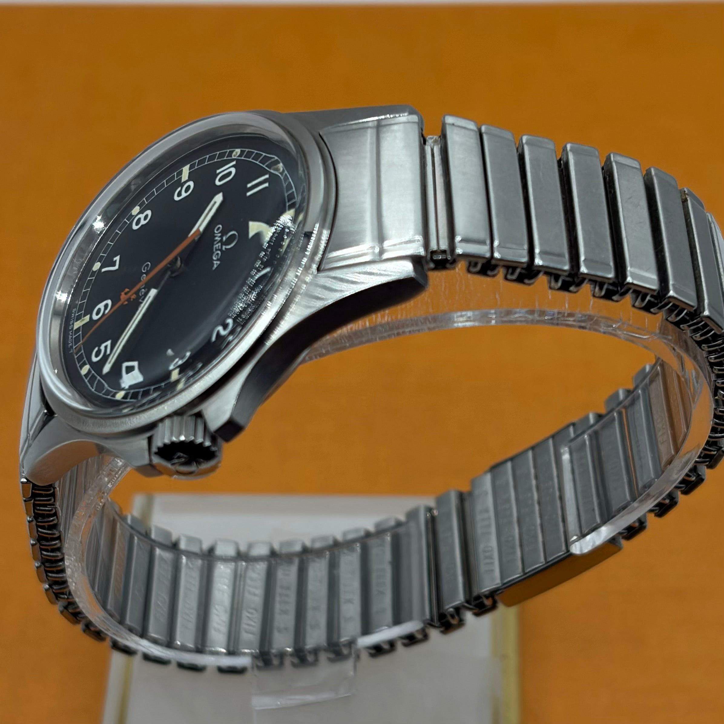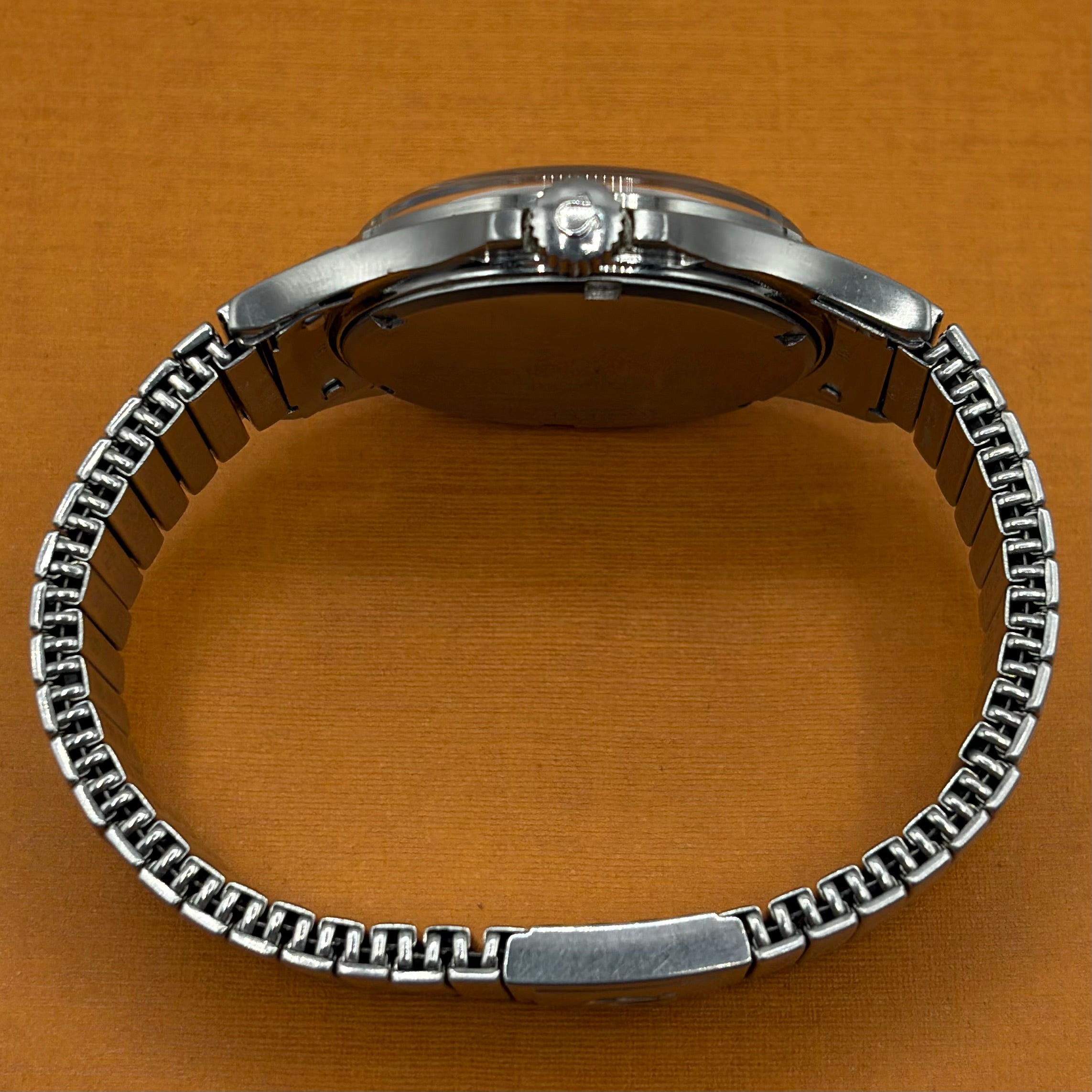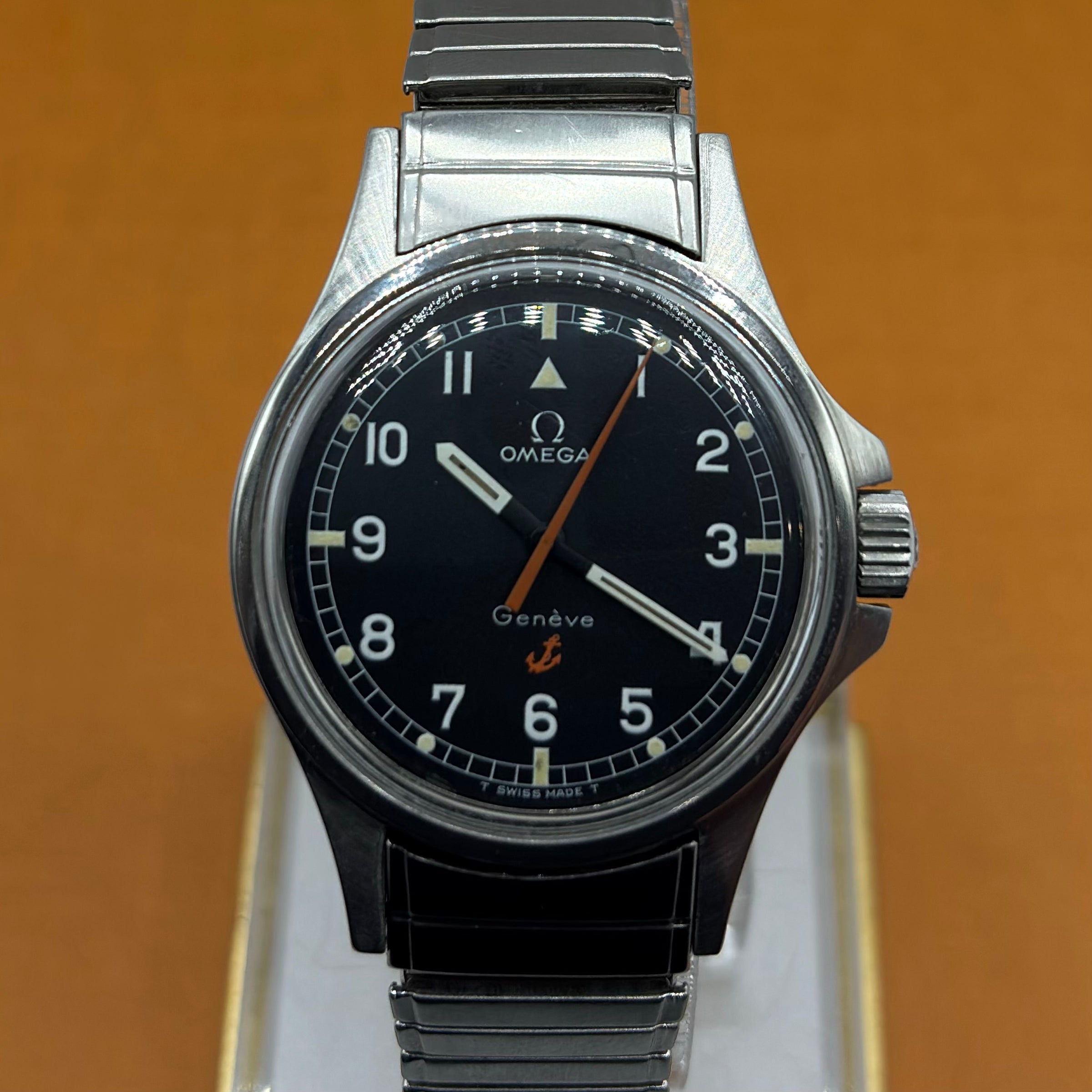 The Omega Genève Admiralty Ref. 165.038 is a distinctive vintage wristwatch, powered by the reliable and accurate Omega Calibre 552. The 35mm stainless steel case with integrated crown guards is paired with the original Omega 'Fixo-Flex' expandable bracelet with signed Omega clasp. The matte dial with orange seconds hand (matching the anchor and reminiscent of the 'Ultraman' Speedmasters) is both charming and extremely legible. The “Admiralty” anchor motif on the dial is a reference to Omega's long history with waterproof watches, including ones issued to Royal Navy divers and special forces. A much rarer alternative to the Rolex Explorer 1016 at a fraction of the price, this is a great choice for the man looking for a high-quality, no-nonsense, reasonably priced vintage watch.