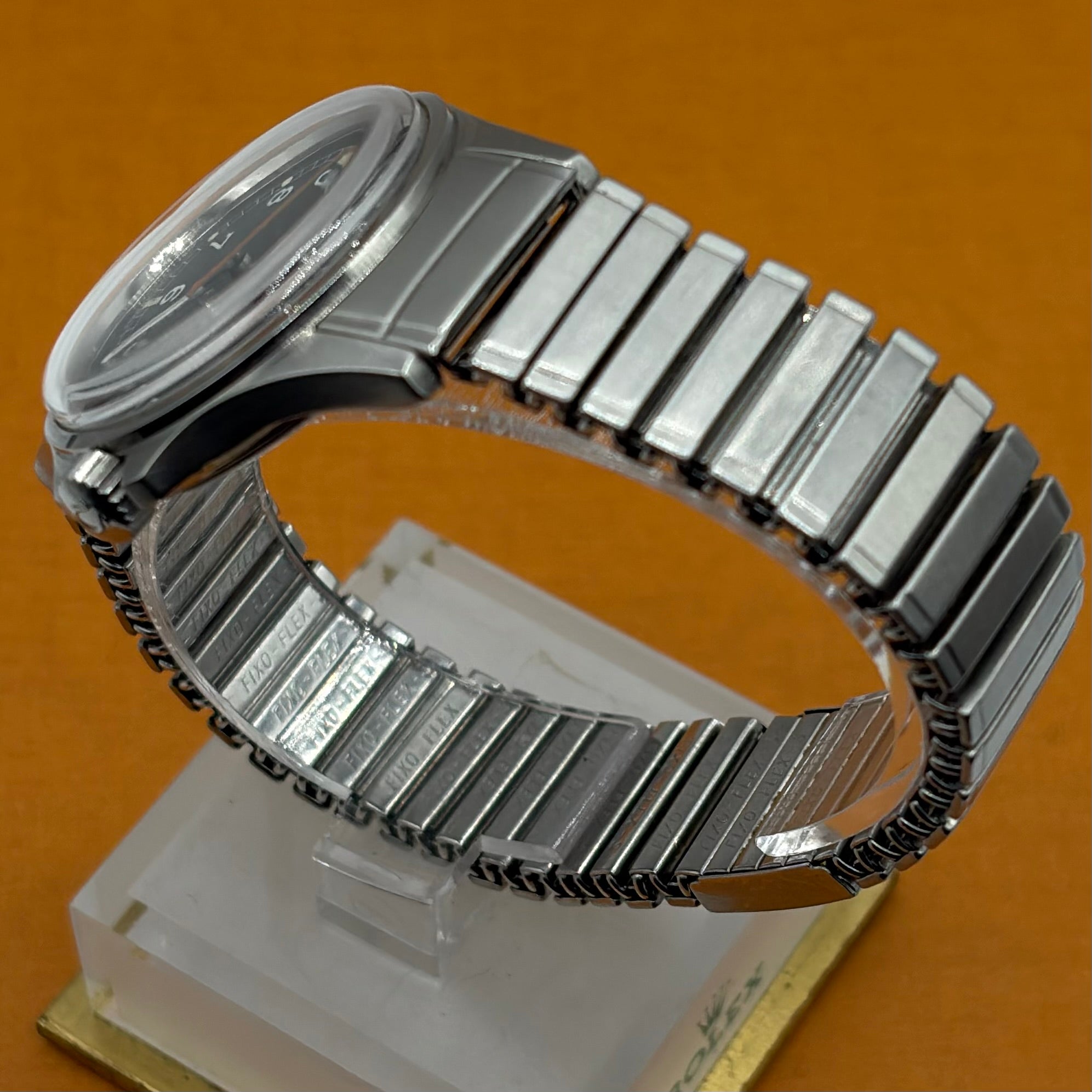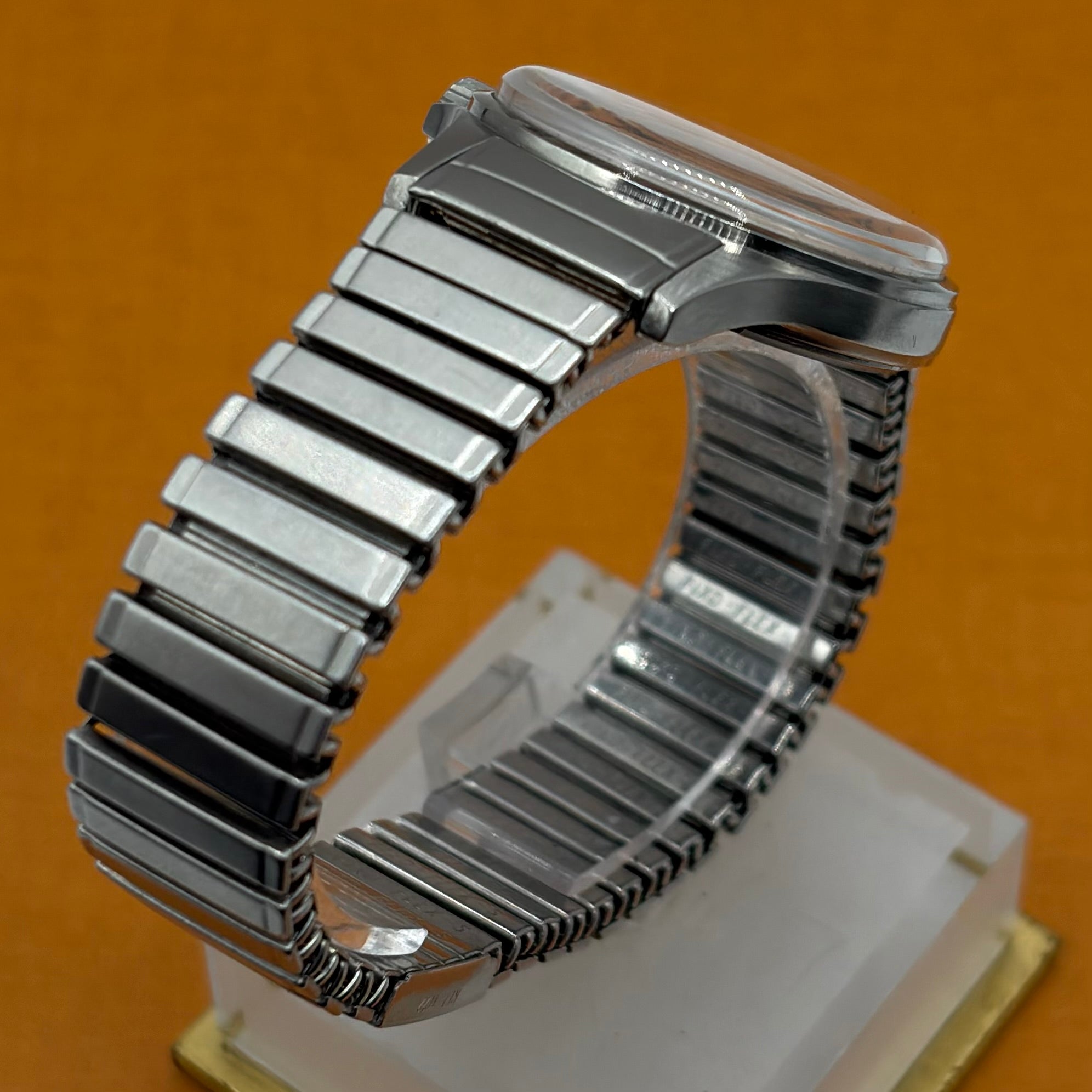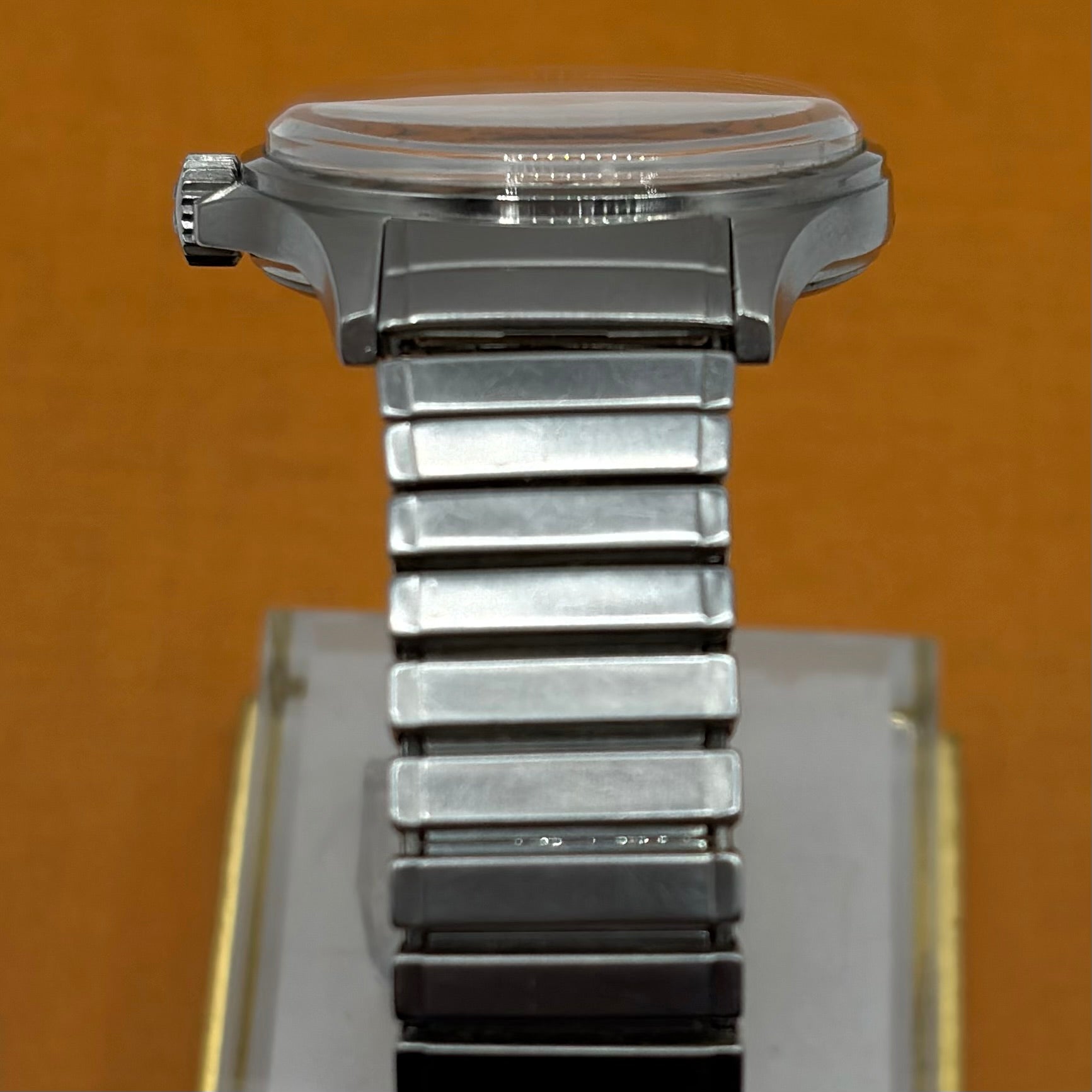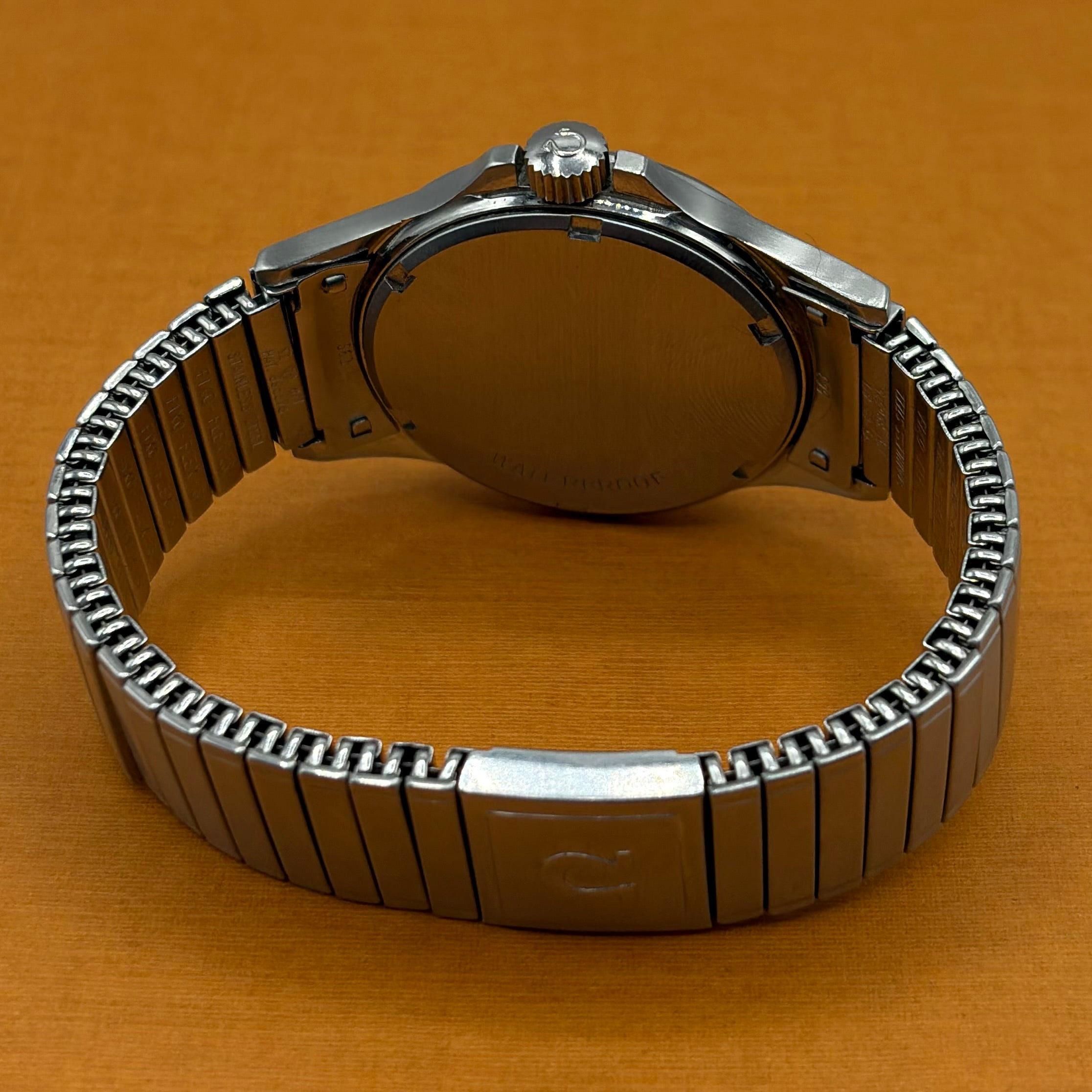 The Omega Genève Admiralty Ref. 165.038 is a distinctive vintage wristwatch, powered by the reliable and accurate Omega Calibre 552. The 35mm stainless steel case with integrated crown guards is paired with the original Omega 'Fixo-Flex' expandable bracelet with signed Omega clasp. The matte dial with orange seconds hand (matching the anchor and reminiscent of the 'Ultraman' Speedmasters) is both charming and extremely legible. The “Admiralty” anchor motif on the dial is a reference to Omega's long history with waterproof watches, including ones issued to Royal Navy divers and special forces. A much rarer alternative to the Rolex Explorer 1016 at a fraction of the price, this is a great choice for the man looking for a high-quality, no-nonsense, reasonably priced vintage watch.