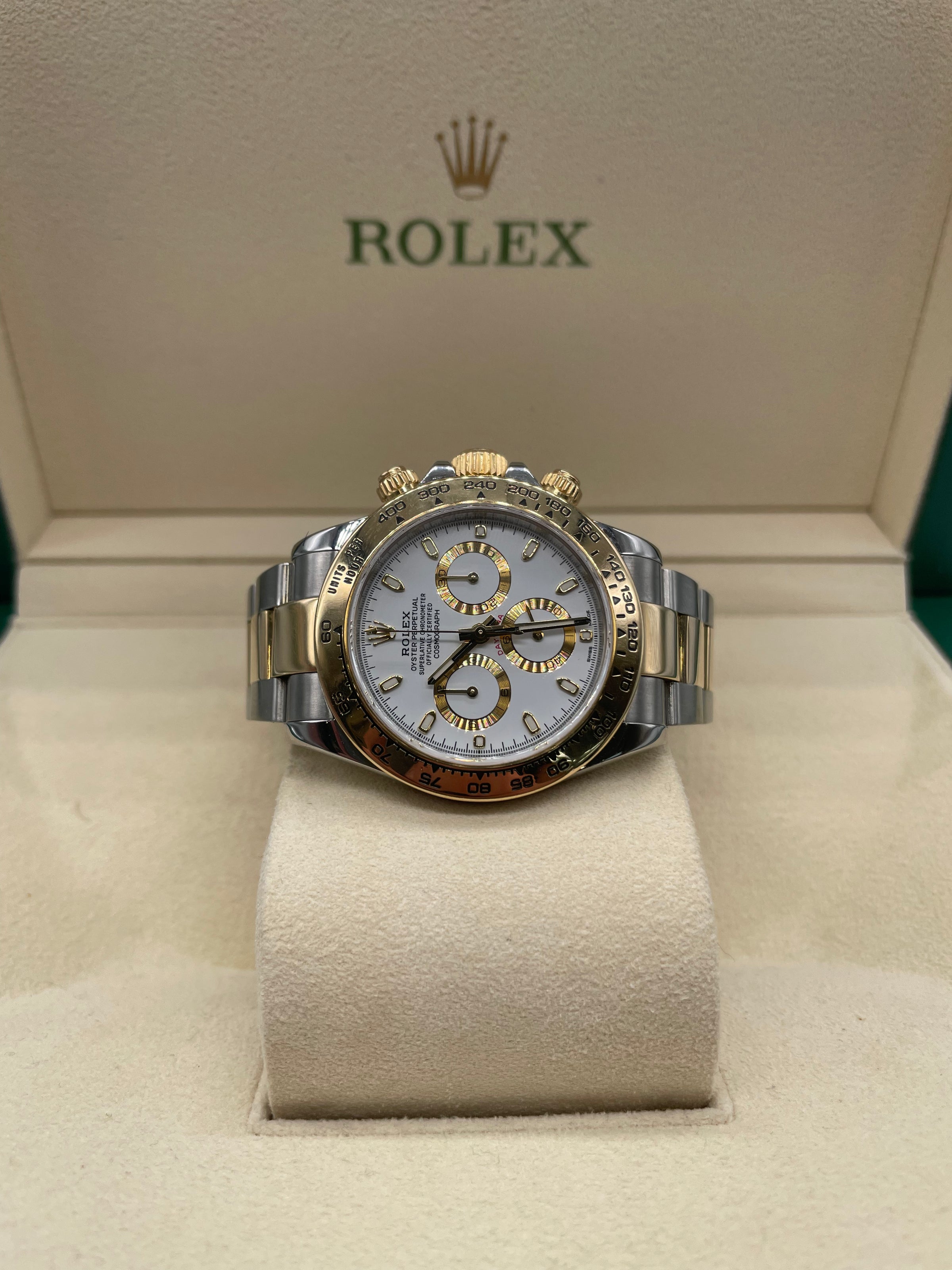 This Rolex cosmograph Daytona features a 40mm stainless steel case, tachymetric scale on its 18k yellow gold bezel, white dial with gold sub dials, 18k yellow gold screw down crown and chronograph pushers and a 18k yellow gold and oyster steel bracelet. This Rolex contains a calibre 4130 automatic movement with chronograph function and 72 hour power reserve.