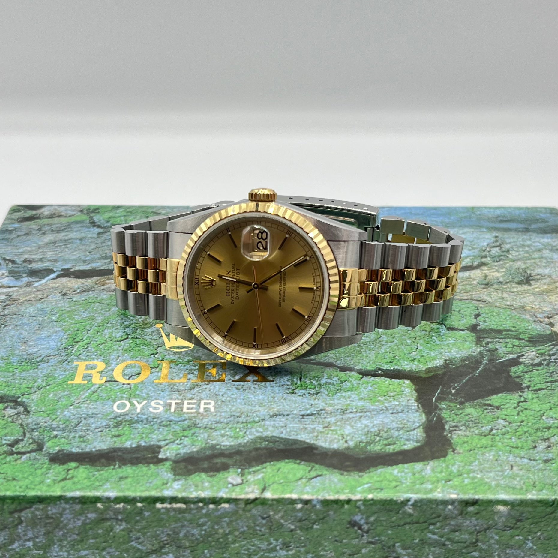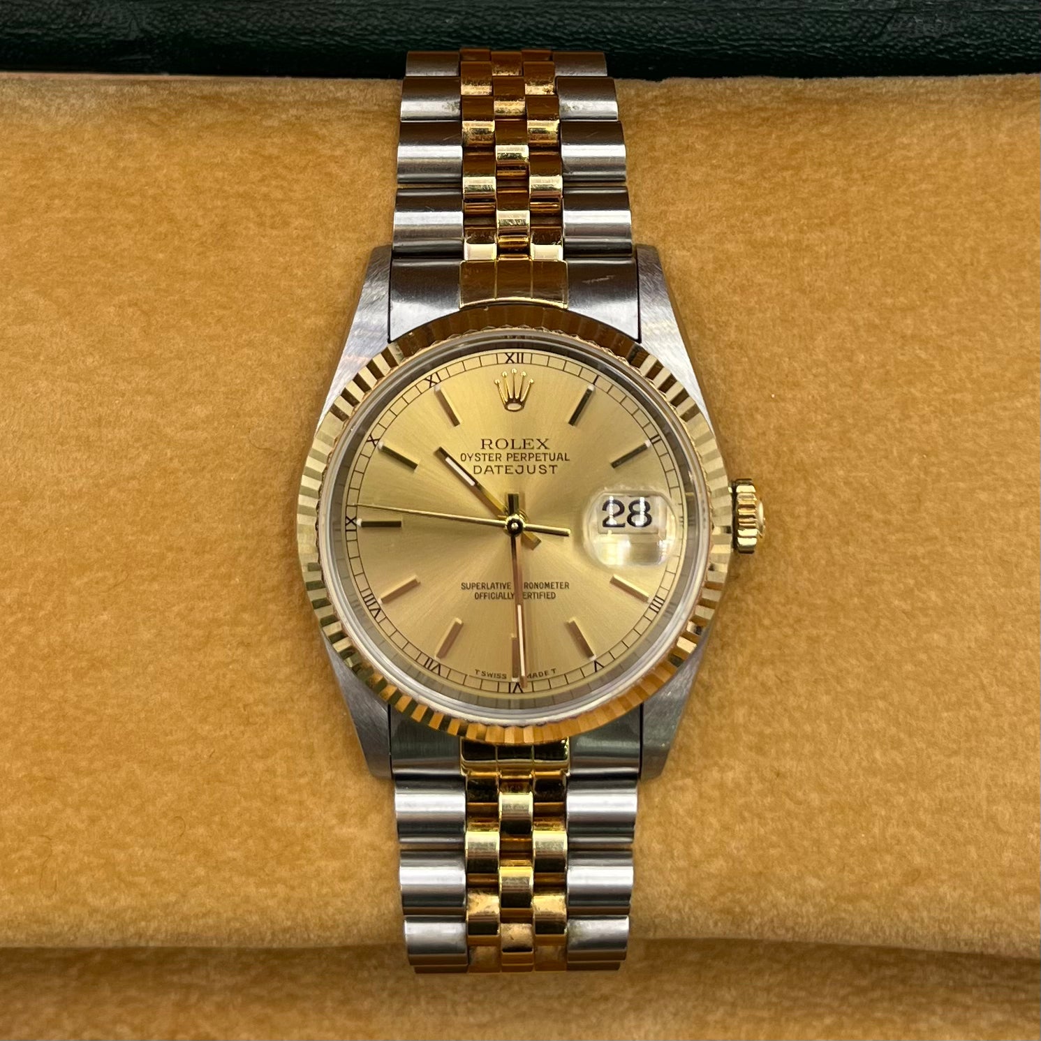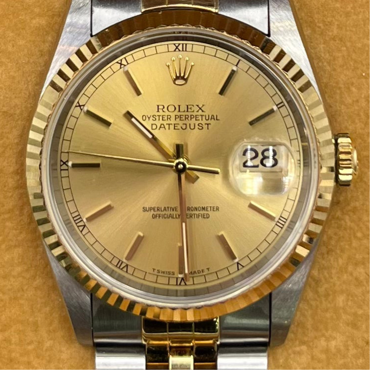 Key Product Information: The Rolex Datejust ref.16233 is a paragon of timeless sophistication, featuring a striking champagne dial set within a 36mm stainless steel and 18K yellow gold case. The watch is distinguished by its elegant fluted bezel and the luxurious two-tone Jubilee bracelet, which provides a comfortable and stylish fit. It is equipped with gold-toned index markers, a date function at the 3 o'clock position with a cyclops lens for easy reading, and is powered by Rolex's Calibre 3135 automatic movement known for its precision and reliability.