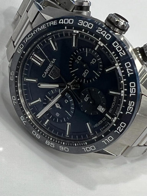 Tag Heuer Carrera 2021 chronograph. A sporty elegant TAG Heuer Carrera with a 44-mm case in fine-brushed, polished steel, blue dial, and steel H-shape bracelet. Luxury and technicity at a single stroke, with our in-house Heuer 02 automatic movement.