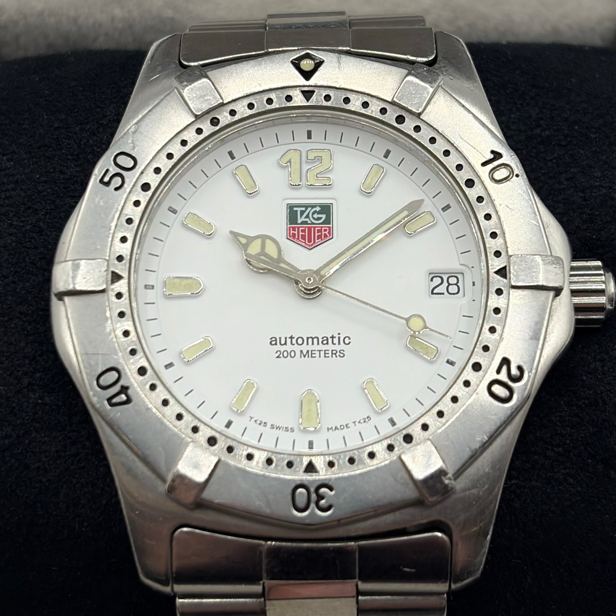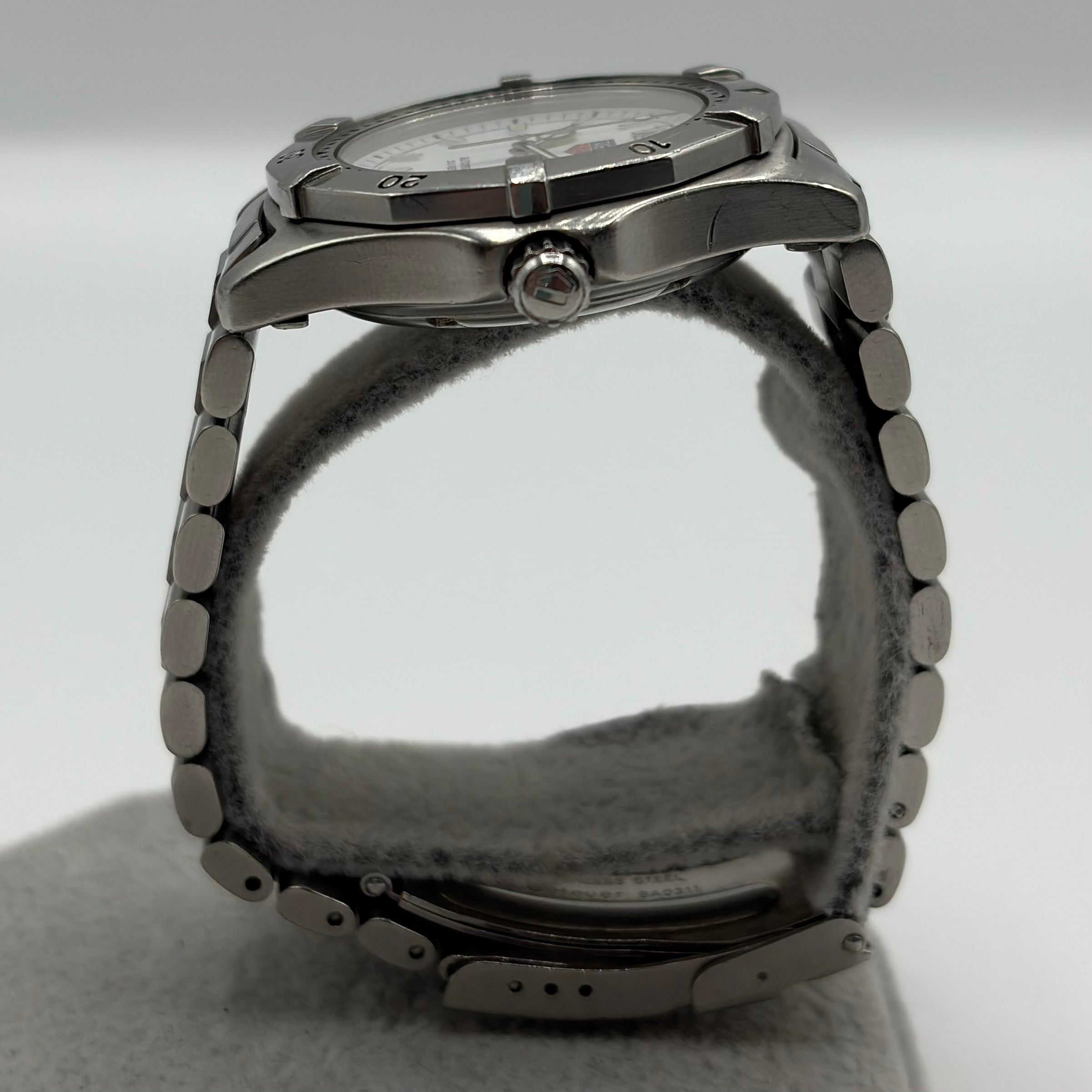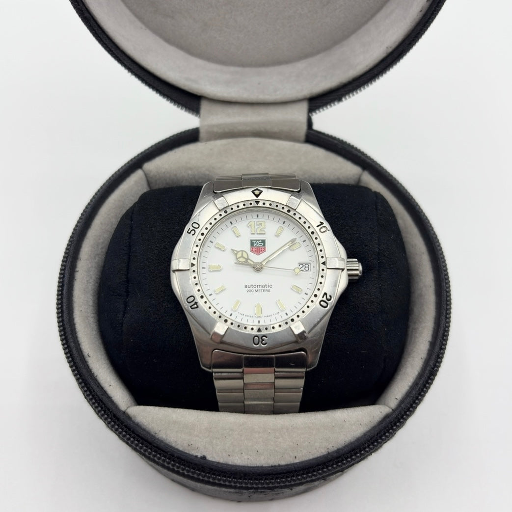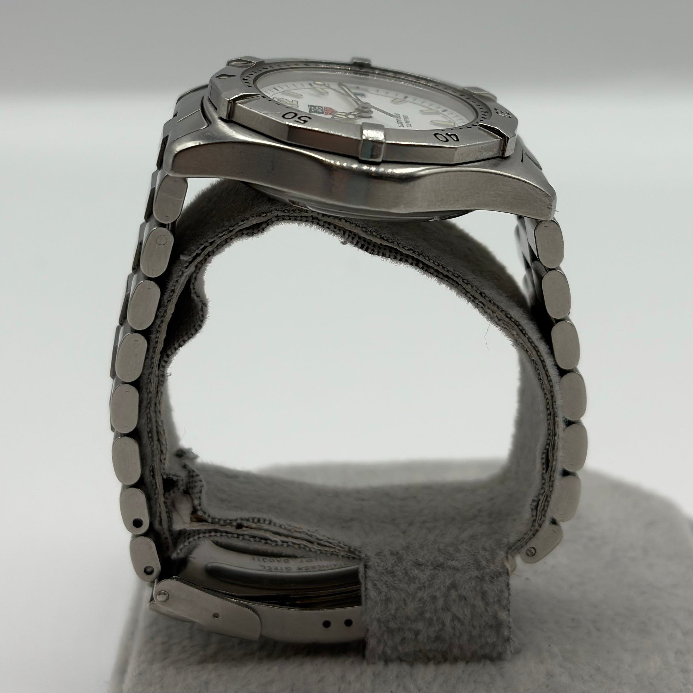 The TAG Heuer Professional 2000 WK2110 is a robust diver’s watch that perfectly blends sporty utility with refined style. It features a 37 mm stainless steel case with a unidirectional rotating bezel, delivering both durability and functionality. The clean white dial offers excellent legibility with luminous hour markers, a Mercedes-style hour hand, and a date window at 3 o’clock. Designed for professional use, it is water-resistant to 200 metres and equipped with a screw-down crown and caseback. Powered by a reliable Swiss automatic movement, this model ensures precision timekeeping. The solid stainless steel bracelet with flip-lock clasp provides security and comfort for everyday wear.