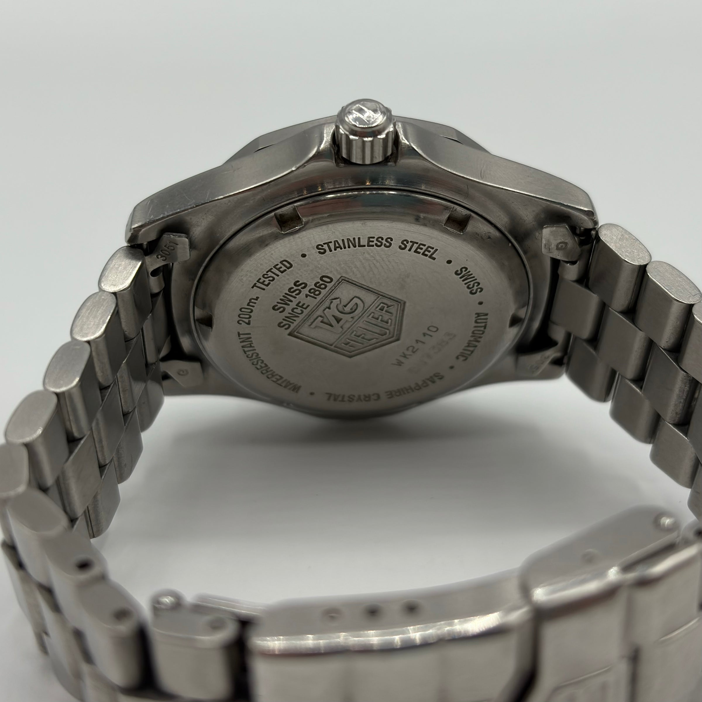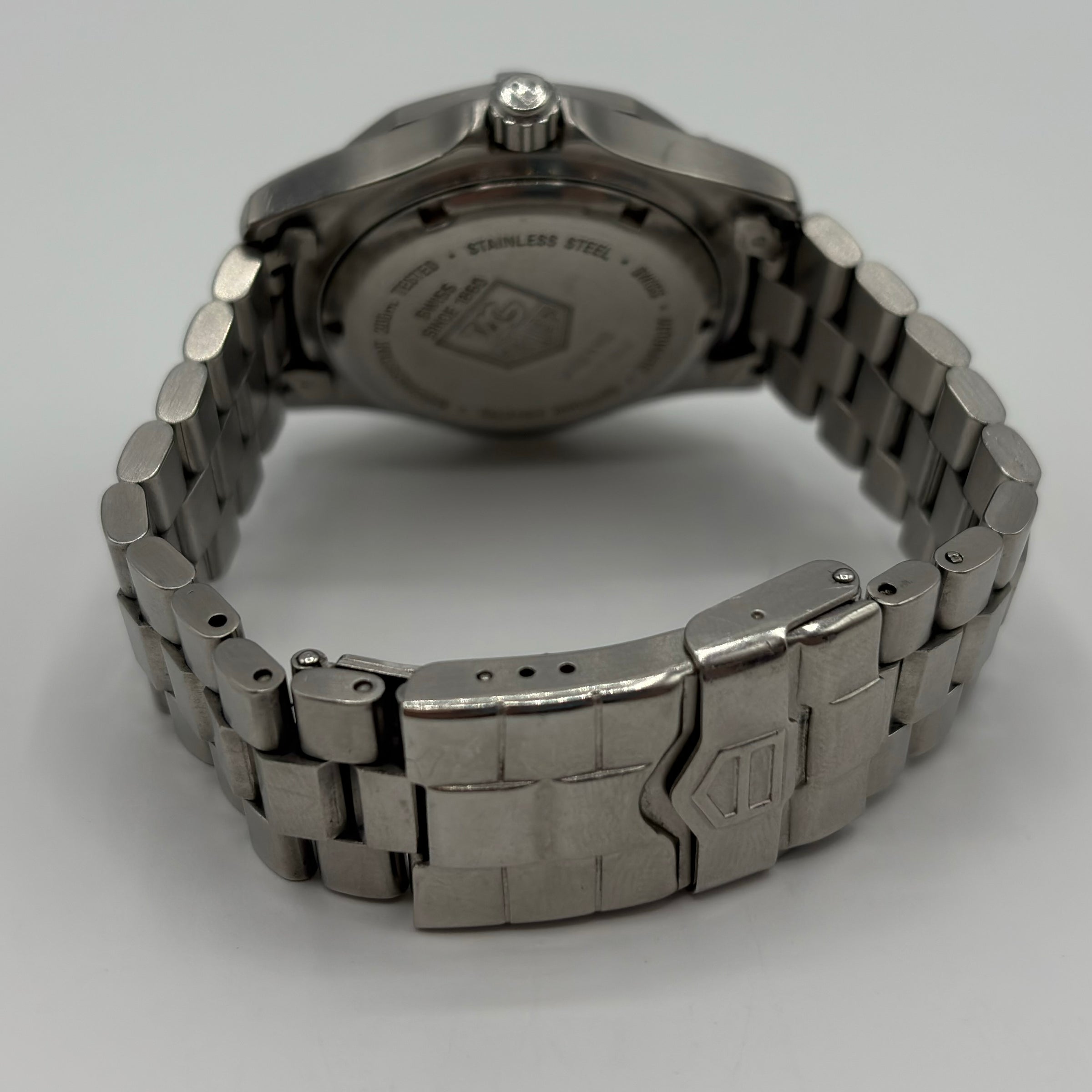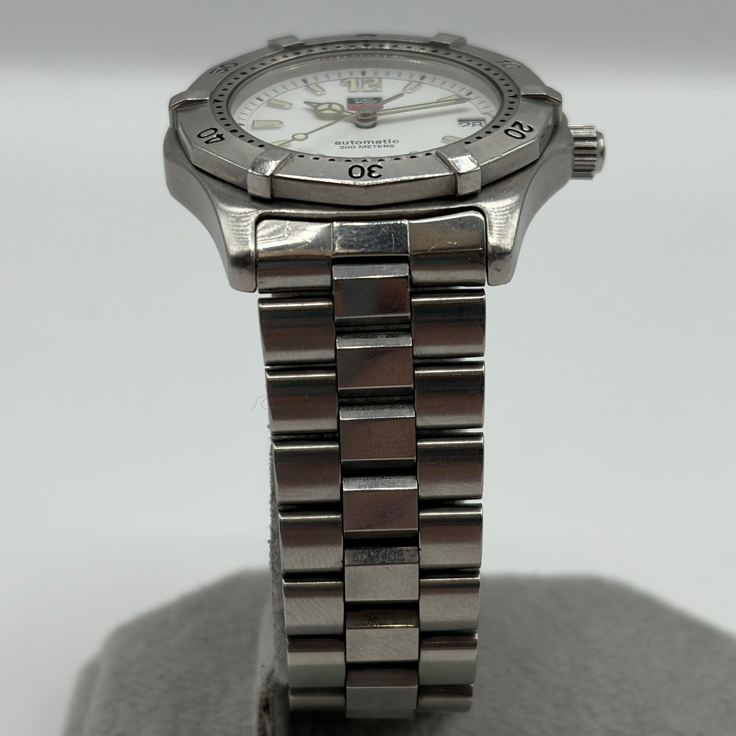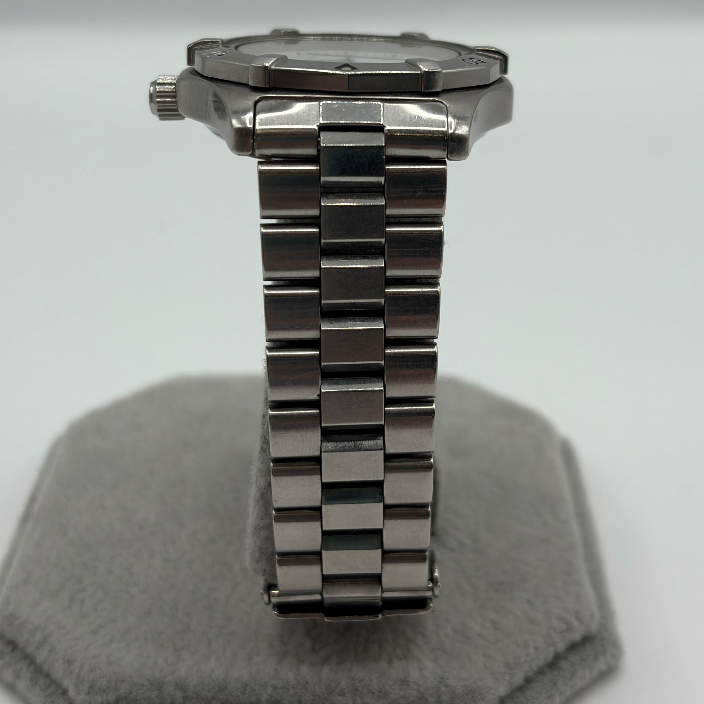 The TAG Heuer Professional 2000 WK2110 is a robust diver’s watch that perfectly blends sporty utility with refined style. It features a 37 mm stainless steel case with a unidirectional rotating bezel, delivering both durability and functionality. The clean white dial offers excellent legibility with luminous hour markers, a Mercedes-style hour hand, and a date window at 3 o’clock. Designed for professional use, it is water-resistant to 200 metres and equipped with a screw-down crown and caseback. Powered by a reliable Swiss automatic movement, this model ensures precision timekeeping. The solid stainless steel bracelet with flip-lock clasp provides security and comfort for everyday wear.