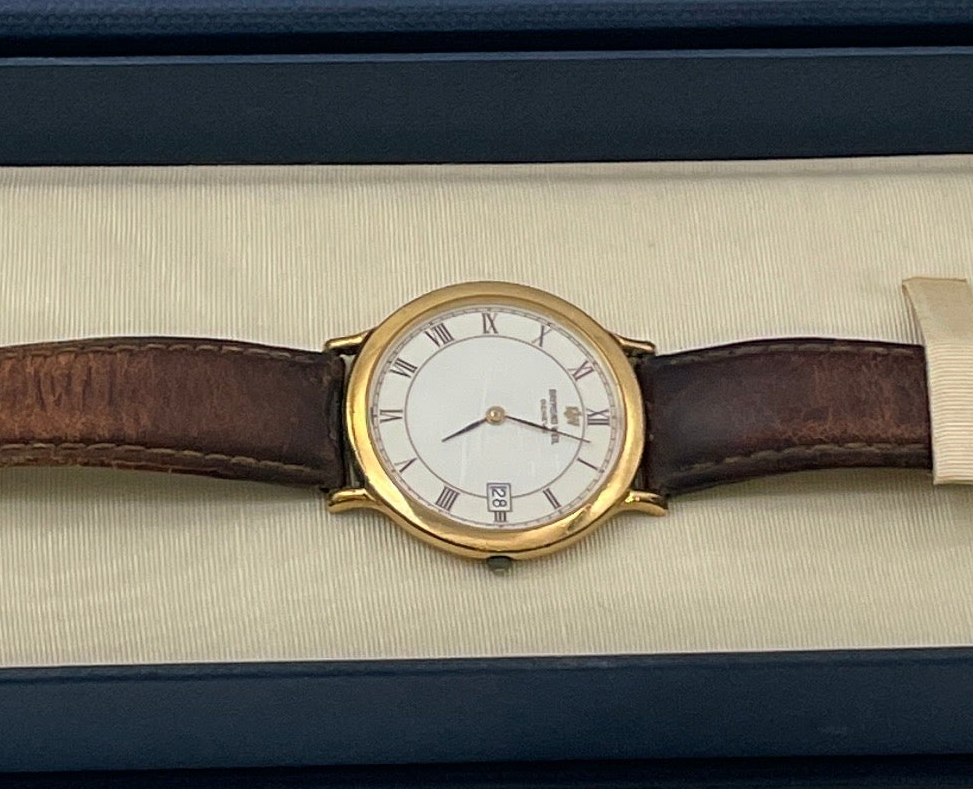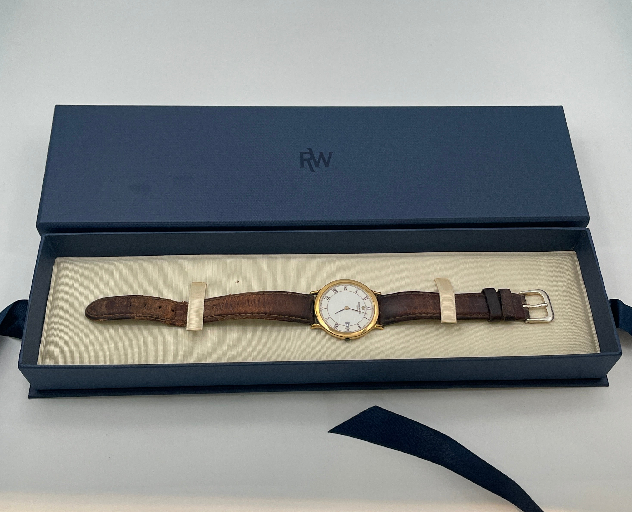 A classic style men's dress watch with a plain cream / white dial with Roman Numeral hour markers. There is a date window located on the three o'clock position and there is an hour and minute hands set in the centre of the watch dial. This watch is 18ct Yellow Gold electroplated, and signs of wear are visible in this particular example. The accompanying leather strap has signs of wear and seems to not be original to the brand mentioned. Approximate dimensions are as follows: Case width: 32mm, Case depth: 5.2 mm, Lug to lug: 34.9mm.