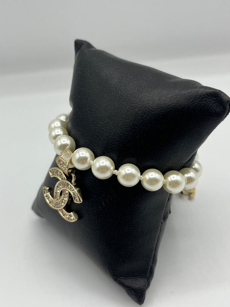 Beautiful Chanel Freshwater Pearl Bracelet with Gold Plated Hardware Featuring the iconic interlocking C Chanel Logo decorated with Cubic Zircona