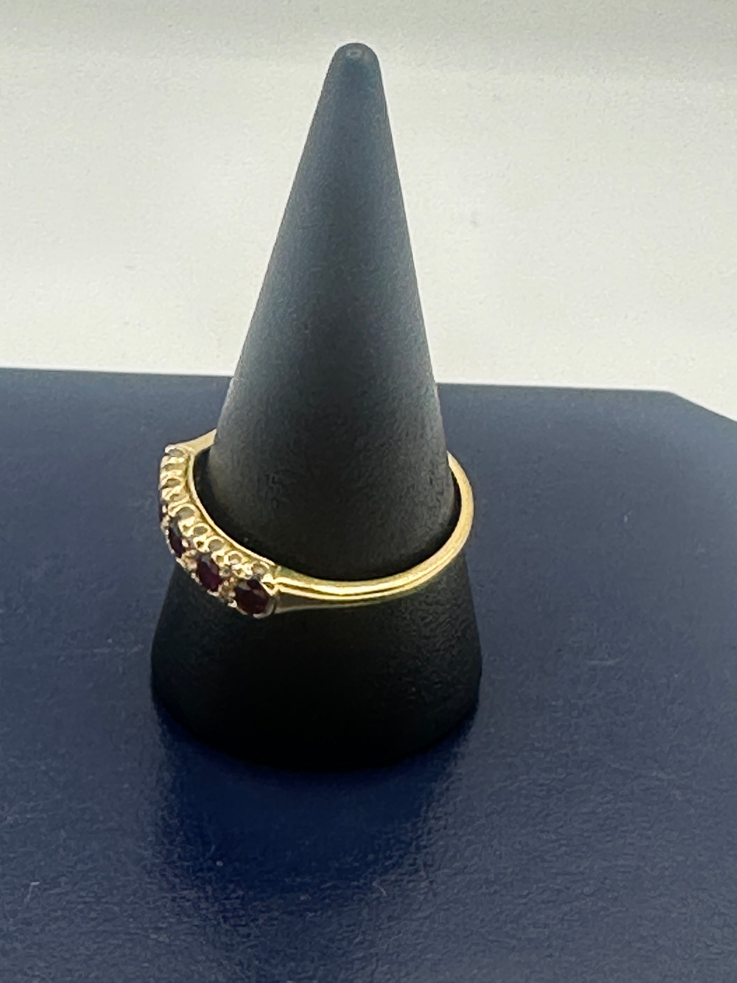 This stunning 18ct yellow gold half eternity ring features an alternating pattern of vibrant rubies and sparkling round brilliant-cut diamonds, each securely set in a classic claw and pavie design. The deep red hues of the rubies contrast beautifully with the radiant brilliance of the diamonds, creating a timeless and elegant piece that exudes sophistication. Crafted in rich 18ct yellow gold, the band offers both durability and luxurious warmth, making it a perfect choice for daily wear or as a meaningful symbol of love and commitment.