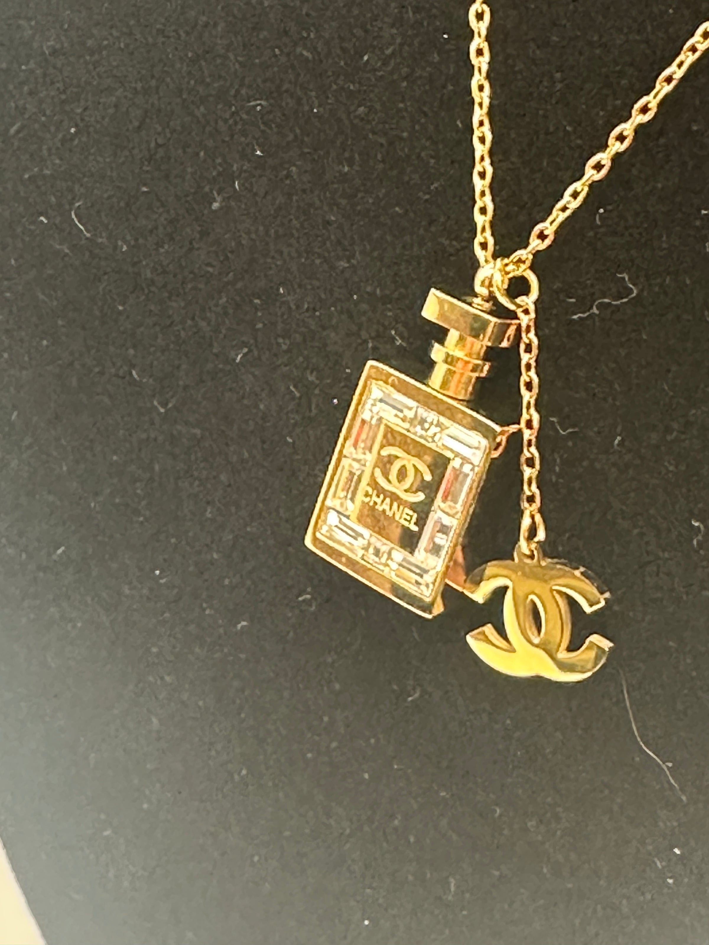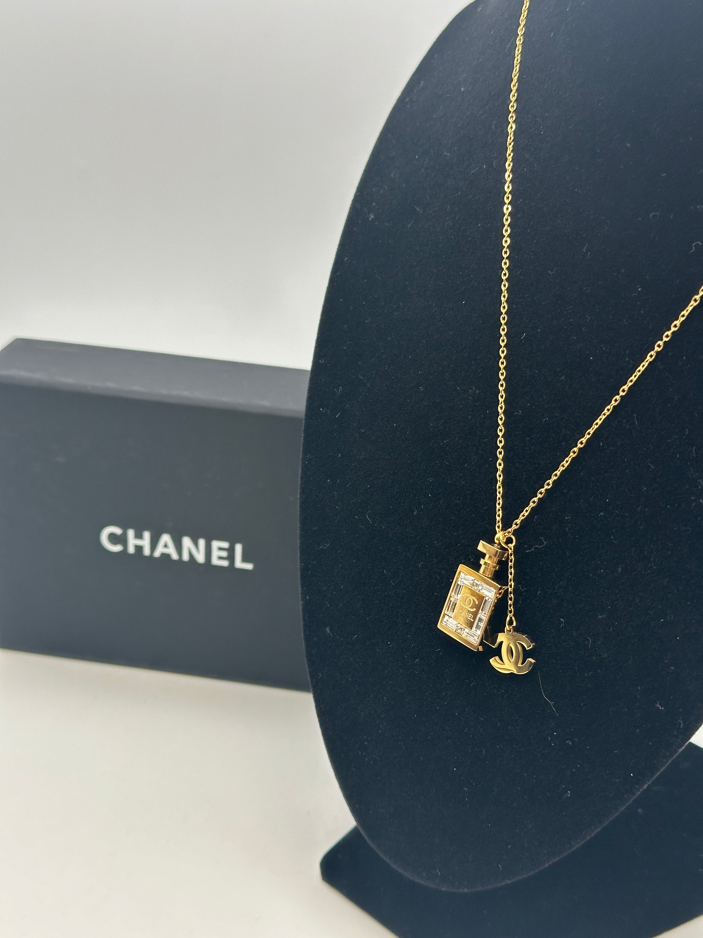 • Materials & Design: This exquisite gold-plated Chanel necklace features a pendant shaped like the iconic Chanel No. 5 perfume bottle, adorned with shimmering cubic zirconia crystals and the signature interlocking 'CC' logo. The design reflects Chanel's commitment to comfort, geometry, and clean lines, embodying timeless elegance.
