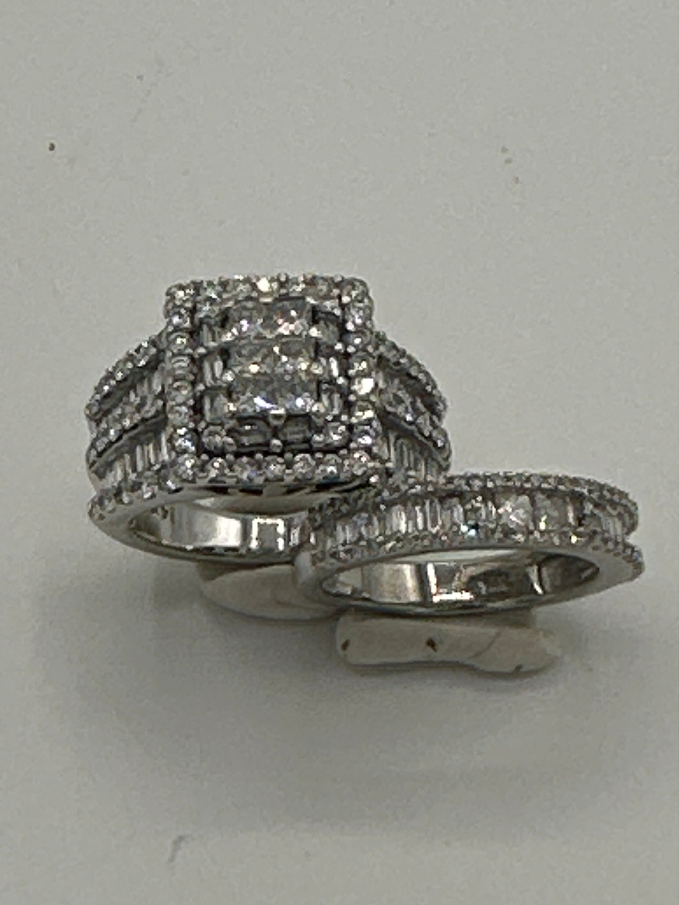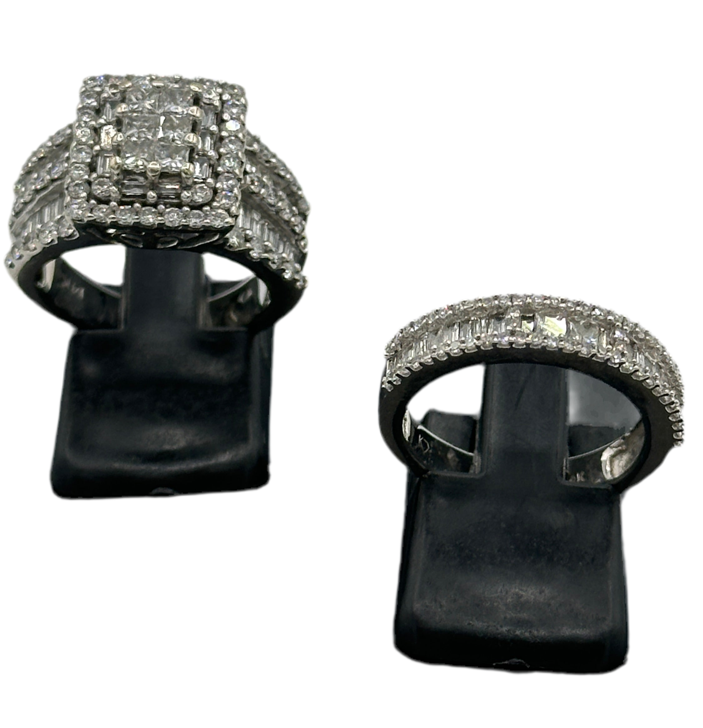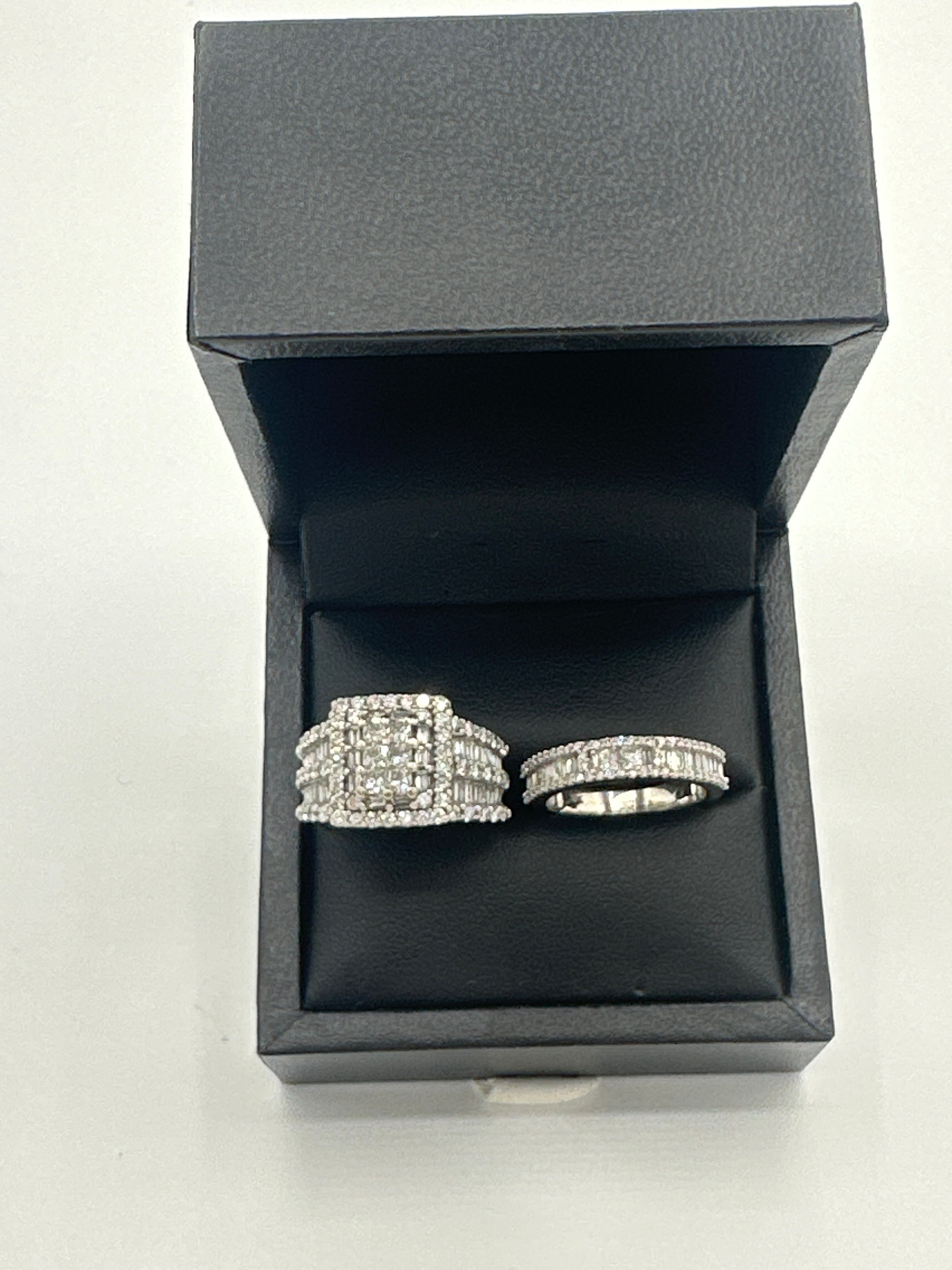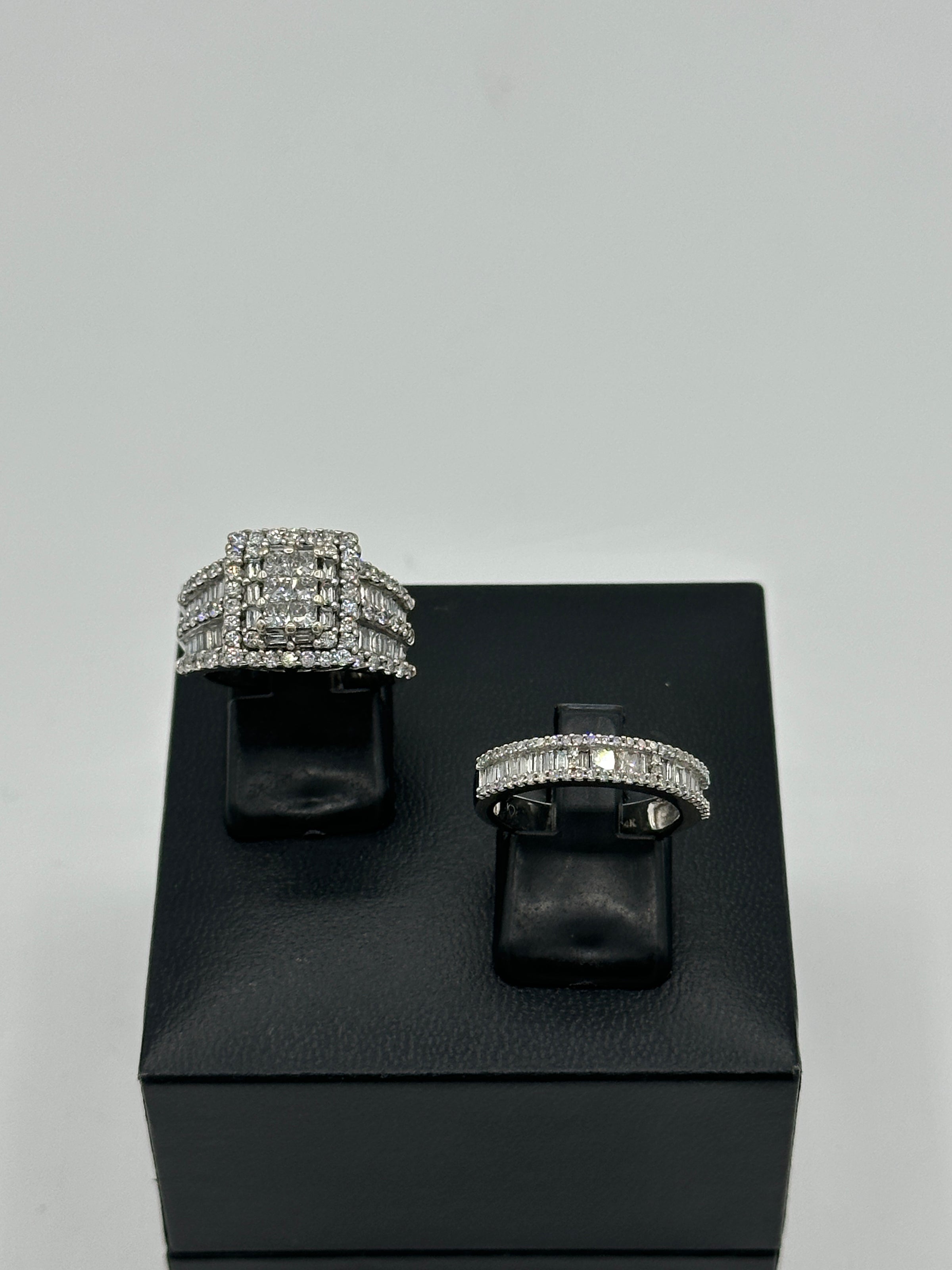 The Kobelli 2.64 Carat Natural Diamond Square Cluster Bridal Set is a stunning ensemble crafted in 14ct white gold. The engagement ring showcases a central cluster of princess-cut diamonds, meticulously set to create the illusion of a singular, substantial stone. This captivating centrepiece is encircled by a halo of baguette and round-cut diamonds, enhancing its brilliance. The wide band features three rows of round-cut diamonds, separated by two rows of channel-set, baguette-cut diamonds, adding texture and flair to the ring. The accompanying wedding band is designed to complement the engagement ring, echoing the same intricate detailing and diamond arrangement, resulting in a harmonious and opulent bridal set.