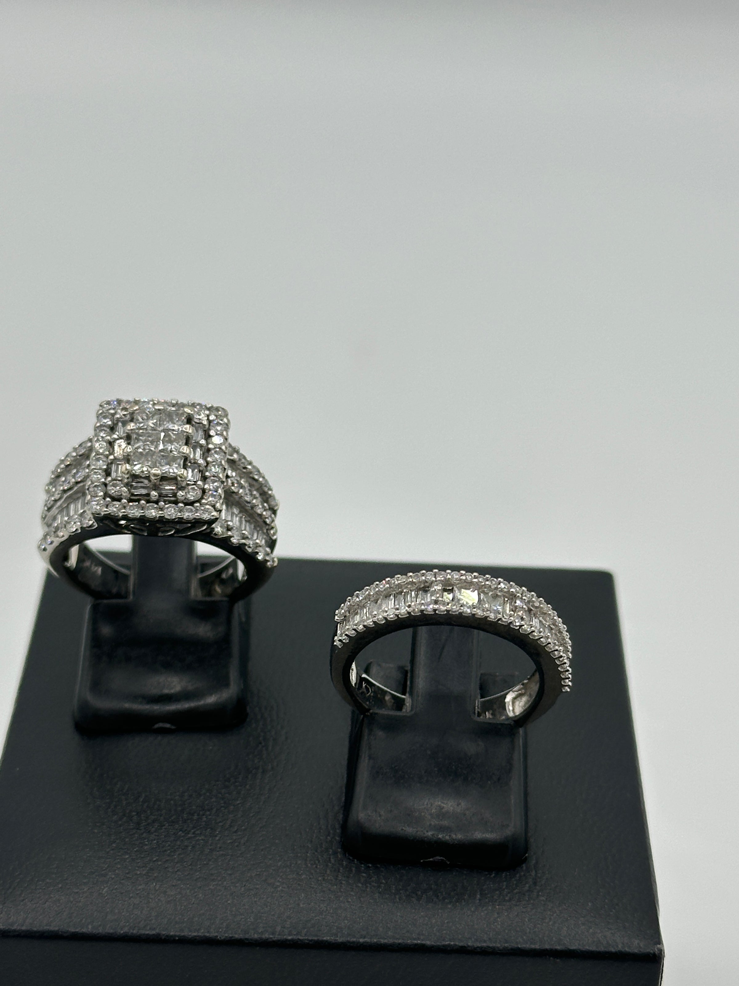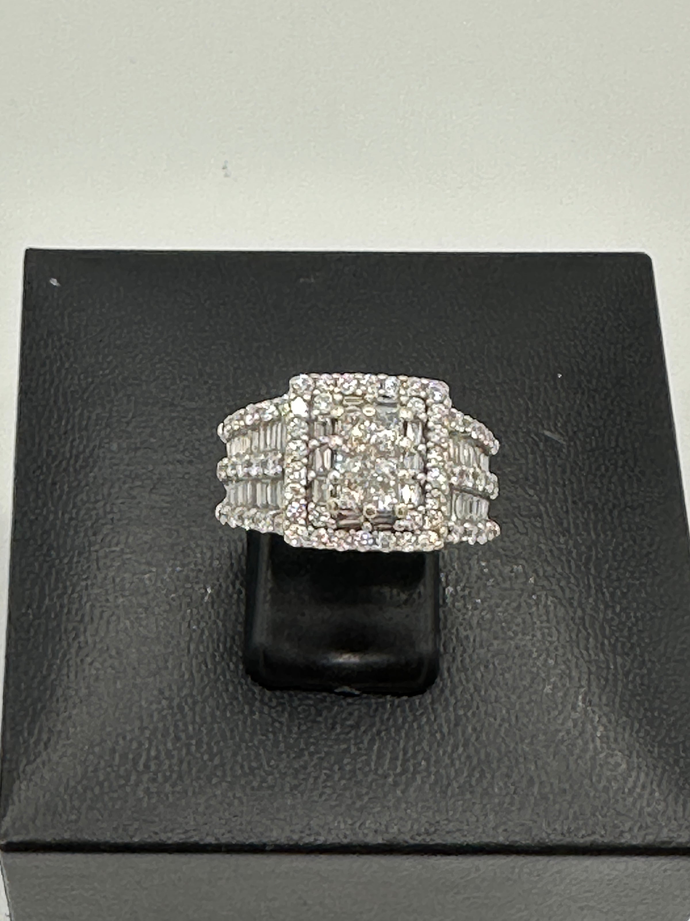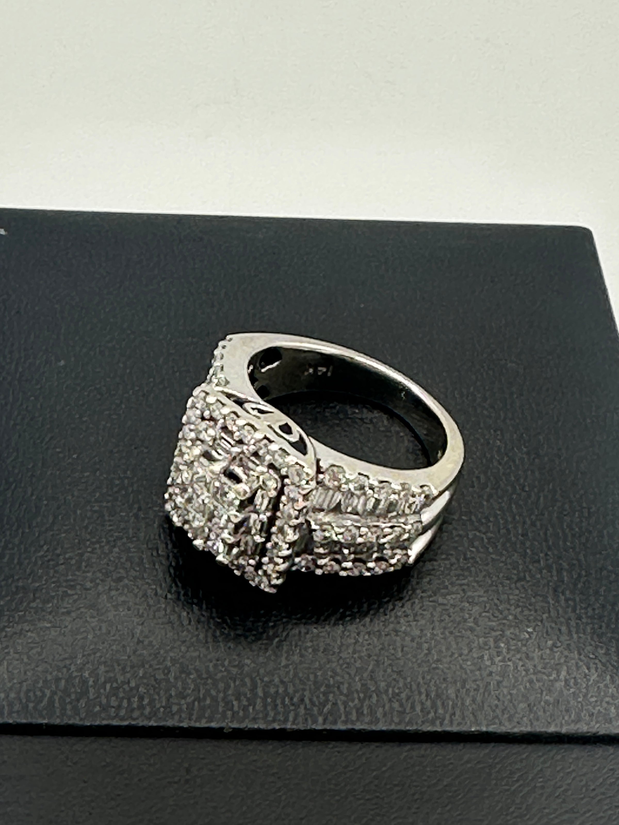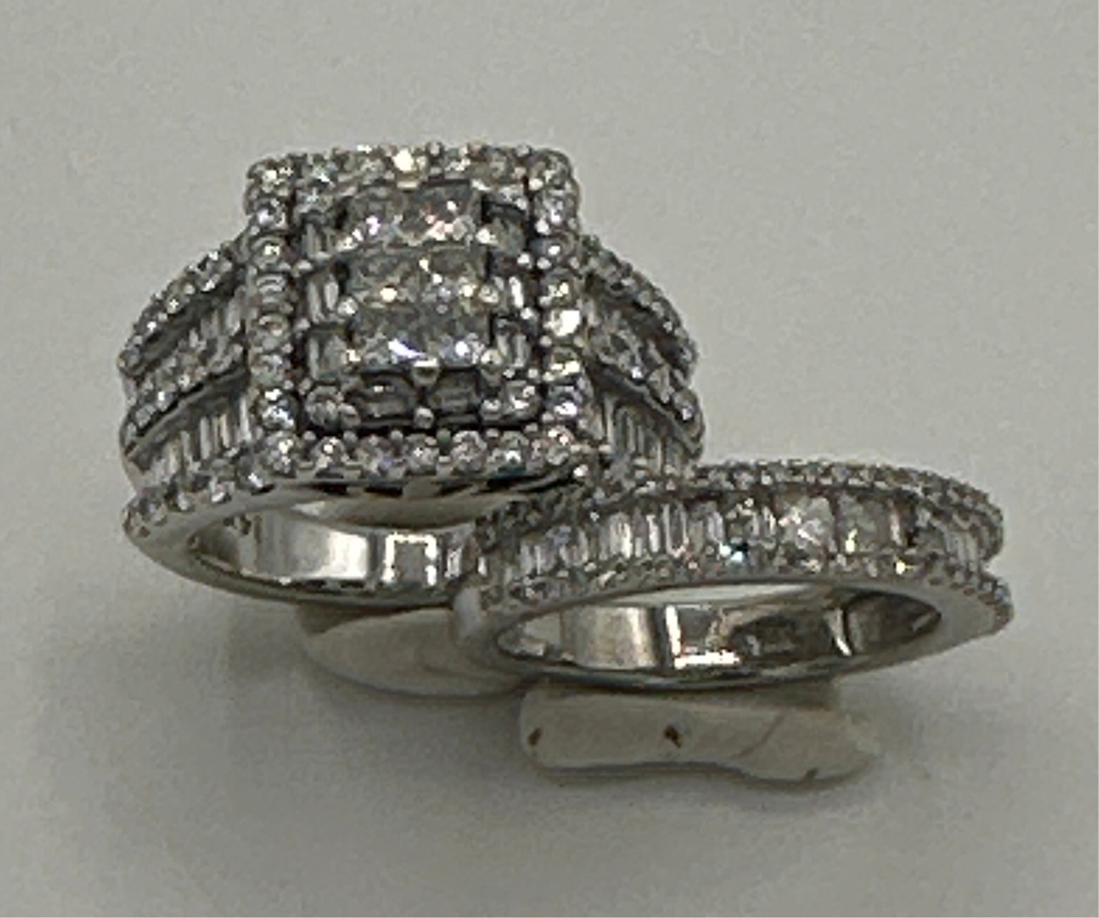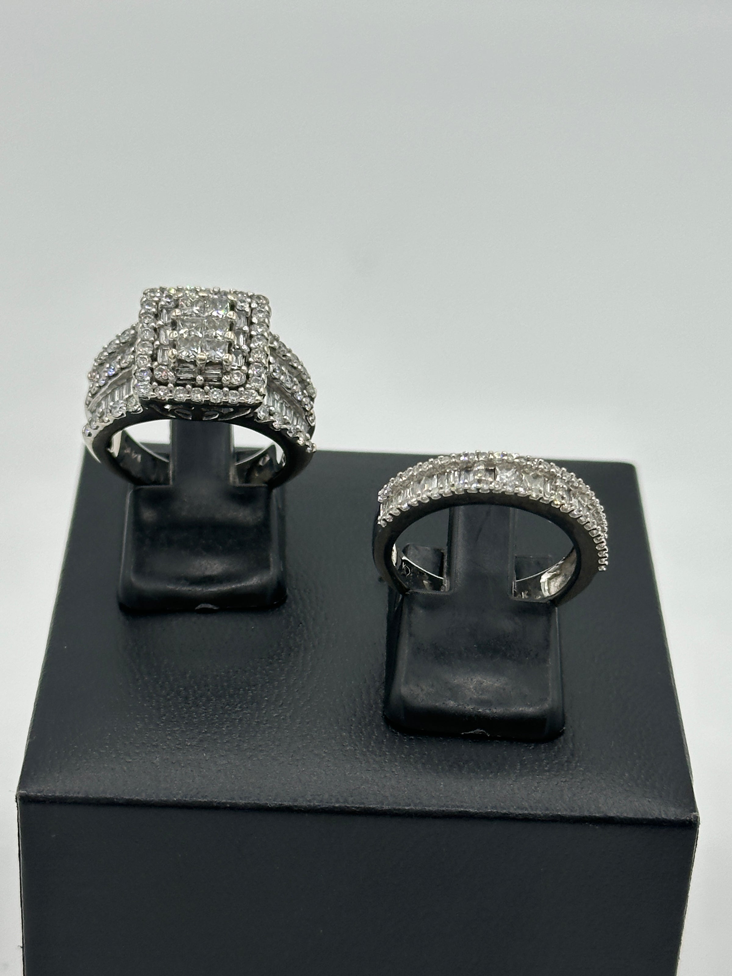 The Kobelli 2.64 Carat Natural Diamond Square Cluster Bridal Set is a stunning ensemble crafted in 14ct white gold. The engagement ring showcases a central cluster of princess-cut diamonds, meticulously set to create the illusion of a singular, substantial stone. This captivating centrepiece is encircled by a halo of baguette and round-cut diamonds, enhancing its brilliance. The wide band features three rows of round-cut diamonds, separated by two rows of channel-set, baguette-cut diamonds, adding texture and flair to the ring. The accompanying wedding band is designed to complement the engagement ring, echoing the same intricate detailing and diamond arrangement, resulting in a harmonious and opulent bridal set.