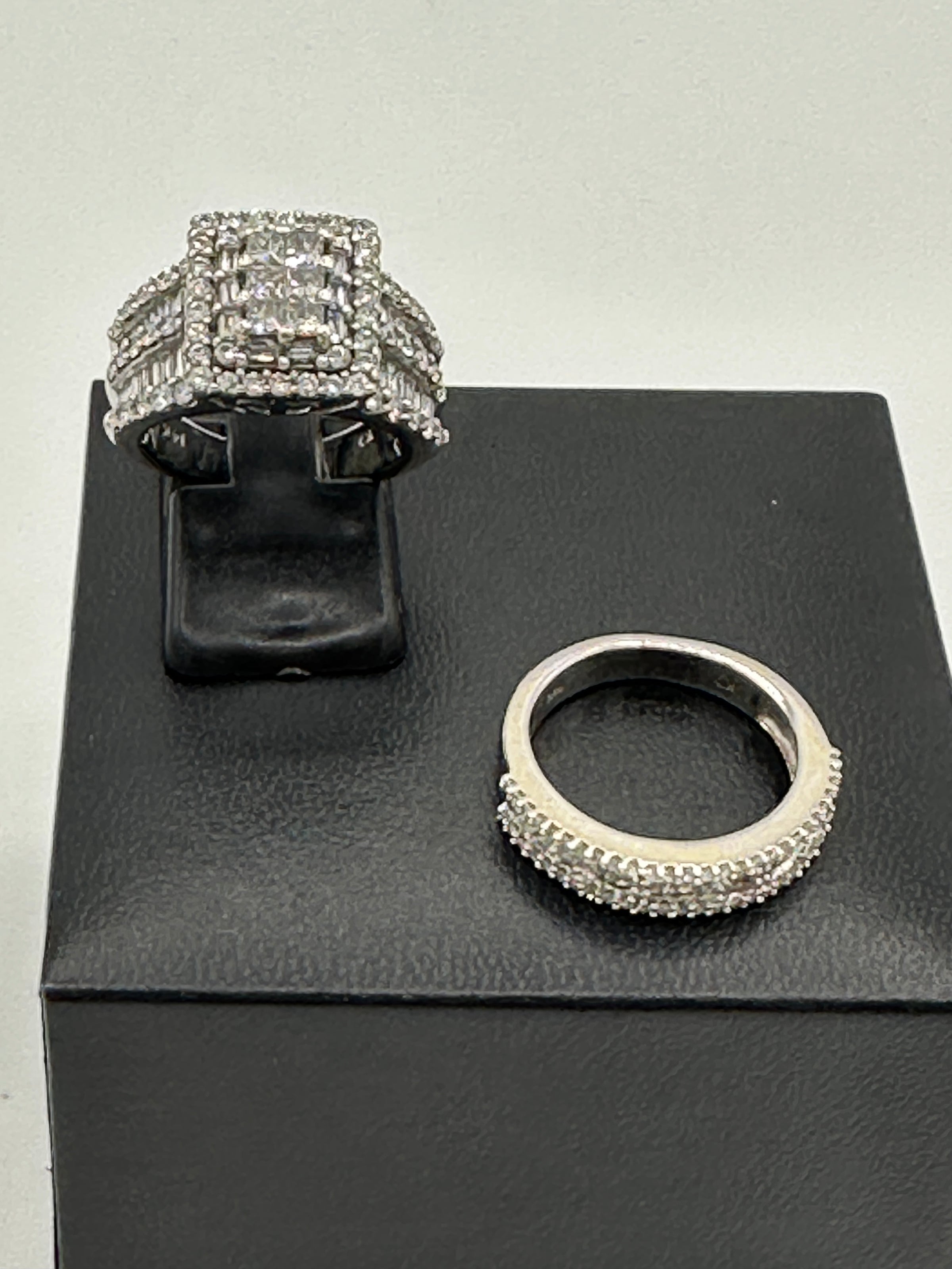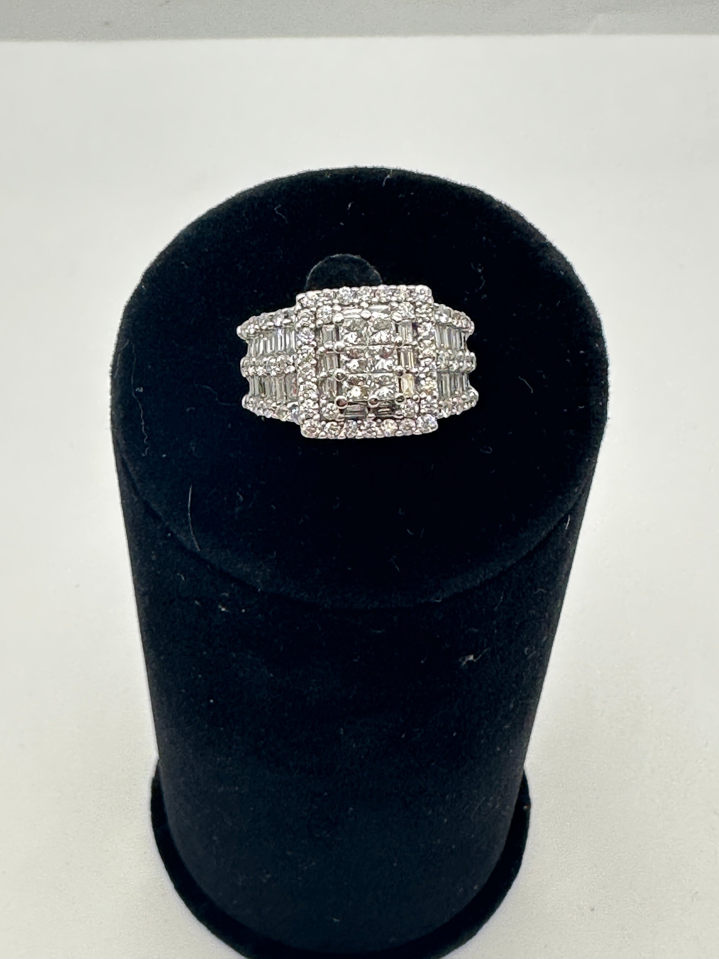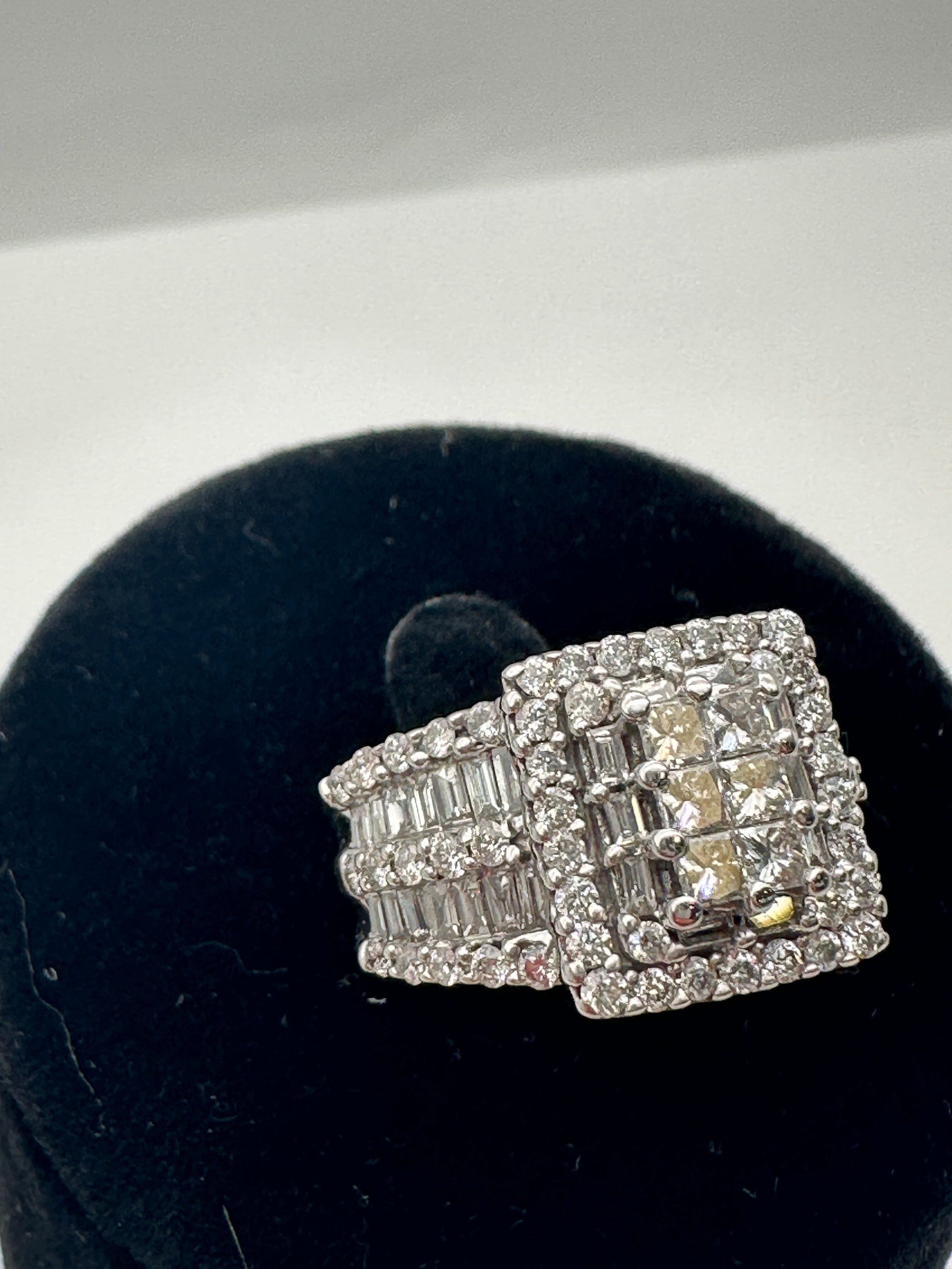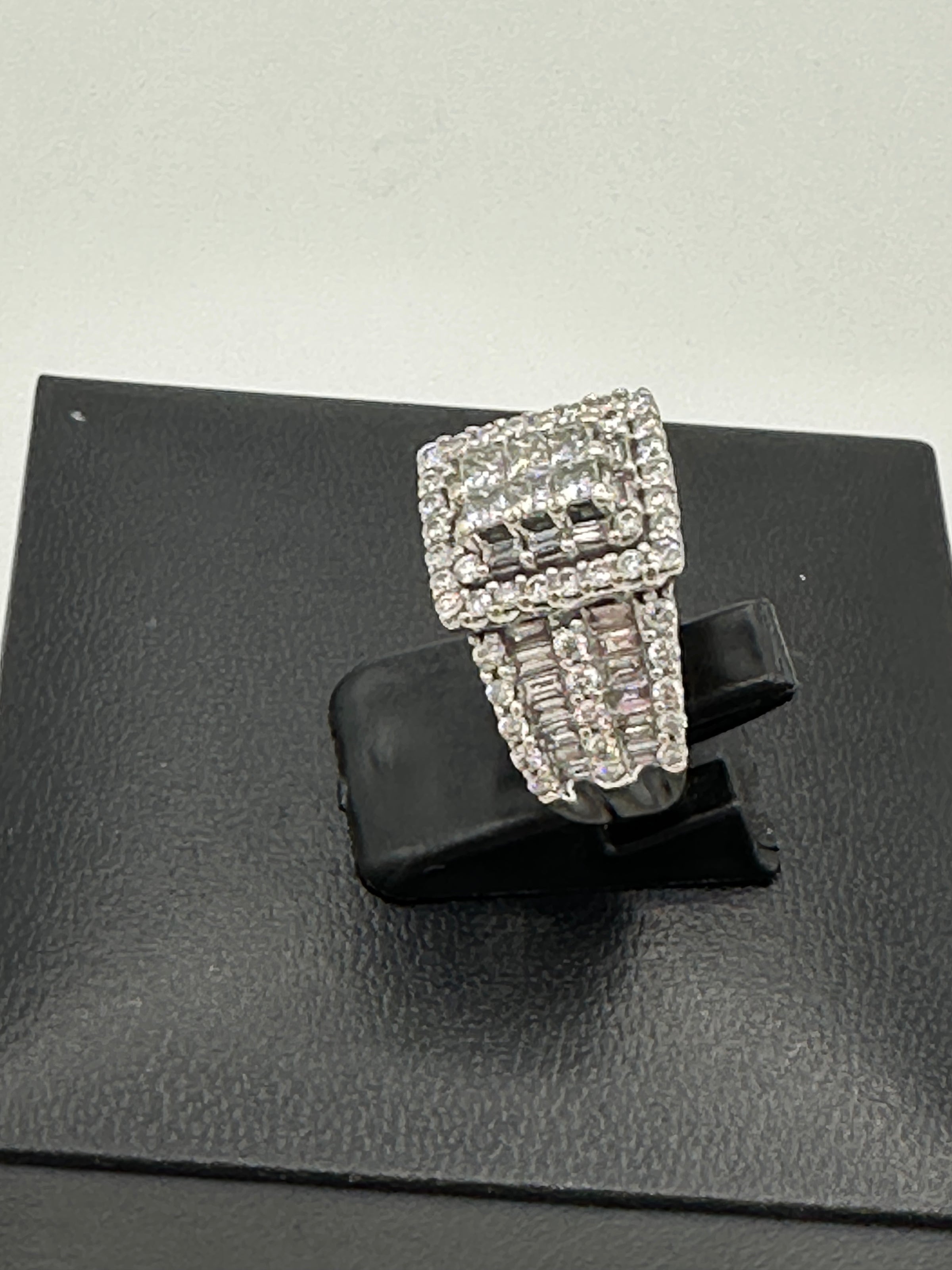 The Kobelli 2.64 Carat Natural Diamond Square Cluster Bridal Set is a stunning ensemble crafted in 14ct white gold. The engagement ring showcases a central cluster of princess-cut diamonds, meticulously set to create the illusion of a singular, substantial stone. This captivating centrepiece is encircled by a halo of baguette and round-cut diamonds, enhancing its brilliance. The wide band features three rows of round-cut diamonds, separated by two rows of channel-set, baguette-cut diamonds, adding texture and flair to the ring. The accompanying wedding band is designed to complement the engagement ring, echoing the same intricate detailing and diamond arrangement, resulting in a harmonious and opulent bridal set.