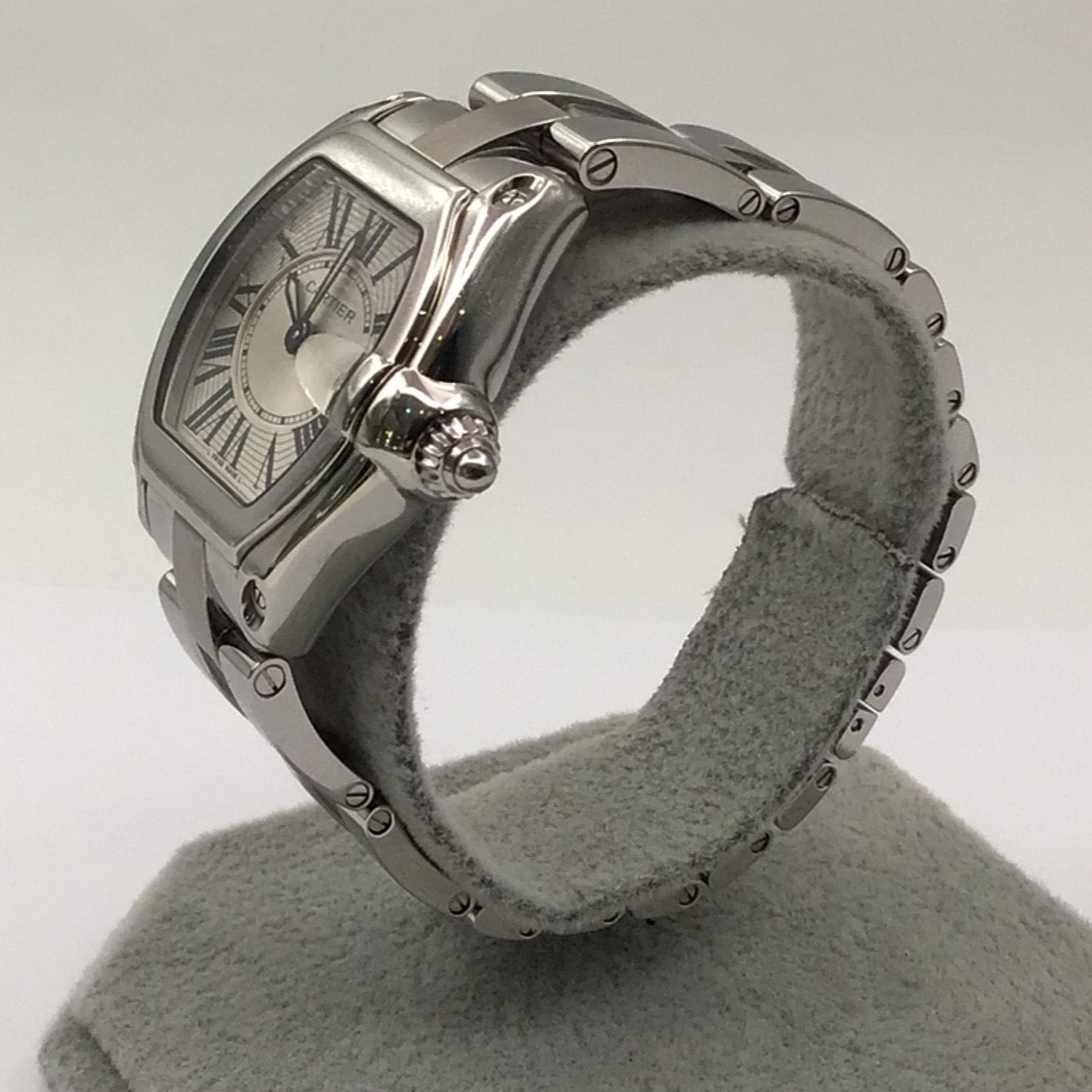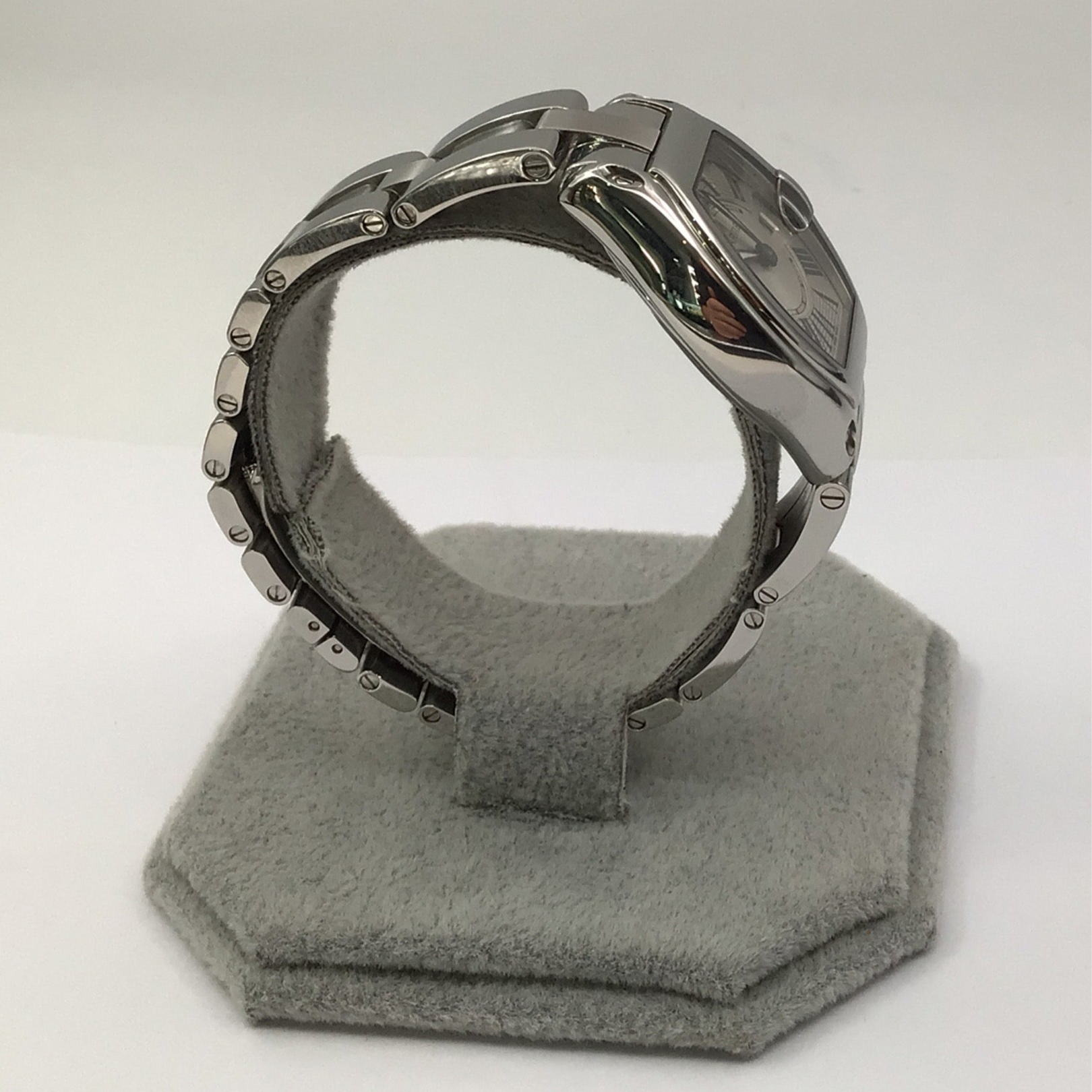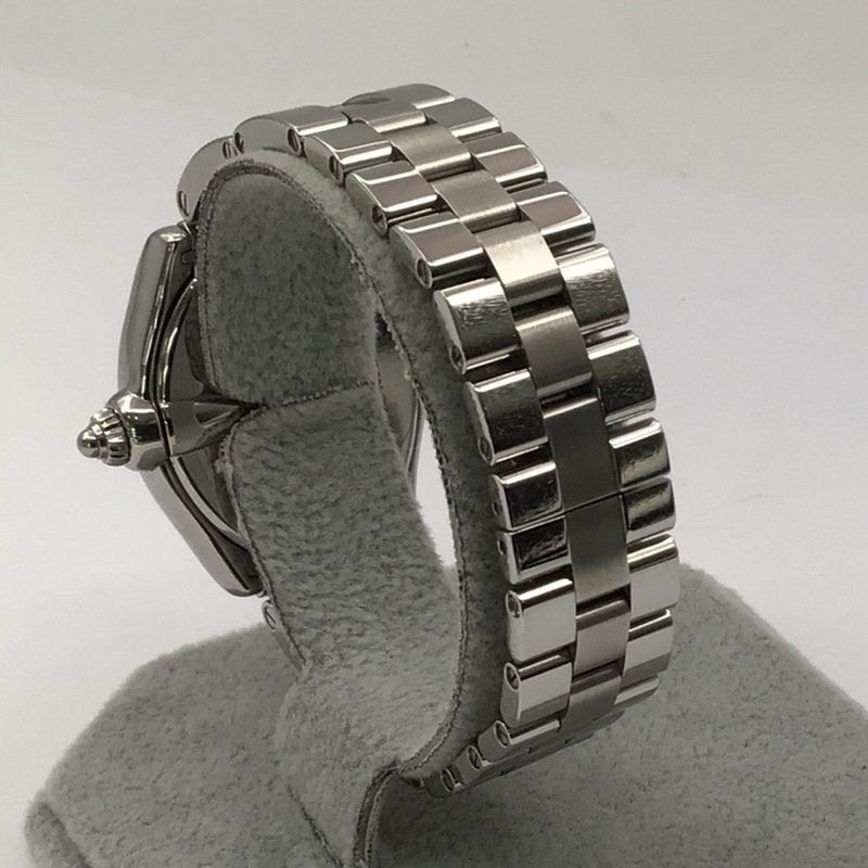 The Cartier Roadster 2675 is a distinguished timepiece that embodies the brand's flair for combining automotive-inspired design with classic watchmaking. This model features a polished stainless steel tonneau-shaped case measuring 31mm in length and 36mm in width, offering a sleek and elegant profile on the wrist. The dial presents a silver sunray effect adorned with bold black Roman numerals, providing a striking contrast for enhanced readability. Luminescent sword-shaped steel hands ensure visibility in various lighting conditions, while the date window at 3 o'clock is magnified by a cyclops lens integrated into the scratch-resistant sapphire crystal. Powered by Cartier's reliable Swiss quartz movement, calibre 688, the watch delivers precise timekeeping. Completing the design is a stainless steel bracelet equipped with a hidden deployment clasp, ensuring both comfort and security. With a water resistance of up to 100 meters (10 ATM), this timepiece is as functional as it is stylish.