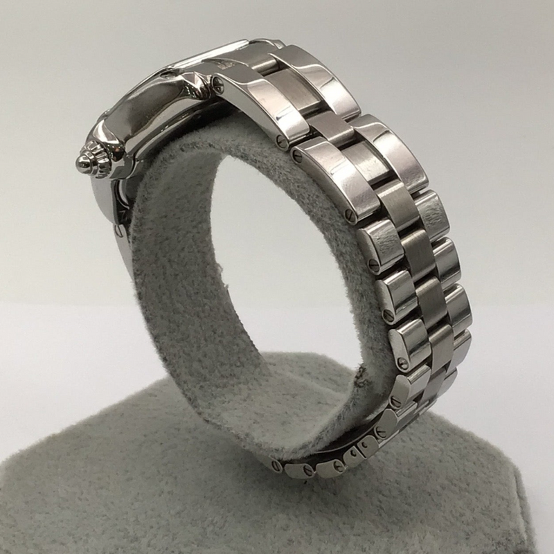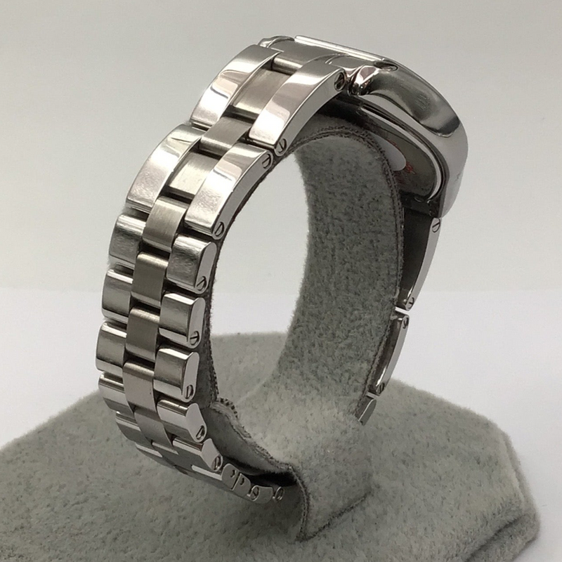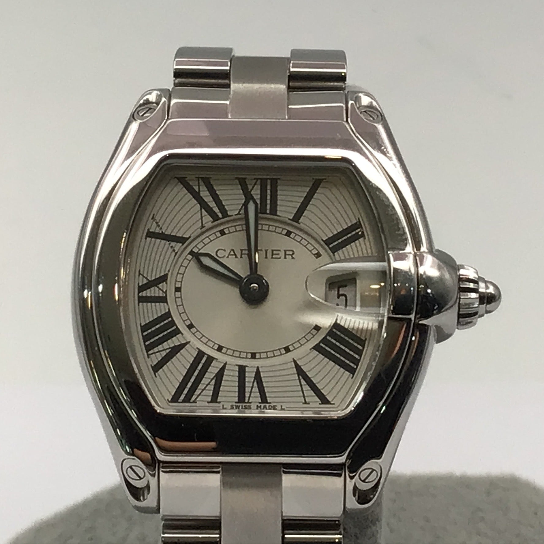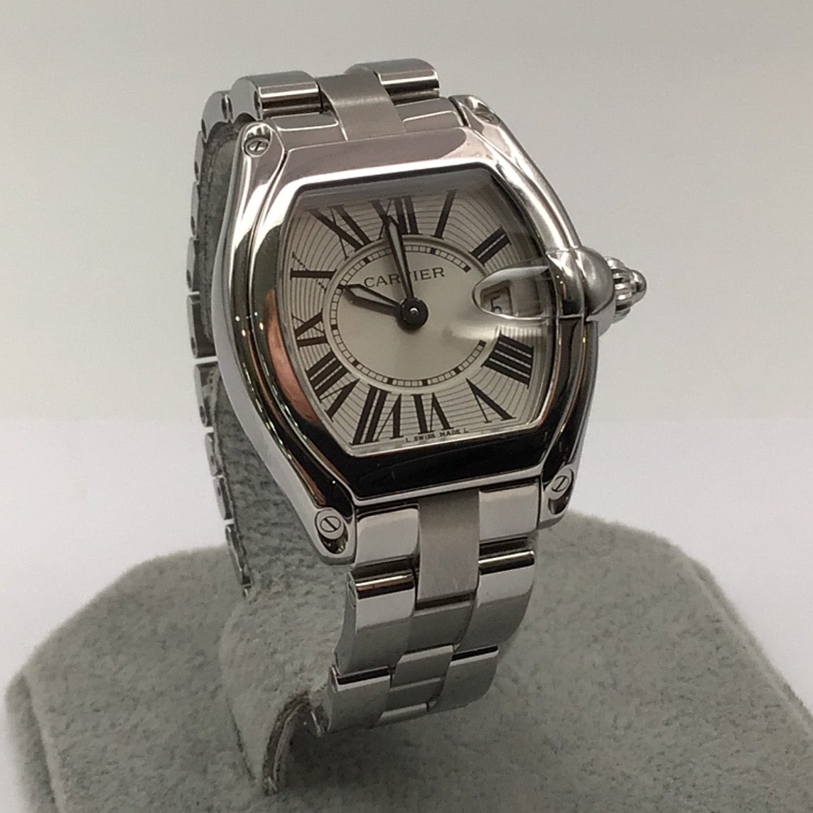 The Cartier Roadster 2675 is a distinguished timepiece that embodies the brand's flair for combining automotive-inspired design with classic watchmaking. This model features a polished stainless steel tonneau-shaped case measuring 31mm in length and 36mm in width, offering a sleek and elegant profile on the wrist. The dial presents a silver sunray effect adorned with bold black Roman numerals, providing a striking contrast for enhanced readability. Luminescent sword-shaped steel hands ensure visibility in various lighting conditions, while the date window at 3 o'clock is magnified by a cyclops lens integrated into the scratch-resistant sapphire crystal. Powered by Cartier's reliable Swiss quartz movement, calibre 688, the watch delivers precise timekeeping. Completing the design is a stainless steel bracelet equipped with a hidden deployment clasp, ensuring both comfort and security. With a water resistance of up to 100 meters (10 ATM), this timepiece is as functional as it is stylish.