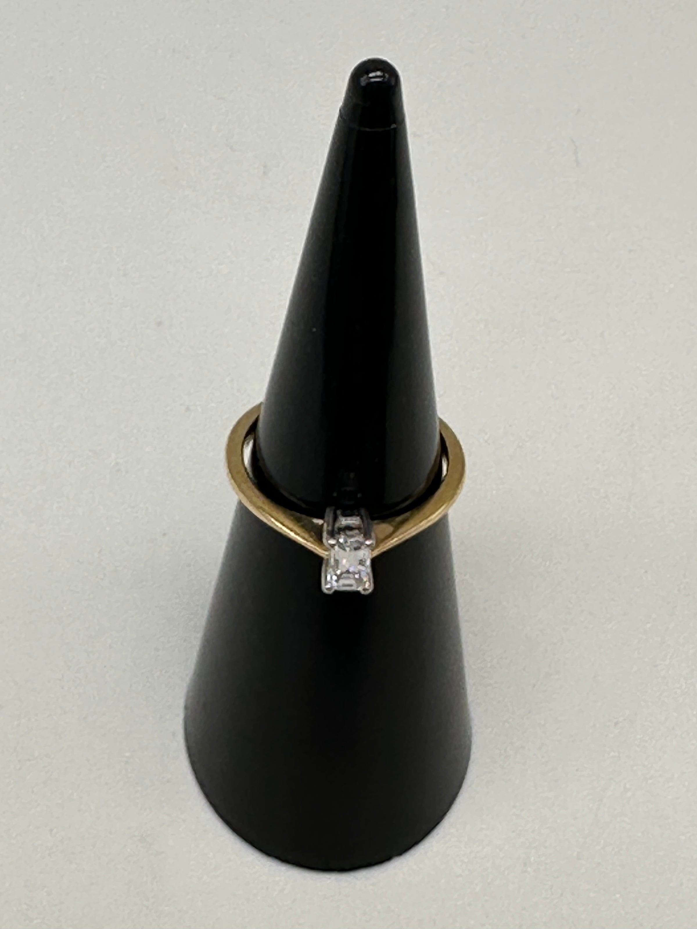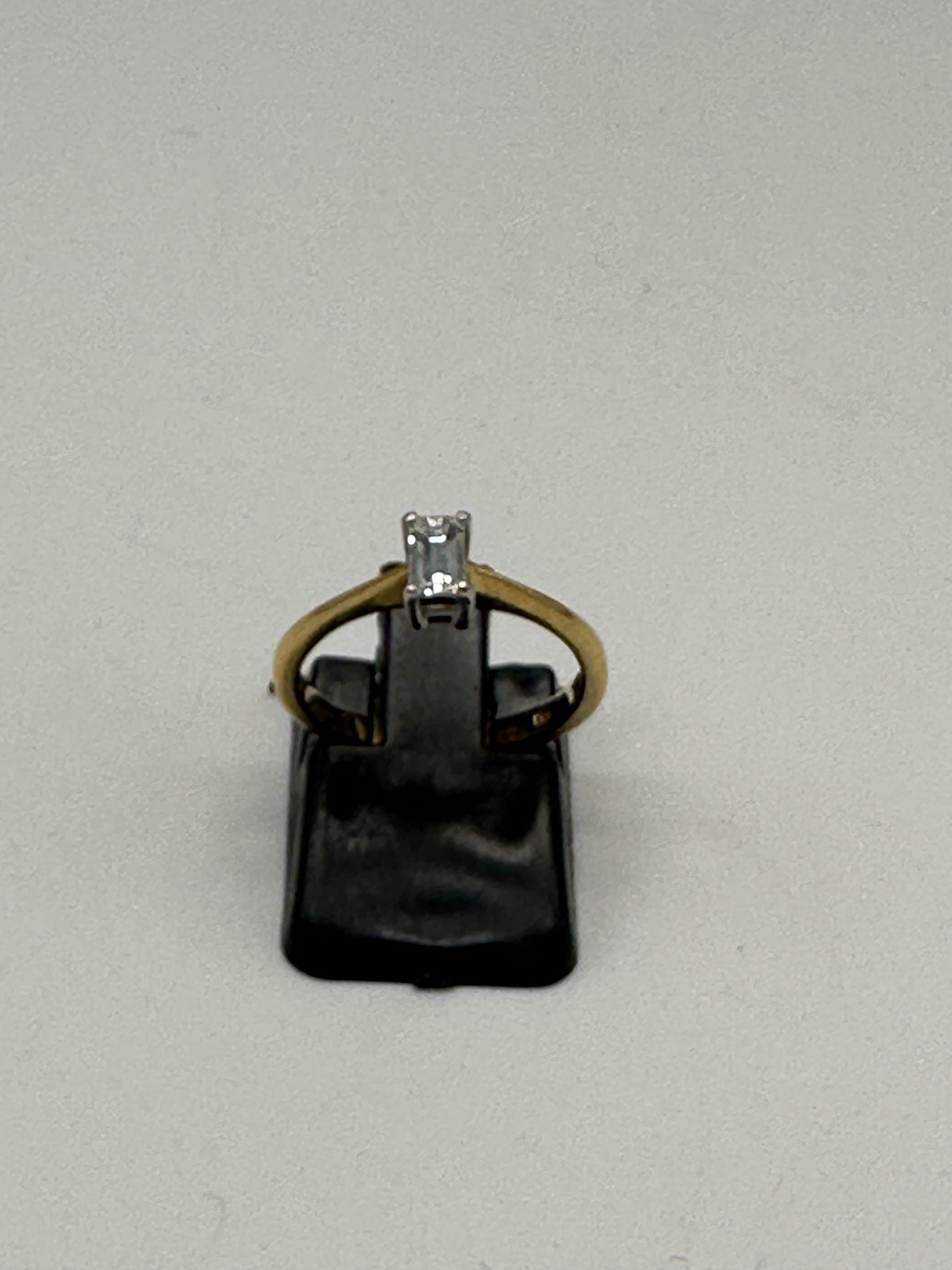 Crafted in 18 ct yellow gold, this elegant ring features an emerald-cut diamond of approximately 0.25 ct, graded G in colour and VS in clarity — offering a balance of near-colourlessness and high clarity for refined brilliance. The diamond is set in a white-gold collet (a metal collar that encircles the girdle of the gemstone, providing both security and a subtle two-tone effect. The design presents a clean, classical profile — the rectangular step-cut diamond offers understated sophistication, while the white-gold collet adds a discreet contrast, allowing the stone’s lines and clarity to stand out.