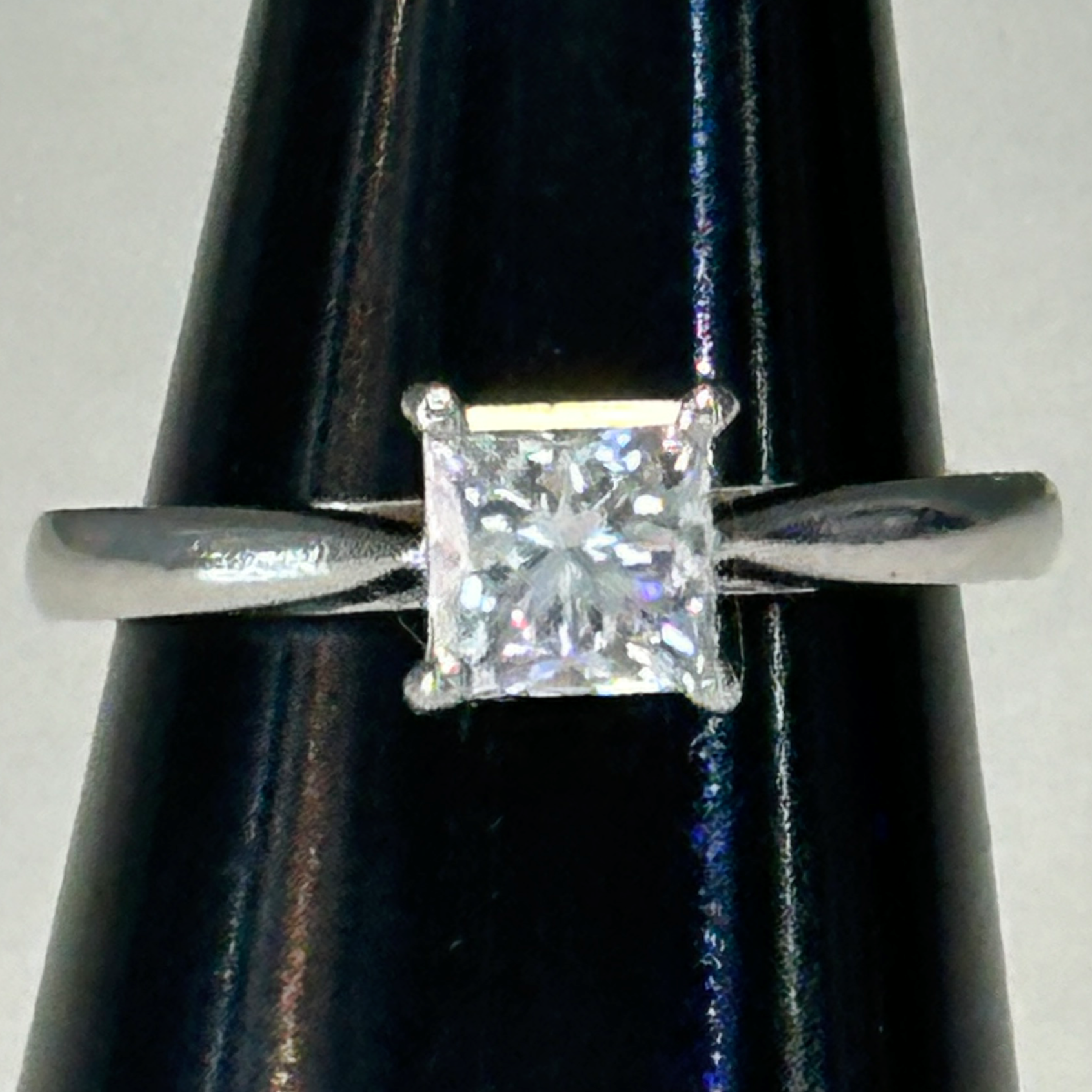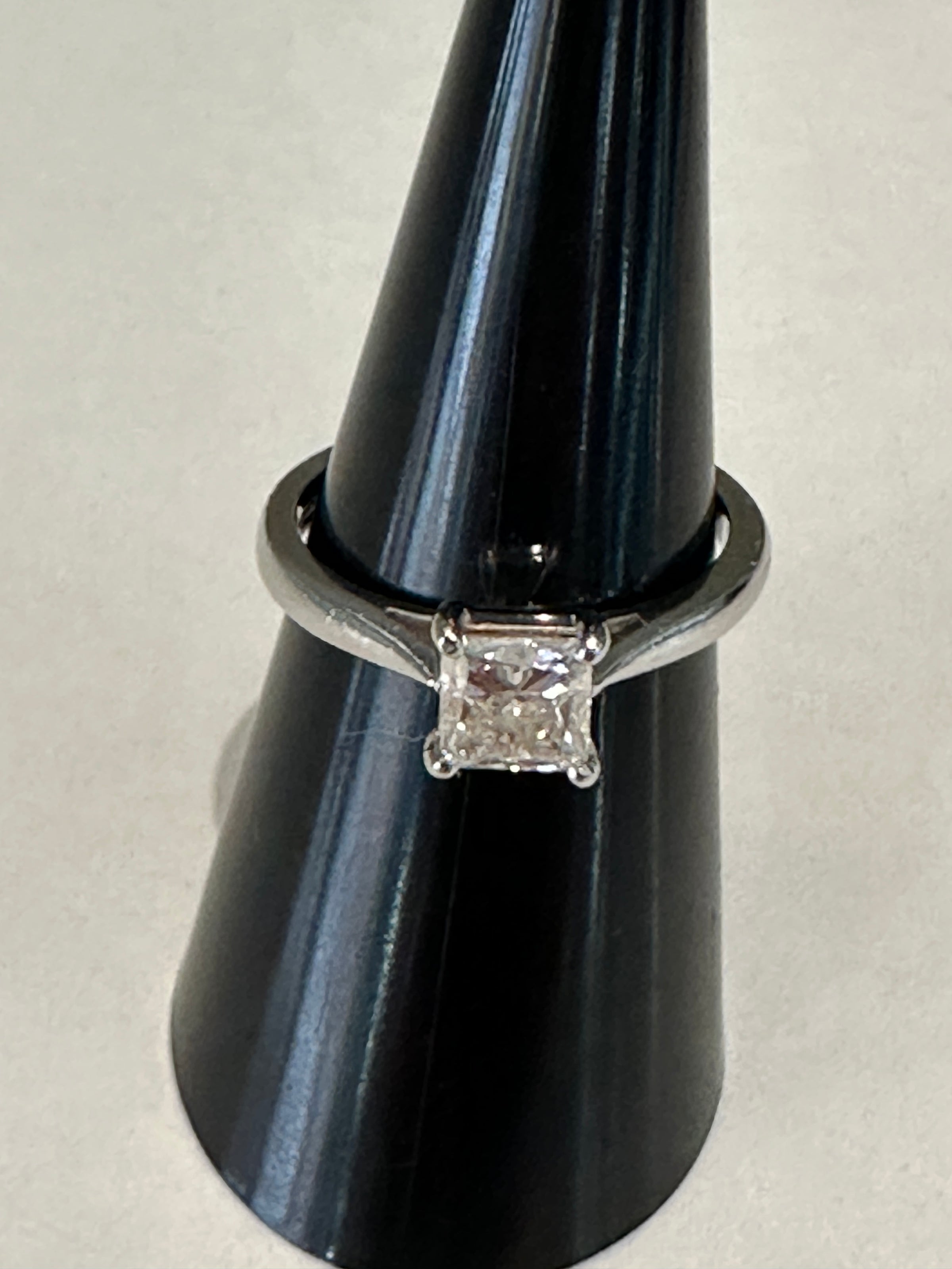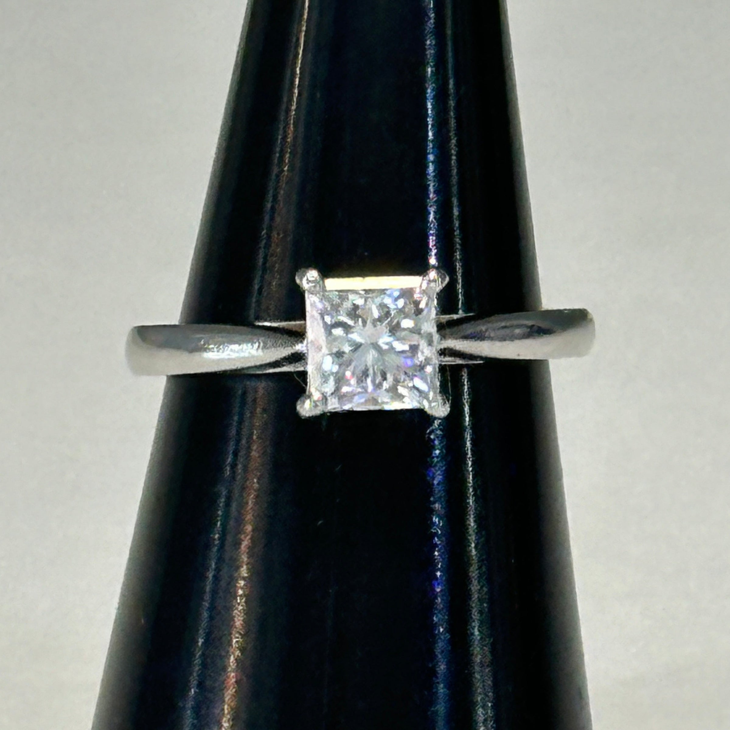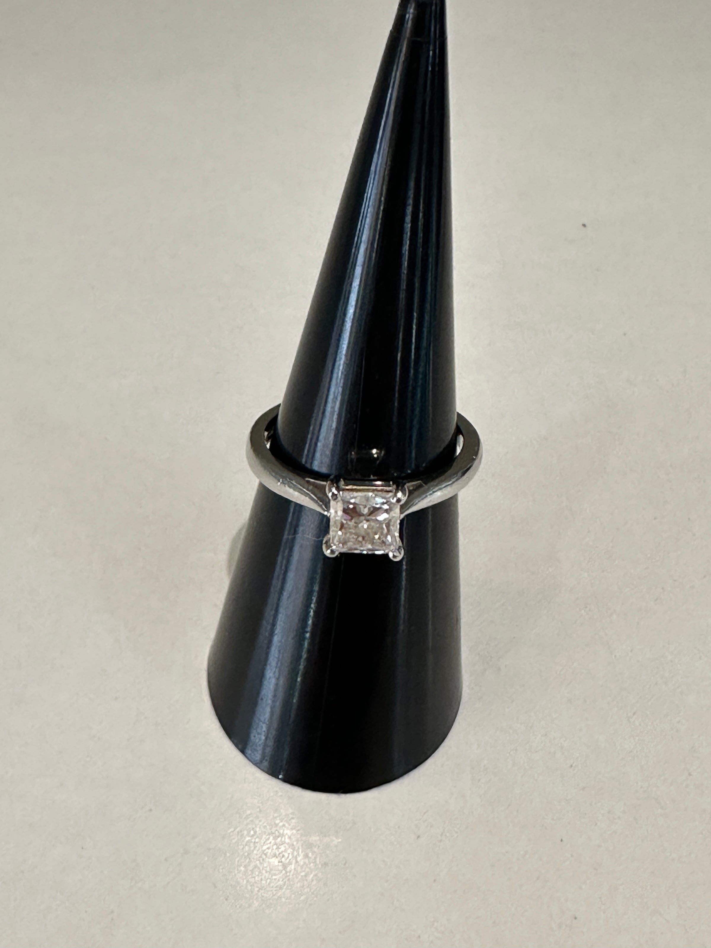 Design Features: The clean, modern lines of the princess cut are enhanced by the high-polish platinum band. The four claws allow light to enter from all angles, ensuring optimum brilliance and fire. Ideal for engagement or investment.